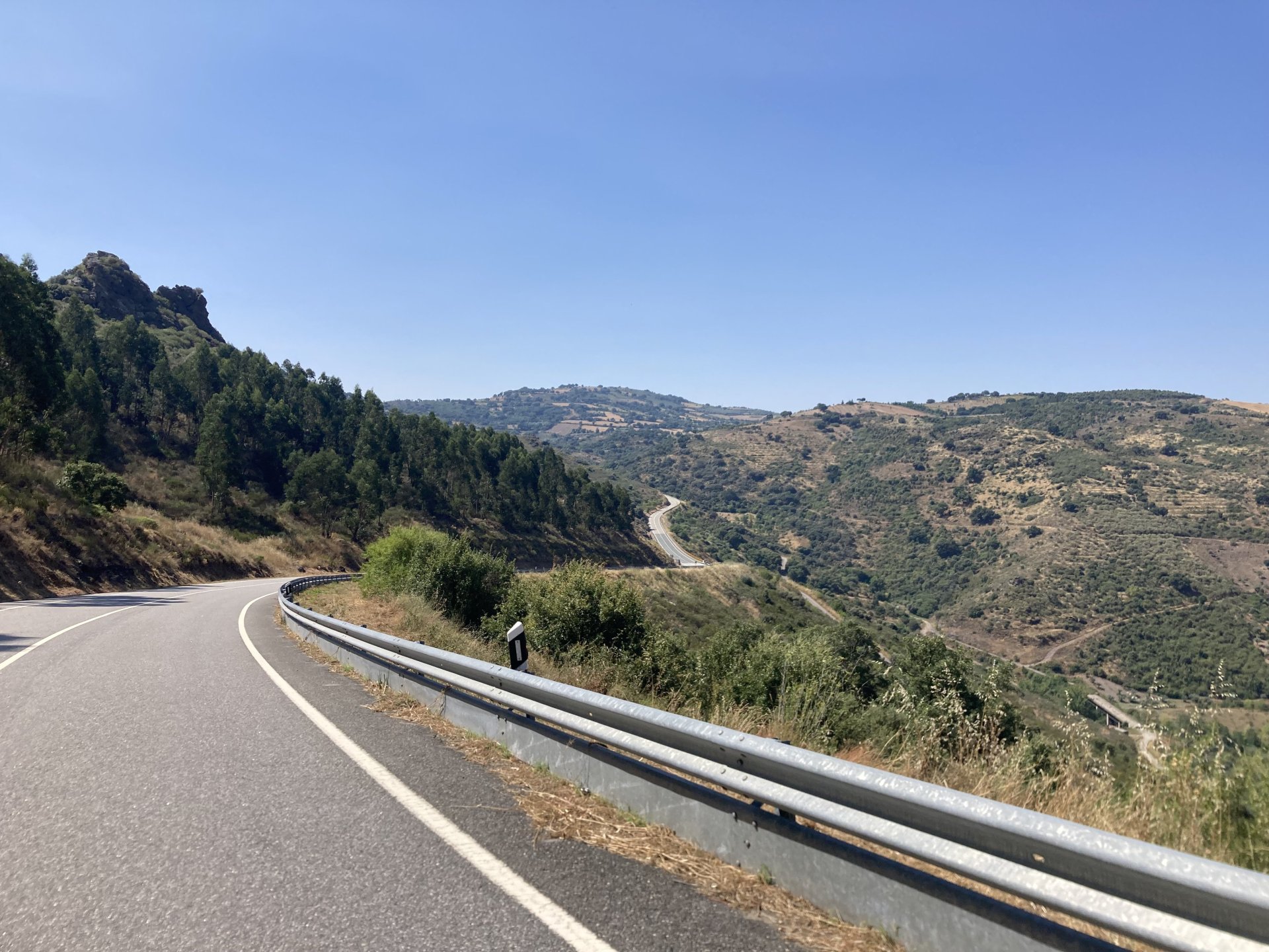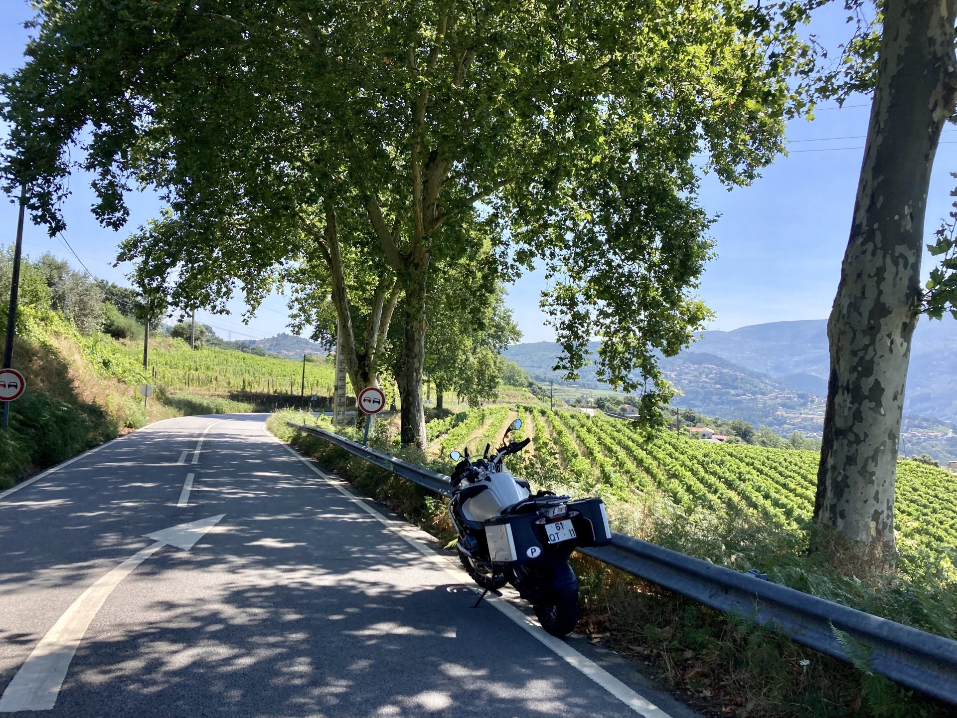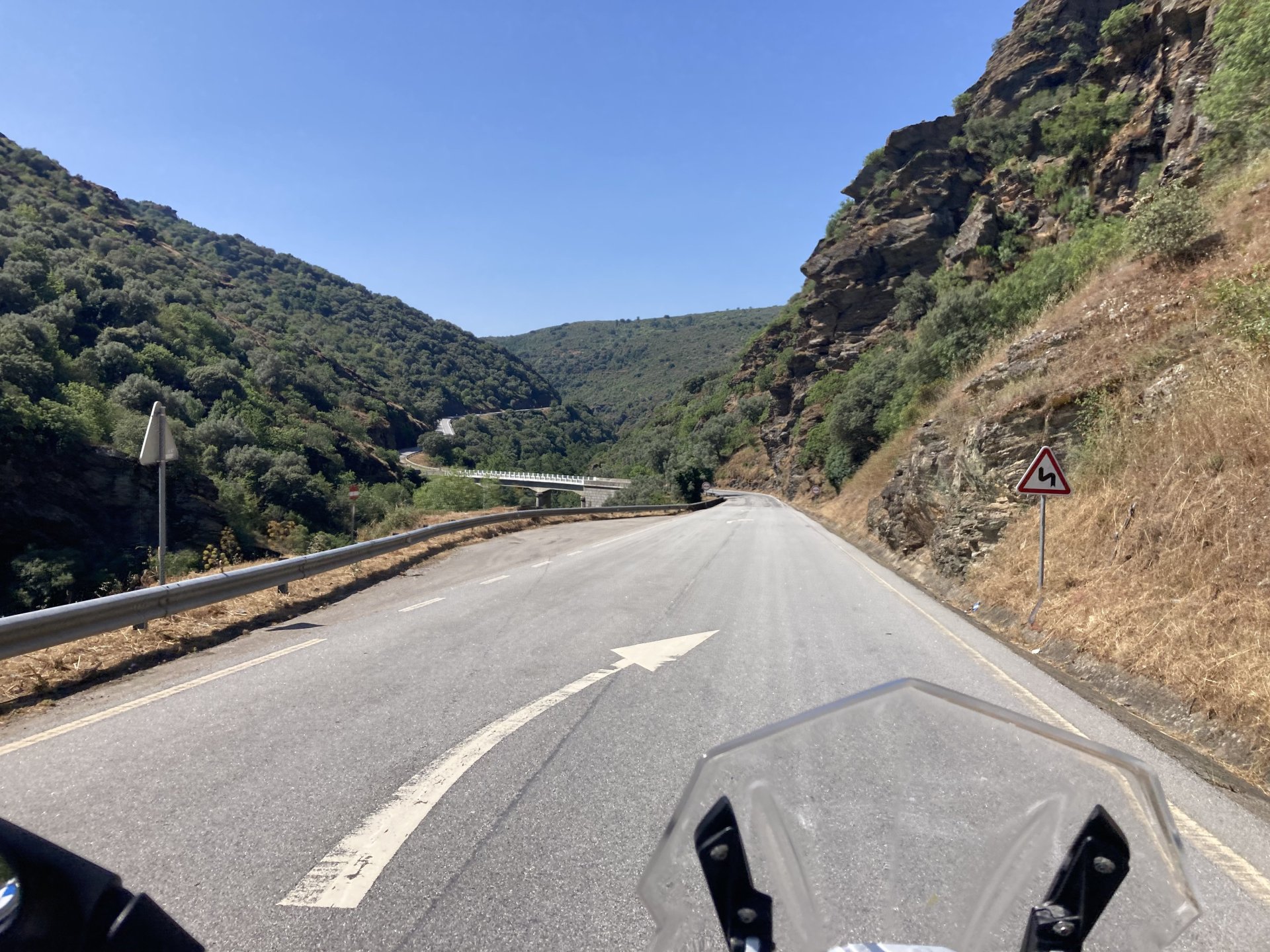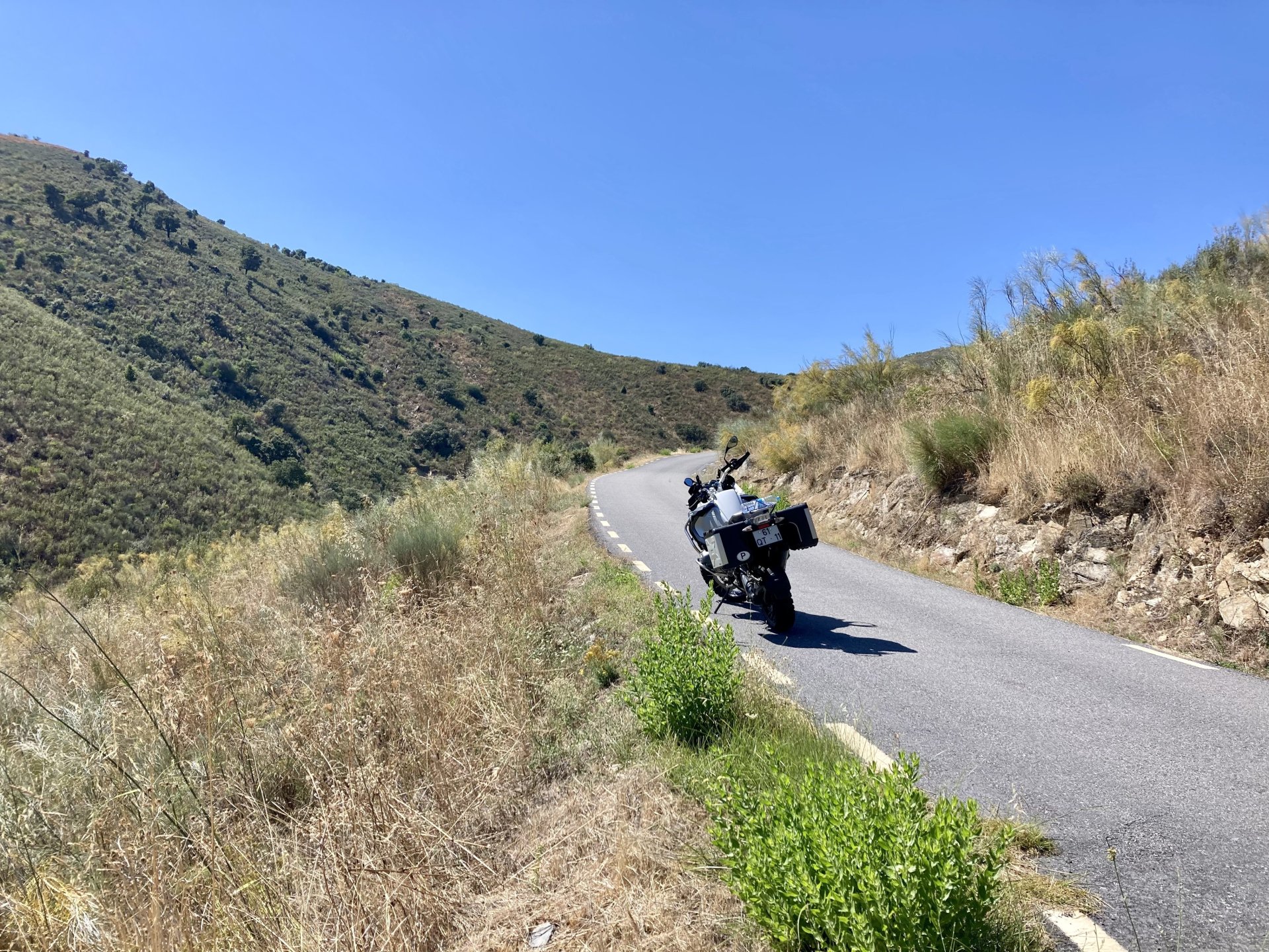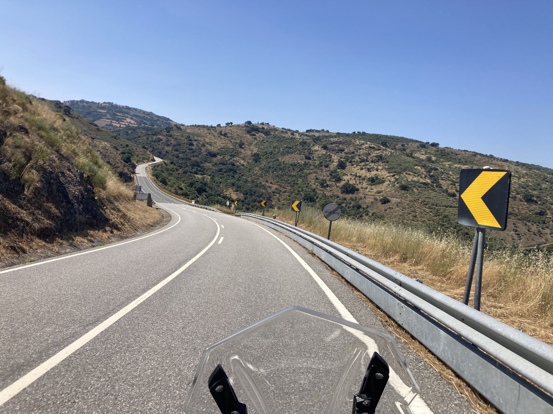 I really felt like riding somewhere, I missed being on the bike, but had no real plan or destination that I felt like visiting. Called my friend that owns a small hotel and booked a room, at least now I had a destination and with my favourite restaurant next to it as a big bonus. It was supposed to be getting warm but I had no plans to do sightseeing so that wasn't bothering me much. I had some delays, and missed a little bit of the morning, it was almost 10 by the time I made it to the Douro riverside, stopped for a coffee. Rode up the Douro, temperature was perfect in the morning, around 25º, couldn't ask for better. Stopped for a phone call By midday I had gotten to around Regua and temperatures shot upwards of 30º, to then stay between 36 and 38 the rest of the day. The Douro valley absolutely cooks in the summer, and this area here is the hottest, also where the best wine is made so that climate probably works. Took some of my favourite small roads near the river, quite narrow so two cars really have to squeeze to pass each other. I regretted not bringing a snack from home, as this would have been a perfect lunch stop. I had decided to try to not look at my phone for navigation, to make it a little more challenging. I did end up in a couple of dead ends as some of these roads just lead to a small train stop by the river, but then again they are nice roads so doing them twice isn't a chore: At around 3PM, now overheated a little, so stopped for a snack in an air conditioned cafe. Just after the cafe starts a road I know well and found by chance a few years ago. It felt nice to put my now cool helmet and jacket, and walked back out to the 38º heat feeling refreshed. I took the tiny road away from the tourist route, I love this tiny road, shame it's not very long as I could ride it all day long. Continuing farther north, and now away from the river, the landscape changes A stop under some shade to drink what was now quite warm water, blergh! I think I'll try to find some thermal fleece I can use to carry water bottles. Bike safely tucked away for the night, in time for a cool shower and a little relaxation in the air conditioned room, I think I did around 500 or something kms with no navigation except to get out of Bragança (a big town) after fueling up, pretty happy with that. I had high hopes for dinner, but little did I know I would almost risk my life that night... a 20 minute walk to the restaurant, first through a small village, most people living here are of pretty advanced age even though they still work the land, now taking the cool evening to relax outside. I named it Pig McQueen, runaway pig making everyone chase him around the village, look in the distance in the street: Lovely meal, along with pretty chilled red wine because fuck the rules! After dinner, conversation was struck and a few of us stayed out enjoying the cool night and having a drink. Some played cards, and I was very surprised to learn that spanish cards are different, wtf? People might have gotten silly, and we even had magic performed: At a little past 1 I headed back, now taking a short route along a road, I noticed a car with high beams on coming from behind me, I looked back and only had a moment to jump out of the edge of the road onto the bushes. This was on the outside of a wide enough corner, but the driver was either drunk or asleep and the car had one wheel already out of tarmac and where I was walking. They didn't stop. Diving to the bushes scratched the shit out of my arm and hand, ripped my tshirt but I was happy to get to bed safe and sound, even though I just plucked a few more tiny thorns from my had just now, a day later. Blackberry bushes! My plan was to wake up early and get out while still cool outside. Staying up late the previous day and a very sore arm and neck caused that plan to completely fail as I sat down for breakfast at well past 9 I had a big day ahead, again trying to not look at navigation and just follow street signs, now in a part of Portugal I don't really find easy to navigate. First couple of hours were very easy as I know those roads quite well, quite fast and flowing, in contrast to the previous day. Stopped for some water in a very cool village near the Serra da Estrela, very old and built amongst huge boulders. Drinking warm water was appreciated, though. Another stop, now to check some emails. This town was very nice, looked great and tidy inside the castle walls too. I'll surely come back with more pleasant weather, as the heat was on full force now. From there to the top of Serra da Estrela was a breeze, in less than an hour and we're at the tallest place in mainland Portugal, temperature there was very enjoyable at 22º, provided some brief relief. The road climbing from Gouveia up is just great, so I didn't stop and took it in a nice rhythm. At the top and on the other side: No more pictures, from there on there was another 4 or 5 hours to get home. Stopped for fuel at a nice gas station with very friendly staff, and sat down enjoying their AC and a bottle of very cold water for a while. I almost didn't want to leave. I hope it'll cool a little over the next days, so that I can at least enjoy a short ride or two from my place. Today was another 600km, that's the sort of distance @Earache does before breakfast and it took me most of the day8 points