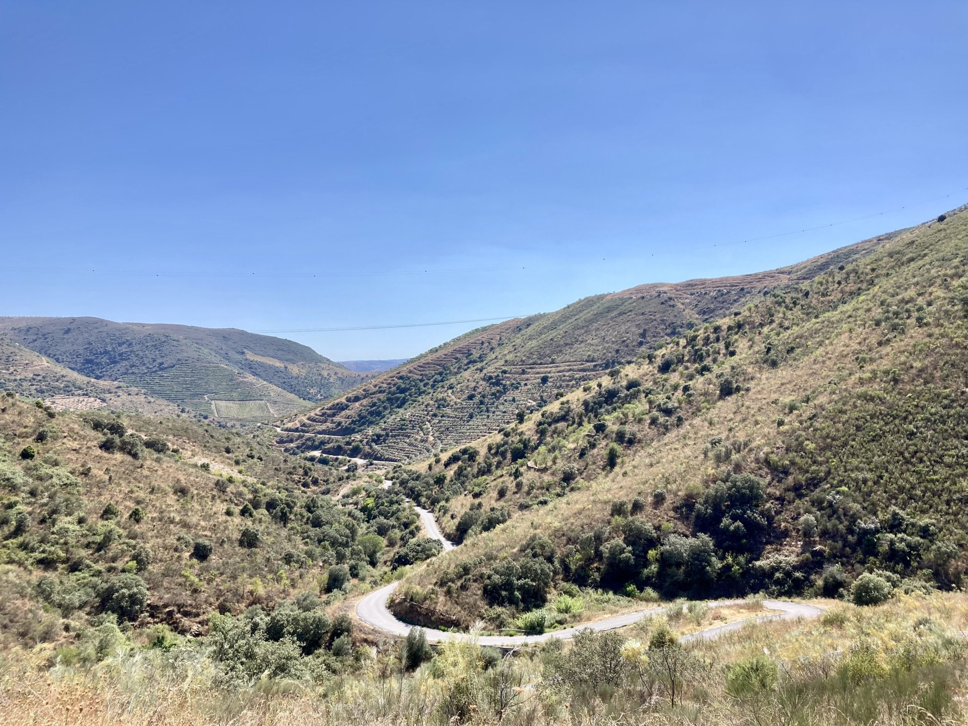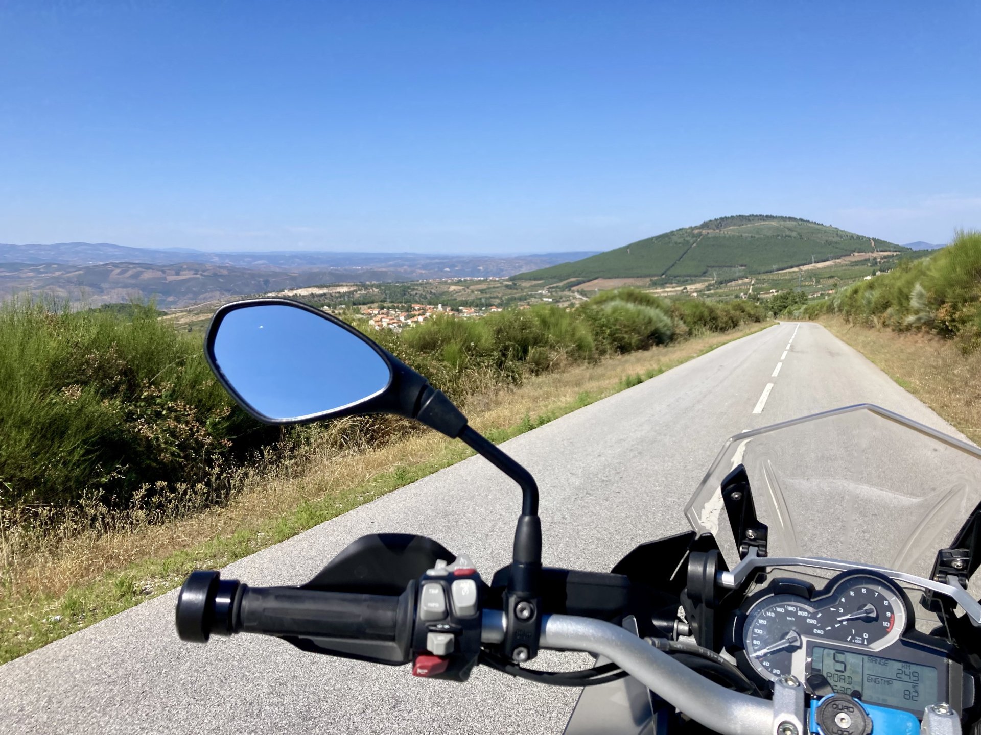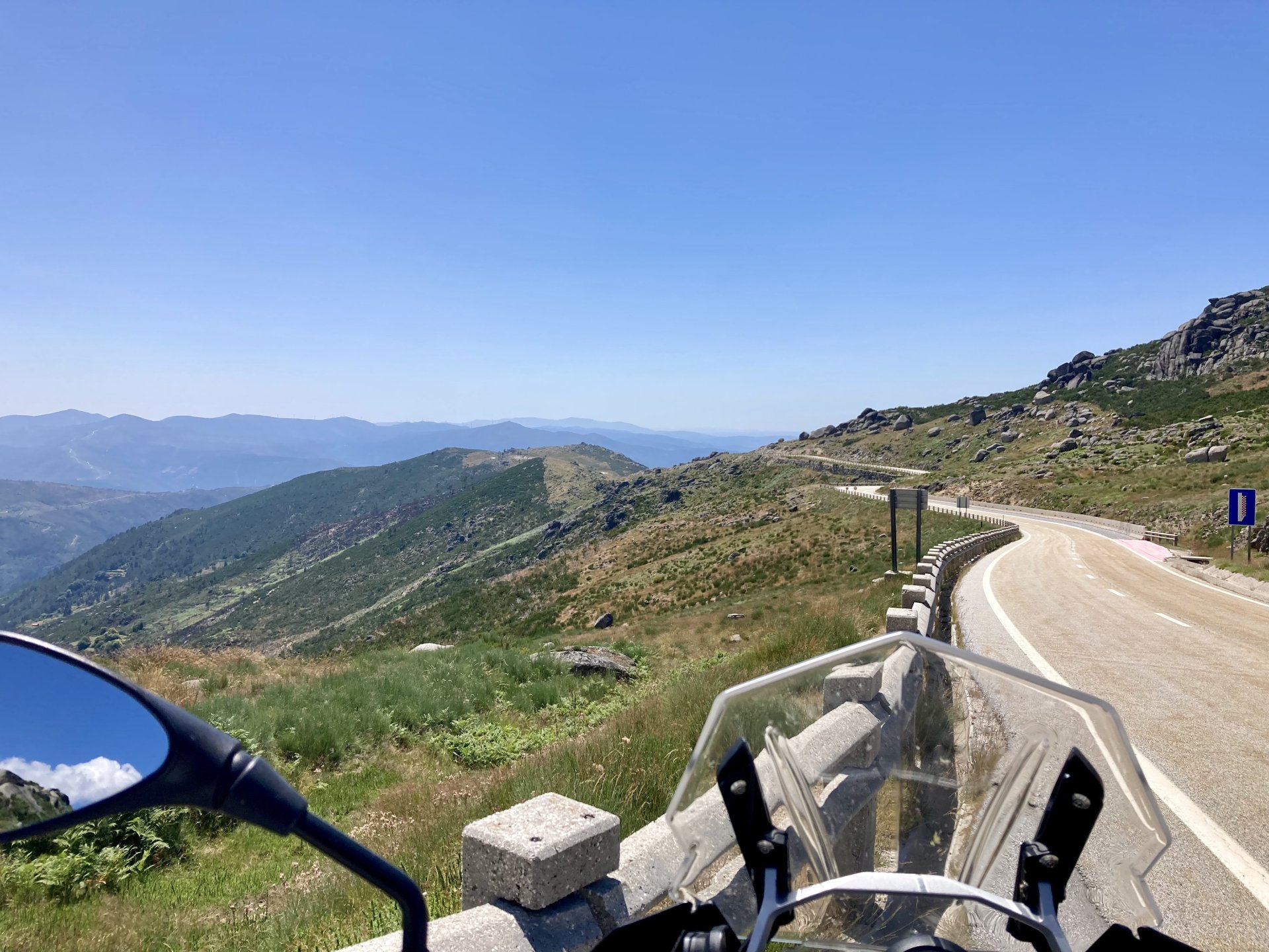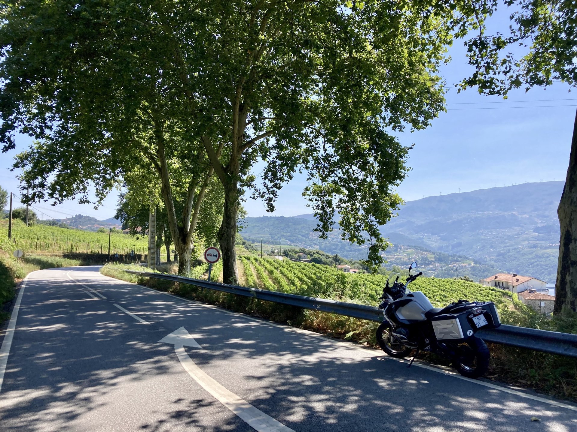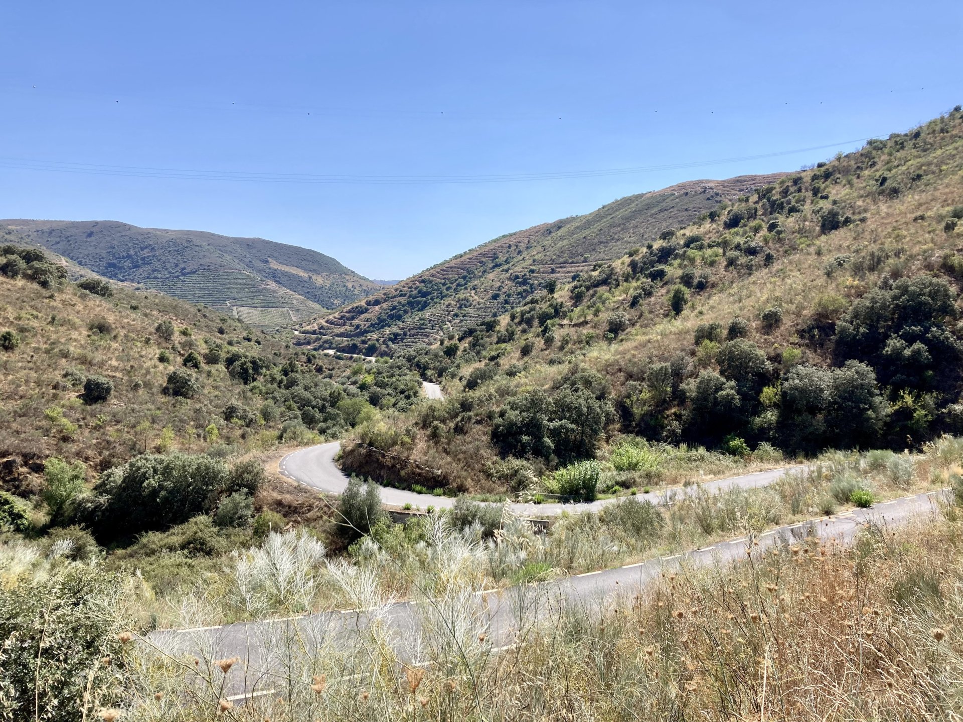 I really felt like riding somewhere, I missed being on the bike, but had no real plan or destination that I felt like visiting. Called my friend that owns a small hotel and booked a room, at least now I had a destination and with my favourite restaurant next to it as a big bonus. It was supposed to be getting warm but I had no plans to do sightseeing so that wasn't bothering me much. I had some delays, and missed a little bit of the morning, it was almost 10 by the time I made it to the Douro riverside, stopped for a coffee. Rode up the Douro, temperature was perfect in the morning, around 25º, couldn't ask for better. Stopped for a phone call By midday I had gotten to around Regua and temperatures shot upwards of 30º, to then stay between 36 and 38 the rest of the day. The Douro valley absolutely cooks in the summer, and this area here is the hottest, also where the best wine is made so that climate probably works. Took some of my favourite small roads near the river, quite narrow so two cars really have to squeeze to pass each other. I regretted not bringing a snack from home, as this would have been a perfect lunch stop. I had decided to try to not look at my phone for navigation, to make it a little more challenging. I did end up in a couple of dead ends as some of these roads just lead to a small train stop by the river, but then again they are nice roads so doing them twice isn't a chore: At around 3PM, now overheated a little, so stopped for a snack in an air conditioned cafe. Just after the cafe starts a road I know well and found by chance a few years ago. It felt nice to put my now cool helmet and jacket, and walked back out to the 38º heat feeling refreshed. I took the tiny road away from the tourist route, I love this tiny road, shame it's not very long as I could ride it all day long. Continuing farther north, and now away from the river, the landscape changes A stop under some shade to drink what was now quite warm water, blergh! I think I'll try to find some thermal fleece I can use to carry water bottles. Bike safely tucked away for the night, in time for a cool shower and a little relaxation in the air conditioned room, I think I did around 500 or something kms with no navigation except to get out of Bragança (a big town) after fueling up, pretty happy with that. I had high hopes for dinner, but little did I know I would almost risk my life that night... a 20 minute walk to the restaurant, first through a small village, most people living here are of pretty advanced age even though they still work the land, now taking the cool evening to relax outside. I named it Pig McQueen, runaway pig making everyone chase him around the village, look in the distance in the street: Lovely meal, along with pretty chilled red wine because fuck the rules! After dinner, conversation was struck and a few of us stayed out enjoying the cool night and having a drink. Some played cards, and I was very surprised to learn that spanish cards are different, wtf? People might have gotten silly, and we even had magic performed: At a little past 1 I headed back, now taking a short route along a road, I noticed a car with high beams on coming from behind me, I looked back and only had a moment to jump out of the edge of the road onto the bushes. This was on the outside of a wide enough corner, but the driver was either drunk or asleep and the car had one wheel already out of tarmac and where I was walking. They didn't stop. Diving to the bushes scratched the shit out of my arm and hand, ripped my tshirt but I was happy to get to bed safe and sound, even though I just plucked a few more tiny thorns from my had just now, a day later. Blackberry bushes! My plan was to wake up early and get out while still cool outside. Staying up late the previous day and a very sore arm and neck caused that plan to completely fail as I sat down for breakfast at well past 9 I had a big day ahead, again trying to not look at navigation and just follow street signs, now in a part of Portugal I don't really find easy to navigate. First couple of hours were very easy as I know those roads quite well, quite fast and flowing, in contrast to the previous day. Stopped for some water in a very cool village near the Serra da Estrela, very old and built amongst huge boulders. Drinking warm water was appreciated, though. Another stop, now to check some emails. This town was very nice, looked great and tidy inside the castle walls too. I'll surely come back with more pleasant weather, as the heat was on full force now. From there to the top of Serra da Estrela was a breeze, in less than an hour and we're at the tallest place in mainland Portugal, temperature there was very enjoyable at 22º, provided some brief relief. The road climbing from Gouveia up is just great, so I didn't stop and took it in a nice rhythm. At the top and on the other side: No more pictures, from there on there was another 4 or 5 hours to get home. Stopped for fuel at a nice gas station with very friendly staff, and sat down enjoying their AC and a bottle of very cold water for a while. I almost didn't want to leave. I hope it'll cool a little over the next days, so that I can at least enjoy a short ride or two from my place. Today was another 600km, that's the sort of distance @Earache does before breakfast and it took me most of the day8 points