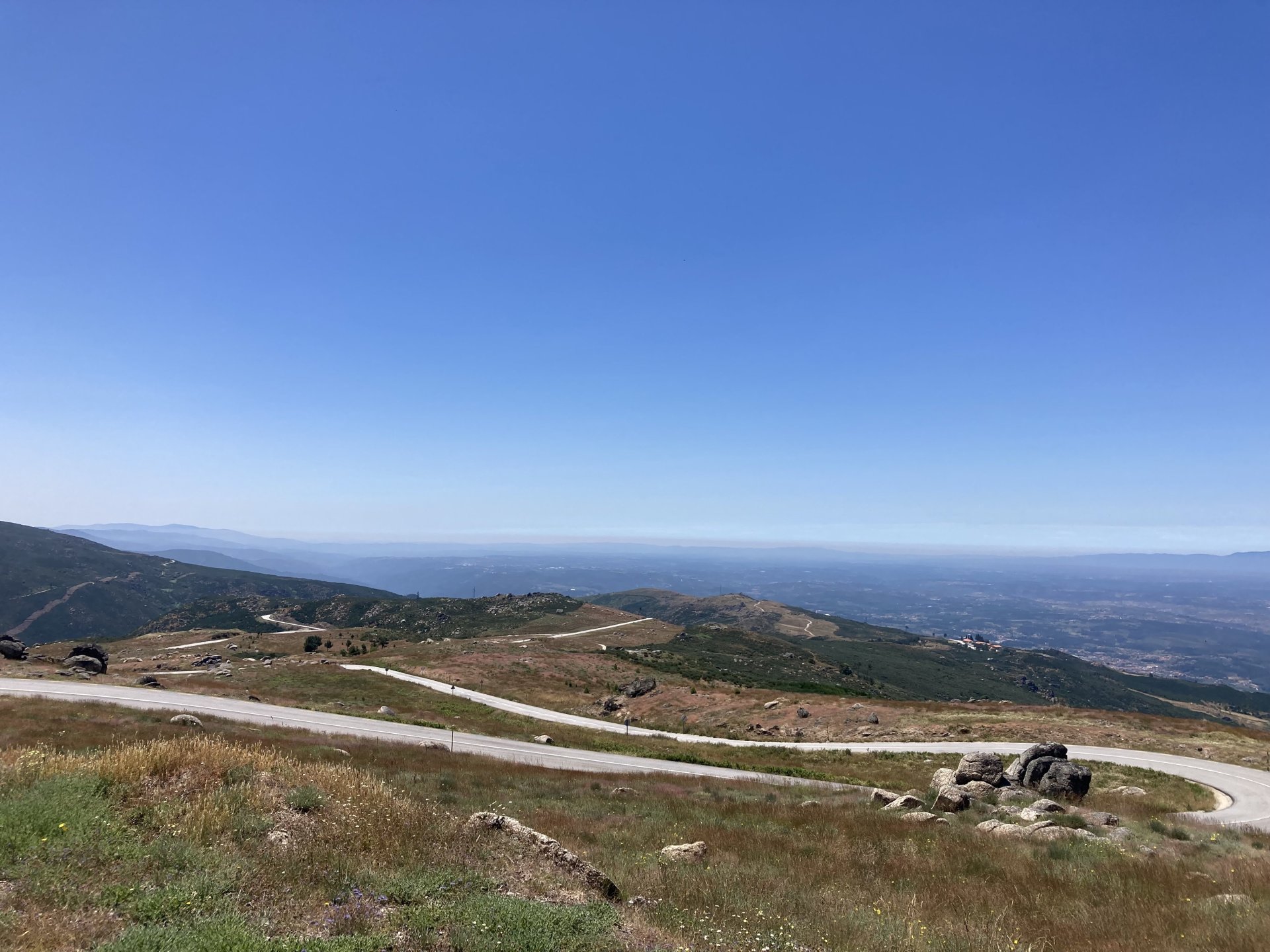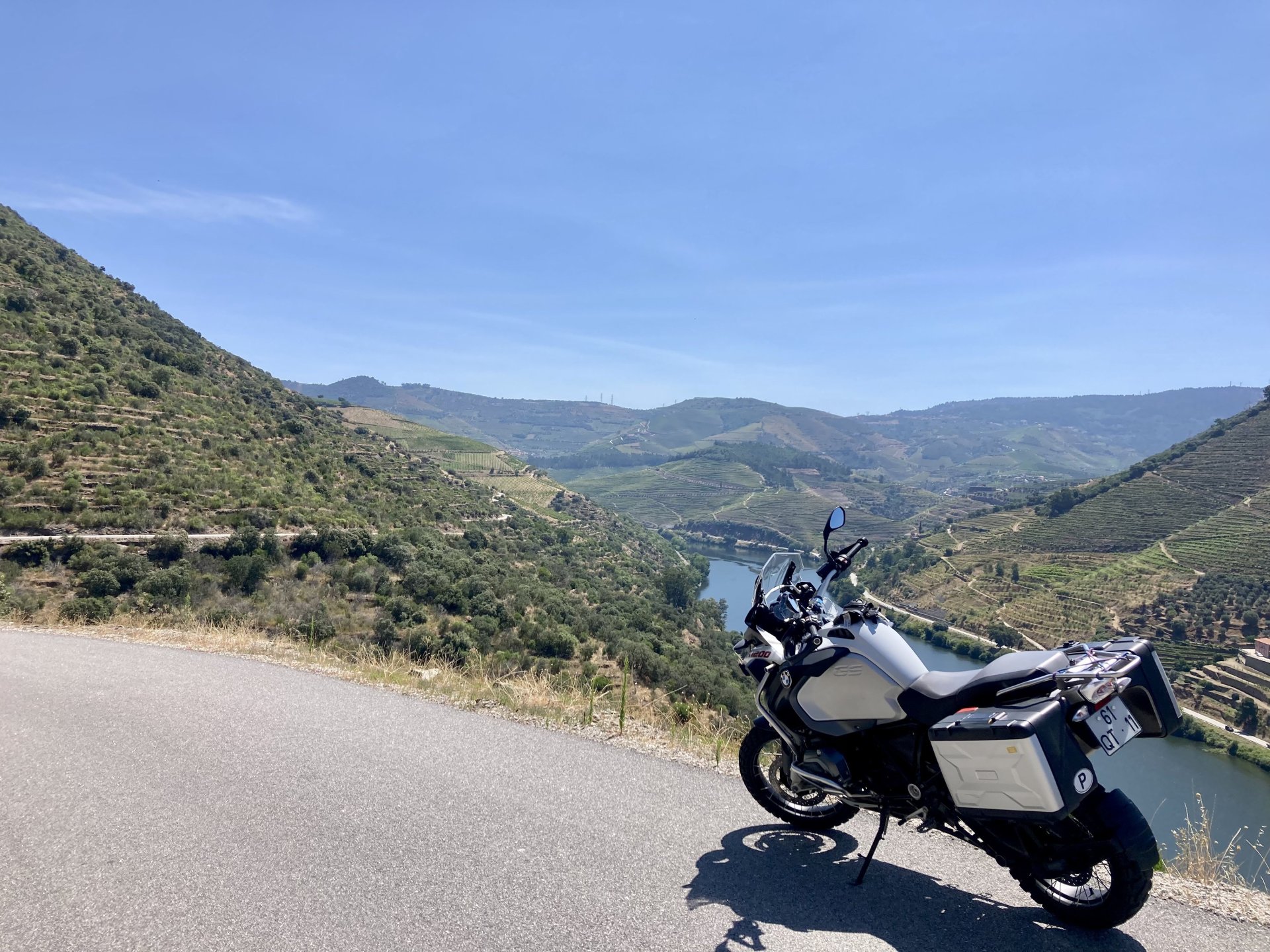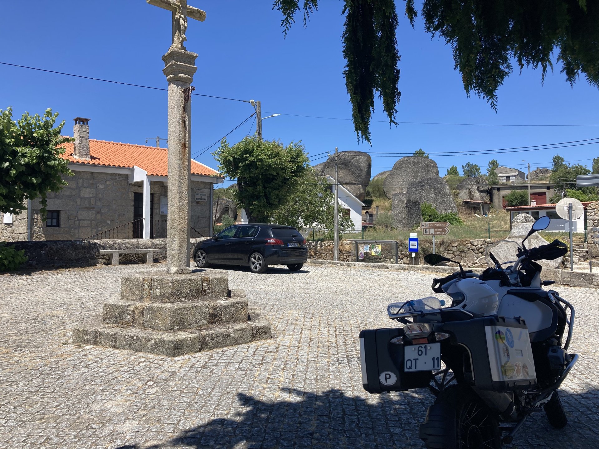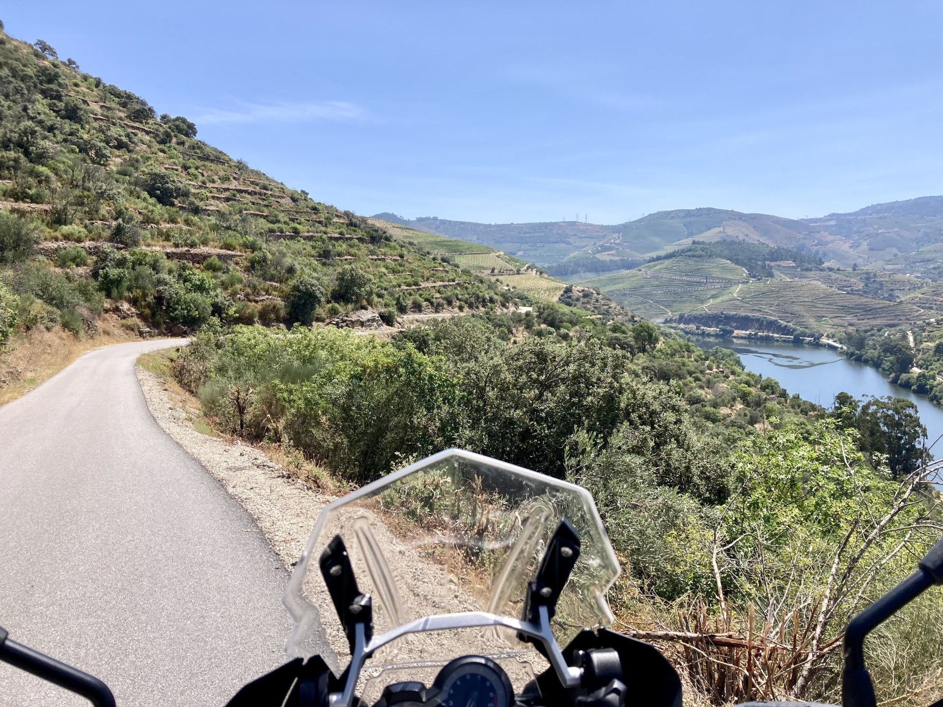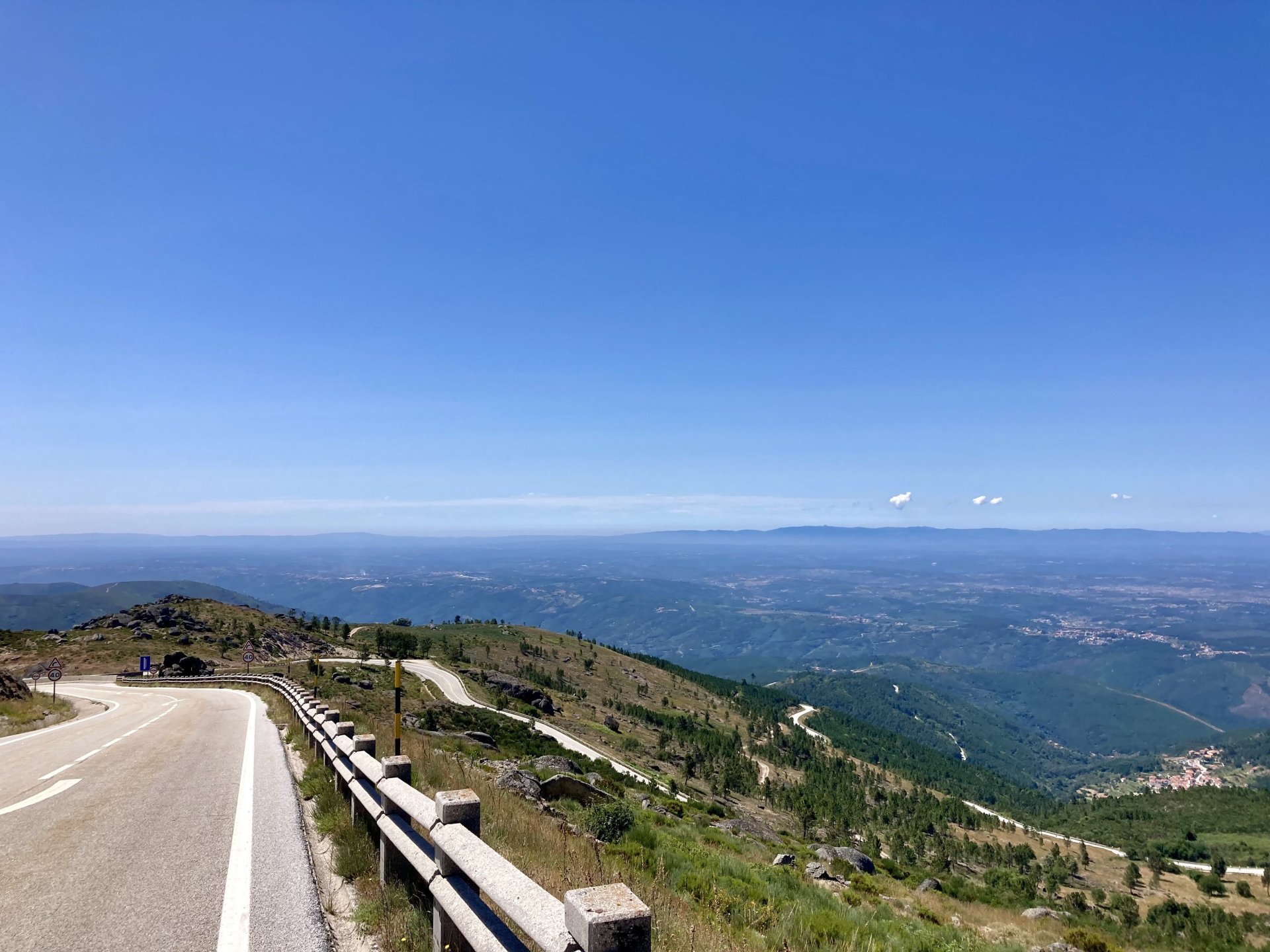 I really felt like riding somewhere, I missed being on the bike, but had no real plan or destination that I felt like visiting. Called my friend that owns a small hotel and booked a room, at least now I had a destination and with my favourite restaurant next to it as a big bonus. It was supposed to be getting warm but I had no plans to do sightseeing so that wasn't bothering me much. I had some delays, and missed a little bit of the morning, it was almost 10 by the time I made it to the Douro riverside, stopped for a coffee. Rode up the Douro, temperature was perfect in the morning, around 25º, couldn't ask for better. Stopped for a phone call By midday I had gotten to around Regua and temperatures shot upwards of 30º, to then stay between 36 and 38 the rest of the day. The Douro valley absolutely cooks in the summer, and this area here is the hottest, also where the best wine is made so that climate probably works. Took some of my favourite small roads near the river, quite narrow so two cars really have to squeeze to pass each other. I regretted not bringing a snack from home, as this would have been a perfect lunch stop. I had decided to try to not look at my phone for navigation, to make it a little more challenging. I did end up in a couple of dead ends as some of these roads just lead to a small train stop by the river, but then again they are nice roads so doing them twice isn't a chore: At around 3PM, now overheated a little, so stopped for a snack in an air conditioned cafe. Just after the cafe starts a road I know well and found by chance a few years ago. It felt nice to put my now cool helmet and jacket, and walked back out to the 38º heat feeling refreshed. I took the tiny road away from the tourist route, I love this tiny road, shame it's not very long as I could ride it all day long. Continuing farther north, and now away from the river, the landscape changes A stop under some shade to drink what was now quite warm water, blergh! I think I'll try to find some thermal fleece I can use to carry water bottles. Bike safely tucked away for the night, in time for a cool shower and a little relaxation in the air conditioned room, I think I did around 500 or something kms with no navigation except to get out of Bragança (a big town) after fueling up, pretty happy with that. I had high hopes for dinner, but little did I know I would almost risk my life that night... a 20 minute walk to the restaurant, first through a small village, most people living here are of pretty advanced age even though they still work the land, now taking the cool evening to relax outside. I named it Pig McQueen, runaway pig making everyone chase him around the village, look in the distance in the street: Lovely meal, along with pretty chilled red wine because fuck the rules! After dinner, conversation was struck and a few of us stayed out enjoying the cool night and having a drink. Some played cards, and I was very surprised to learn that spanish cards are different, wtf? People might have gotten silly, and we even had magic performed: At a little past 1 I headed back, now taking a short route along a road, I noticed a car with high beams on coming from behind me, I looked back and only had a moment to jump out of the edge of the road onto the bushes. This was on the outside of a wide enough corner, but the driver was either drunk or asleep and the car had one wheel already out of tarmac and where I was walking. They didn't stop. Diving to the bushes scratched the shit out of my arm and hand, ripped my tshirt but I was happy to get to bed safe and sound, even though I just plucked a few more tiny thorns from my had just now, a day later. Blackberry bushes! My plan was to wake up early and get out while still cool outside. Staying up late the previous day and a very sore arm and neck caused that plan to completely fail as I sat down for breakfast at well past 9 I had a big day ahead, again trying to not look at navigation and just follow street signs, now in a part of Portugal I don't really find easy to navigate. First couple of hours were very easy as I know those roads quite well, quite fast and flowing, in contrast to the previous day. Stopped for some water in a very cool village near the Serra da Estrela, very old and built amongst huge boulders. Drinking warm water was appreciated, though. Another stop, now to check some emails. This town was very nice, looked great and tidy inside the castle walls too. I'll surely come back with more pleasant weather, as the heat was on full force now. From there to the top of Serra da Estrela was a breeze, in less than an hour and we're at the tallest place in mainland Portugal, temperature there was very enjoyable at 22º, provided some brief relief. The road climbing from Gouveia up is just great, so I didn't stop and took it in a nice rhythm. At the top and on the other side: No more pictures, from there on there was another 4 or 5 hours to get home. Stopped for fuel at a nice gas station with very friendly staff, and sat down enjoying their AC and a bottle of very cold water for a while. I almost didn't want to leave. I hope it'll cool a little over the next days, so that I can at least enjoy a short ride or two from my place. Today was another 600km, that's the sort of distance @Earache does before breakfast and it took me most of the day8 points