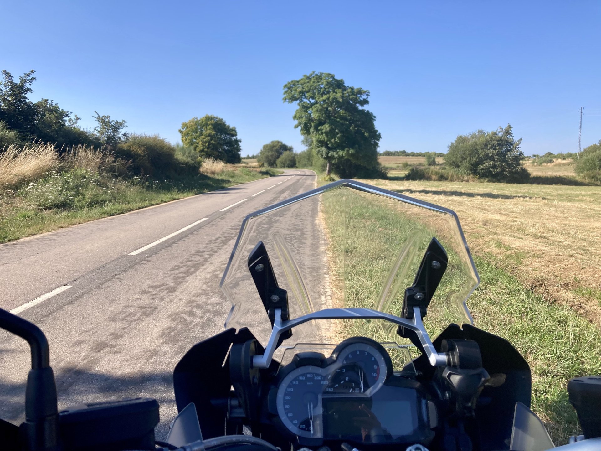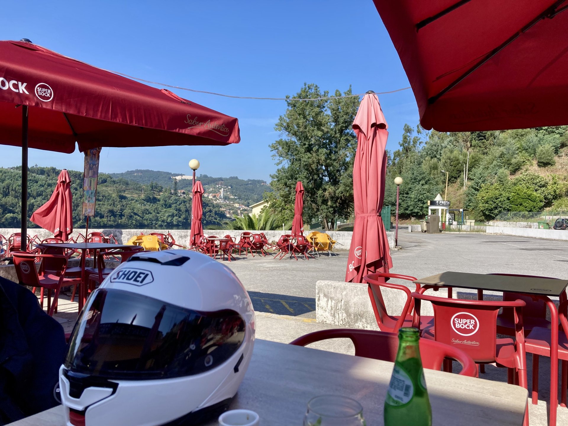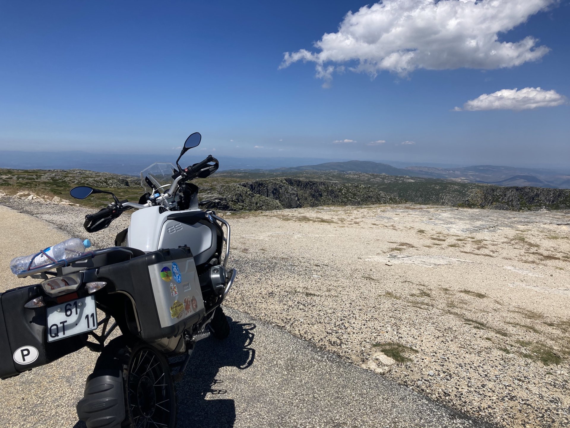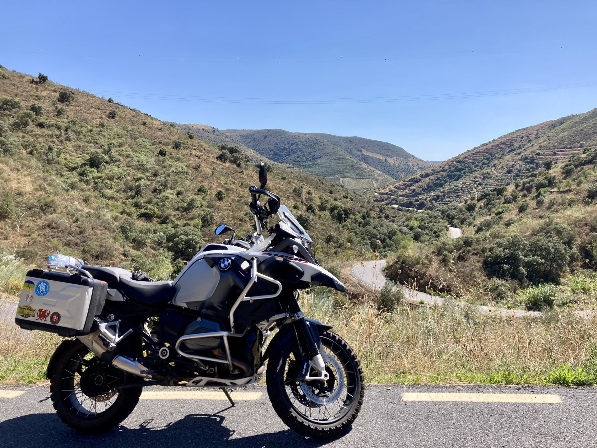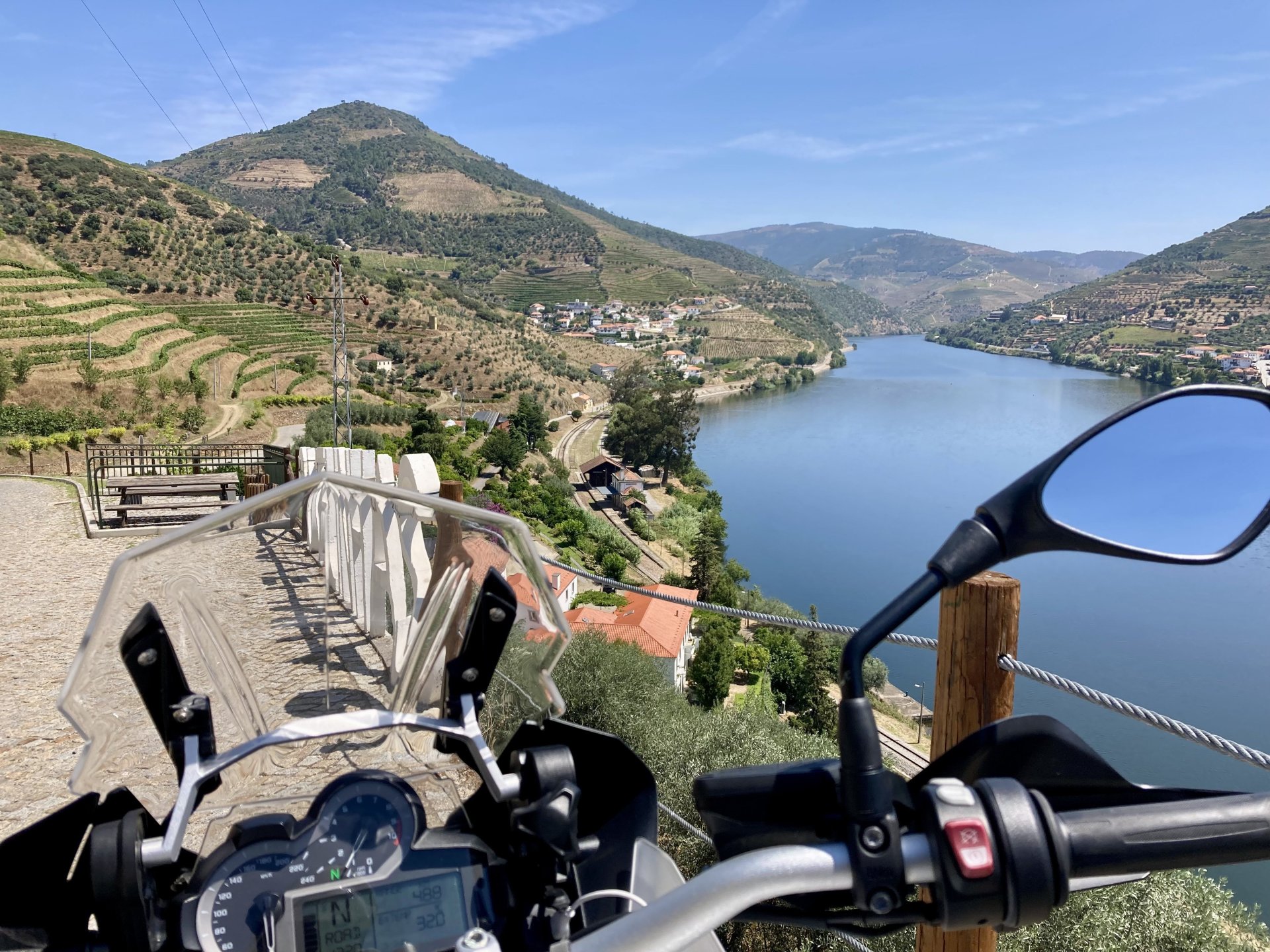 I really felt like riding somewhere, I missed being on the bike, but had no real plan or destination that I felt like visiting. Called my friend that owns a small hotel and booked a room, at least now I had a destination and with my favourite restaurant next to it as a big bonus. It was supposed to be getting warm but I had no plans to do sightseeing so that wasn't bothering me much. I had some delays, and missed a little bit of the morning, it was almost 10 by the time I made it to the Douro riverside, stopped for a coffee. Rode up the Douro, temperature was perfect in the morning, around 25º, couldn't ask for better. Stopped for a phone call By midday I had gotten to around Regua and temperatures shot upwards of 30º, to then stay between 36 and 38 the rest of the day. The Douro valley absolutely cooks in the summer, and this area here is the hottest, also where the best wine is made so that climate probably works. Took some of my favourite small roads near the river, quite narrow so two cars really have to squeeze to pass each other. I regretted not bringing a snack from home, as this would have been a perfect lunch stop. I had decided to try to not look at my phone for navigation, to make it a little more challenging. I did end up in a couple of dead ends as some of these roads just lead to a small train stop by the river, but then again they are nice roads so doing them twice isn't a chore: At around 3PM, now overheated a little, so stopped for a snack in an air conditioned cafe. Just after the cafe starts a road I know well and found by chance a few years ago. It felt nice to put my now cool helmet and jacket, and walked back out to the 38º heat feeling refreshed. I took the tiny road away from the tourist route, I love this tiny road, shame it's not very long as I could ride it all day long. Continuing farther north, and now away from the river, the landscape changes A stop under some shade to drink what was now quite warm water, blergh! I think I'll try to find some thermal fleece I can use to carry water bottles. Bike safely tucked away for the night, in time for a cool shower and a little relaxation in the air conditioned room, I think I did around 500 or something kms with no navigation except to get out of Bragança (a big town) after fueling up, pretty happy with that. I had high hopes for dinner, but little did I know I would almost risk my life that night... a 20 minute walk to the restaurant, first through a small village, most people living here are of pretty advanced age even though they still work the land, now taking the cool evening to relax outside. I named it Pig McQueen, runaway pig making everyone chase him around the village, look in the distance in the street: Lovely meal, along with pretty chilled red wine because fuck the rules! After dinner, conversation was struck and a few of us stayed out enjoying the cool night and having a drink. Some played cards, and I was very surprised to learn that spanish cards are different, wtf? People might have gotten silly, and we even had magic performed: At a little past 1 I headed back, now taking a short route along a road, I noticed a car with high beams on coming from behind me, I looked back and only had a moment to jump out of the edge of the road onto the bushes. This was on the outside of a wide enough corner, but the driver was either drunk or asleep and the car had one wheel already out of tarmac and where I was walking. They didn't stop. Diving to the bushes scratched the shit out of my arm and hand, ripped my tshirt but I was happy to get to bed safe and sound, even though I just plucked a few more tiny thorns from my had just now, a day later. Blackberry bushes! My plan was to wake up early and get out while still cool outside. Staying up late the previous day and a very sore arm and neck caused that plan to completely fail as I sat down for breakfast at well past 9 I had a big day ahead, again trying to not look at navigation and just follow street signs, now in a part of Portugal I don't really find easy to navigate. First couple of hours were very easy as I know those roads quite well, quite fast and flowing, in contrast to the previous day. Stopped for some water in a very cool village near the Serra da Estrela, very old and built amongst huge boulders. Drinking warm water was appreciated, though. Another stop, now to check some emails. This town was very nice, looked great and tidy inside the castle walls too. I'll surely come back with more pleasant weather, as the heat was on full force now. From there to the top of Serra da Estrela was a breeze, in less than an hour and we're at the tallest place in mainland Portugal, temperature there was very enjoyable at 22º, provided some brief relief. The road climbing from Gouveia up is just great, so I didn't stop and took it in a nice rhythm. At the top and on the other side: No more pictures, from there on there was another 4 or 5 hours to get home. Stopped for fuel at a nice gas station with very friendly staff, and sat down enjoying their AC and a bottle of very cold water for a while. I almost didn't want to leave. I hope it'll cool a little over the next days, so that I can at least enjoy a short ride or two from my place. Today was another 600km, that's the sort of distance @Earache does before breakfast and it took me most of the day8 points