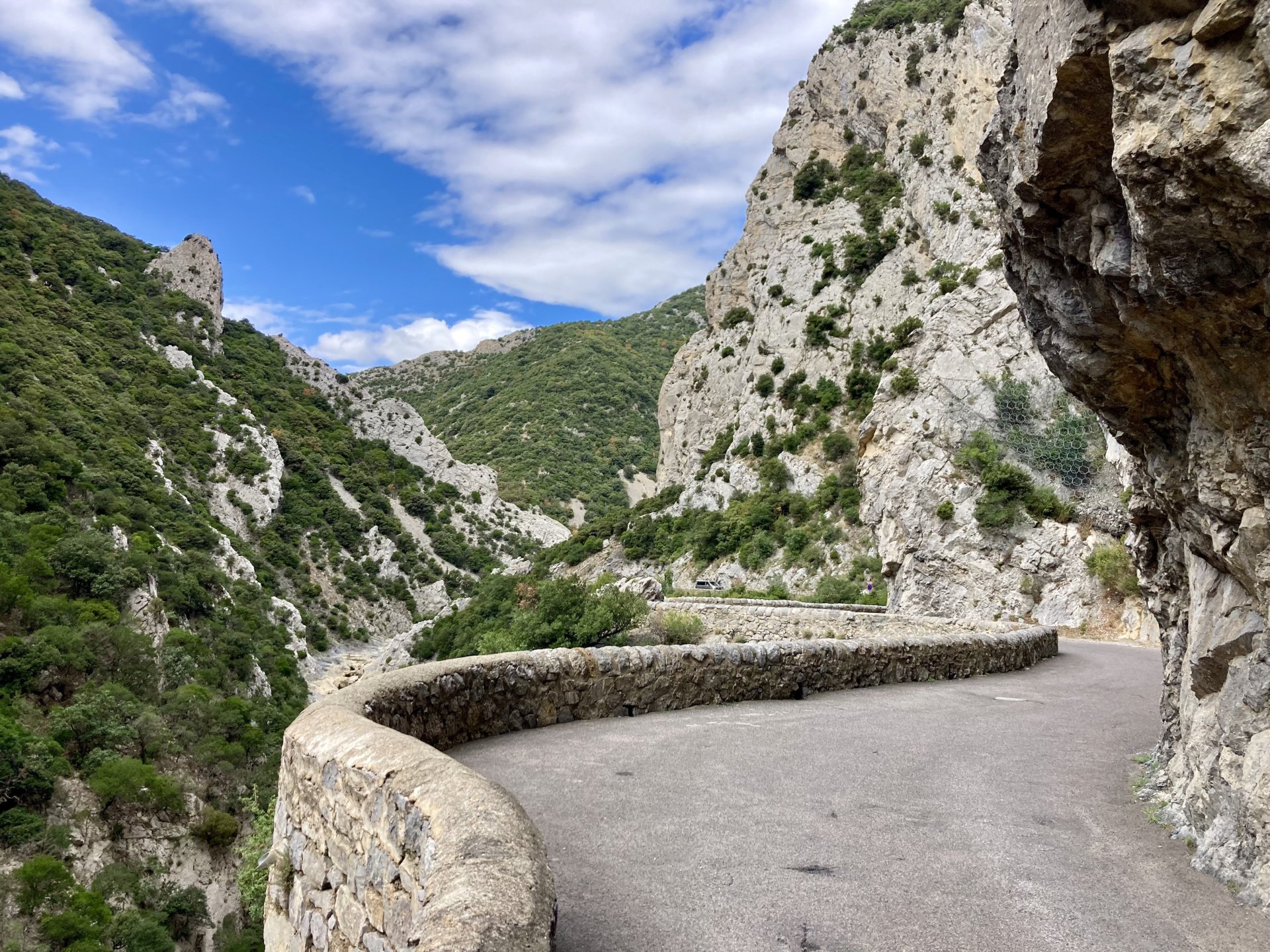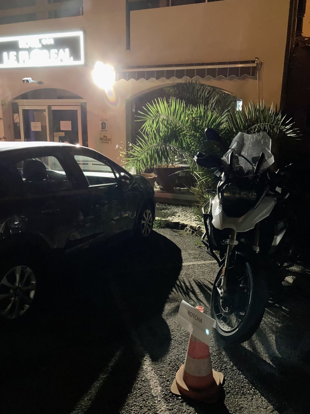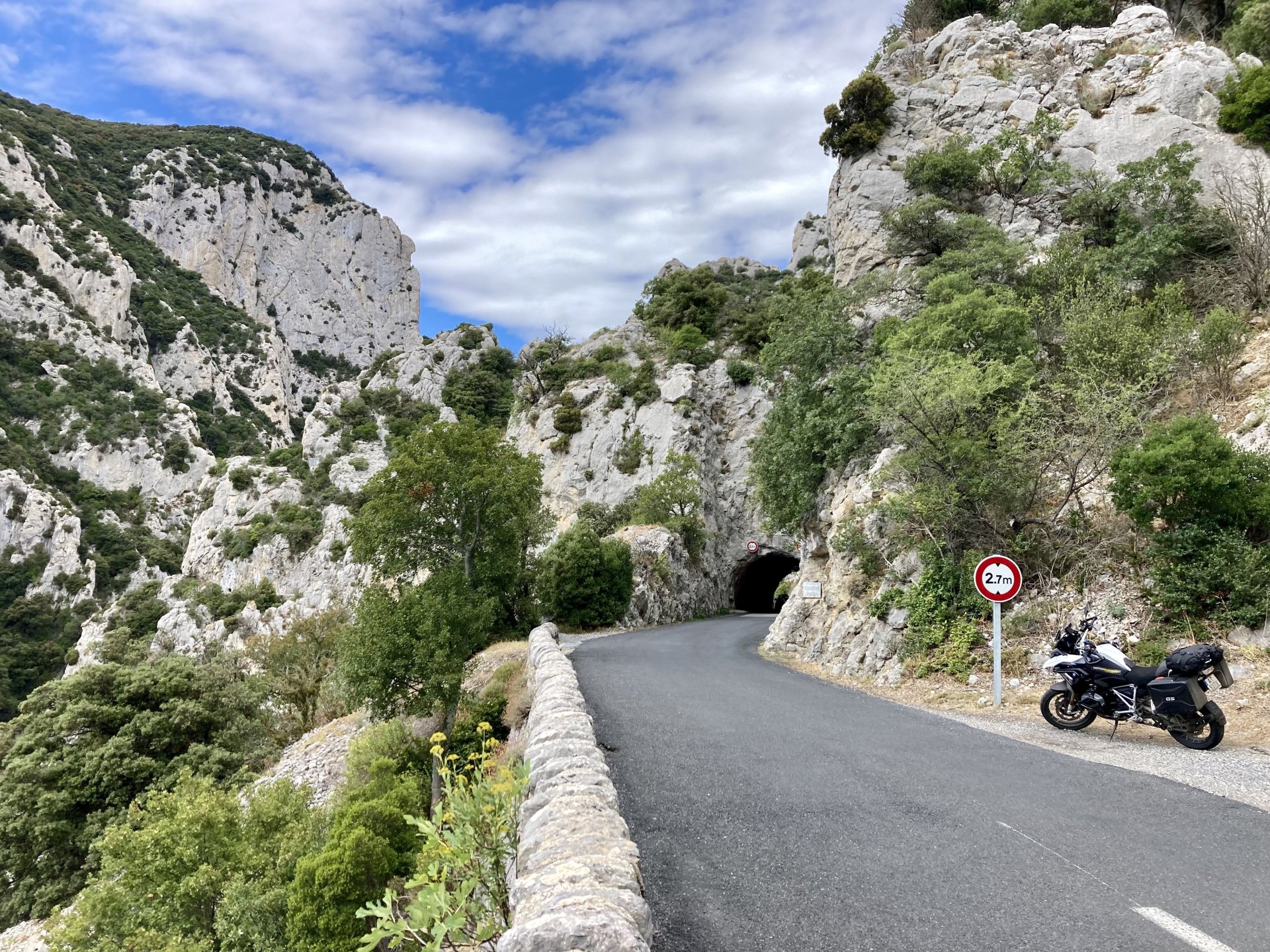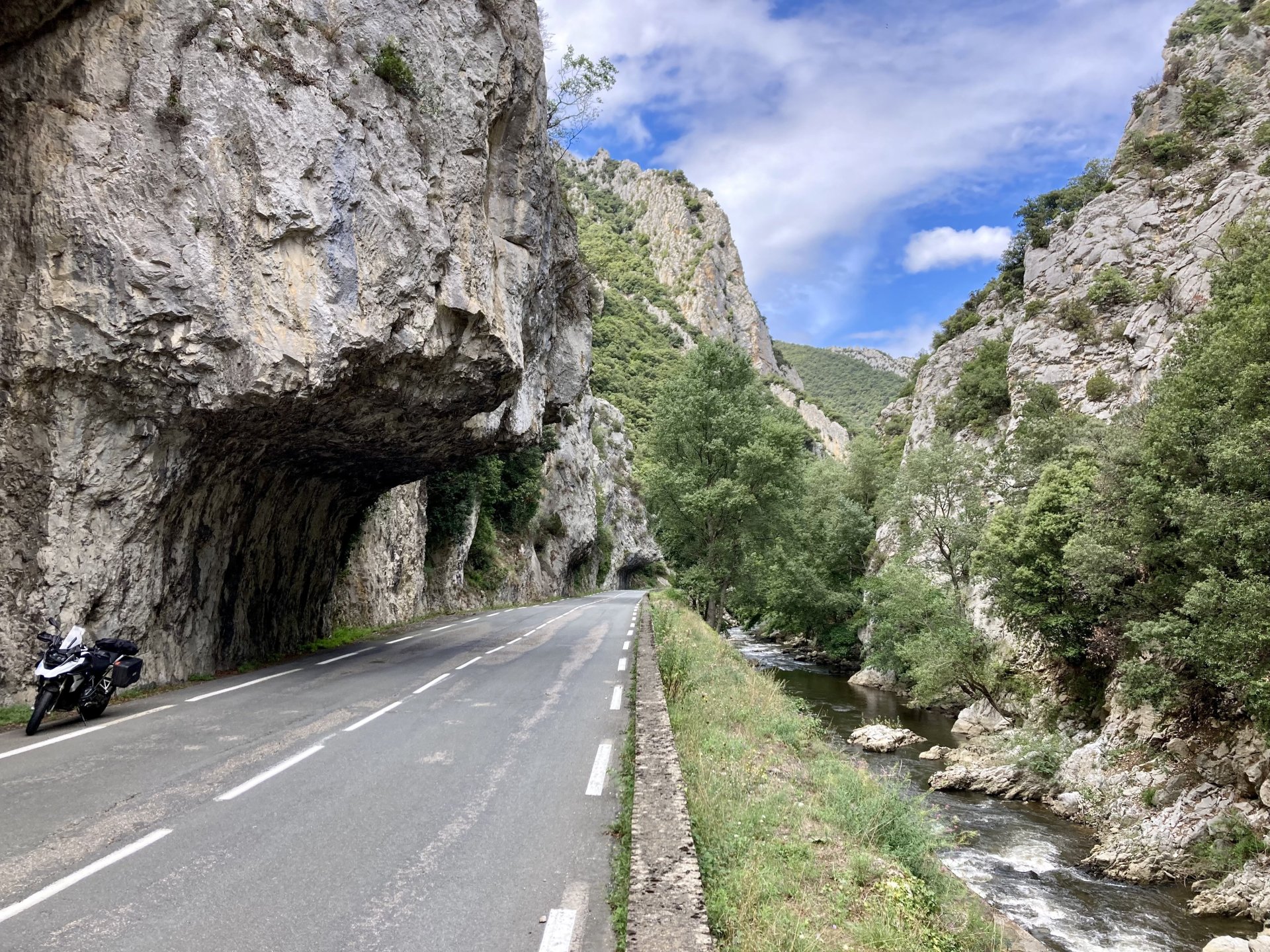 Woke up to a pleasantly cold but dry morning, put the luggage on the bike and made my way to the breakfast table, I needed a coffee and nothing else after the previous night's excesses. One of the Belgium madames was not having it and with a very stern look and a "non non non, monseur il aurait le petit croissant" put a croissant in front of me, so I had a croissant Left late, and was on the road at maybe 10. The next two hours would be some of the most bucolic simple beauty roads I have ever been on. Little traffic, perfect tarmac, blue skies replacing clouds, and green views. I left Lourdes heading east. And the Pyrenees behind me: Half an hour to 45 minutes into it, I stopped to look at a pretty castle, Chateau de Mauvezin. I didn't bother to go in as I wanted to make some progress today, while still spending the morning and some of the afternoon riding on small roads. Couldn't get more French than this. Stopped at Quillan to buy some water, and to see if there was a coffee to be had, but I think this is currently a sad town. Following the hint from @Tango in one of his ride reports, I was headed to the Gorges de Galamus, first riding on some main roads, quite wide to get there. They were quite the biker destination as several bikes were racing back and forth on the same bit of road. I took the hind and didn't pay much attention to speed limits either. Stopped to buy lunch, a peach and a few nuts, from a roadside vendor. Made some progress on a more or less open road And eventually rode through the Gorges de Galamus, the road is just lovely if just a little distance, but it was packed with hikers. Still interesting and I did enjoy it. Having approached the Mediterranean, the bad weather was definitely behind me and it was now hot. I stopped for a late lunch on the shade of a tree, had my peach and nuts, and decided on what to do next. It was now almost 16:00 and I still had some way to go before Carcassone, my stay for the next day would be in Milan. I could split it in two average journeys, or decide to do two proper days with a little bit of epic in between. I chose the second option as this was a biking holiday and I didn't feel like hanging around. Since @Tango knew I was riding near his home he had packed his things and ran away with the wife, far away where I couldn´t have a chance of meeting them, so I pointed the bike to Nice and hopped on a motorway, rode for a few hours with nothing but a stop to fuel and arrange accommodation, the 28º/29º warmth was welcomed after the previous two days weather. I made it to Vence, on the outskirts of Nice, by almost 22:00. Restaurants were closed so before I checked into one of the cheapest options in the area, I had a nice street pizza. For something made in the back of a truck, it turned out very nice. The hotel was old and seemed like a moroccan hotel of the kind that hasn't seen maintenance in 30 years, but the lady at the reception desk was lovely and had reserved me a little corner of the secure parking. Was a little tired, so after a shower I slept nicely with the window open.4 points
