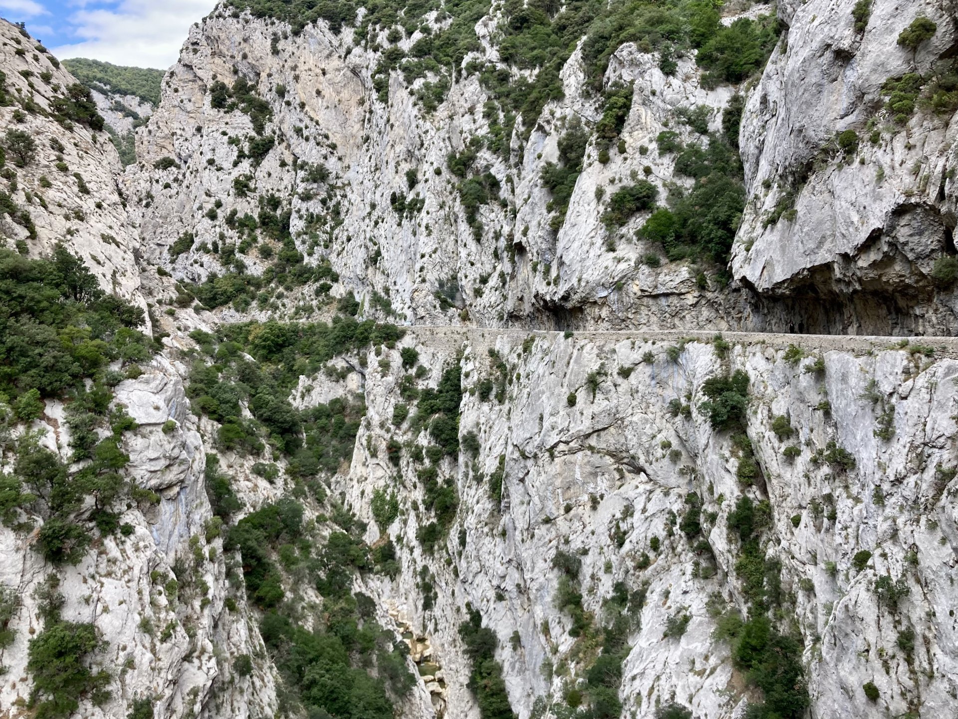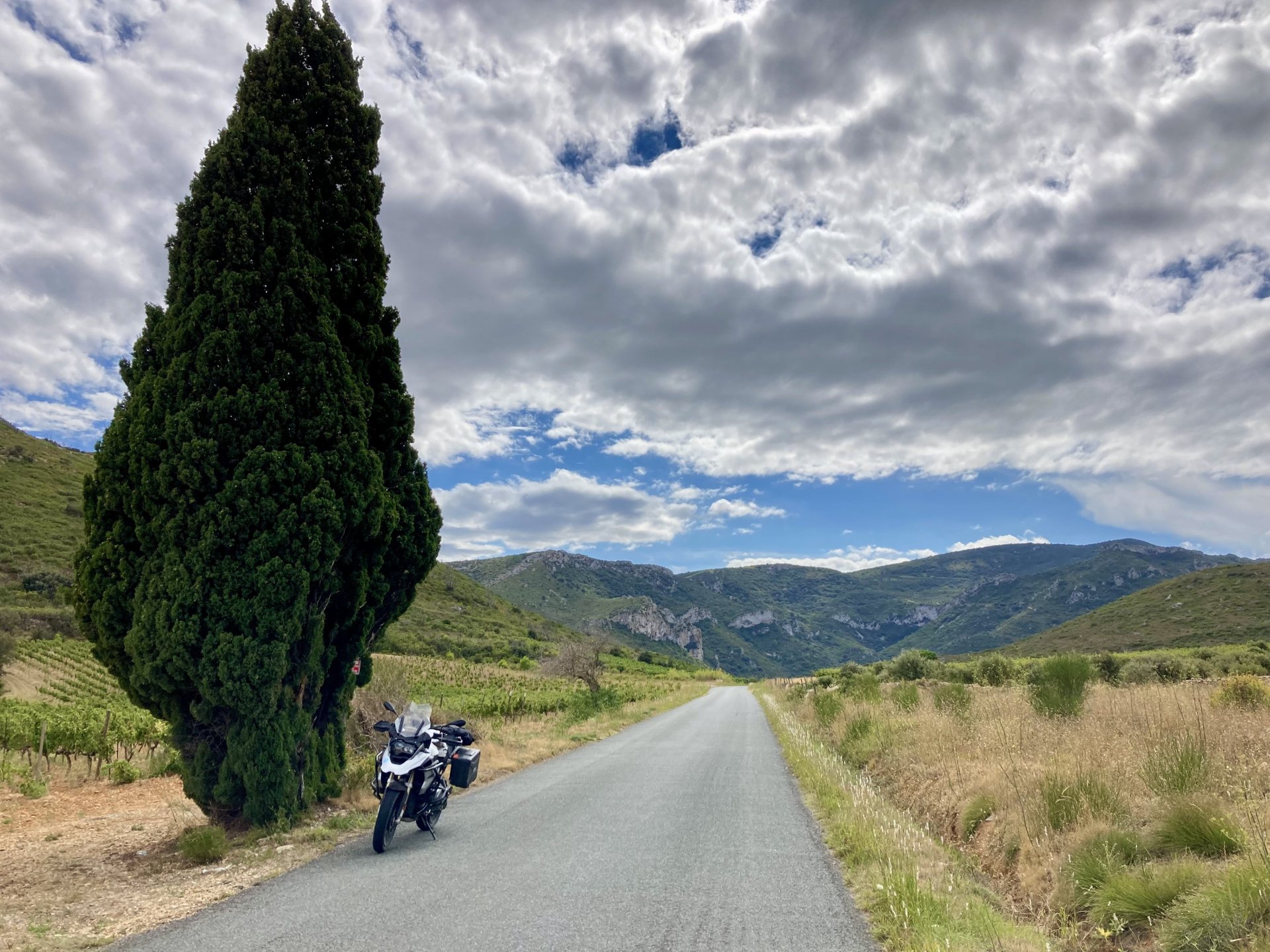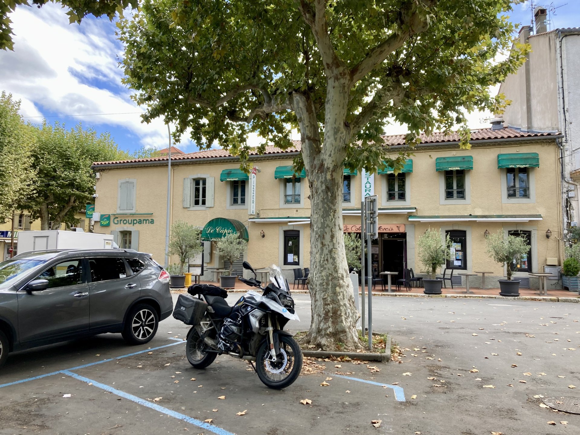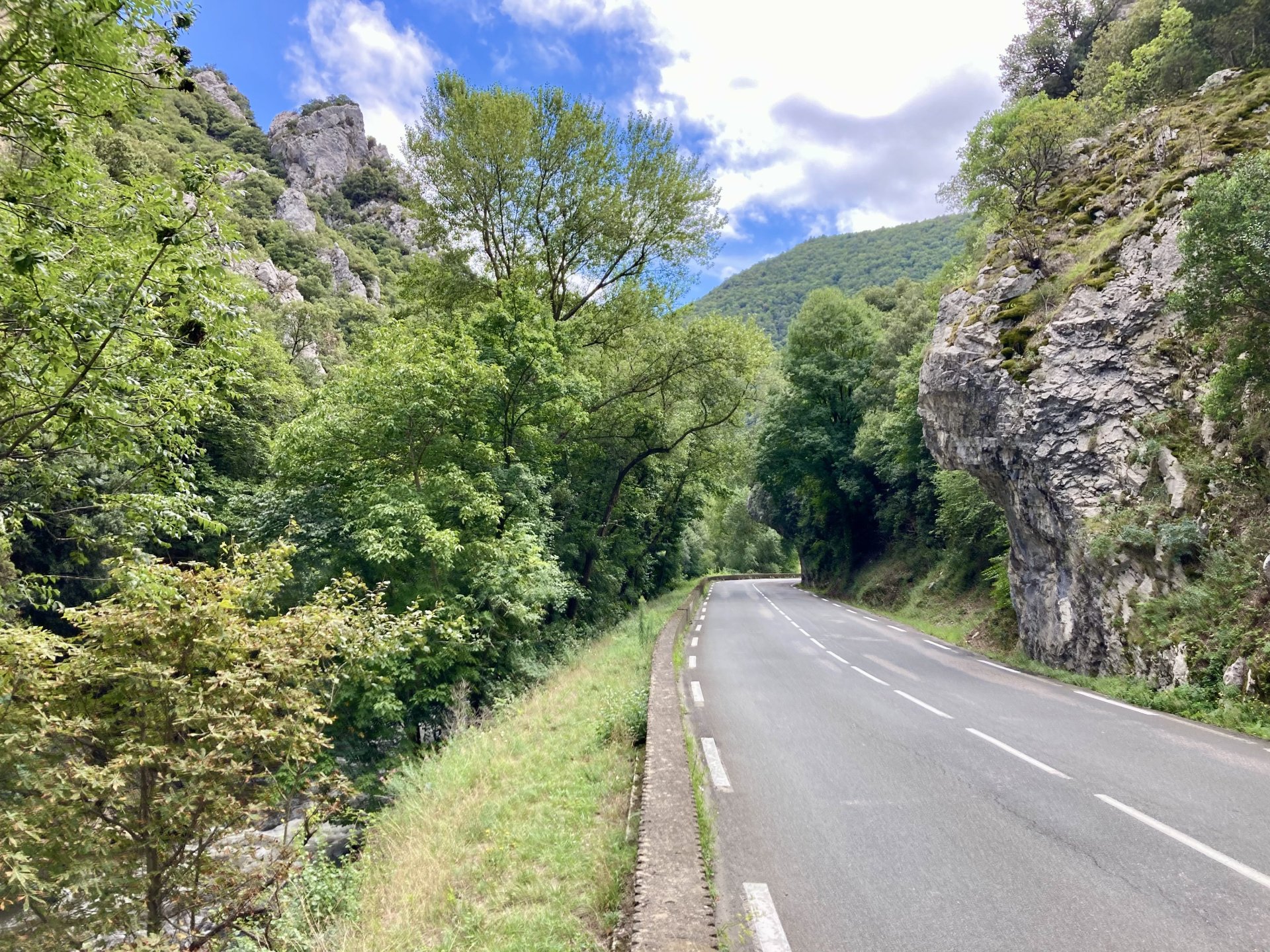 Woke up to a pleasantly cold but dry morning, put the luggage on the bike and made my way to the breakfast table, I needed a coffee and nothing else after the previous night's excesses. One of the Belgium madames was not having it and with a very stern look and a "non non non, monseur il aurait le petit croissant" put a croissant in front of me, so I had a croissant Left late, and was on the road at maybe 10. The next two hours would be some of the most bucolic simple beauty roads I have ever been on. Little traffic, perfect tarmac, blue skies replacing clouds, and green views. I left Lourdes heading east. And the Pyrenees behind me: Half an hour to 45 minutes into it, I stopped to look at a pretty castle, Chateau de Mauvezin. I didn't bother to go in as I wanted to make some progress today, while still spending the morning and some of the afternoon riding on small roads. Couldn't get more French than this. Stopped at Quillan to buy some water, and to see if there was a coffee to be had, but I think this is currently a sad town. Following the hint from @Tango in one of his ride reports, I was headed to the Gorges de Galamus, first riding on some main roads, quite wide to get there. They were quite the biker destination as several bikes were racing back and forth on the same bit of road. I took the hind and didn't pay much attention to speed limits either. Stopped to buy lunch, a peach and a few nuts, from a roadside vendor. Made some progress on a more or less open road And eventually rode through the Gorges de Galamus, the road is just lovely if just a little distance, but it was packed with hikers. Still interesting and I did enjoy it. Having approached the Mediterranean, the bad weather was definitely behind me and it was now hot. I stopped for a late lunch on the shade of a tree, had my peach and nuts, and decided on what to do next. It was now almost 16:00 and I still had some way to go before Carcassone, my stay for the next day would be in Milan. I could split it in two average journeys, or decide to do two proper days with a little bit of epic in between. I chose the second option as this was a biking holiday and I didn't feel like hanging around. Since @Tango knew I was riding near his home he had packed his things and ran away with the wife, far away where I couldn´t have a chance of meeting them, so I pointed the bike to Nice and hopped on a motorway, rode for a few hours with nothing but a stop to fuel and arrange accommodation, the 28º/29º warmth was welcomed after the previous two days weather. I made it to Vence, on the outskirts of Nice, by almost 22:00. Restaurants were closed so before I checked into one of the cheapest options in the area, I had a nice street pizza. For something made in the back of a truck, it turned out very nice. The hotel was old and seemed like a moroccan hotel of the kind that hasn't seen maintenance in 30 years, but the lady at the reception desk was lovely and had reserved me a little corner of the secure parking. Was a little tired, so after a shower I slept nicely with the window open.4 points