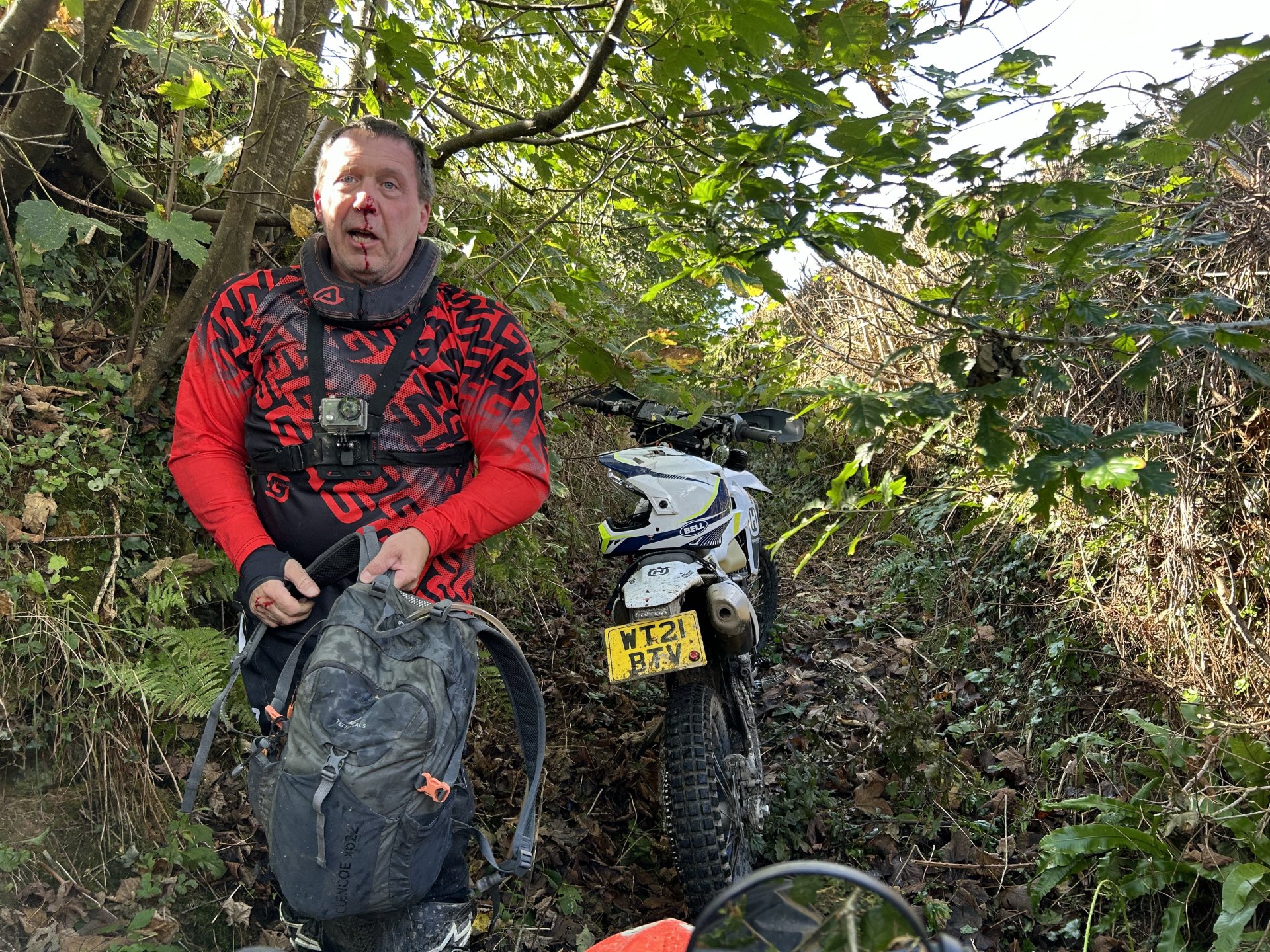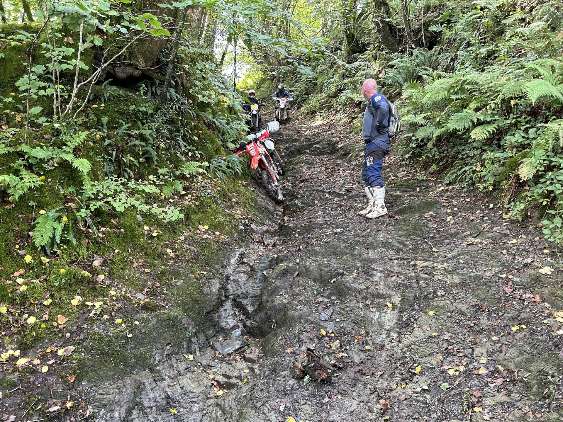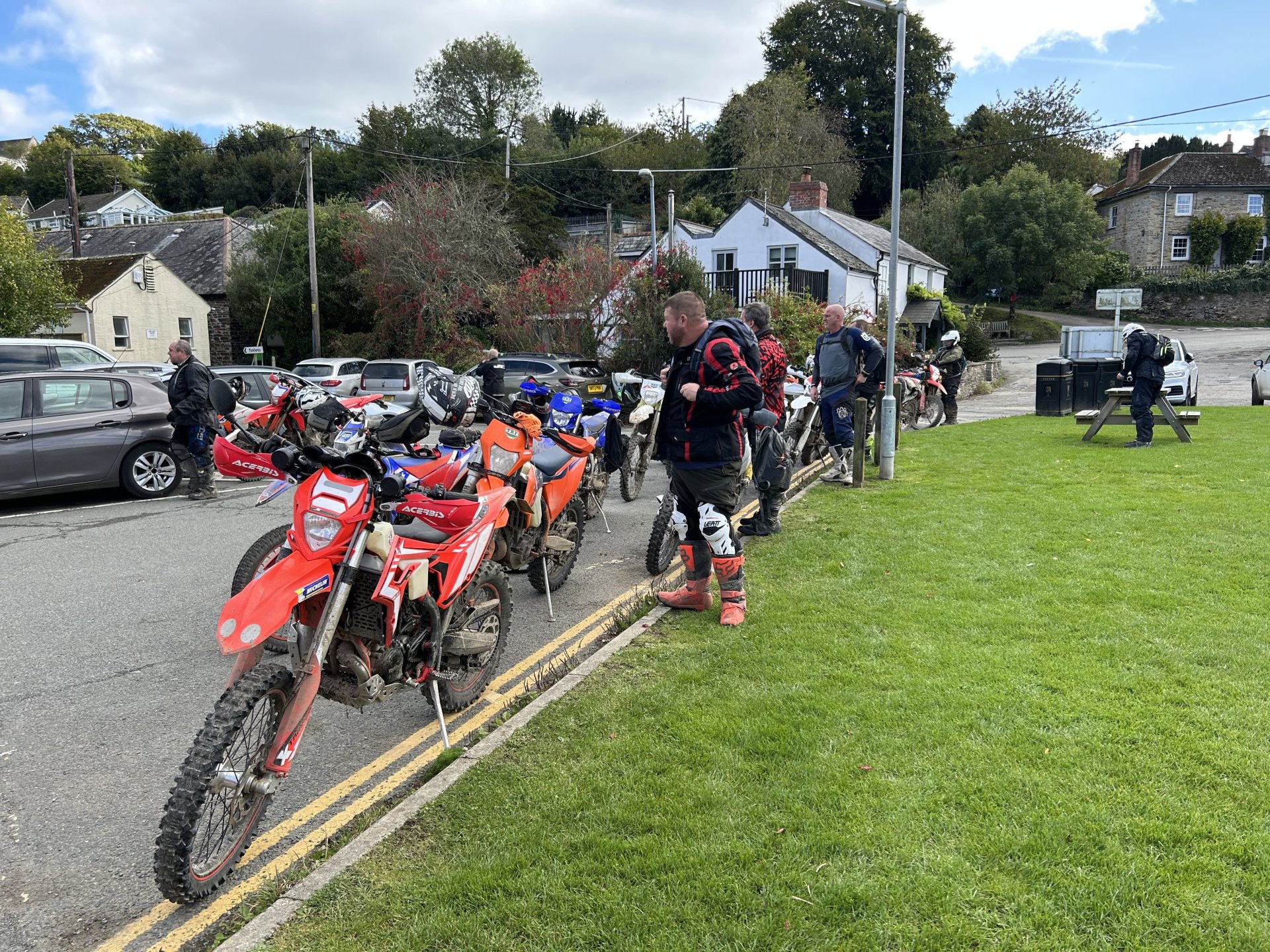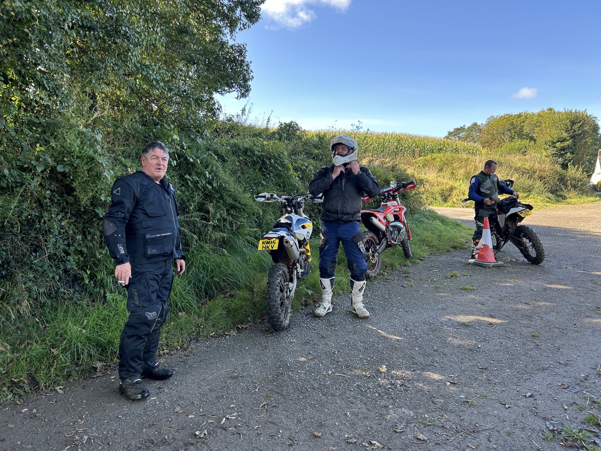 The weekend for me was a trip to Cornwall to do some trail riding with the TRF, I think there were around 25 riders and few including myself brought along their better half, We stayed at a campsite near a place called No mans Land, we were in a static caravan this time very civilised for me. Friday was just a catch-up with some and introductions to others with a few beers. Saturday morning i got up with a muzzy head after the previous nights beer drinking and no water but after a good fry up and a dump i was ready to go. The routes were plotted and lead by someone else so all i had to do was follow on the day. There were three separate groups two groups riding the same route but in different directions and one group doing an easier route. We left the women to fend for themselves and headed off on a what was a cold but sunny morning to the first lane about a mile away from camp, Our intrepid leader hadn't ridden it before so didn't know it was a bit washed out so we had to walk the bikes in some places My body hadn't started running on all cylinders at this point and it felt like i was going to stall At the bottom we all stopped for a rest it was only a short lane but i was a bath of sweat and really out of breath i thought if this is what the rest of the lanes are like i shall be returning to the campsite early, The few miles of road to the next lane cooled me down nicely and i was pleased to find the following lanes were nice and easy sunken roads but a little overgrown so had to duck under low branches and other overgrown bushes. This lane had a slippery rocky section with a step on it quite difficult to get up So while gasping for air after getting up there the smokers light up After the last lane I discovered that the exposed rock on all of the lanes was very slippery and difficult to walk on let alone ride, we had to stop here to sort out one of the lads handguards after he binned it on the rocks (the one with the fag in his hand in the previous photo) Our intrepid leader didn't listen to me when i said keep the visor down in the overgrown lanes and this was his punishment, a bramble was hiding behind a branch and kissed his nose We stopped at Penpoll for a pastie and a drink about mid day, as we finished one of the other groups turned up and after a short chat we were off. the tide was out so sot the crossing was easy here Our leader taking the wrong line here and getting bogged down, his choice of rear tire didn't help ok on the rocks but shit in mud as i followed his line and managed to plough through to the end, the other side was easy as shown in the video. The lanes after this were easy enough fast flowing and uneventful so no photos, then they started getting interesting and have i mentioned before very slippery, Surprisingly my body had caught up and was now running on all cylinders so when we went down this one i didn't feel like i was going to have a Sean when i had to manhandle the bike down it. This lane has been named the pink panther for some reason. the rest of the lanes all had this slippery rock in various forms even on the flat it had you sliding sideways. Here's one of the lads stuck on it And he's up Looks nothing on film Before we moved on a lad turned up on a BMW GS850 going down it we wished him good luck and moved onto some more slippery down hill rocks for a change The strata going diagonally across the trail really made for a difficult ride A short rest before hitting it again further down. Last photo of the day. I was sent ahead on this one, again some real slippery rock to ride up with a step on it and diagonal strata making it real difficult to ride, when i got to this gate i waited for about 15 minutes and no sign of anyone. Tried phoning with no answer so thought they had changed their minds and i decided to go back down to see where they were only find them all stuck on the rock step heading up which meant i had to turn around and do it again it was harder the second time There were a few more lanes after the one above which were uneventful so no stopping for photos. Got back to the campsite around 6pm feeling pretty pumped and could have done some more. loaded the bike and my gear in the marmite wagon before having a shower, after that i couldn't stand up straight and was aching like hell lol a burger from the BBQ and a few beers sorted that out. Woke up refreshed had a fry up and a very windy drive home. Will need to get my fitness up if i return next year as it will probably be two days riding. Our route3 points