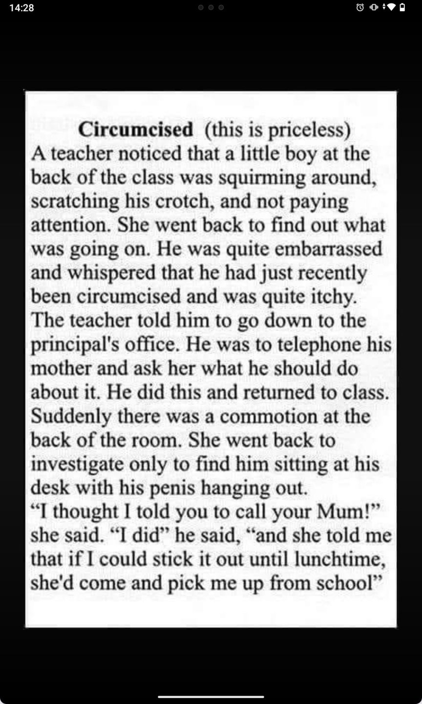 A guy called Simon went on Stars in your Eyes. Mathew Kelly noticed he had a funny walk. "You ok, Simon, I noticed your legs are a bit shaky?" "Fine, thanks for asking, Mathew," he replied. "It's just that I had a serious accident which resulted in having to have my legs amputated." "I'm really sorry to hear that, mate." Mathew said. "It"s not so bad really," Simon told him, " In fact I'm very fortunate because my uncle was fatally wounded in the same accident but the doctors managed to save his legs and transplanted them onto by body." "What a sorry and uplifting story." Mathew replied. " Anyway, who are you going to be tonight?" "Tonight, Mathew, I'm going to be Simon and Half-uncle."5 points