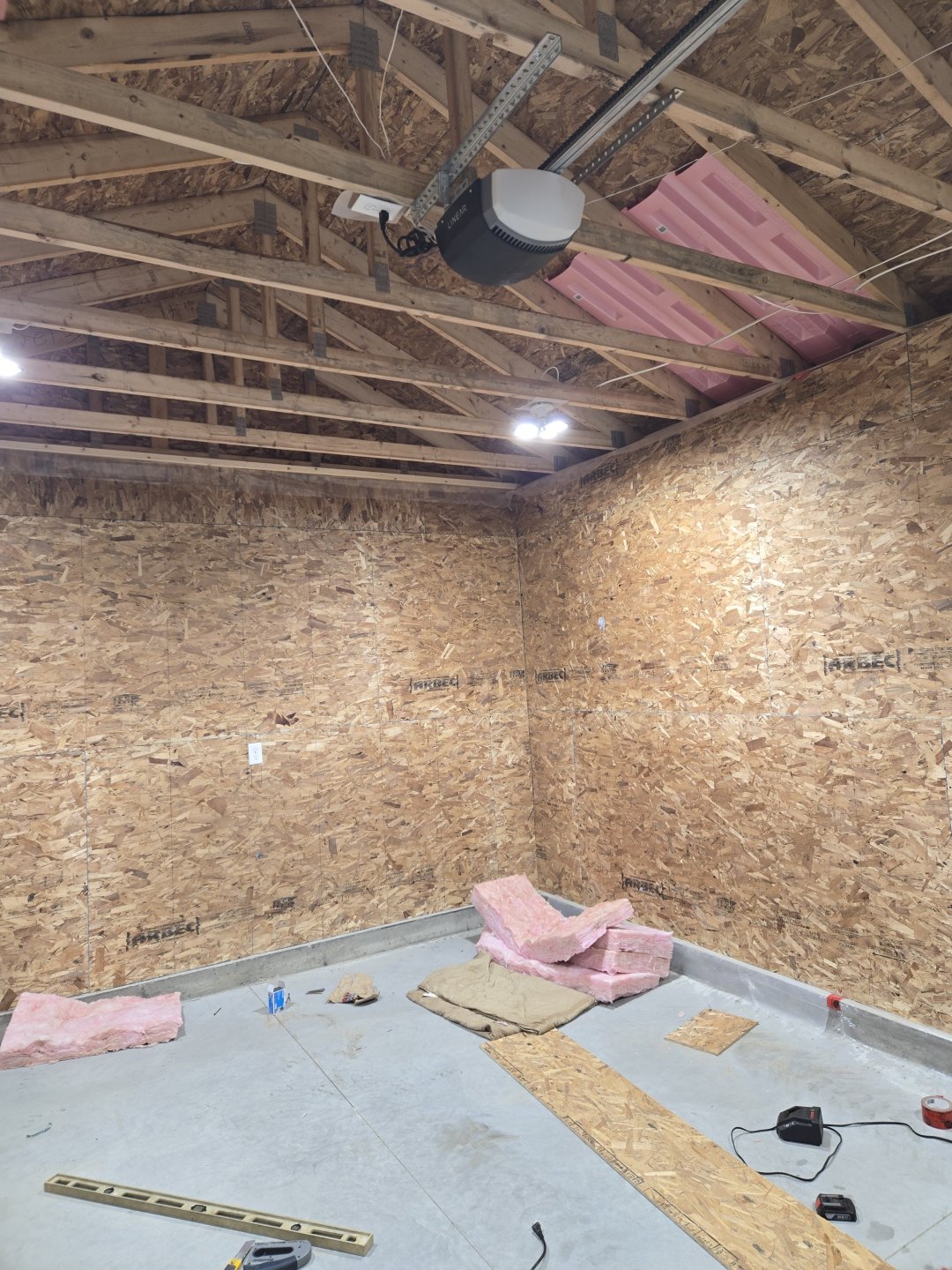 18. Well the pavement guys showed up yesterday morning...progress is coming along...all 4 inside walls are insulated and sheeted...got the roof now to finish....oh and I found these lights...boy what a difference...10 thousand lumens...for 30 bucks a pop..