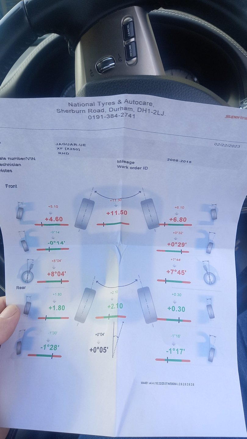 Please please please let the non shedding tyres arrive.... So far the jags front tyres have covered 2700 miles from new on 1st December and they are shagged... Got tracking checked yesterday and ... Yes while it is out massively for the toe settings everything else doesn't seem too bad and it doesn't pull from straight ahead in a hands off situation. Yes it was my own fault for not getting it tracked in December after the last set only lasted 8k miles before they were totaled from April to December. And expensive lesson learnt
