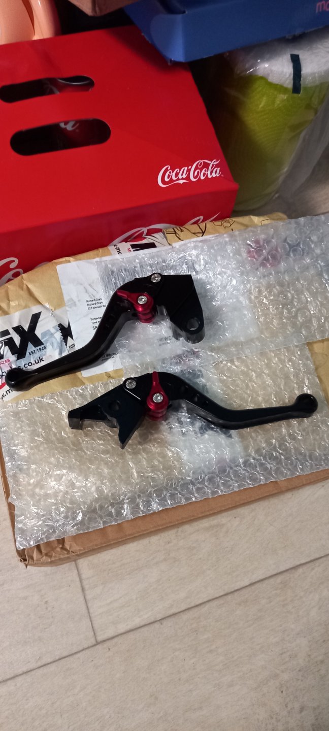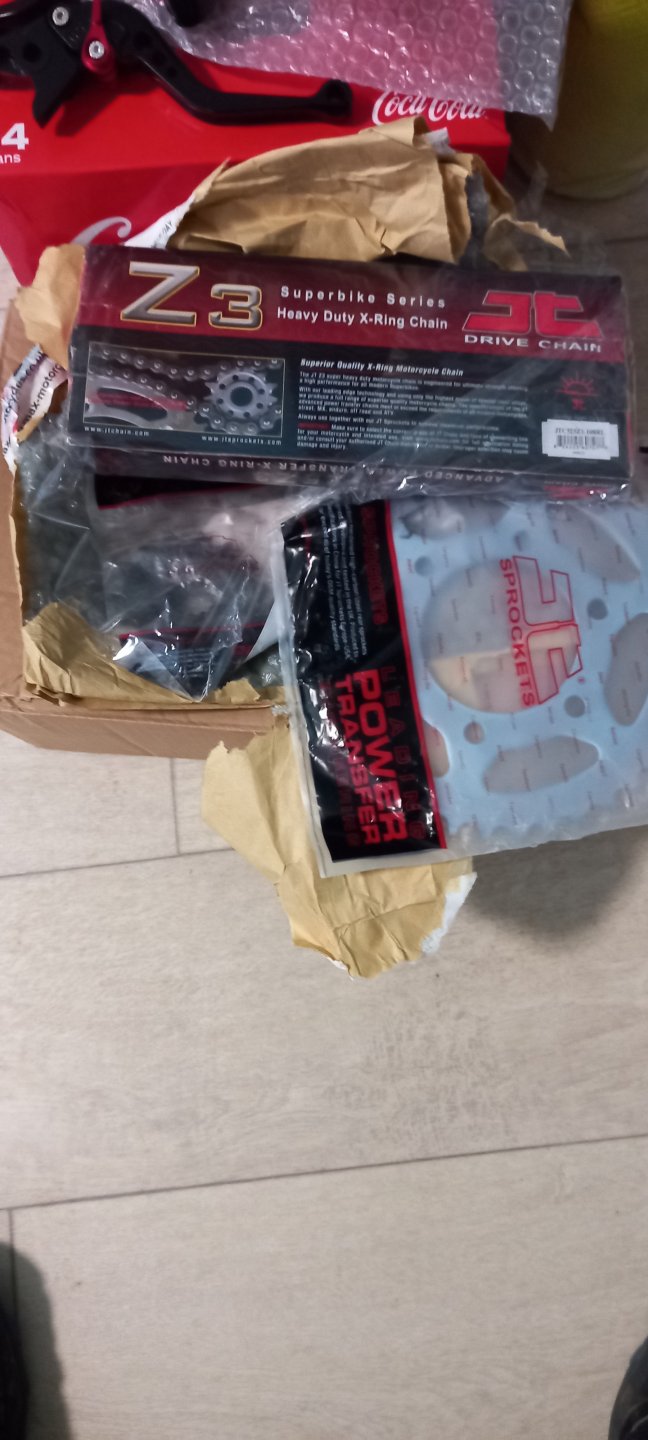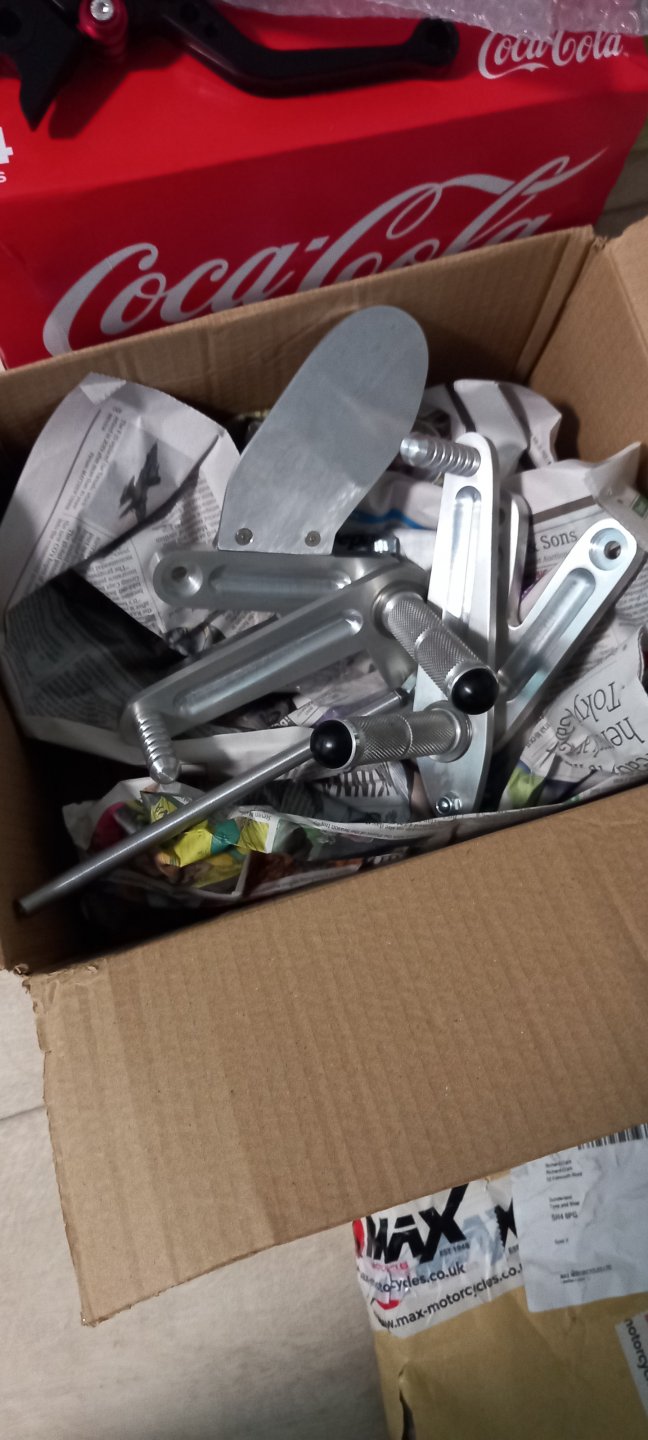 So my first goodies have arrived; Levers Rearsets Chain and sprocket kit. Ordered but yet to arrive is; Full race fairing, undertray, hugger. So far spent = £610 Still to order are; New battery Bar end lever guards Full face lid, one piece suit, gloves and boots