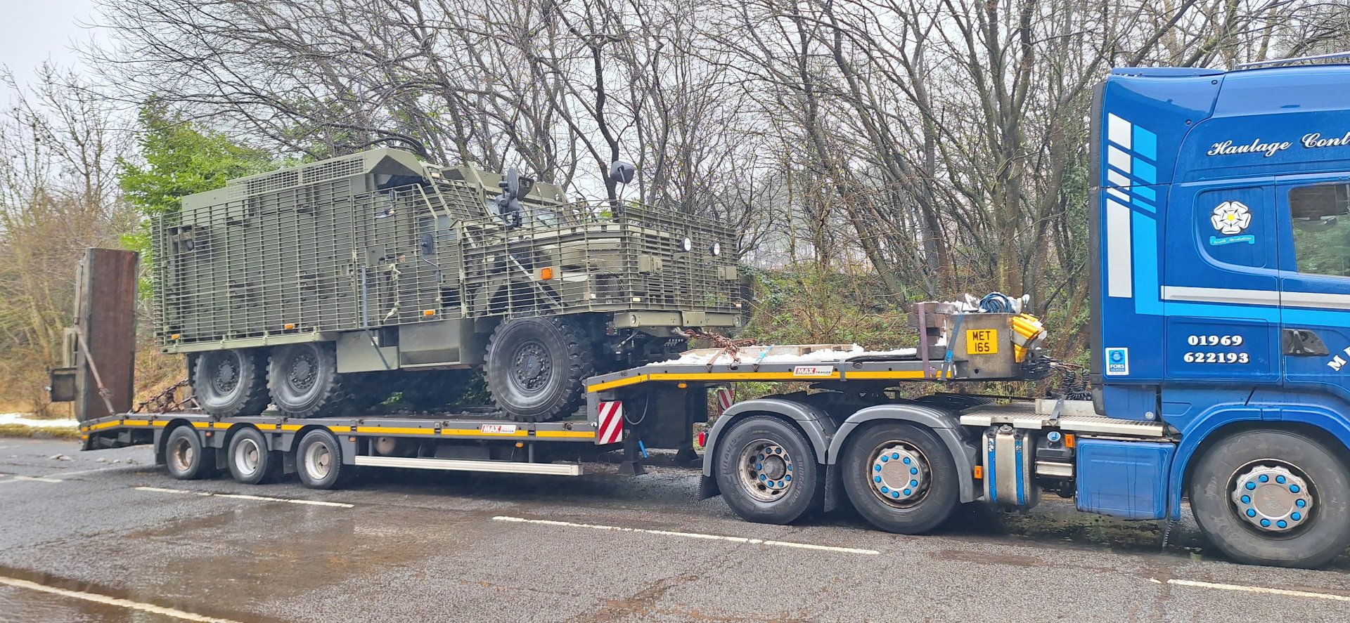 So my day today consisted of go in to work pick up a trailer and go to Catterick army camp to pick up a mastiff. 30.8ton vehicle weight and wide so I had an escort.... oohh er Took it to Wetherby for a trailer swap with its southbound driver. overall train weight was just over 53t First foray in to stgo cat 2