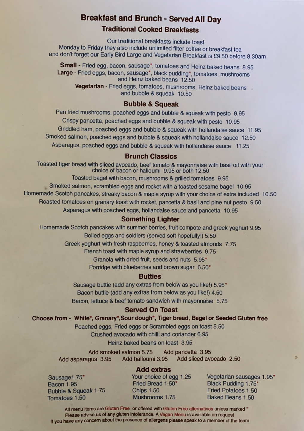 2. It’s all on the pricey side but tastes great (as it should at that price) and is perfectly cooked. Off set against not eating out for a year it was trivial, like being on holiday. Ask me again in a weeks time where to go for breakfast and I’ll be eyeing up the prices with a sharp intake of breath followed by “HOW MUCH?!?!” but yesterday it was worth every penny ?