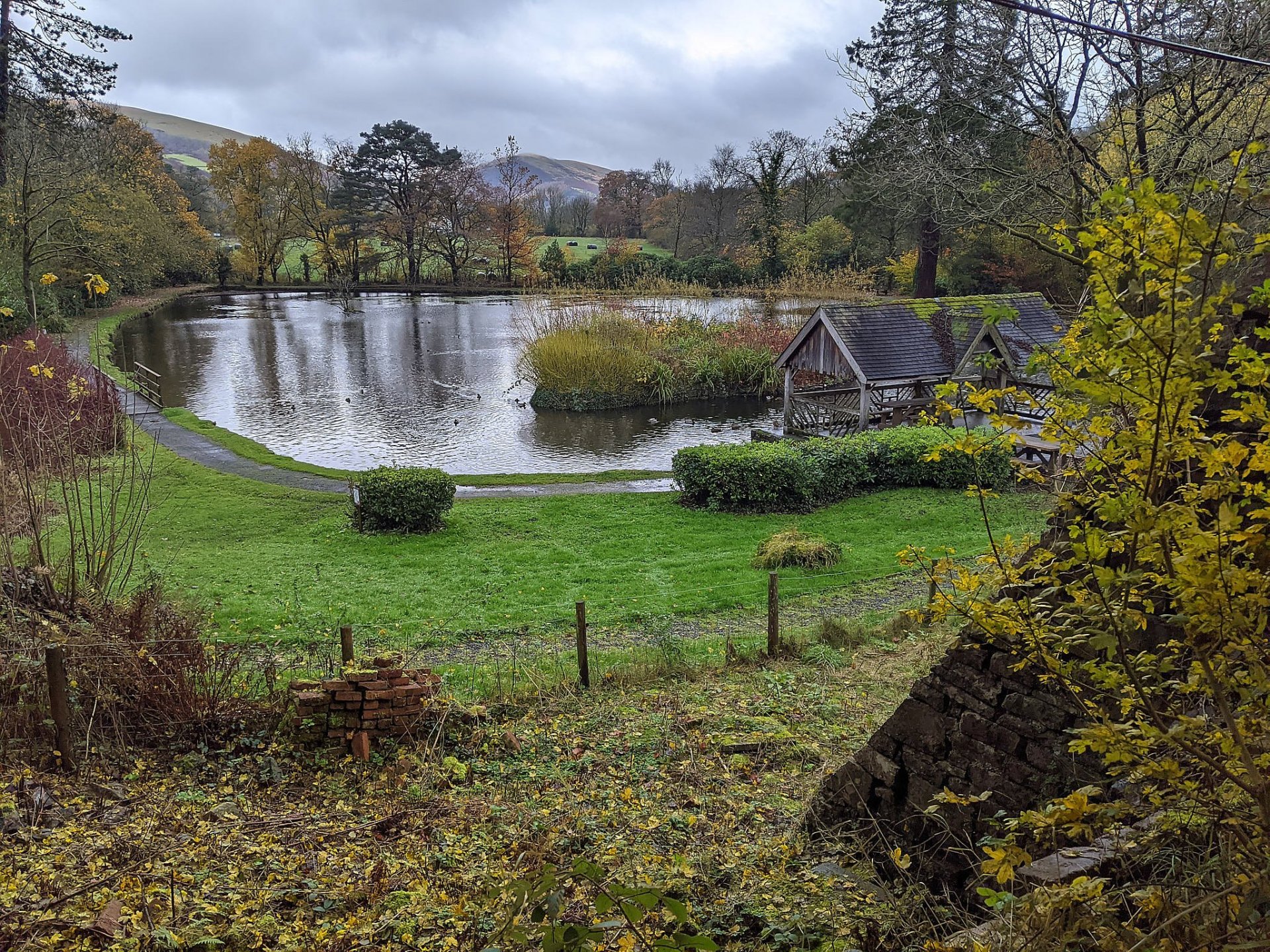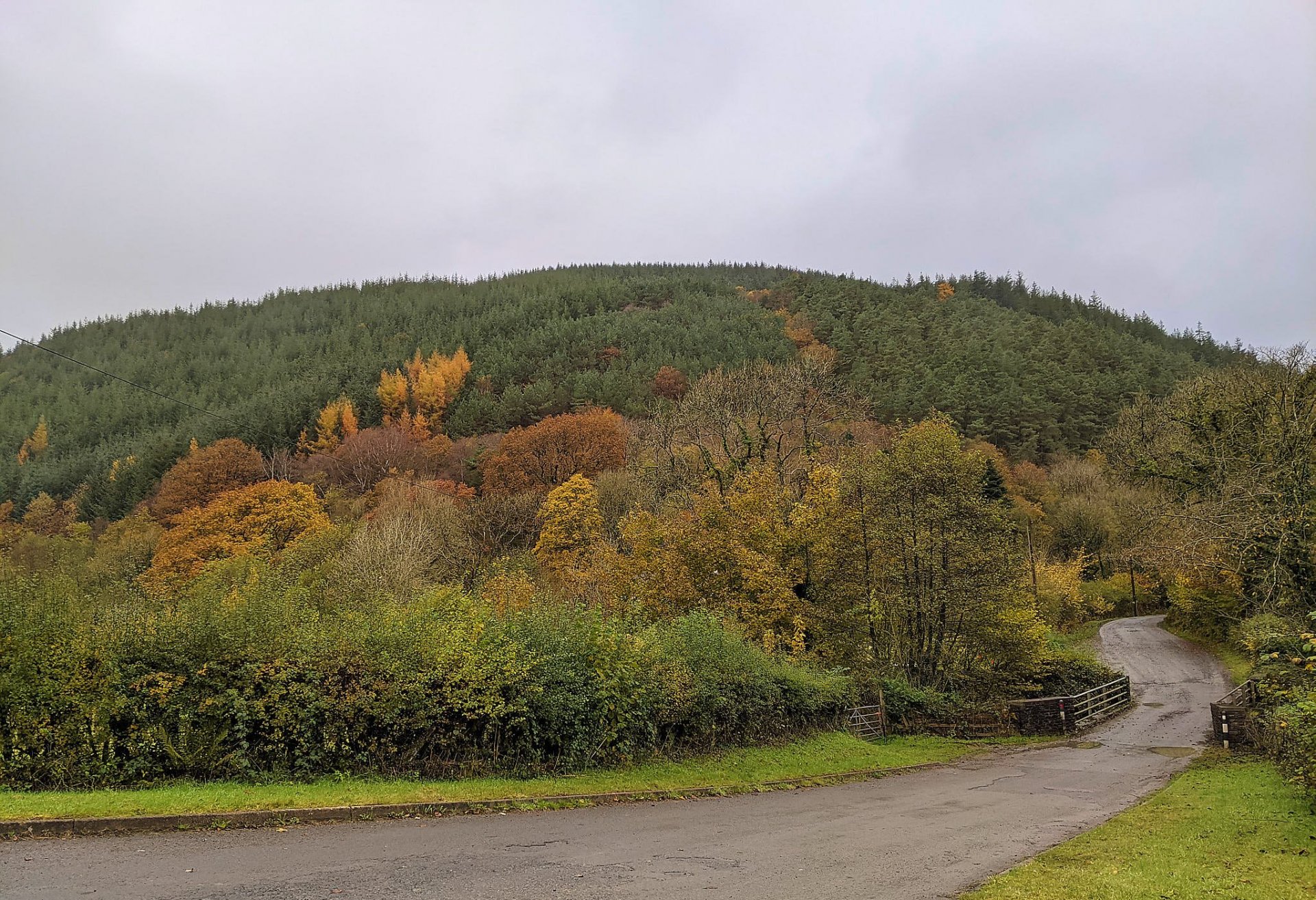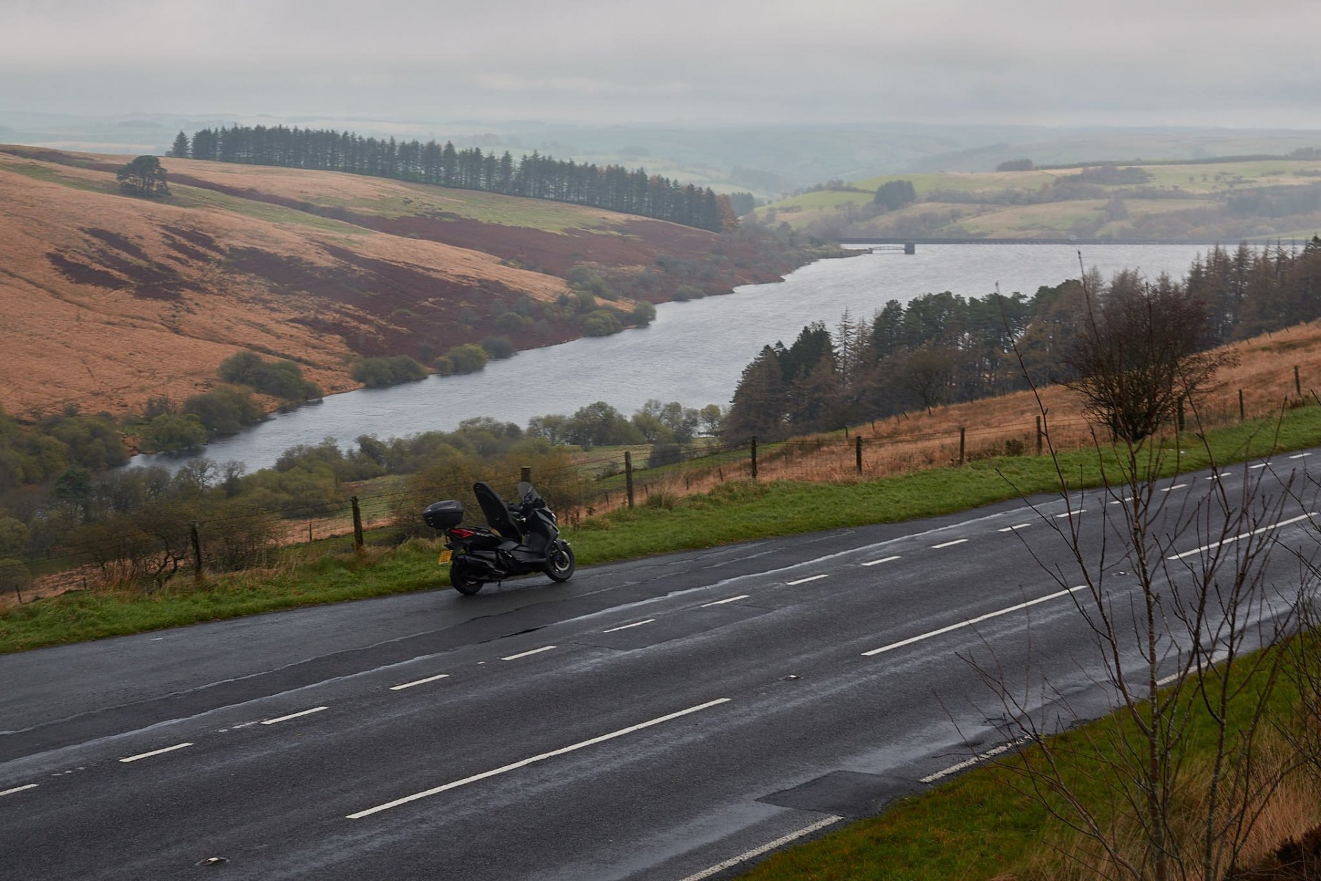Fed up with sitting around the house I got off my arse and decided to go for a ride I headed for Craig y Nos castle and country park as I wanted to get an aerial shot of the castle, a bit drizzly on the way but very mild and no wind at all, up the Upper Tawe Valley (A4067) to the castle, parked up, set up the drone, launched it just to hear a "jobs worth twat" shout "Oi, you can't fly drones here", muppet, damned thing weighs 250 grams it's not like the old days with giant octocopters carrying full size DSLR's, anyway I had to oblige and fuck off, but grabbed a shot of the pond first So anyway, no point in arguing with civil servants, I'll just go back and get my pics from an adjacent field, people don't have the right to the air space above their property, otherwise you could ban British Airways Off and up over the mountain on the A4067 past Crai Reservoir, I can see the clouds are low on the top of the mountains to the west, I hadn't factored in that I'd be riding through there later DOH! Down the other side and through Defynnog and into Sennybridge for a stop at the garage and cafe There were for trail bikes outside, one KTM, an Aprilia Trail (like my old one) and two Royal Enfield Himalayans Went inside, joined the queue to order some brekies and went to sit at a table on my own, the lady behind the counter said "oh I thought you was with those guys next to you, "Nooooo" I said, "they've got 4 dirt bikes all with road tyres on", needless to say they didn't say much to me after that :), especially when one asked "what are you riding?", "my scotter" said I, "but it's seen more dirt trails than those four" Oooh, brekies arrived with a nice pot of tea Filled up with fuel at bloody £1.45 per litre then headed off on the A40 towards Llandovery, had to stop on the way to admire the autumn colours, the pic doesn't do it justice Passed by the West End Cafe and on to the Owl's nest to see who was there, only two bikers, nice old boys on NC750's, didn't stop there as their prices are a rip-off Time to head towards home over the Black Mountain, stunning road all the way (A4069), was often used by Top Gear and other in their programs, however as I started to head up it got very rough very quickly, riding through the cloud and winds got up pretty high too, slowed me right down to a crawl in places and couldn't see more than 60ft ahead Headed off from the car park higher into the cloud and as it levelled out I spotted two other nutters in the cloud with me Dropping down the other side towards home and it was boring towns the rest of the way after this: