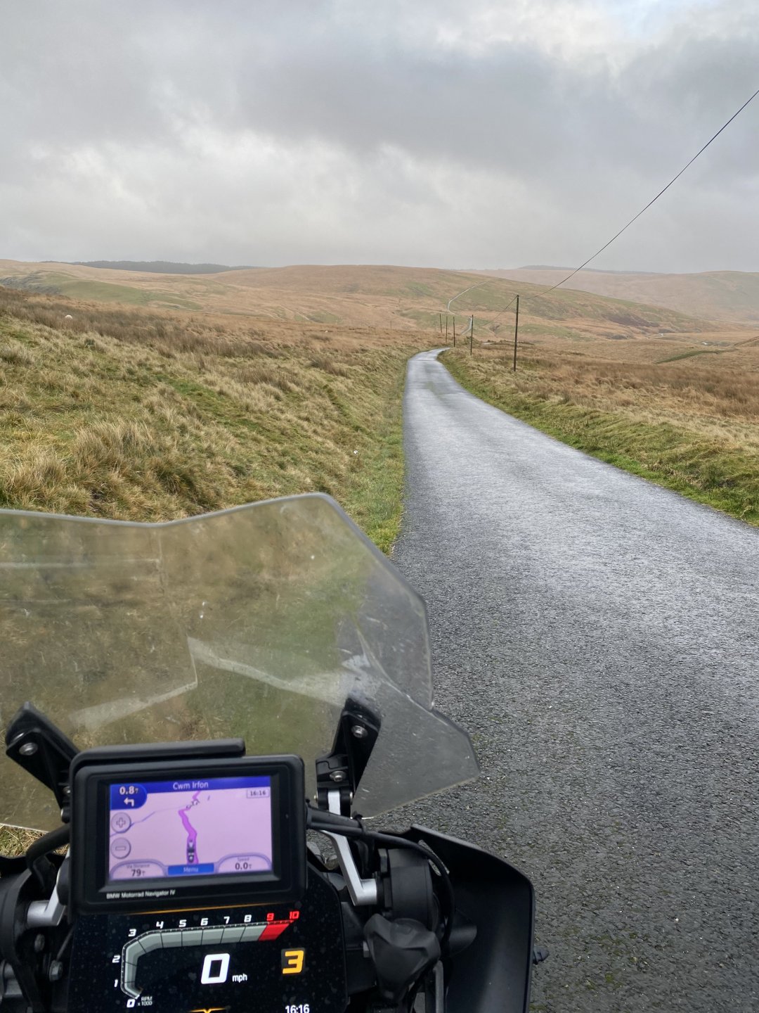 Nothing special, but took me all day. Lots of mud and leaves on the roads, mainly wet, so took it easy. Nice to get out but getting off the bike once home was a bit like the guy on the Kawasaki in Gumball Rally. Not cold at all, but joints seized up. I really should stop and stretch more often. Looks like frost but just wet. The rain got worse after this.