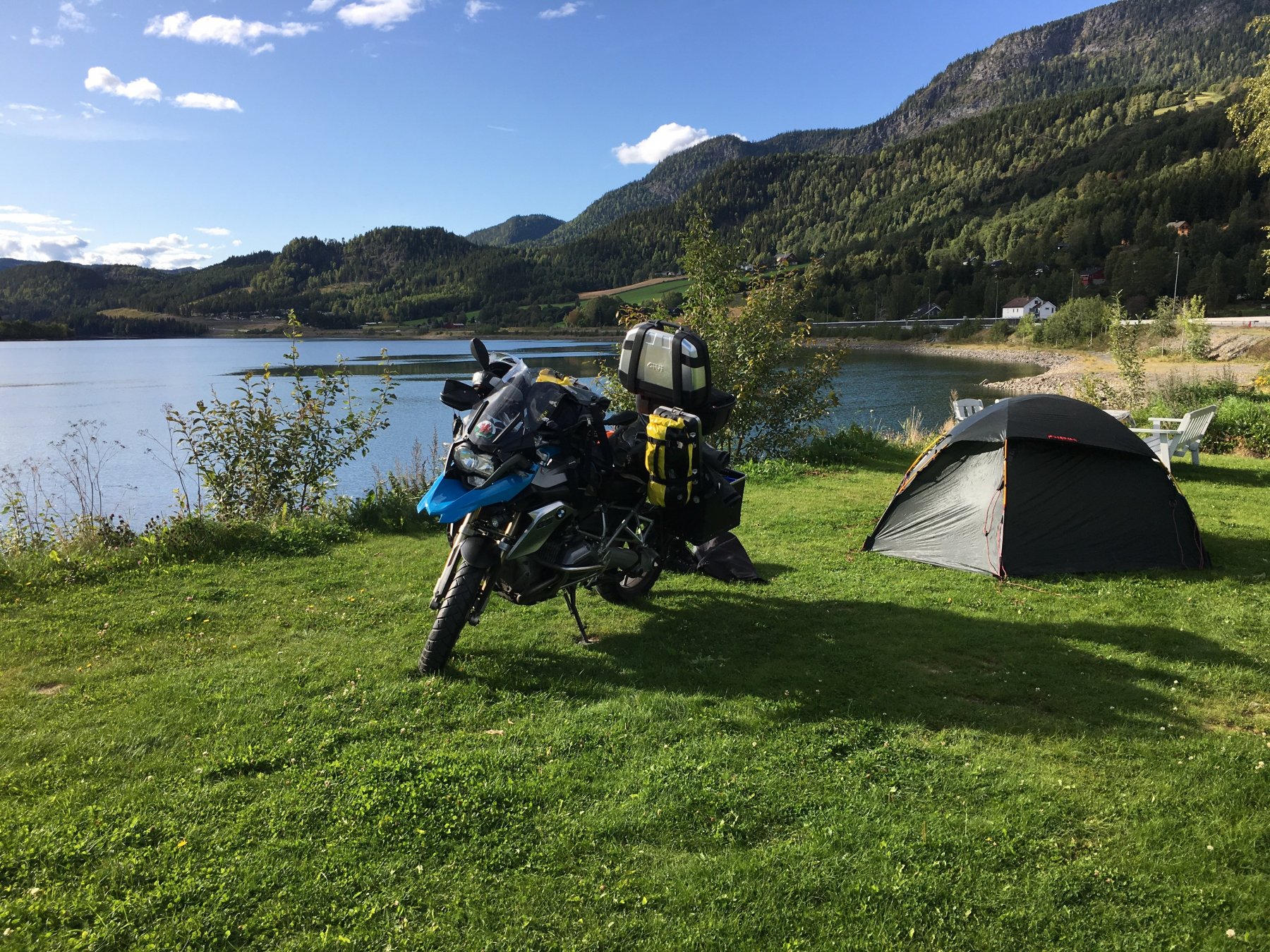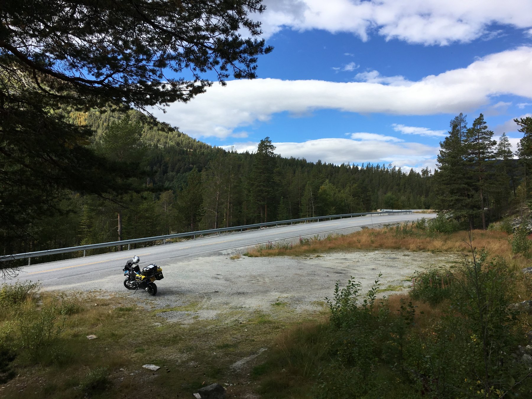 Sunday 3rd Sept The road up to the Swedish border with Norway was very interesting passing through several ski resorts. The road coming down from the heights was quite enjoyable but the Swedes supposedly have an idiot proof system whereby the whole stretch is limited to 70 km an hour regardless of the straight bits in between the bends. Crossed over into Norway and stoped at a cleared bit of forest to take in the view. A shame about the tree stumps. I stopped at Lillehammer for a McDonald’s. Unfortunately the Wi-Fi didn't work so really it was a wasted break, but I was ready for the food. Rode about another 20 kms to find this place called Odden Camping, quite expensive at €20, but beggars can't be choosers. Somewhere to the west of Lillehammer having only done about 250 miles today. The tent was wet so I needed an early break in order to get it dried out. Tent up and dry now. Time for a brew and shower before chilling with a book.