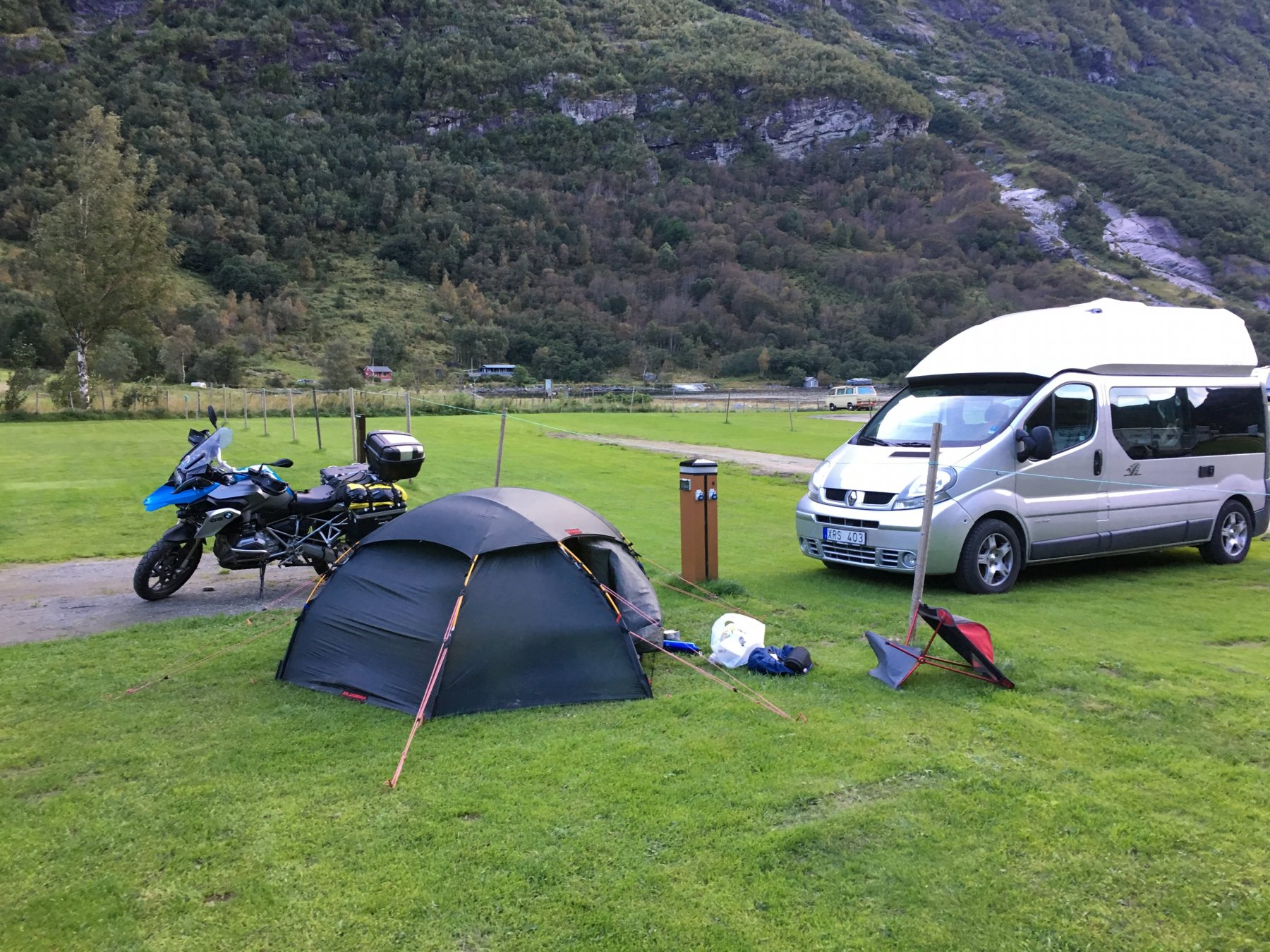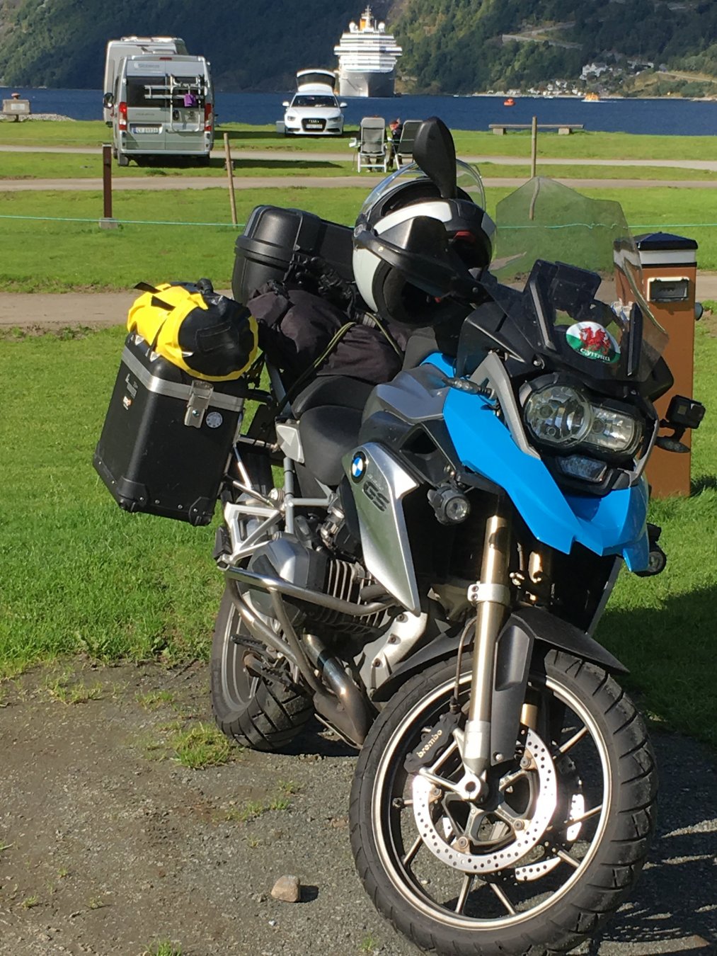 Monday 4th Sept Lovely road over to Geiranger. Hassle with petrol pump payment system with apparent large payments from my account, but seems it’s a deposit which they never claim. Weird. Piss break. Apparently this stuff is edible, the reindeer eat it. Blowing like crazy here with dust stinging the face. Another speeded up clip. This trip was all about taking it easy and saving fuel! Great road down to Geiranger but place crawling with tourists from cruise ship. Think it was Costa Cruises. The platform at the top is the place at the end of the clip that I didn't bother with. Here I am at Geiranger after having a great ride through the mountains to get here. Great scenery, wonderful roads and enough hairpin bends to give Santa Sprocket apoplexy! Straight to the campsite at the edge of the fjord with only a cruise ship from Costa Cruises to spoil it a little. At least the ship lends the scene a sense of scale. The place is overrun with camper vans. Mostly middle sized ones with plenty of coach built ones. Fuel consumption today, mostly keeping to the speed limits, was a gratifying 68 mpg! Not bad for a loaded up 1200. Just a few random photos with the phone as I'm still missing the lead to my card reader. ? — at Geiranger Camping