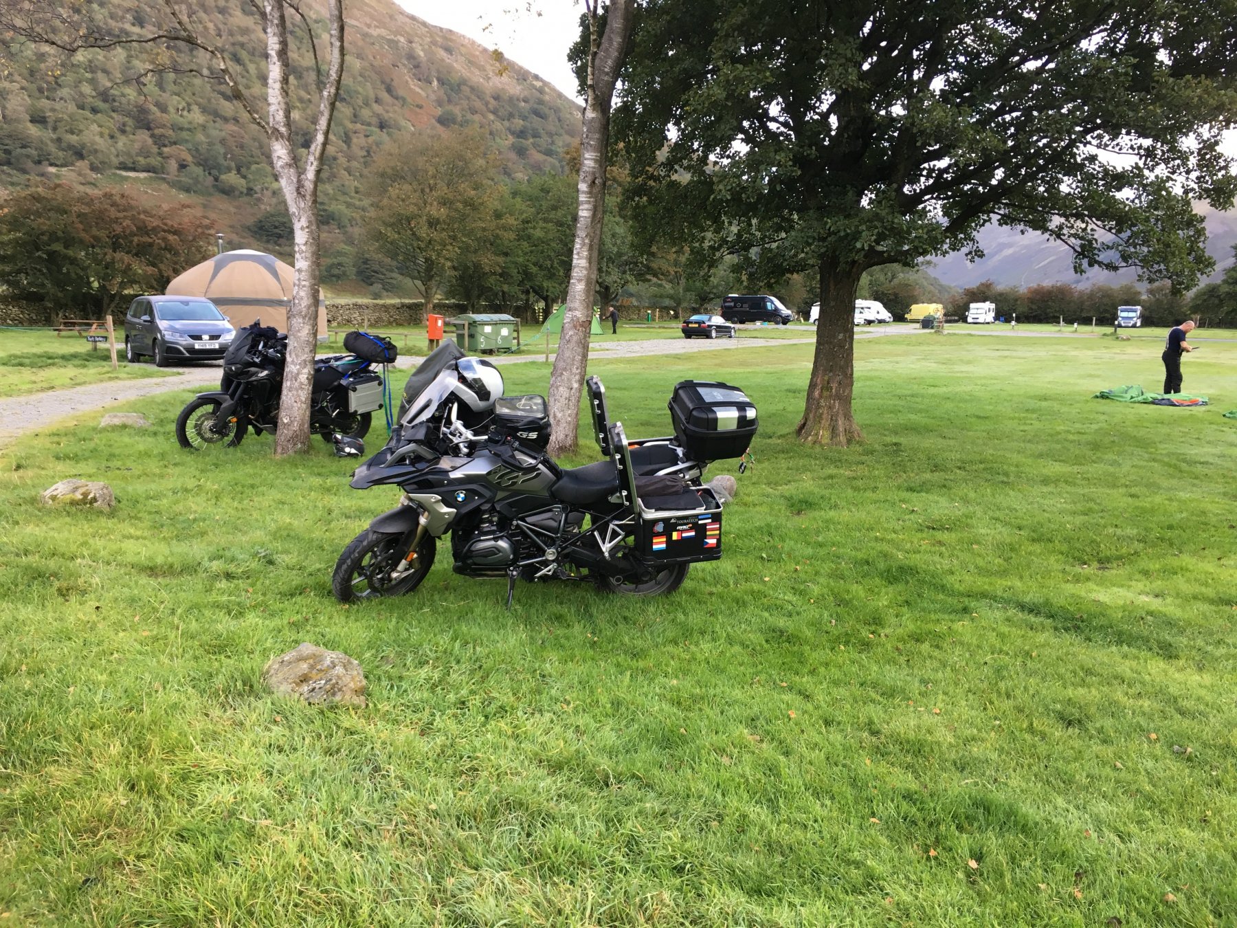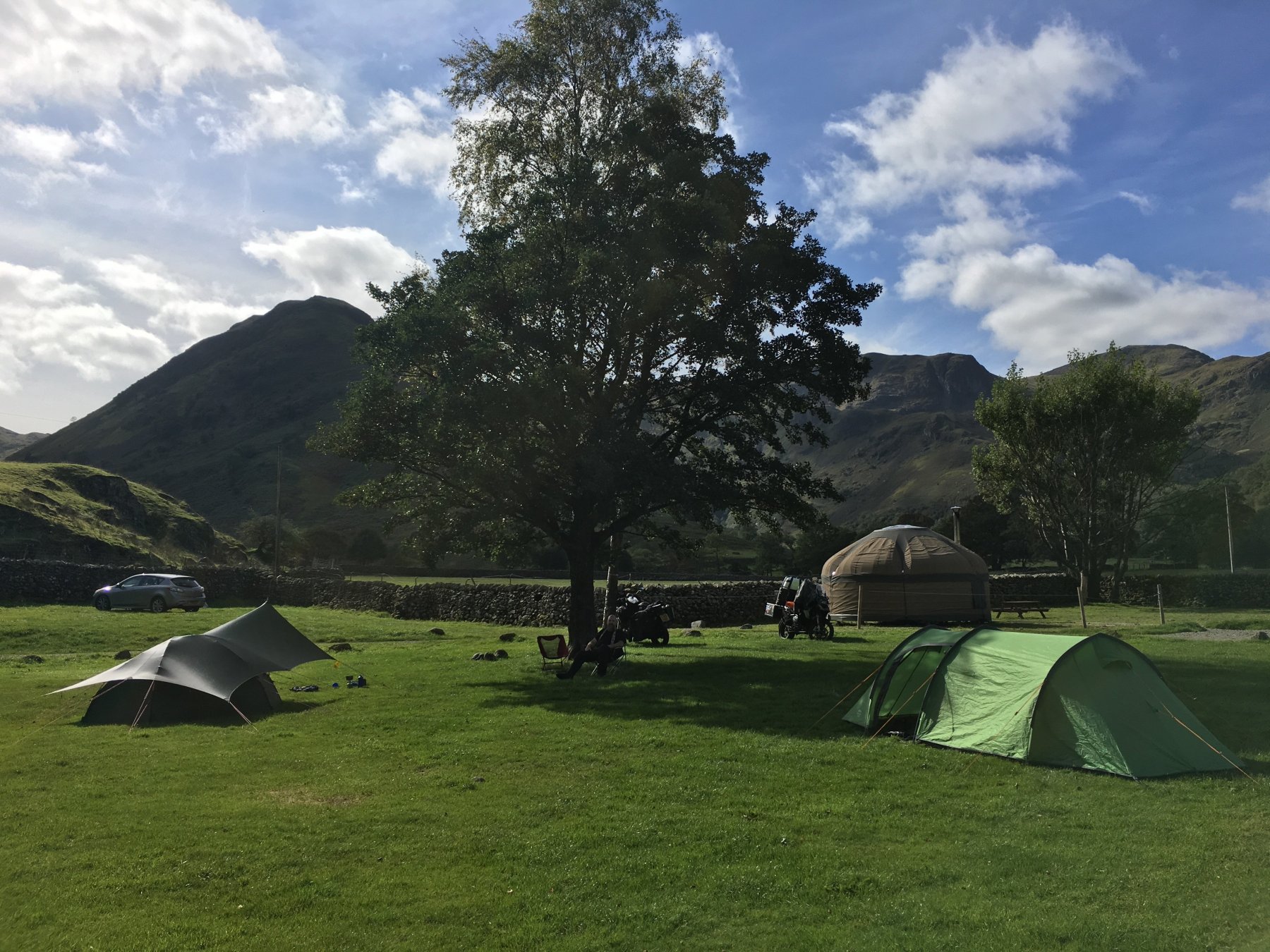 Having left Skye we headed south down towards Fort William, then Loch Lommond. I seem to have lost a few photos! This was the Drover's Inn just north of Loch Lommond. Have stayed here a couple of times. They had an extensive range of whiskey. I don't really like the stuff but tried hard to find one that was ok. We stopped overnight at Dumphries. Dreadful ride there as the roads were shut and the diversions were a nightmare. I blame the GPS. Of course we went to the pub. I'm mystified why I didn't have any photos. @Sir Fallsalot The following morning we rode south down the M6 for convenience, and then headed to Patterdale where we found a decent campsite that had a pub restaurant. I was concerned that this thing was a tick, but it seems that it's a shield bug nymph. A couple of yurts that were in use. Pub. We sort of took over this table. The following day I was feeling a bit rough so we had a quick ride to Windermere, busy, and then returned to the pub for lunch. Just too late so we had a couple of beers anyway to help with a siesta. What siesta? Several hours later having had a meal when they started serving food again, we ended up being the last two to stagger out. Excellent day. We were determined to make the most of the following day so Fred led on a route that took in most of the high passes. Really excellent, and I would happily ride there again. Not Scotland. Back to the pub, as you do. Packing ready for the off home. Roadworks, accidents, diversions and a long day riding we were home. Great week or so and great company. Thanks @Sir Fallsalot. My liver however said otherwise.