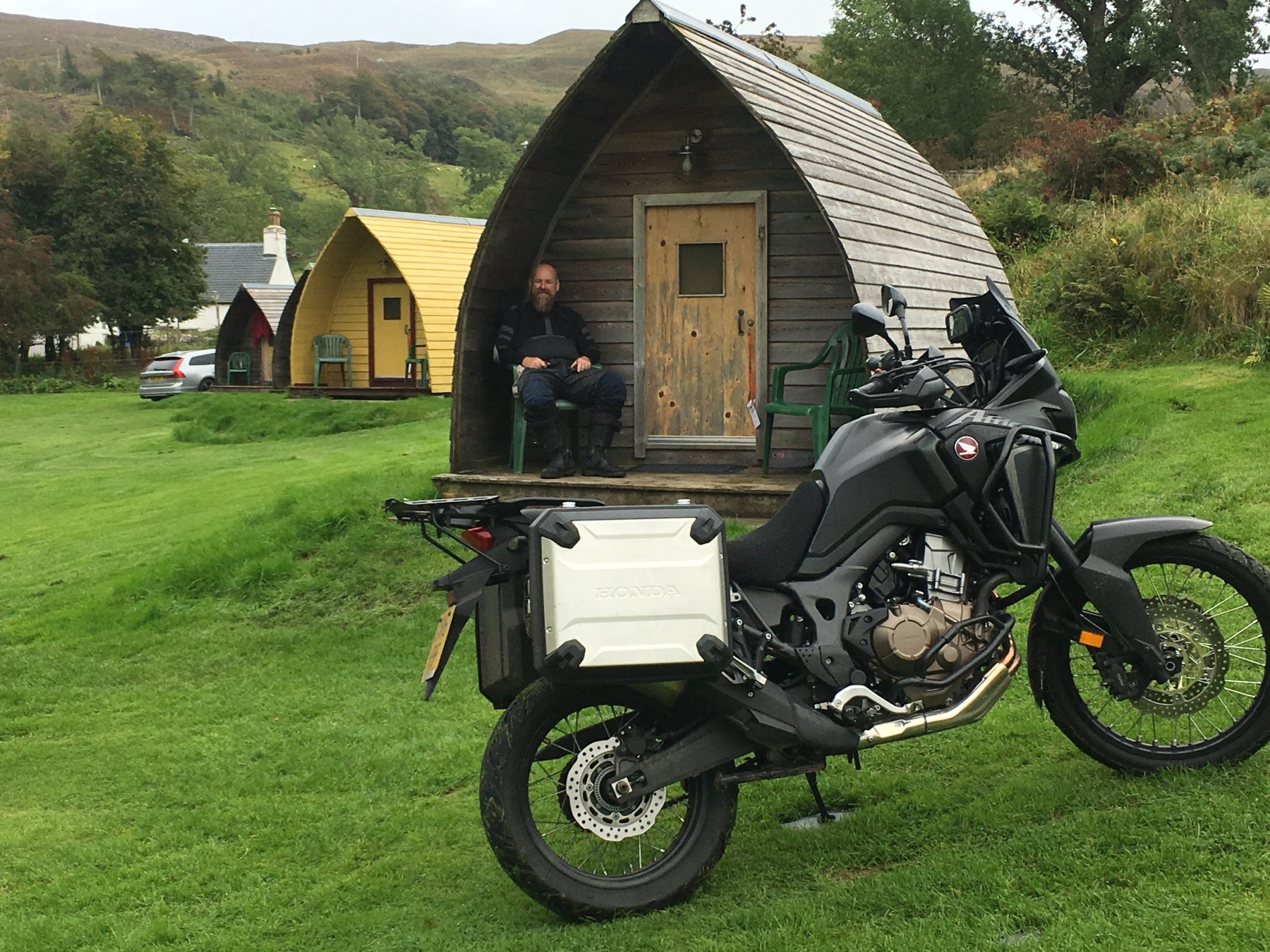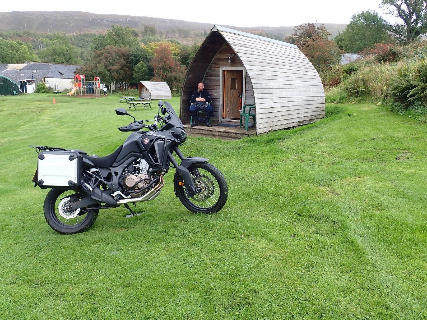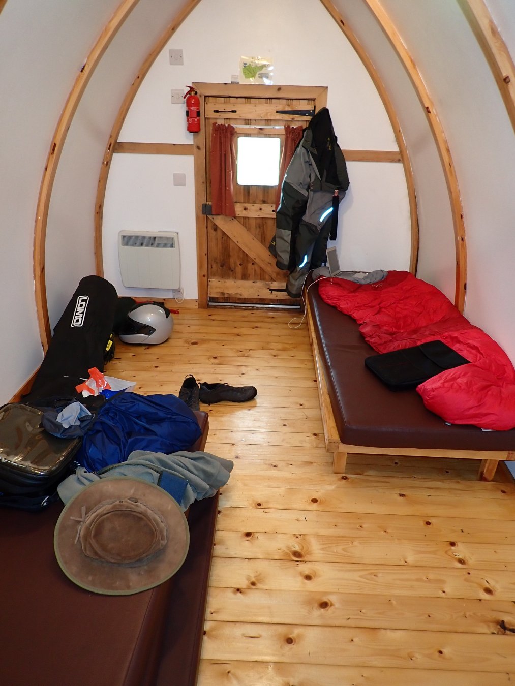 Leaving Ullapool in the wind and rain we headed towards Applecross. The weather was due to be miserable for the next few days with a storm due on the weekend. Not too many photos as it was raining for most of the day. More rain on the way. Arrived at Applecross and found a place with pods. I decided that I'd leave the bike in the car park. Fred was braver. Very wet field. Mine's the piss yellow hut. Better than a tent when it's pissing down. I had to share, with some residents. Fred has mice in his. And then we went to the pub.