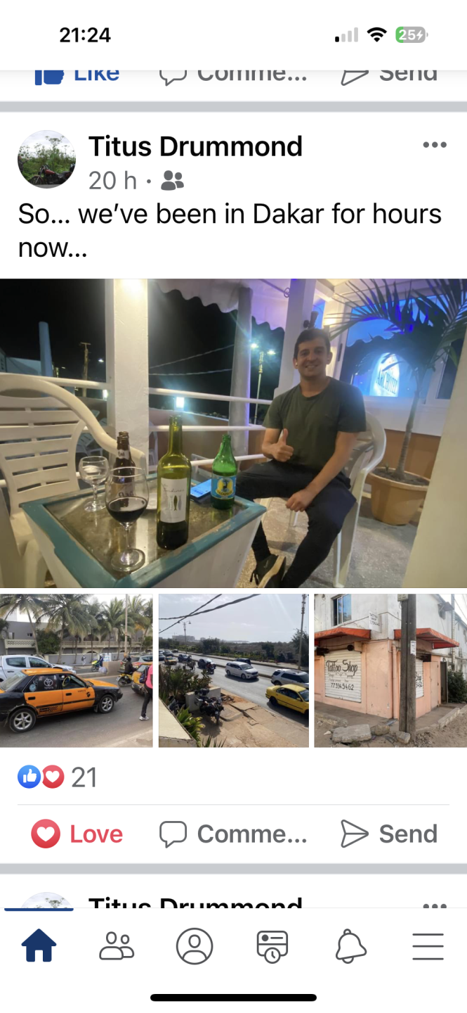 8. My mate Titus and I had decided that as we weren't able to do a circumnavigation due to the odd conflict here and there that a trip to Dakar would have to do as a poor substitute. Beer was involved in arriving at this decision. On the morning of 16th March, in drizzle and 11degC, I set off for Plymouth where I was to meet Titus and his son Omar, who'd decided to come along for some father son bonding, and sharing his father's love of travel. Loaded up ready to leave. Sainsbury's Plymouth for breakfast, meet-up and fuel. Then on to Millbay for the ferry. It took an eternity to get through checkin as Omar, late to the party, had booked as a foot passenger, whilst Titus and I plus bikes were on another booking. Computer couldn't cope and there must have been about fifty people involved in sorting it out. Then it was the same again at the customs check. Nightmare. Then I got mugged in the bar. Just leaving Millbay.The bogs where I used to sleep when I missed the liberty boat back to the ship has long gone. I think it was about £6 for a Murphy's. I'd booked a cabin for the night as I knew I'd be knackered but the other two decided to sleep on the deck somewhere. Apparently not very well as they were knackered in the morning. Waiting to escape at Santander. Loads of bikes on there. Then it was on the bikes heading south for Palencia. A bit further than we'd liked to have done, but it was cheap. At one point Titus veered to the left then caught it and carried on pulling over for a coffee break - he'd fallen asleep. Bloody scary. Nice enough through the mountains but not what I'd have liked to have done. Needs must I suppose. Parked up for the night. We wandered off up the road to try and find beer and food and ended up in a small tapas bar. They weren't hungry having devoured about six chickens between them that they'd got in Sainsbury's.