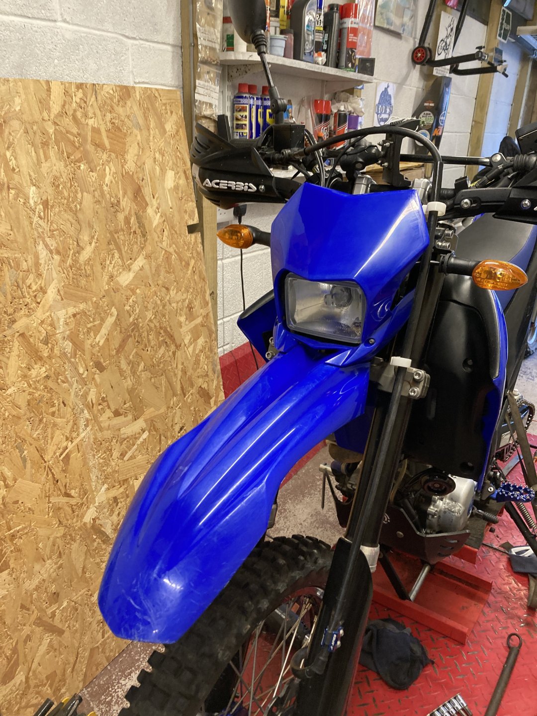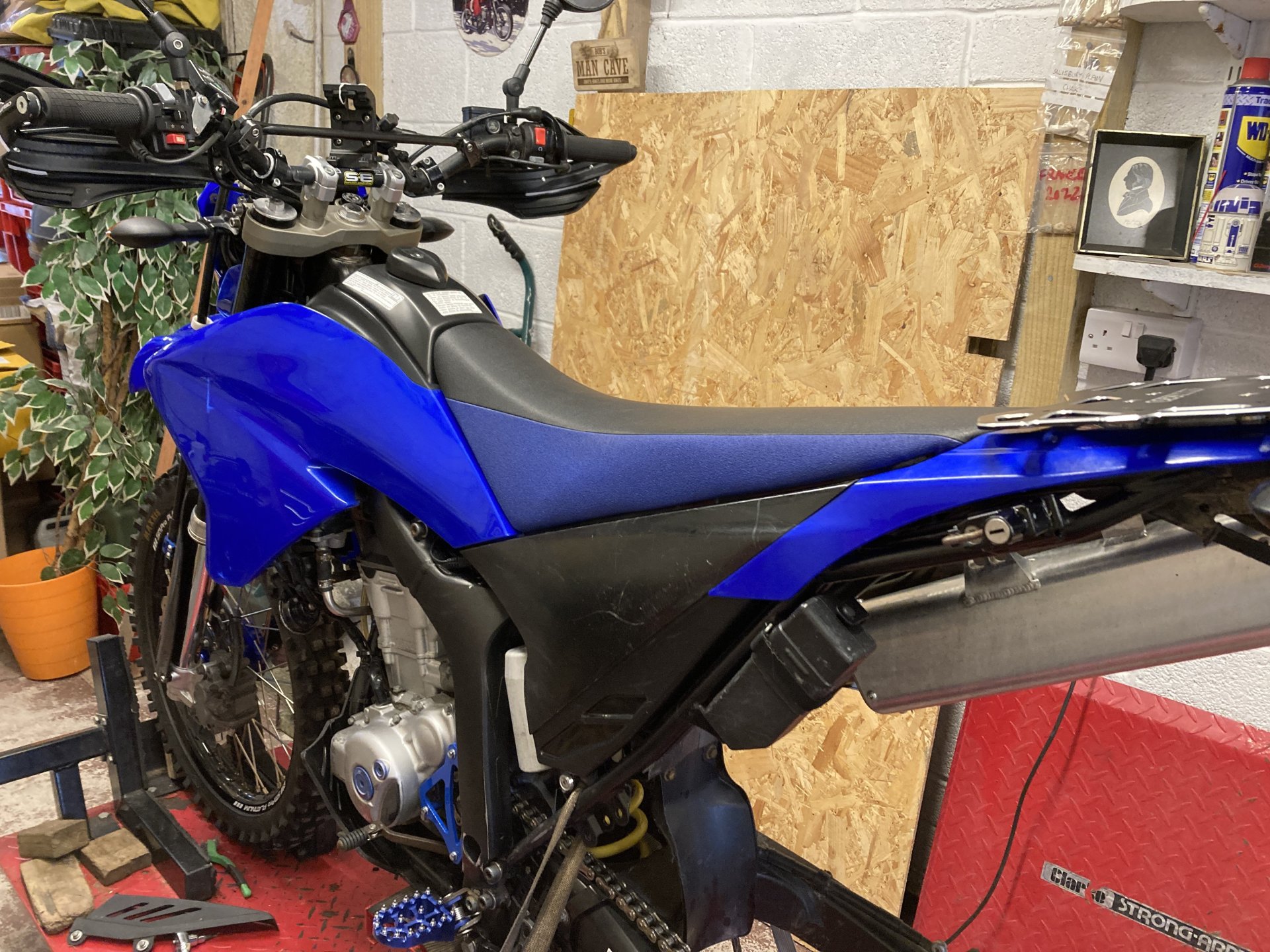 I had a day in the garage today . Got the bike washed early then up on the bench to swap the rear brake pads out. Fail , as I realised I had two new sets of fronts but no new rear pads ... So onto job two........... remove the decals from the WR250 as they are a bit tired , it was long and laborious job plus I'll need to get some acetone to clean the panels completely but they don't look too bad underneath. I ned to also watch some vids before fitting the new graffix .