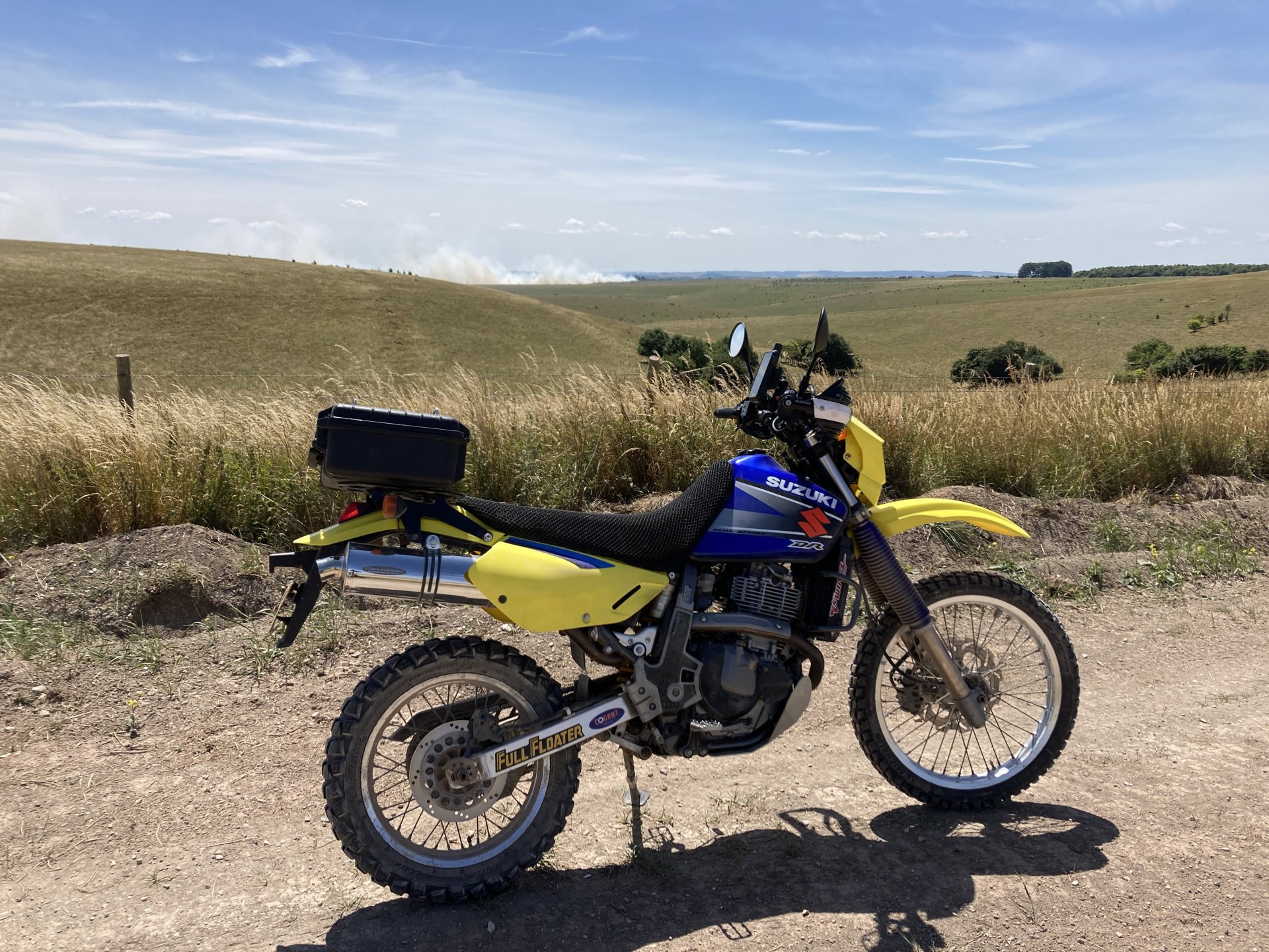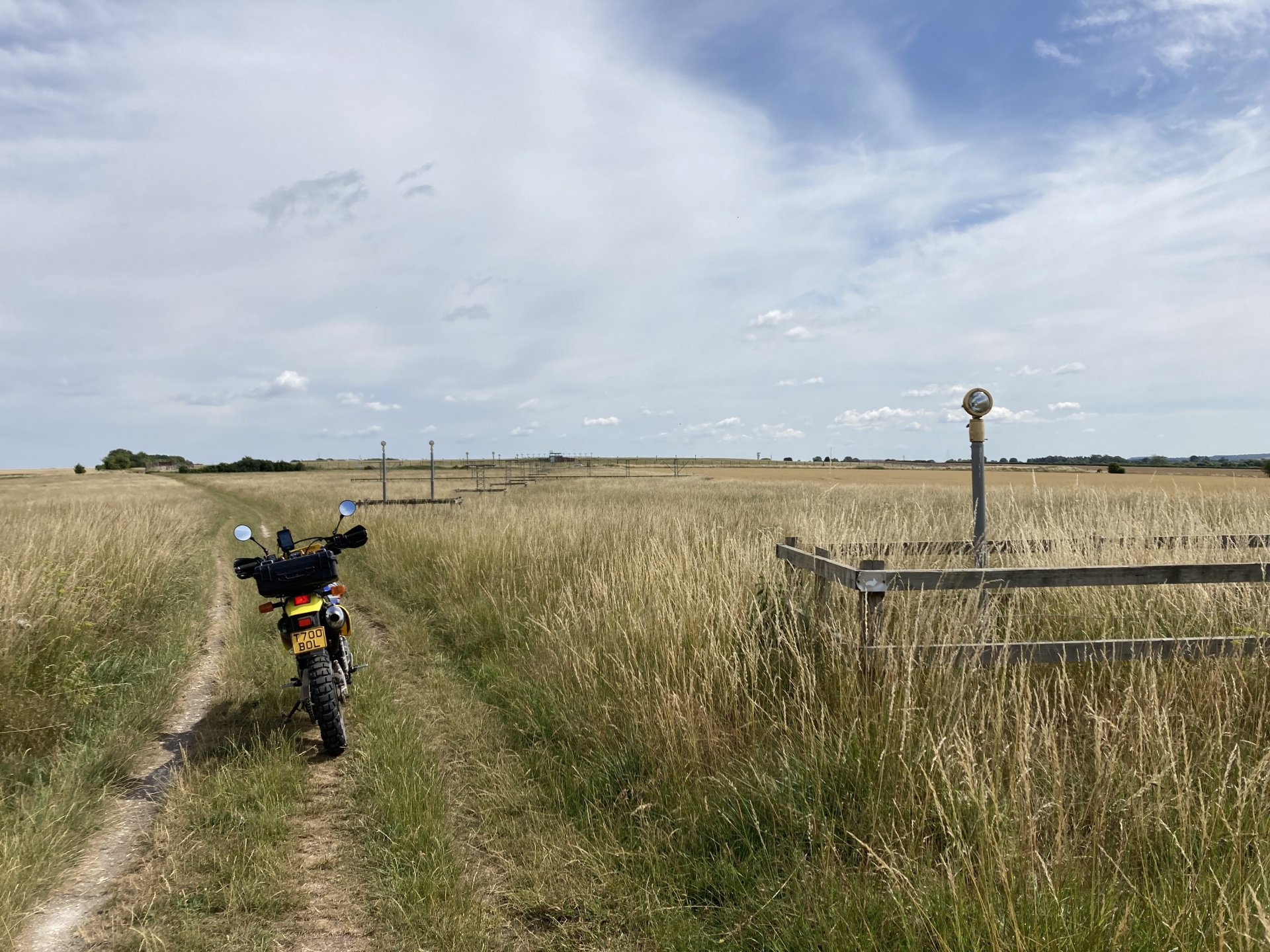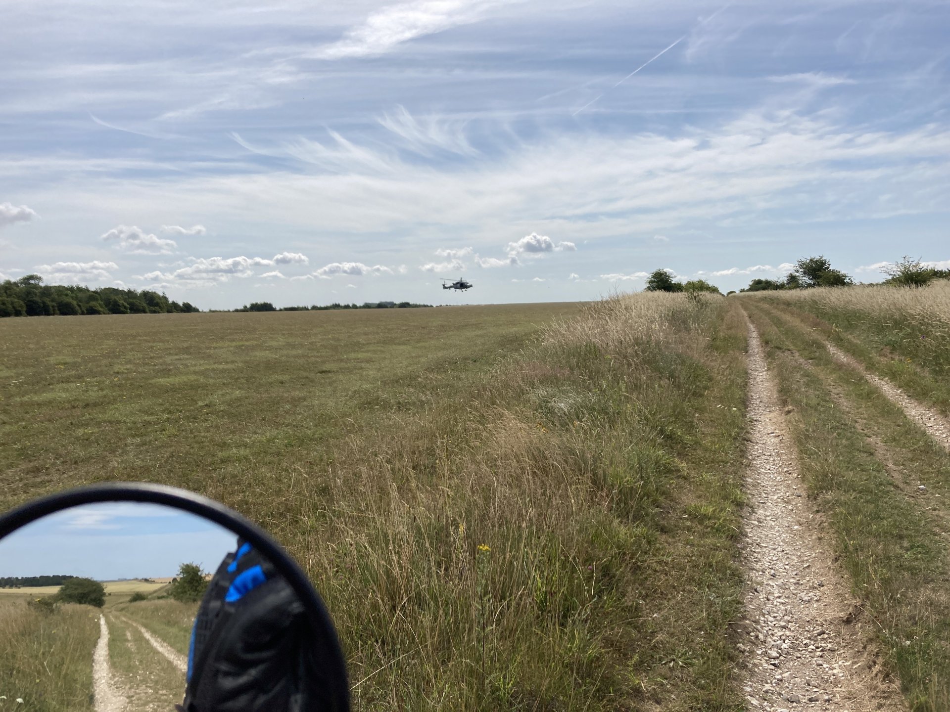 18. I recently refitted my cogent rear shock after checking it over and had also fitted new cogent valves in the front forks so I decided to head for the whoops near Yarnbury castle did give it a check ride. Heading down the byway to Yarnbury I heard that familiar sound of a helicopter buzzing overhead , I stopped to take some photos as it had stopped in a nearby field to practise hovering . He then headed to towards me and we had a mutual thumbs up as he passed by ........... Suspension test was passed and I moved on to the byways around Stonehenge ........... Round barrows behind me on Normanton Down , https://en.wikipedia.org/wiki/Round_barrow I stopped in Tidworth for a bite to eat and then started to head back north to get home........ This is an unusual byway as you are riding through the landing lights for Boscombe Down airfield ................. Near Knapp Down there was a wild fire in the distance ............. I have ridden on Salisbury Plain for over 35 years but yesterday was the driest I have ever seen it, all the usual huge puddles were completely dry and huge dust plumes being kicked up by my bike .