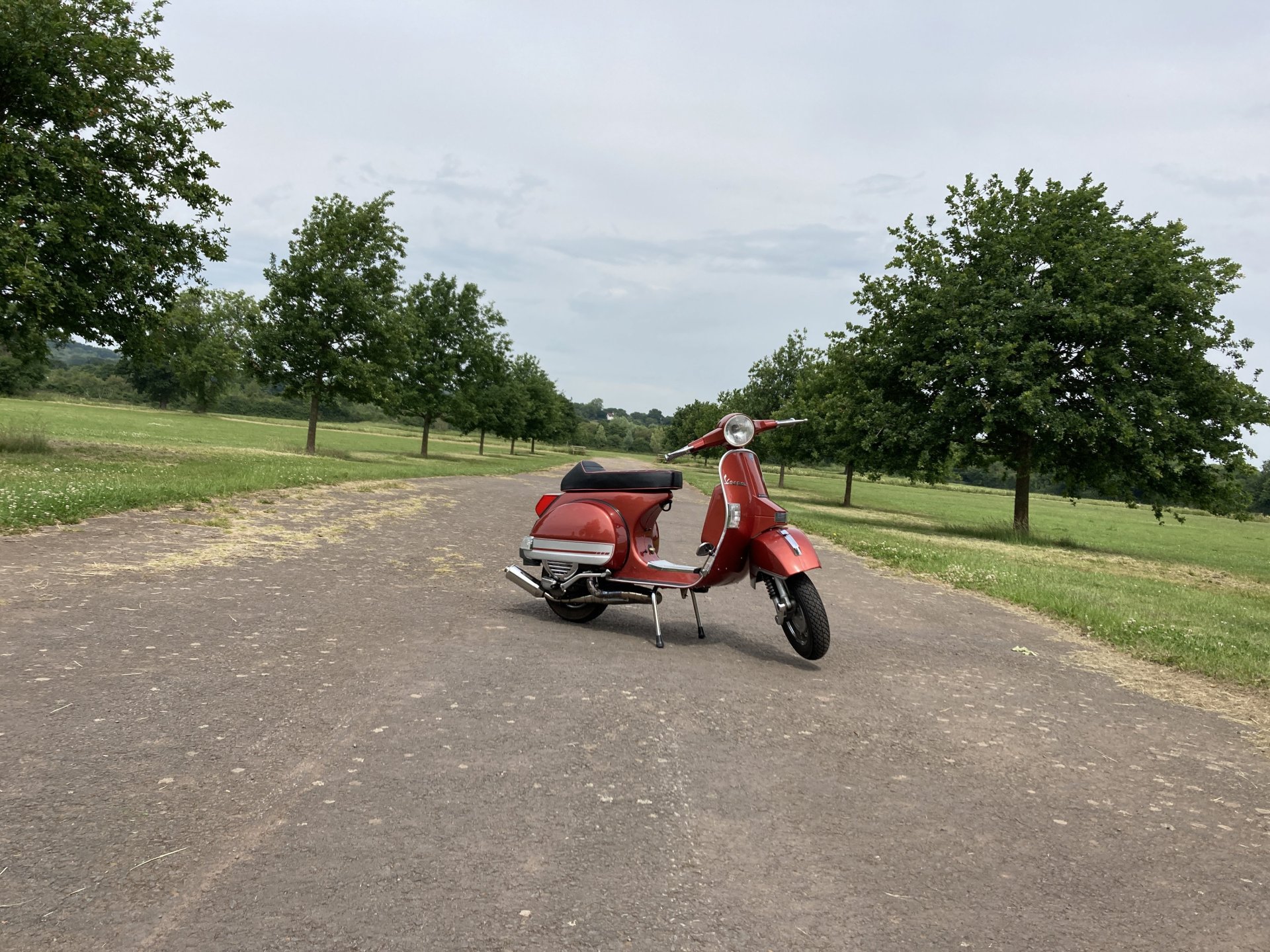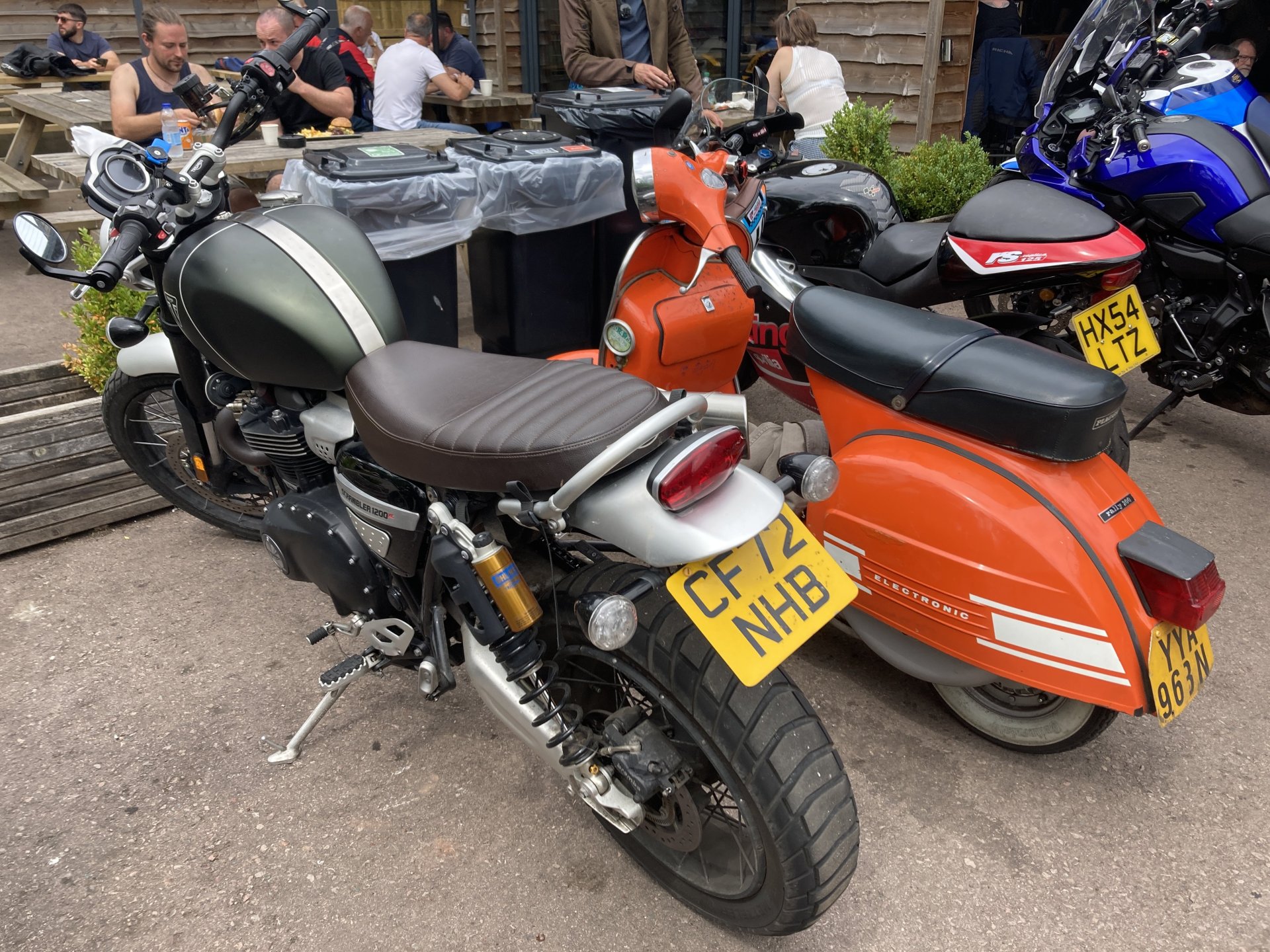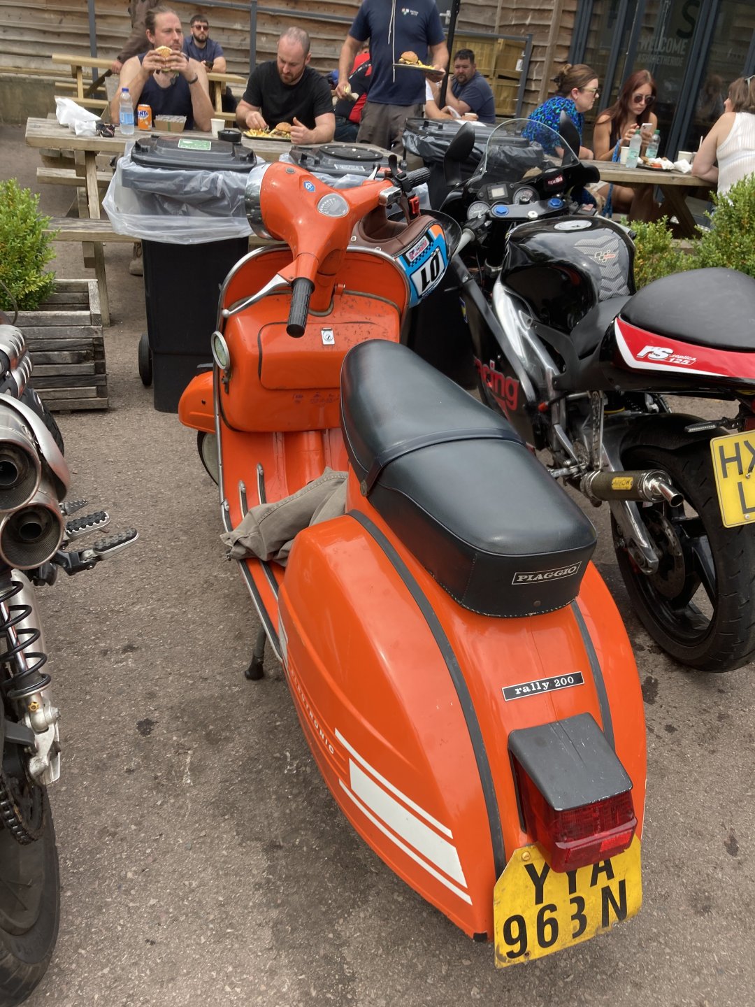 I has a pass out today and had a few trails in mind but it was much too hot for trail riding. I've had my Vespa PX200E for a couple of months now but have only ridden it locally so today was the chance to give it a proper run. I had two destinations in mind but decide on South Wales as that would give it a run on the motorway . I was pleasantly surprised as it kept up a steady 60-65mph until I got off the M48 at Chepstow. Now for some twisties on my favourite road up to Usk , well it ain't no big trailie and you had to pick your lines around the corners but the 10inch wheels did ok. I stopped for a photo here, I imagine this is what the drive up to @Slowlycatchymonkey's pad is like ........... It was time for a break so I headed for the Baffle Haus .......... There were all sorts of bikes there today including some real class.......... No, not that fake Steve McQueen looky likey, I mean the Rally 200 in original clothing ...... Time for a bite to eat ...........