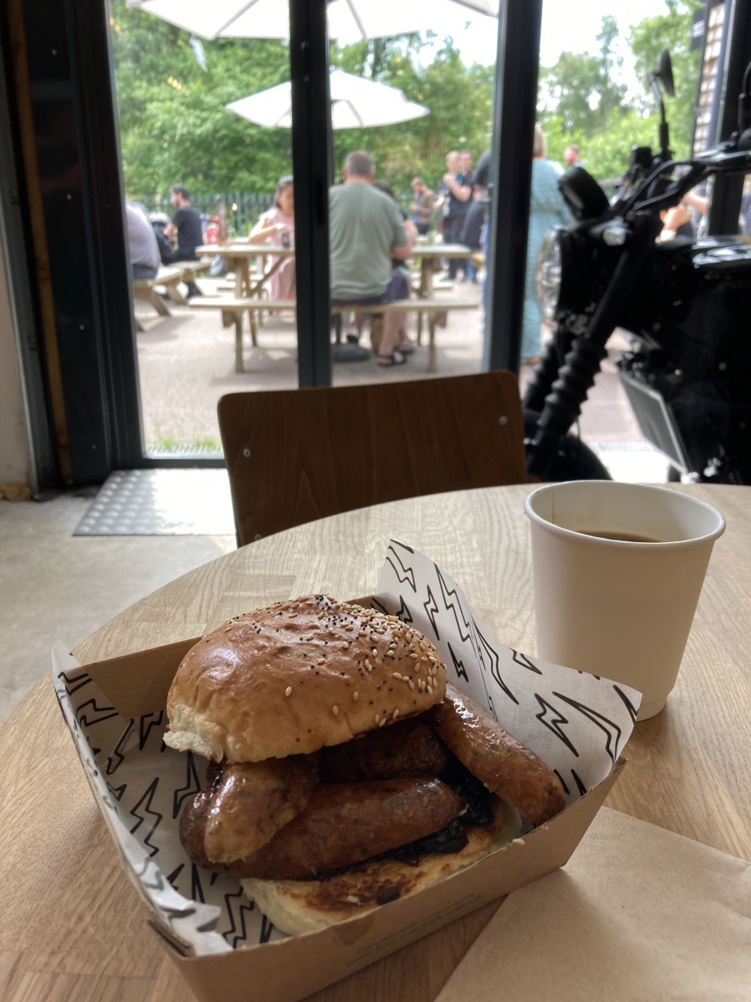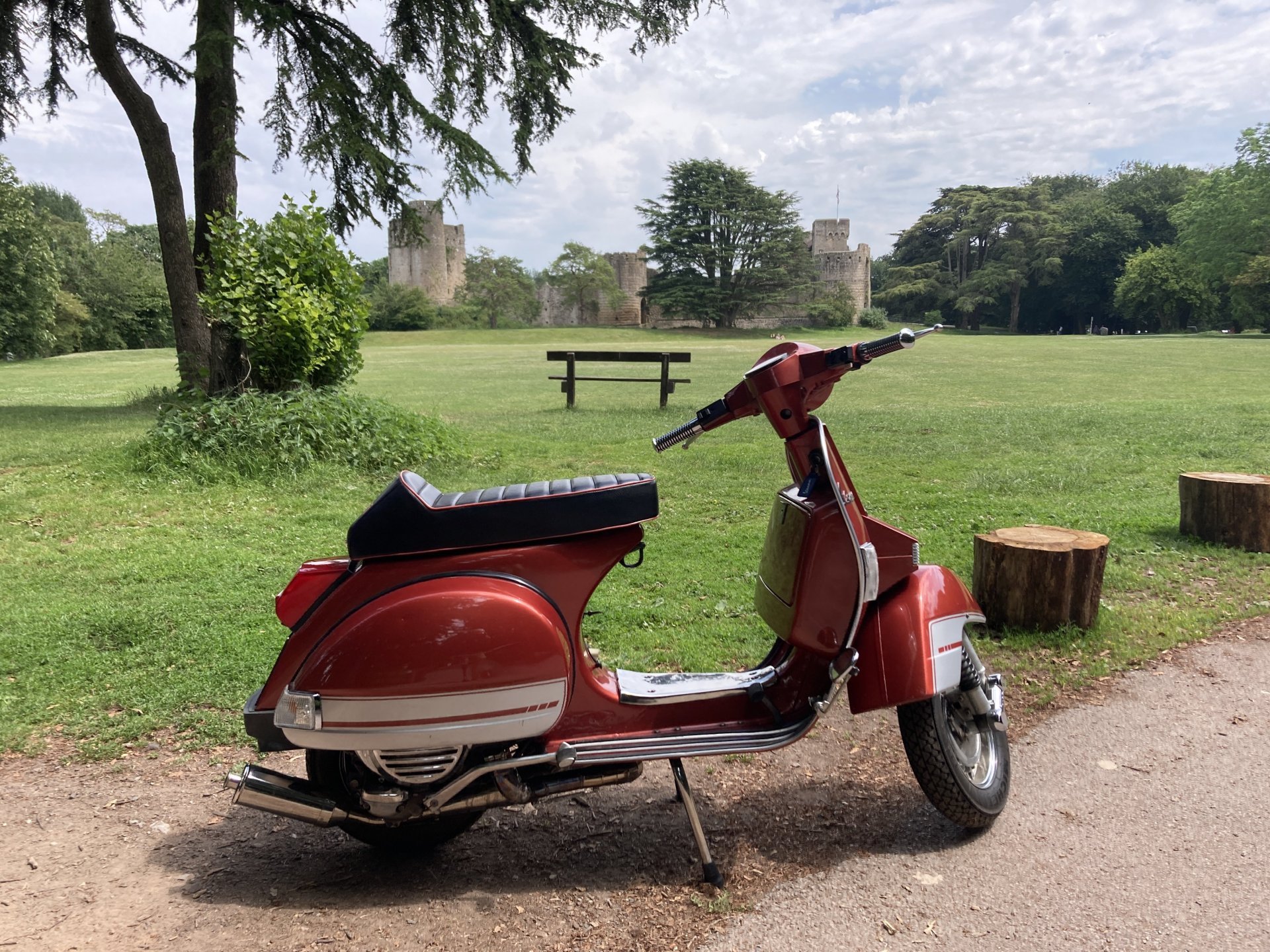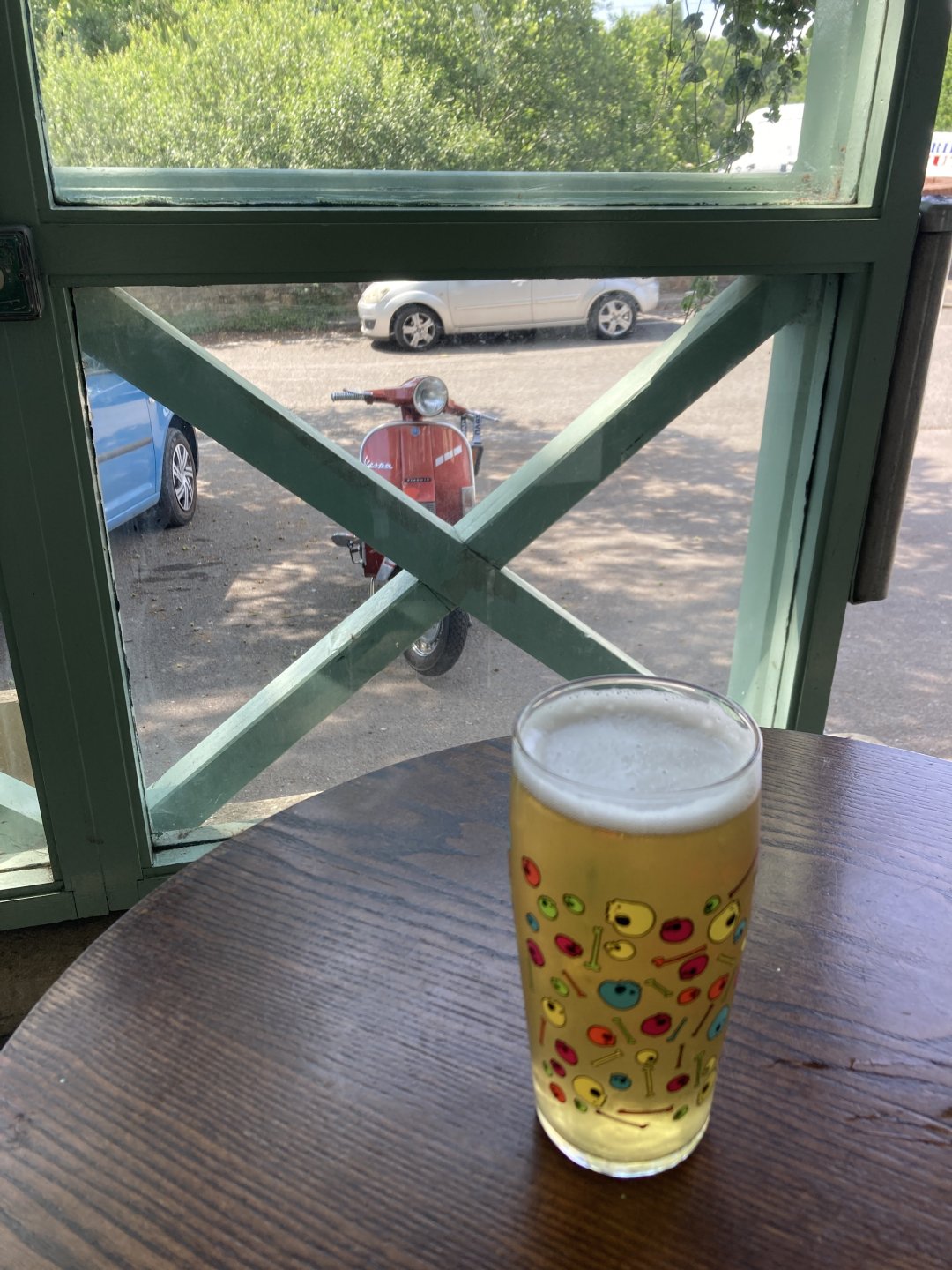 I has a pass out today and had a few trails in mind but it was much too hot for trail riding. I've had my Vespa PX200E for a couple of months now but have only ridden it locally so today was the chance to give it a proper run. I had two destinations in mind but decide on South Wales as that would give it a run on the motorway . I was pleasantly surprised as it kept up a steady 60-65mph until I got off the M48 at Chepstow. Now for some twisties on my favourite road up to Usk , well it ain't no big trailie and you had to pick your lines around the corners but the 10inch wheels did ok. I stopped for a photo here, I imagine this is what the drive up to @Slowlycatchymonkey's pad is like ........... It was time for a break so I headed for the Baffle Haus .......... There were all sorts of bikes there today including some real class.......... No, not that fake Steve McQueen looky likey, I mean the Rally 200 in original clothing ...... Time for a bite to eat ...........