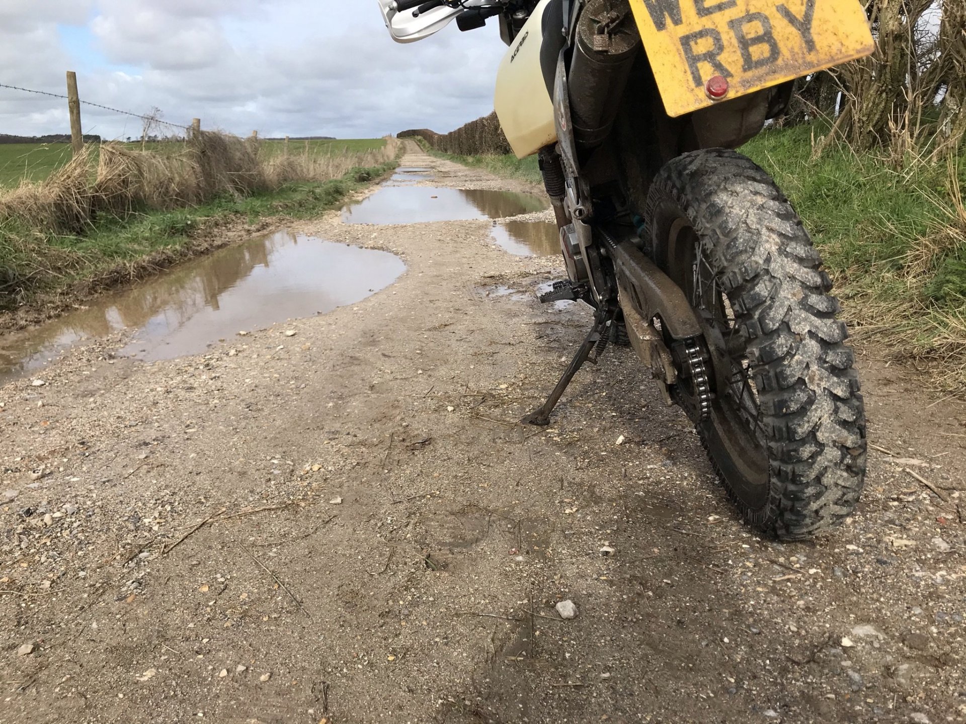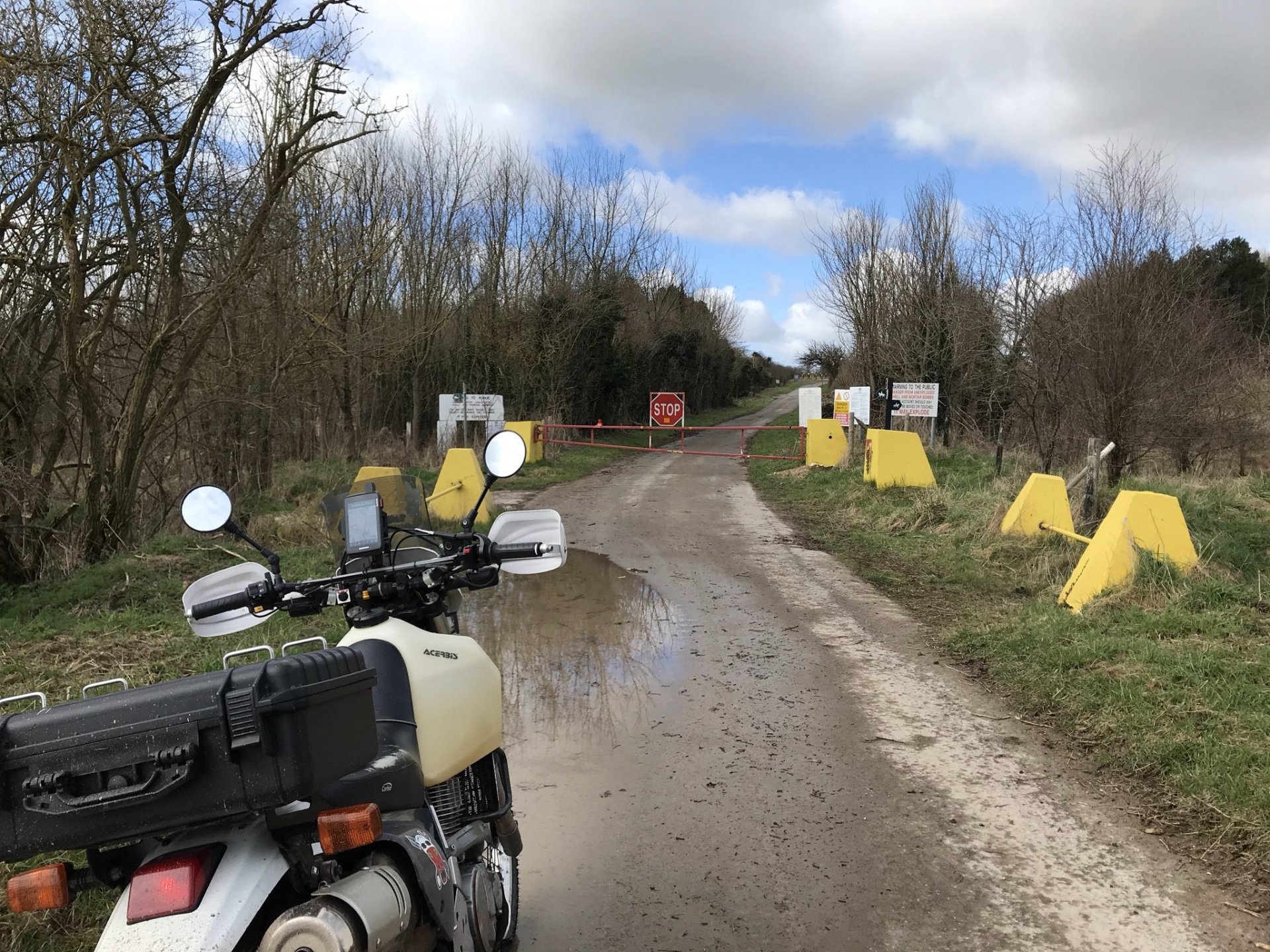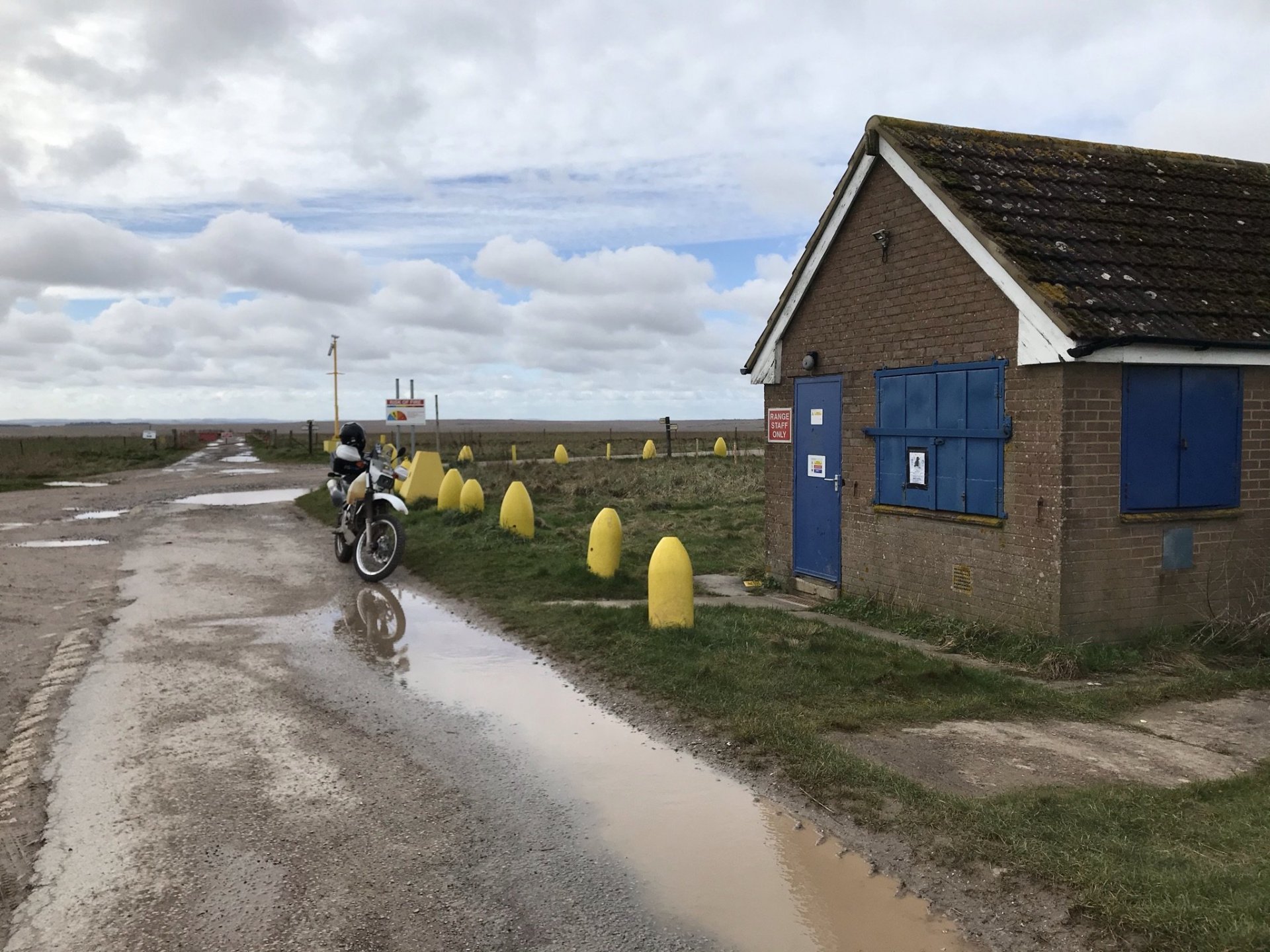 I rode further around the perimeter road and then stopped by the Casterley vedette post to have a coffee from my flask........... and then carried on further keeping a good eye on the red flags so as not to stray anywhere I wasn't allowed to be........... As I got down to the Bustard Inn I saw that I couldn't enter that area but then I spotted a couple of byways on the GPS that I hadn't done before. This one I shall call 'Pete's Lane ' as I know he'd just love to splash his way through those puddles ........... @Pedro check out the road tyres in the shitty conditions .................. and then all too soon it came to an end, I could go no further along here ............... So I turned around and more or less followed my way back where I had come from . I did stop here to check out this building for any DBM's looking for @XTreme but they wern't there and as didn't fancy getting a mortar flying between my ears I left