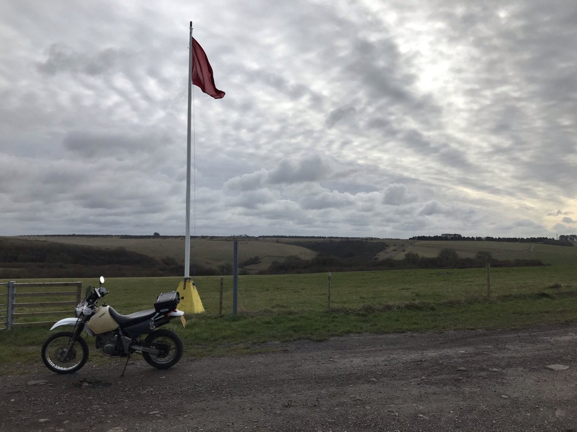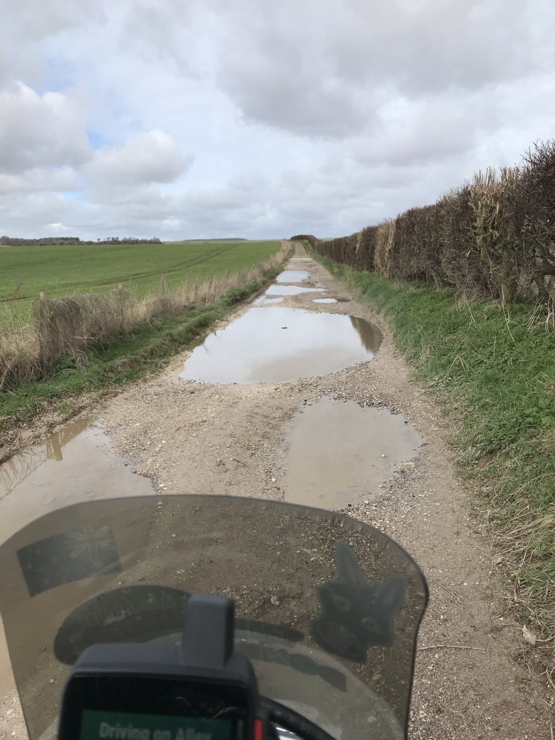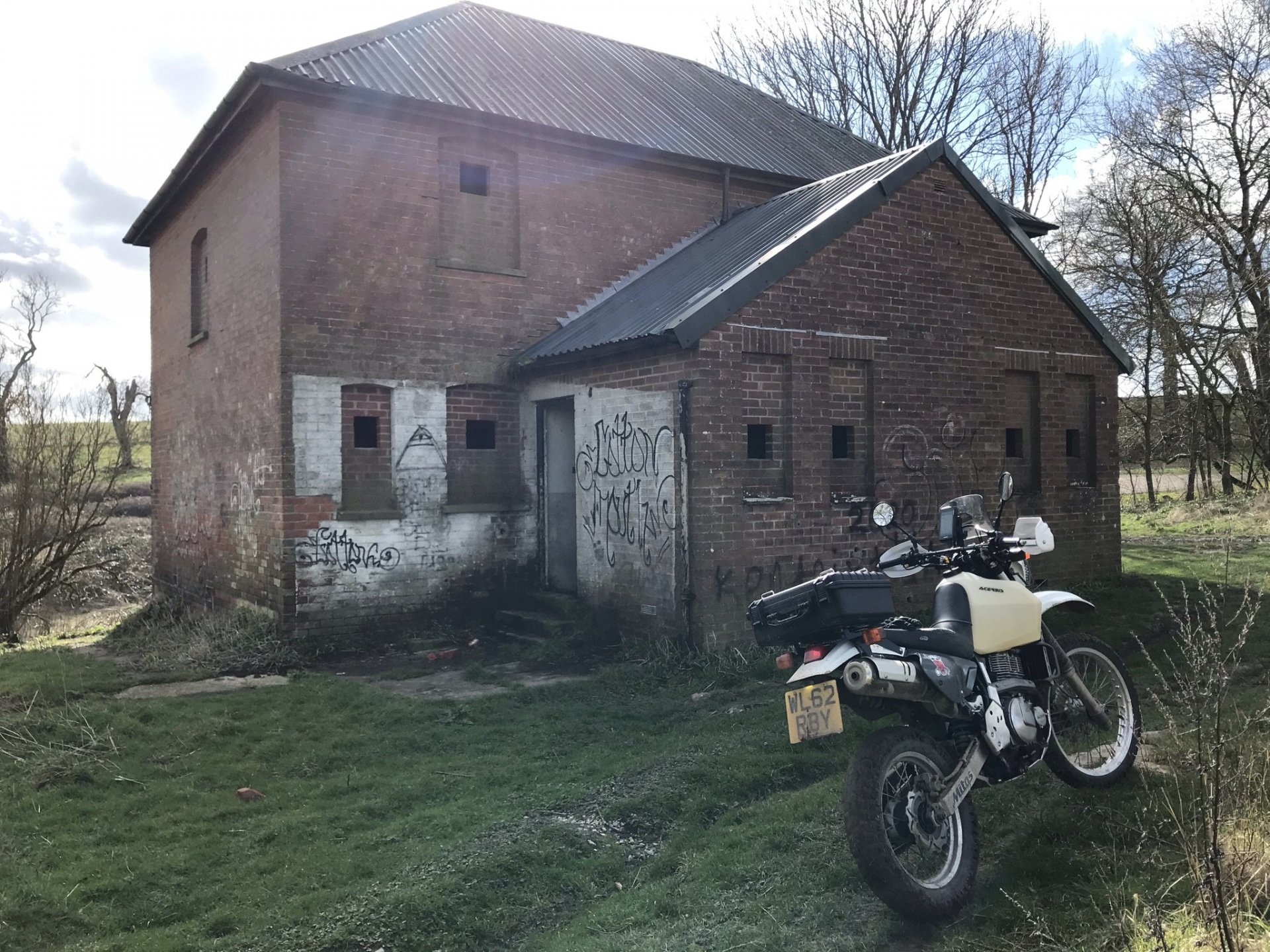 I rode further around the perimeter road and then stopped by the Casterley vedette post to have a coffee from my flask........... and then carried on further keeping a good eye on the red flags so as not to stray anywhere I wasn't allowed to be........... As I got down to the Bustard Inn I saw that I couldn't enter that area but then I spotted a couple of byways on the GPS that I hadn't done before. This one I shall call 'Pete's Lane ' as I know he'd just love to splash his way through those puddles ........... @Pedro check out the road tyres in the shitty conditions .................. and then all too soon it came to an end, I could go no further along here ............... So I turned around and more or less followed my way back where I had come from . I did stop here to check out this building for any DBM's looking for @XTreme but they wern't there and as didn't fancy getting a mortar flying between my ears I left