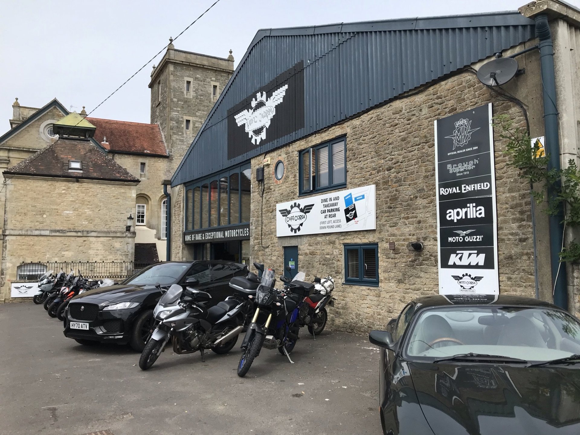 So after Yen put us on to the 'Wild Guide' series I got myself the Devon, Cornwall and South West guide to see what I could find............... So today I set off with a couple of goals in mind. First of all I headed to Gillingham in Doset (not the wanky place with the same name in Kent). I had seen a bike shop when I was passing through previously so I thought I'd call in and take a look. WOW !! what a surprise this place was............... Moto Corsa is housed in an old brewery building and they have done an ace job of converting it into a top motorcycle location. I don't think I could afford a single bike in there , they are obviously aimiming at the well-heeled locals but they have some cracking bikes for sale....... Out the back was a cafe area which was top notch , a lovely courtyard area and a semi-covered area as well as seating inside. I had a Sausage bap (it was Ciabatta ) and an excellent coffee................