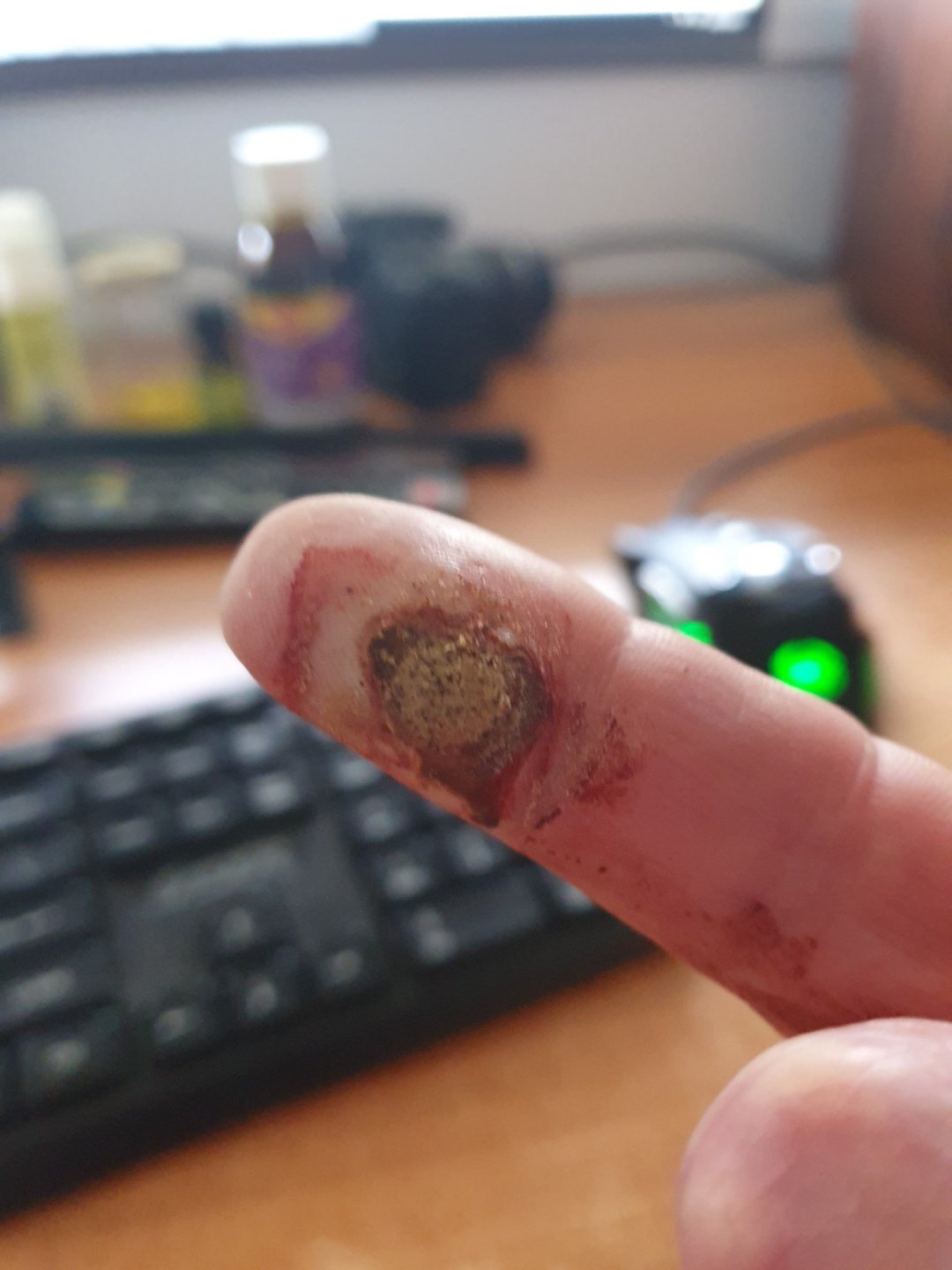 You bet it is, imagine how I feel, that little fucker was ruling my life via pain, now the pain is pretty well gone, ,still a bit tender but the internal pressure has gone, that little hole in the finger was where the bindi thorn was, the blood/body had surrounded it with a protective layer that was tender and I use that term lightly, this little fucker was keeping me awake at night, without Tramadol it would have been hard, luckily I have some, now it's basically fucked off, the salt dried up the weepage that I was experiencing and the skin (that was missing) grew back under the wound, looking at it I'd say four days max for a full recovery sans scars aussi. Funnily enough I use ground white pepper for smaller cuts and scrapes, better than a Band Aidâ„¢ and lasts longer, so now I have salt to go with the pepper; There's more twixt Salt and Pepper than are dreamt of in your philosophies Horatio.