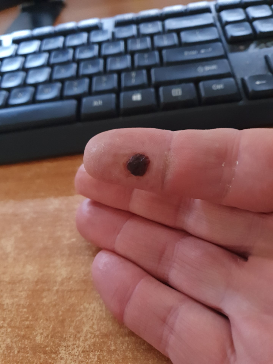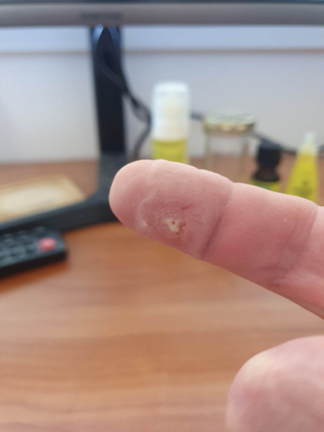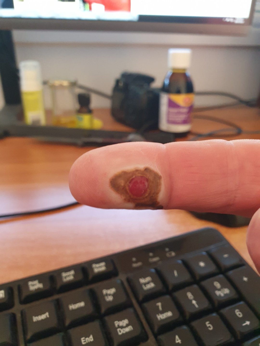 About eight weeks ago I was patting the cat when I came across a bindi in his fur, these are a small thorn with bits that can break off which one of bit promptly did. First my finger was uncomfortable, then it got annoying, then it swelled up and so I got a sharp blade to see if I could dig it out. Didn't work, what I got was a small open wound, to wit, a pyogenic granuloma, went to doc, applied silver nitrate, said come back anytime, a week later I was back, more SN, back again for a double dose. So as I was over silver nitrate he referred me to a surgeon, called about an appointment, said they would call me later on. Entered pyogenic etc into search and found this. I'm a big fan of traditional medicines as well as alternatives to other things such as curing arthritis if anyone is interested, more later maybe. So I embarked on the cure, started with blood filled bandage, it wouldn't stop bleeding, removed bandage and liberally poured ground white pepper on it to try to stem the flow, that's the brownish mess, cleaned it up with a dunk in hydrogen peroxide and applied the salt, this is it after two days, last night I had to not only take an Advil (ibuprofen) but got up a bit later for a Tramadol, however that seems to have passed, still tender as but well on the way to a full cure, they say two weeks. Photos are out of order, you'll figure it out.