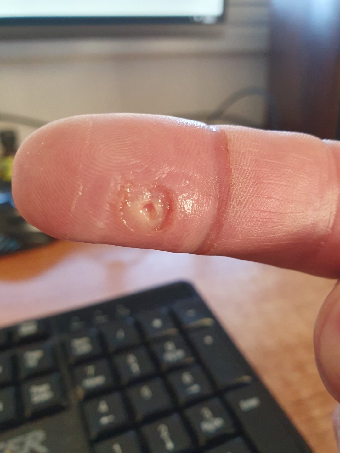 Well here we are on day three and what a remarkable result, last night was two ibuprofen and when they did SFA I had another Tramadol. Woke up with it still sore and removed the bandage, this is great, it sure beats a 200k round trip and stitches. I think that's the hole where the bindi bit was.