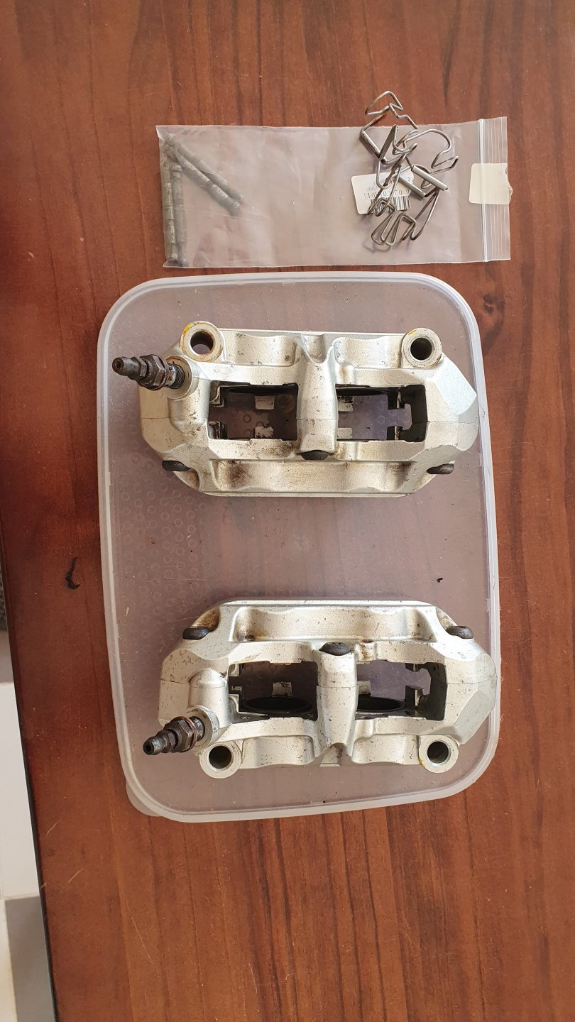 Pads are in and calipers loosely mounted, they look so good the lowers look like need a coat of paint as well. Front wheel out and masking time. Radiator to do next, nearly there.