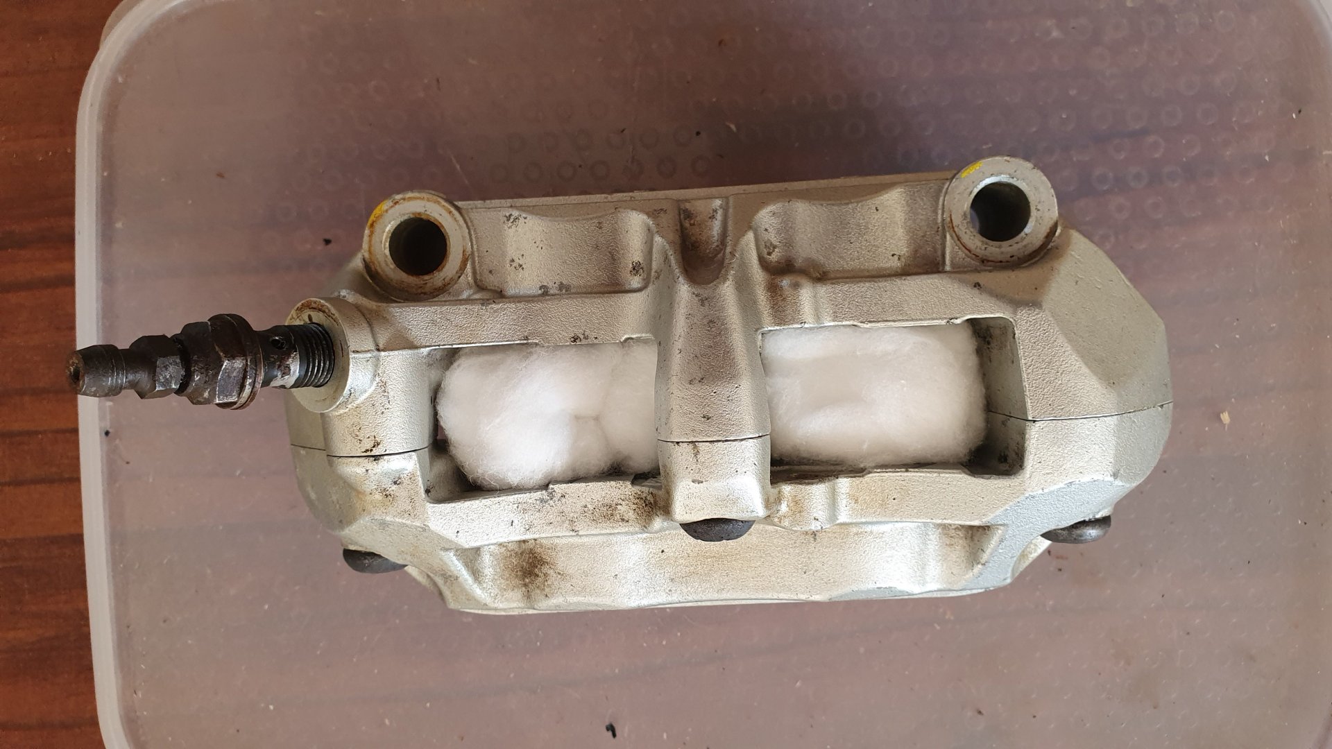 First cook your calipers then hang them on the line and spray them with VHT cast aluminium paint, they're out there in the sun baking away so I will soon be fitting the pads and bolting them back in place. Need to get some 14x10x1 crush washers to attach the brake lines, robbing basterds at KTM want about $5 each plus postage, need six if I am to do the rear brake as well, found them online at six for $7.90 inc postage, thats saved me a decent bottle of red and a steak, it pays to shop around. Hallelujah Brothers.