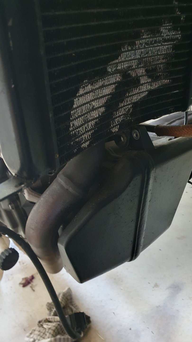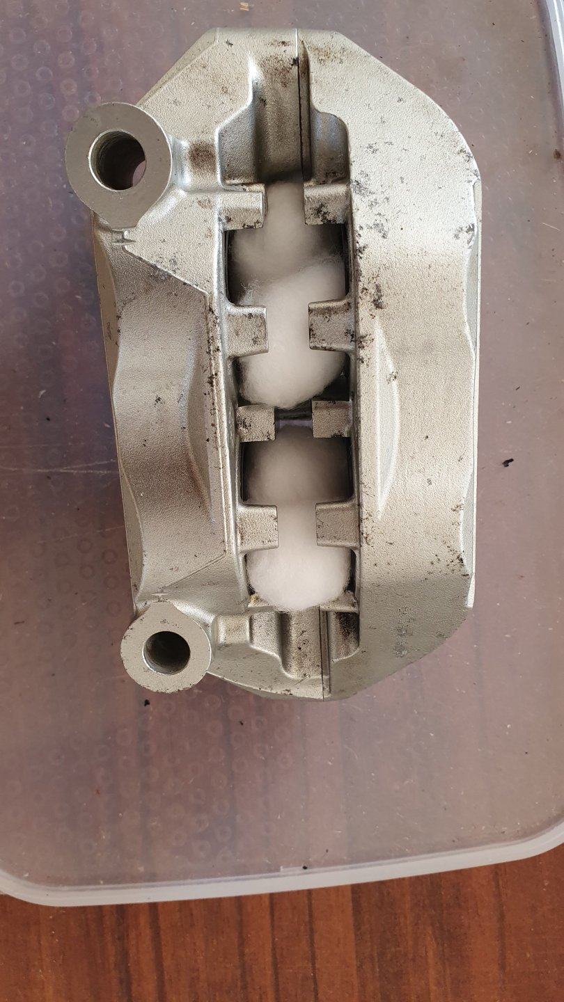 Calipers are done, forgot to take photos but its a pair of calipers, the pistons cleaned up nicely and slid in like a Welsh shepherd getting into a well oiled gumboot. Next episode will be when the VHT cast aluminium paint arrives and once painted I can fit the pads and bolt them onto the bike, then a quick bleed and the major hurdle is out of the way. Started to remove the radiator, the fins are a bit flattened in one area so I thought I'd lay it flat and smooth them out with a skewer but I'm not so keen to remove bits if I can avoid it. I have unbolted it to move it forward to get at the front sparking plug so I might do the plugs first, they have a connector on them I've never seen before and I wonder what is the best way to take it off. Don't want to damage it as it would probably take a year to get a replacement. So here you go, calipers, one ready for paint, spark plug cap and damage to the radiator, as it doesn't leak I thought of giving it a quick spray.