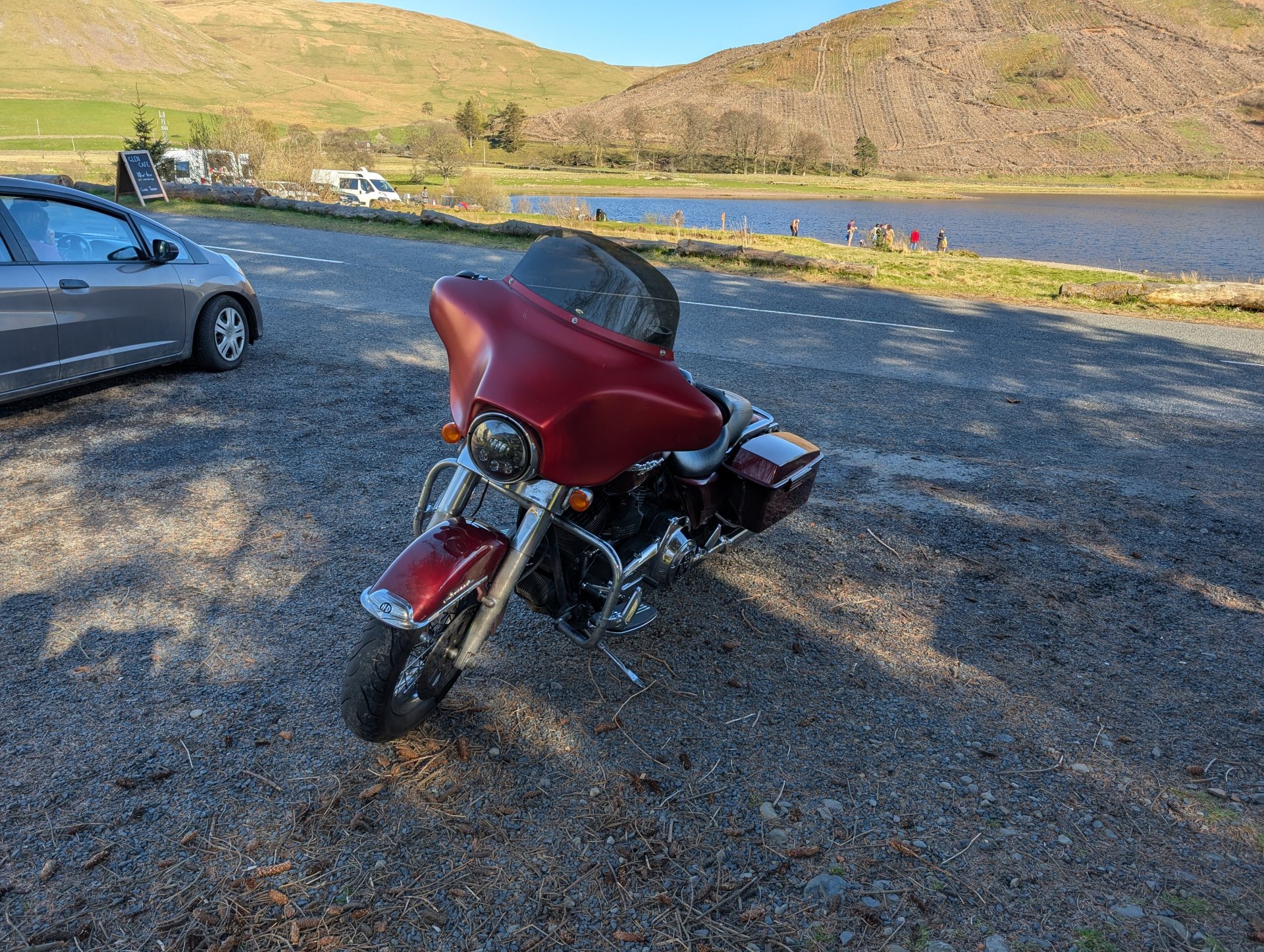 So on Sunday afternoon I decided to take a run out as the temperature was up to a near Caribbean level of 12c. I headed south into the Scottish Borders to the popular spot of Moffat but other than a sprinkling of power rangers and a few born agains it was quiet. My new exhausts were attracting a lot of admiring looks from the ladies. From there I headed to St Mary's Loch for a bit of cottaging. I was alone in the toilets though so I just took a piss instead. Again there weren't a lot of bikes, I did speak to a Polish couple who were on a Harley Electra Glide and I had a cigar break. Then I headed back using a single track road I wanted to explore. This took me past Megget Reservoir.