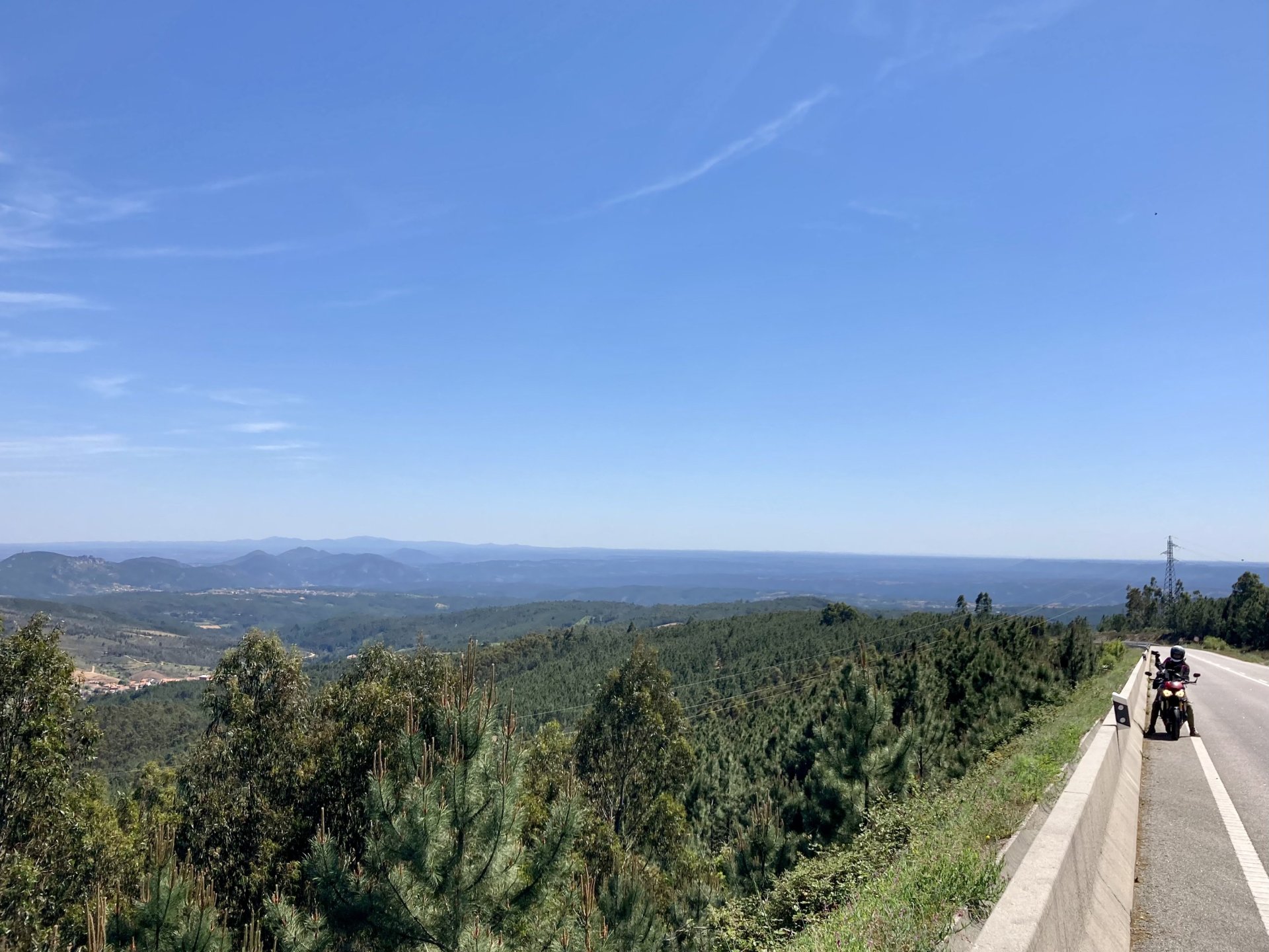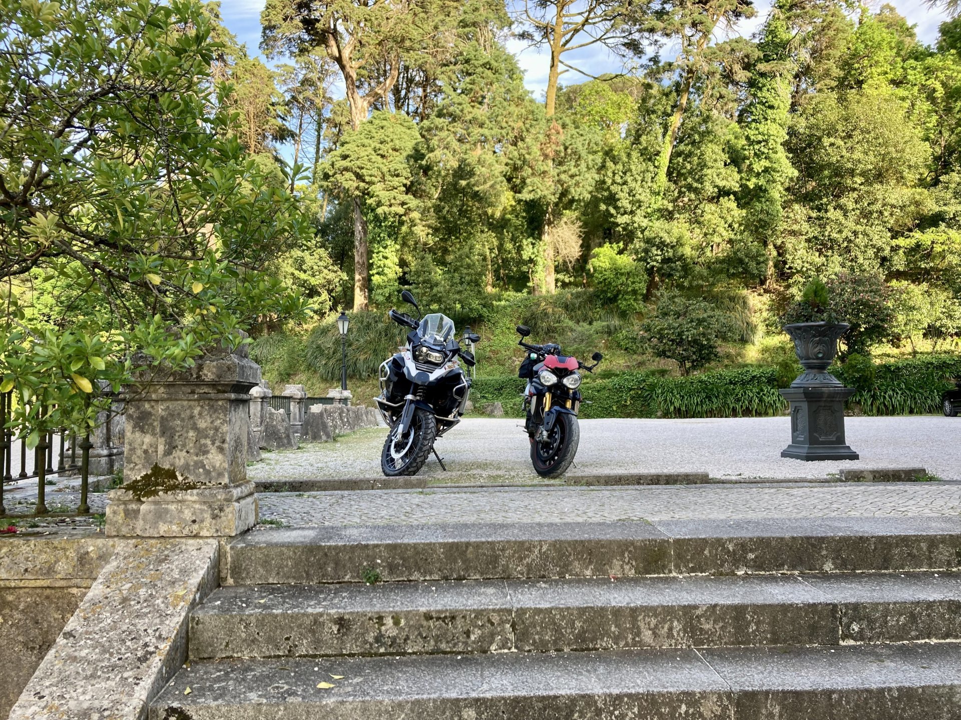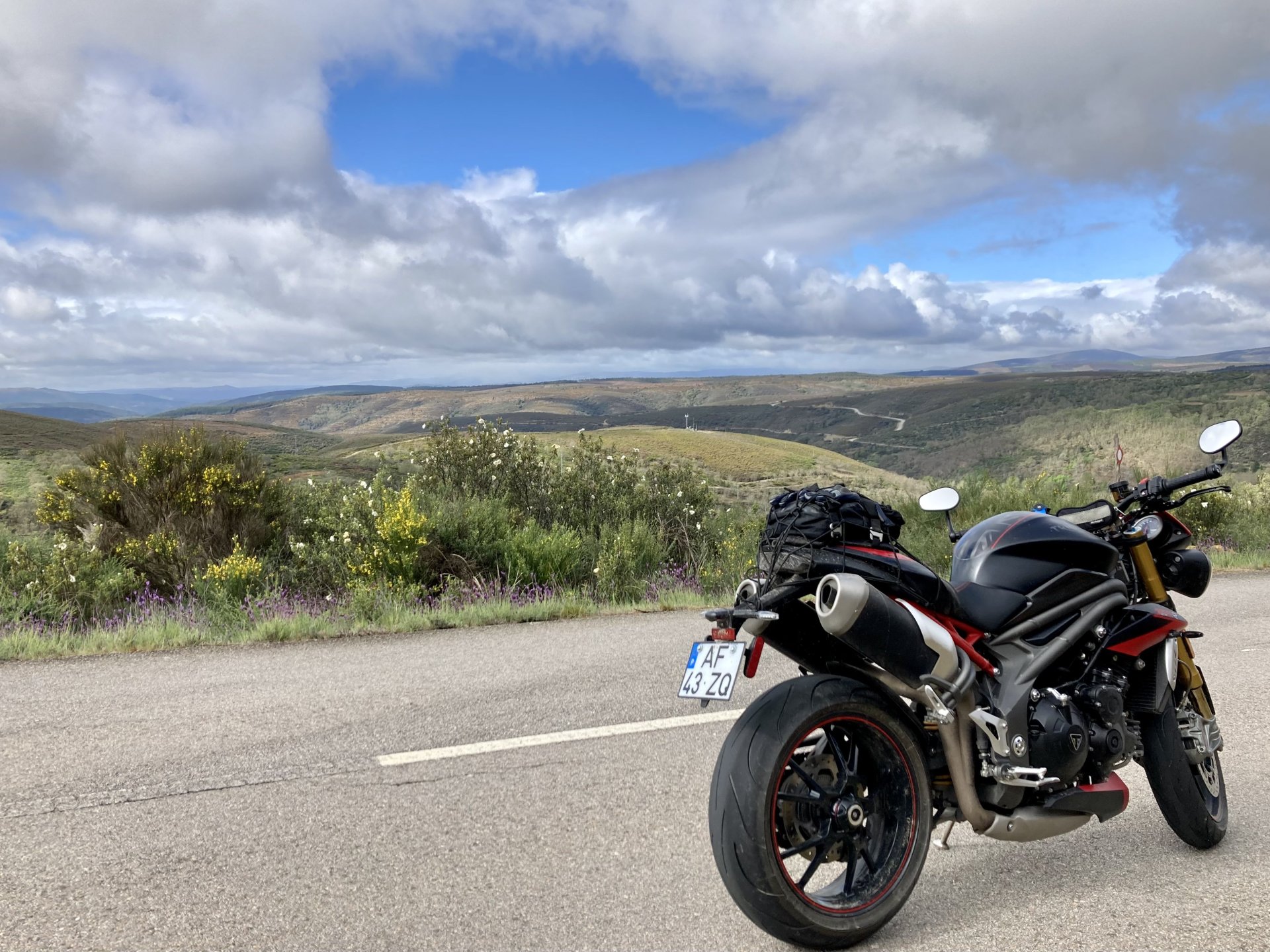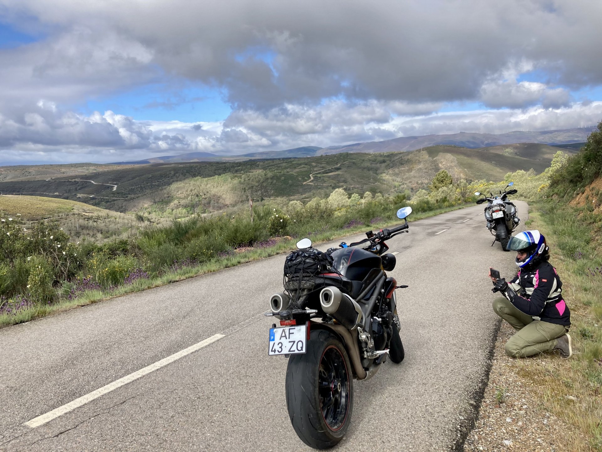 After my previous solo ride to Tras os Montes, Sofia had a few days to get away from being a vet and felt like going and checking the place out too, so that's what we did. Tras os Montes is sadly ignored by most tourists and even most portuguese tourists don't know the place. On one side this is bad, on the other it's very cool because it's a land of harsh climates, harsh landscape (that I've been told sometimes looks like Scotland), and authentic people and places, a lot of this is usually lost with bigger volume tourism. The aim was to go north, spend a couple of days at my parent's to keep my dog company, and then head north and inland in search of amazing old landscapes and good rustic meals. Tras os Montes reminds me of a time of kings, with it's abundant sweet chestnut trees, old castles, and stone walls that endure time. First, starting from the south / center of Portugal: I set of from my home near Lisbon on a monday morning, the sun was out and the day was to be sunny and plenty warm. I was early getting out, had already cleaned my place the day before so after taking out the trash the blinds were shut and the place left until my next stay. When I see that house closed I better leave quick or my emotional side takes over and I end up staying a few days more. I take only small roads, after a while I stop by a dam for breakfast at a cafe and a few work calls to get a few issues done for the day: Quickly made a friend, that abandoned her owner and came to check out my last bit of toast: Arrived at Constancia, quaint small town by the Tejo river with the claim of fame that very important historic poet Luis de Camões once lived here for a while. I stopped, had an espresso, and proceeded to wait for @Sofia, at the time setting off from Ericeira via motorways to catch up, she made it in illegally quick fashion but still gave me an hour to sit around watching country town life unfold. Posto de Turismo is where you get information about museums, tour guides, etc, and it's set up in the old jail house. Cool stuff, I did go up there to see the inside but it was closed. The sky was amazingly blue, and the warmth was arriving, it was supposed to be 30º that day. A contrast to the following days. At almost midday, Sofia arrived after her motorway blast, ready to take off a layer or two of warm clothing, and head into smaller slower roads heading up through the center of Portugal. We managed to eat a cheese and ham toast for lunch, which was a pleasant surprise, and continued north through dense forrests, here starting to look back from the first noticeable hills Not many pictures were taken, here's another friend that popped up while stopped for refreshments: Pampilhosa da Serra, roads around here are just underrated, this is hill and forrest country and the roads just seem to be well maintained, and fun enough to enjoy in all sorts of bikes. We stopped at a lookout over the town for a breath, and for me to think of the following roads. We had already settled on a historic hotel for the night so the general destination was set, just not the specific road to get there. I struck a pose: Brief stop at Gois, where I frequently get lost and exit on the wrong direction. Gois hosts Portugal's second biggest bike rally, after Faro. This is more of a portuguese thing, deep in the center of the country and away from touristy Algarve beaches. As we approach our hotel, which is deep in a forrest nature park, I stop for a bucolic pee and to enjoy the coolness the dense forest provides after a warm day on the bike. We park the bikes for the night, and quickly have a shower in time for a stroll around the property. Hour hotel is Palacio do Bussaco, a proper palace built for a real king. Rooms are run down and severely overvalued, but the building itself is amazingly characterful and the gardens and special forest around it are breathtaking. I never heard so many bees around, flowers are in bloom but we were later on having a glass of wine outside and you could hear the millions of bees in the background, like if a distant natural white noise. Sofia knows all about the story of the place, I am a little bit more of a simpleton and just enjoy the trees and birds and some (overpriced) wine. After a lovely dinner, we enjoy a walk around the gardens (like you do), before turning in. Tomorrow I have mountains and twisty roads planned! Before checking out, we walk a little around the forrest / garden surrounding the hotel, I learn that we have a special kind of cedar that only exists in this place. Cool stuff! ced Adequate parking location for the GS, although to be fair if I had my choice I would have left it under cover. I think the artisans that sculpted those pillars wouldn't have minded. From Bussaco and Luso, we set of to Serra do Caramulo for a coffee, some amazingly twisty roads up the hill have Sofia in a good mood after a little more than an hour to get there. Again, we set off, down the other side of Serra do Caramulo, and up Serra da Arada, we ride up a road I used to be very familiar with back when I used to race up here on the Transalp almost every weekend. The road twists up the hill with gravel and dirt thrown in on some bends, luckily for the Speed Triple it was better kept now but still a little out of spec for the sports bike like chassis of that bike. I forgot how harsh that road was, but it does make up for it with amazing views once you make it up there. BOTM: We ride through a few Serras, heading north, and I really put the Speed Triple and Sofia through some harsh roads, temperatures also reach 29º which doesn't bother me much but we were going slowly and it taxes you. A brief stop with a view After a longish day we reach the Douro river, which is just 40 minutes away from my parents' place. We take a breath of fresh riverside air. My dad was called in for a surprise visit to the doctor in Lisbon, so we made a two day stop in Espinho to hang out with Costa while they went away. It was a c