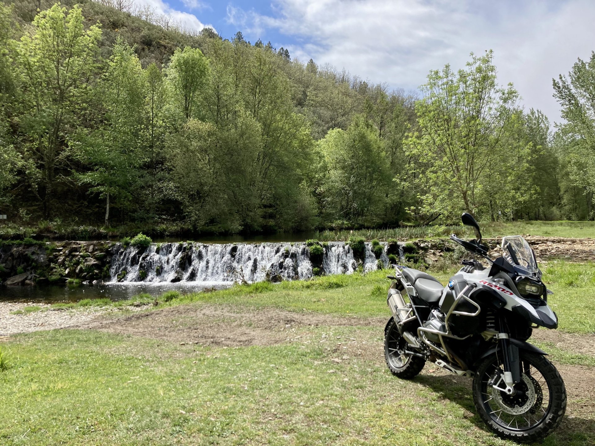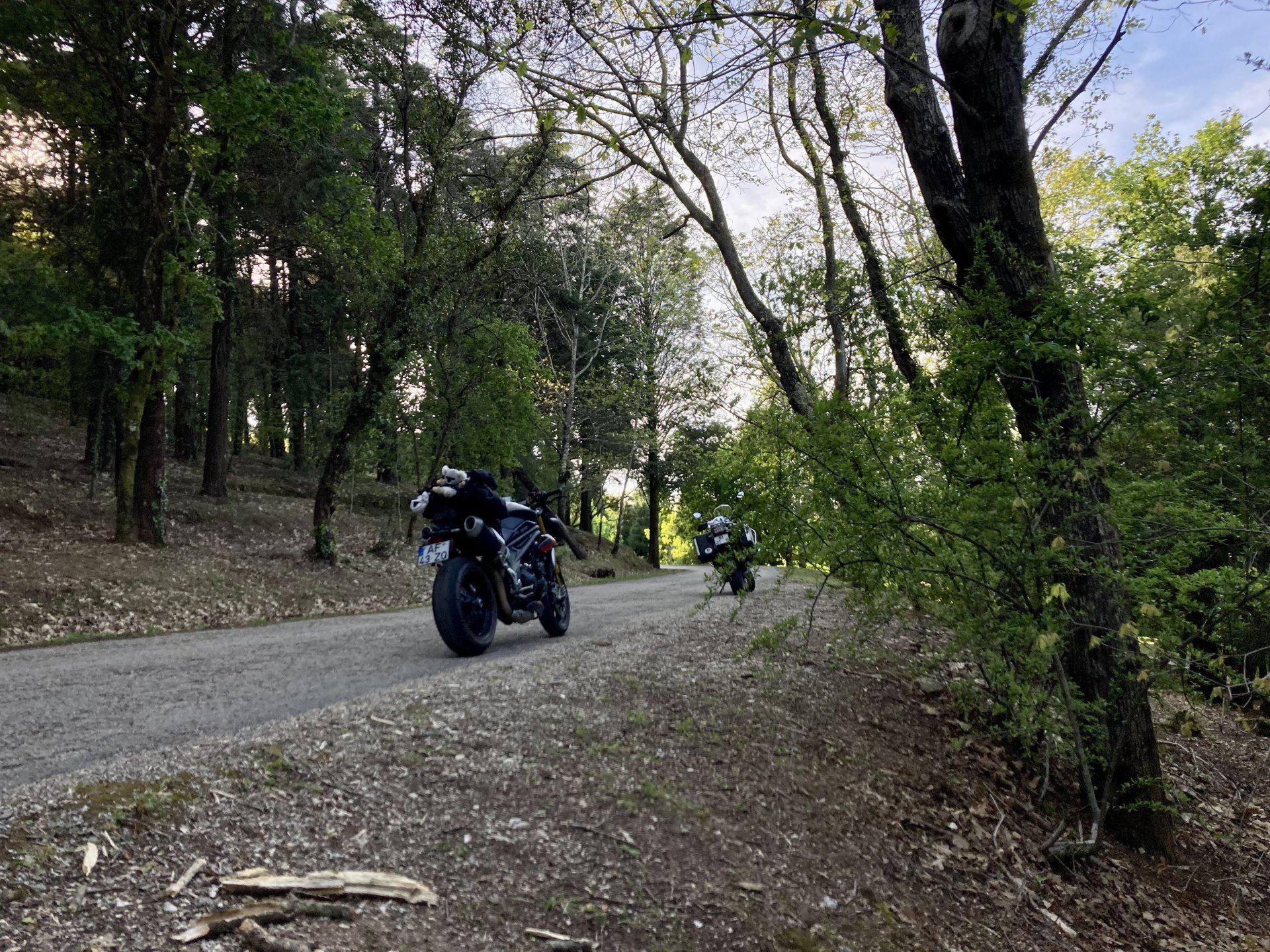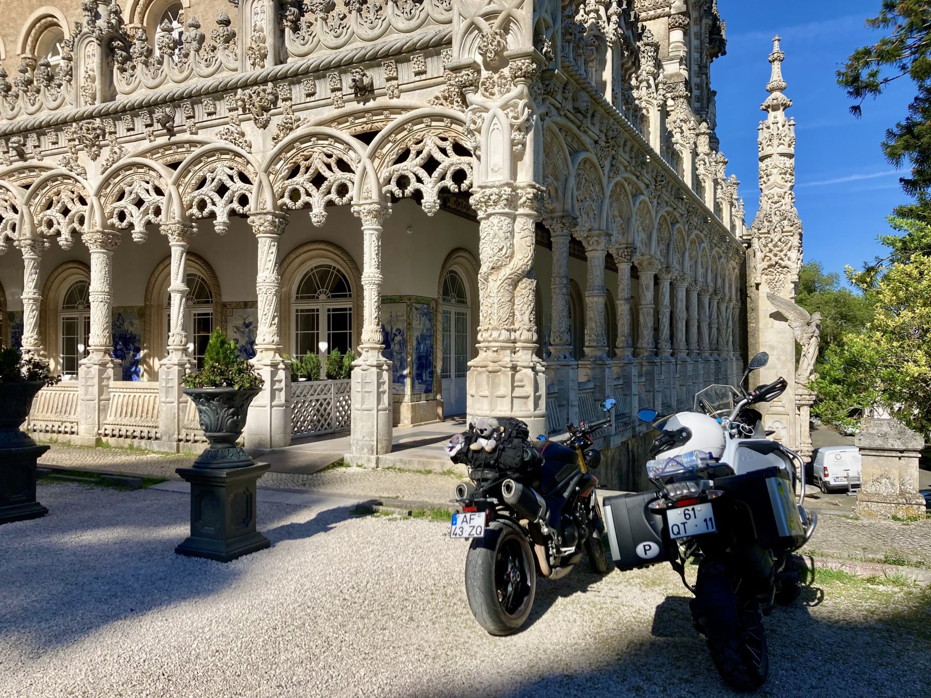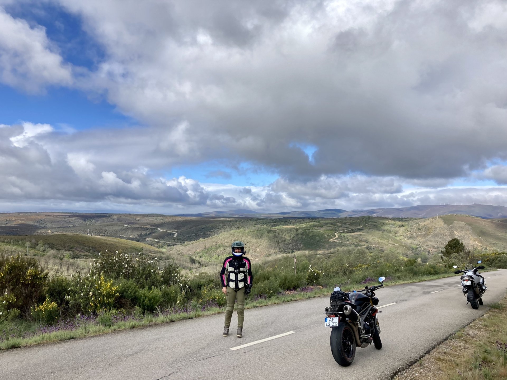 After my previous solo ride to Tras os Montes, Sofia had a few days to get away from being a vet and felt like going and checking the place out too, so that's what we did. Tras os Montes is sadly ignored by most tourists and even most portuguese tourists don't know the place. On one side this is bad, on the other it's very cool because it's a land of harsh climates, harsh landscape (that I've been told sometimes looks like Scotland), and authentic people and places, a lot of this is usually lost with bigger volume tourism. The aim was to go north, spend a couple of days at my parent's to keep my dog company, and then head north and inland in search of amazing old landscapes and good rustic meals. Tras os Montes reminds me of a time of kings, with it's abundant sweet chestnut trees, old castles, and stone walls that endure time. First, starting from the south / center of Portugal: I set of from my home near Lisbon on a monday morning, the sun was out and the day was to be sunny and plenty warm. I was early getting out, had already cleaned my place the day before so after taking out the trash the blinds were shut and the place left until my next stay. When I see that house closed I better leave quick or my emotional side takes over and I end up staying a few days more. I take only small roads, after a while I stop by a dam for breakfast at a cafe and a few work calls to get a few issues done for the day: Quickly made a friend, that abandoned her owner and came to check out my last bit of toast: Arrived at Constancia, quaint small town by the Tejo river with the claim of fame that very important historic poet Luis de Camões once lived here for a while. I stopped, had an espresso, and proceeded to wait for @Sofia, at the time setting off from Ericeira via motorways to catch up, she made it in illegally quick fashion but still gave me an hour to sit around watching country town life unfold. Posto de Turismo is where you get information about museums, tour guides, etc, and it's set up in the old jail house. Cool stuff, I did go up there to see the inside but it was closed. The sky was amazingly blue, and the warmth was arriving, it was supposed to be 30º that day. A contrast to the following days. At almost midday, Sofia arrived after her motorway blast, ready to take off a layer or two of warm clothing, and head into smaller slower roads heading up through the center of Portugal. We managed to eat a cheese and ham toast for lunch, which was a pleasant surprise, and continued north through dense forrests, here starting to look back from the first noticeable hills Not many pictures were taken, here's another friend that popped up while stopped for refreshments: Pampilhosa da Serra, roads around here are just underrated, this is hill and forrest country and the roads just seem to be well maintained, and fun enough to enjoy in all sorts of bikes. We stopped at a lookout over the town for a breath, and for me to think of the following roads. We had already settled on a historic hotel for the night so the general destination was set, just not the specific road to get there. I struck a pose: Brief stop at Gois, where I frequently get lost and exit on the wrong direction. Gois hosts Portugal's second biggest bike rally, after Faro. This is more of a portuguese thing, deep in the center of the country and away from touristy Algarve beaches. As we approach our hotel, which is deep in a forrest nature park, I stop for a bucolic pee and to enjoy the coolness the dense forest provides after a warm day on the bike. We park the bikes for the night, and quickly have a shower in time for a stroll around the property. Hour hotel is Palacio do Bussaco, a proper palace built for a real king. Rooms are run down and severely overvalued, but the building itself is amazingly characterful and the gardens and special forest around it are breathtaking. I never heard so many bees around, flowers are in bloom but we were later on having a glass of wine outside and you could hear the millions of bees in the background, like if a distant natural white noise. Sofia knows all about the story of the place, I am a little bit more of a simpleton and just enjoy the trees and birds and some (overpriced) wine. After a lovely dinner, we enjoy a walk around the gardens (like you do), before turning in. Tomorrow I have mountains and twisty roads planned! Before checking out, we walk a little around the forrest / garden surrounding the hotel, I learn that we have a special kind of cedar that only exists in this place. Cool stuff! ced Adequate parking location for the GS, although to be fair if I had my choice I would have left it under cover. I think the artisans that sculpted those pillars wouldn't have minded. From Bussaco and Luso, we set of to Serra do Caramulo for a coffee, some amazingly twisty roads up the hill have Sofia in a good mood after a little more than an hour to get there. Again, we set off, down the other side of Serra do Caramulo, and up Serra da Arada, we ride up a road I used to be very familiar with back when I used to race up here on the Transalp almost every weekend. The road twists up the hill with gravel and dirt thrown in on some bends, luckily for the Speed Triple it was better kept now but still a little out of spec for the sports bike like chassis of that bike. I forgot how harsh that road was, but it does make up for it with amazing views once you make it up there. BOTM: We ride through a few Serras, heading north, and I really put the Speed Triple and Sofia through some harsh roads, temperatures also reach 29º which doesn't bother me much but we were going slowly and it taxes you. A brief stop with a view After a longish day we reach the Douro river, which is just 40 minutes away from my parents' place. We take a breath of fresh riverside air. My dad was called in for a surprise visit to the doctor in Lisbon, so we made a two day stop in Espinho to hang out with Costa while they went away. It was a c