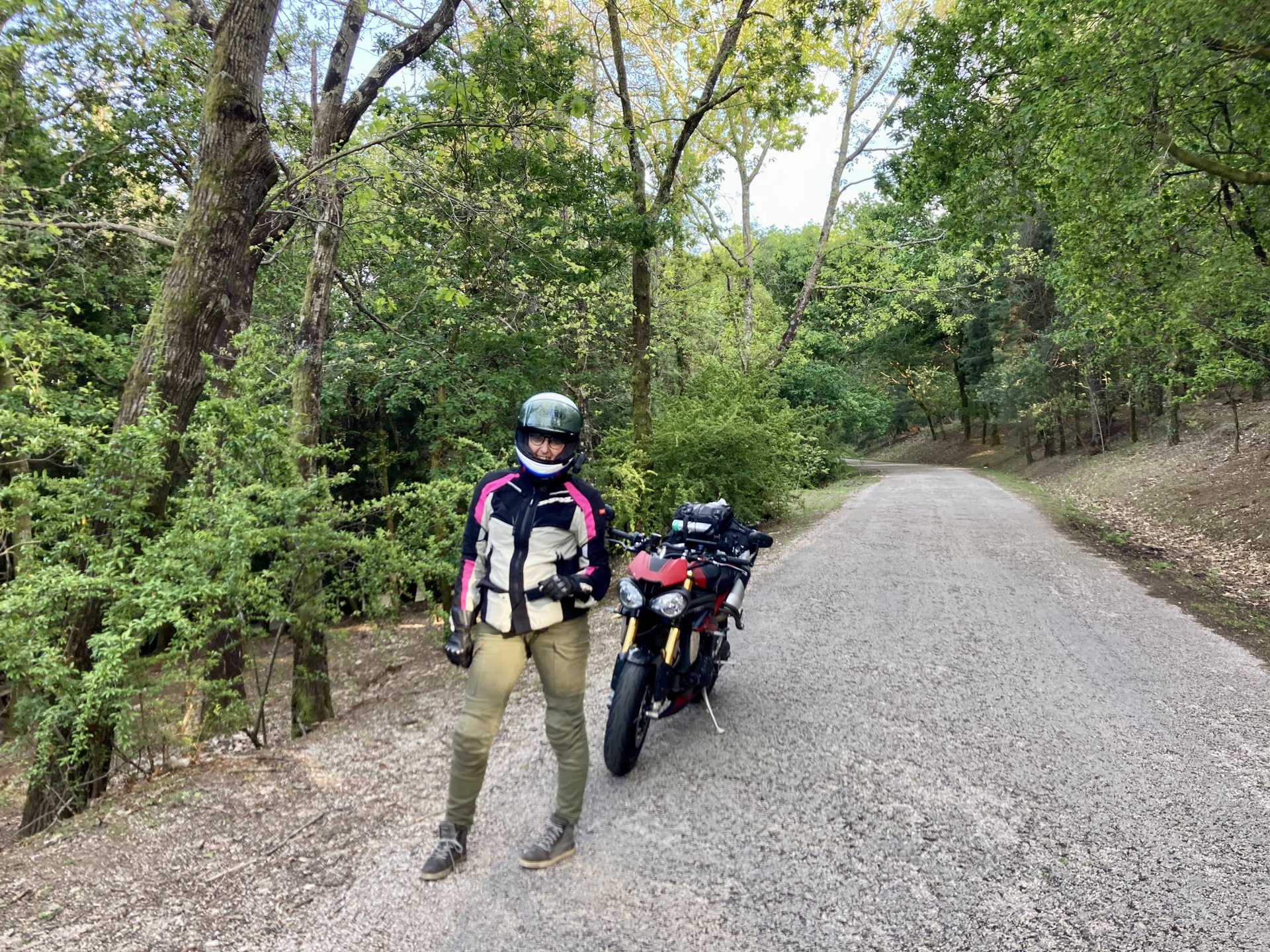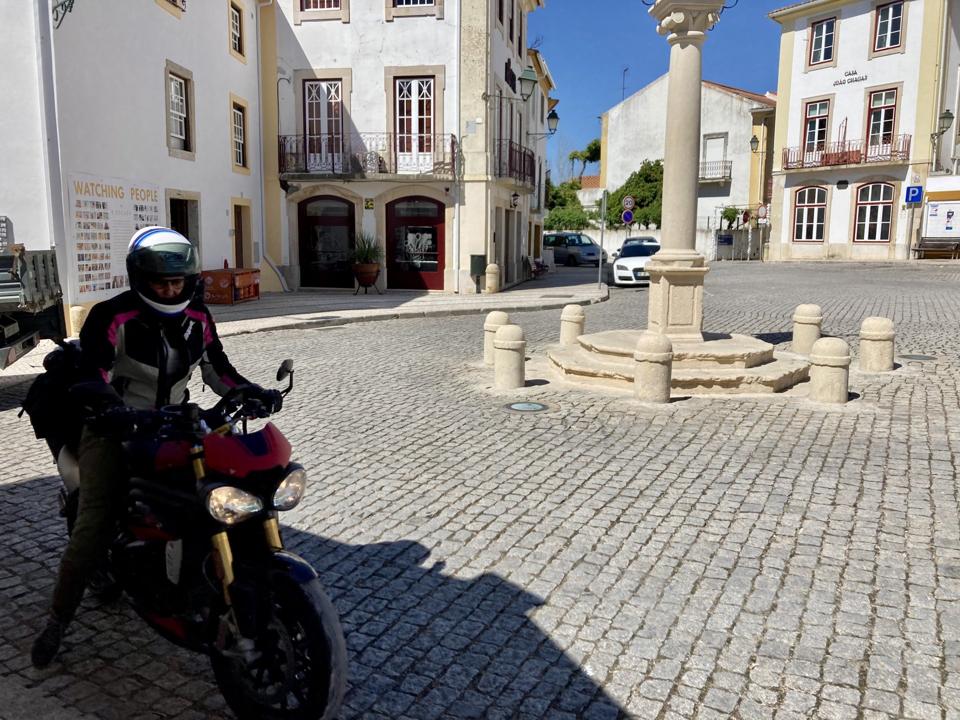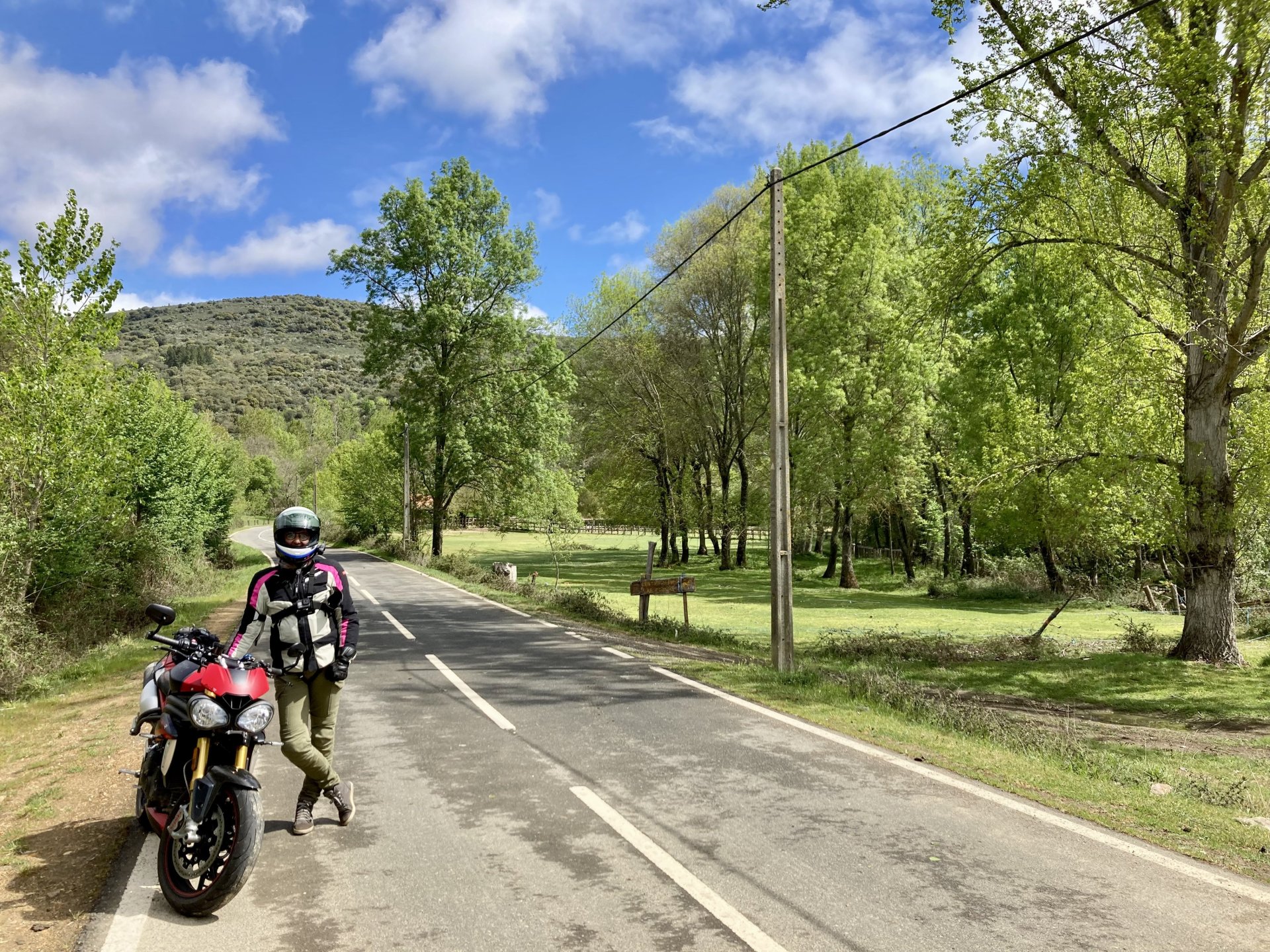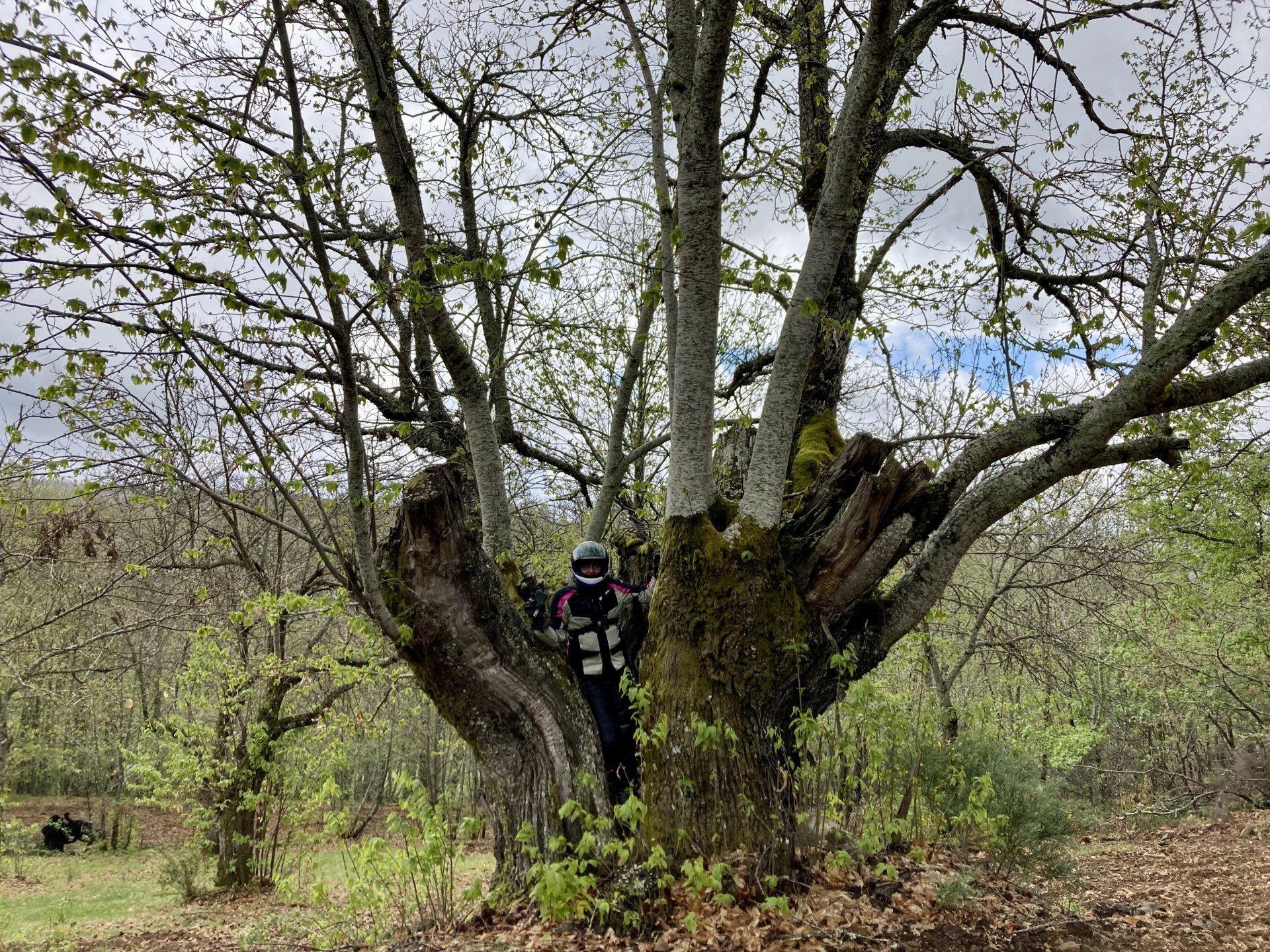 After my previous solo ride to Tras os Montes, Sofia had a few days to get away from being a vet and felt like going and checking the place out too, so that's what we did. Tras os Montes is sadly ignored by most tourists and even most portuguese tourists don't know the place. On one side this is bad, on the other it's very cool because it's a land of harsh climates, harsh landscape (that I've been told sometimes looks like Scotland), and authentic people and places, a lot of this is usually lost with bigger volume tourism. The aim was to go north, spend a couple of days at my parent's to keep my dog company, and then head north and inland in search of amazing old landscapes and good rustic meals. Tras os Montes reminds me of a time of kings, with it's abundant sweet chestnut trees, old castles, and stone walls that endure time. First, starting from the south / center of Portugal: I set of from my home near Lisbon on a monday morning, the sun was out and the day was to be sunny and plenty warm. I was early getting out, had already cleaned my place the day before so after taking out the trash the blinds were shut and the place left until my next stay. When I see that house closed I better leave quick or my emotional side takes over and I end up staying a few days more. I take only small roads, after a while I stop by a dam for breakfast at a cafe and a few work calls to get a few issues done for the day: Quickly made a friend, that abandoned her owner and came to check out my last bit of toast: Arrived at Constancia, quaint small town by the Tejo river with the claim of fame that very important historic poet Luis de Camões once lived here for a while. I stopped, had an espresso, and proceeded to wait for @Sofia, at the time setting off from Ericeira via motorways to catch up, she made it in illegally quick fashion but still gave me an hour to sit around watching country town life unfold. Posto de Turismo is where you get information about museums, tour guides, etc, and it's set up in the old jail house. Cool stuff, I did go up there to see the inside but it was closed. The sky was amazingly blue, and the warmth was arriving, it was supposed to be 30º that day. A contrast to the following days. At almost midday, Sofia arrived after her motorway blast, ready to take off a layer or two of warm clothing, and head into smaller slower roads heading up through the center of Portugal. We managed to eat a cheese and ham toast for lunch, which was a pleasant surprise, and continued north through dense forrests, here starting to look back from the first noticeable hills Not many pictures were taken, here's another friend that popped up while stopped for refreshments: Pampilhosa da Serra, roads around here are just underrated, this is hill and forrest country and the roads just seem to be well maintained, and fun enough to enjoy in all sorts of bikes. We stopped at a lookout over the town for a breath, and for me to think of the following roads. We had already settled on a historic hotel for the night so the general destination was set, just not the specific road to get there. I struck a pose: Brief stop at Gois, where I frequently get lost and exit on the wrong direction. Gois hosts Portugal's second biggest bike rally, after Faro. This is more of a portuguese thing, deep in the center of the country and away from touristy Algarve beaches. As we approach our hotel, which is deep in a forrest nature park, I stop for a bucolic pee and to enjoy the coolness the dense forest provides after a warm day on the bike. We park the bikes for the night, and quickly have a shower in time for a stroll around the property. Hour hotel is Palacio do Bussaco, a proper palace built for a real king. Rooms are run down and severely overvalued, but the building itself is amazingly characterful and the gardens and special forest around it are breathtaking. I never heard so many bees around, flowers are in bloom but we were later on having a glass of wine outside and you could hear the millions of bees in the background, like if a distant natural white noise. Sofia knows all about the story of the place, I am a little bit more of a simpleton and just enjoy the trees and birds and some (overpriced) wine. After a lovely dinner, we enjoy a walk around the gardens (like you do), before turning in. Tomorrow I have mountains and twisty roads planned! Before checking out, we walk a little around the forrest / garden surrounding the hotel, I learn that we have a special kind of cedar that only exists in this place. Cool stuff! ced Adequate parking location for the GS, although to be fair if I had my choice I would have left it under cover. I think the artisans that sculpted those pillars wouldn't have minded. From Bussaco and Luso, we set of to Serra do Caramulo for a coffee, some amazingly twisty roads up the hill have Sofia in a good mood after a little more than an hour to get there. Again, we set off, down the other side of Serra do Caramulo, and up Serra da Arada, we ride up a road I used to be very familiar with back when I used to race up here on the Transalp almost every weekend. The road twists up the hill with gravel and dirt thrown in on some bends, luckily for the Speed Triple it was better kept now but still a little out of spec for the sports bike like chassis of that bike. I forgot how harsh that road was, but it does make up for it with amazing views once you make it up there. BOTM: We ride through a few Serras, heading north, and I really put the Speed Triple and Sofia through some harsh roads, temperatures also reach 29º which doesn't bother me much but we were going slowly and it taxes you. A brief stop with a view After a longish day we reach the Douro river, which is just 40 minutes away from my parents' place. We take a breath of fresh riverside air. My dad was called in for a surprise visit to the doctor in Lisbon, so we made a two day stop in Espinho to hang out with Costa while they went away. It was a c
