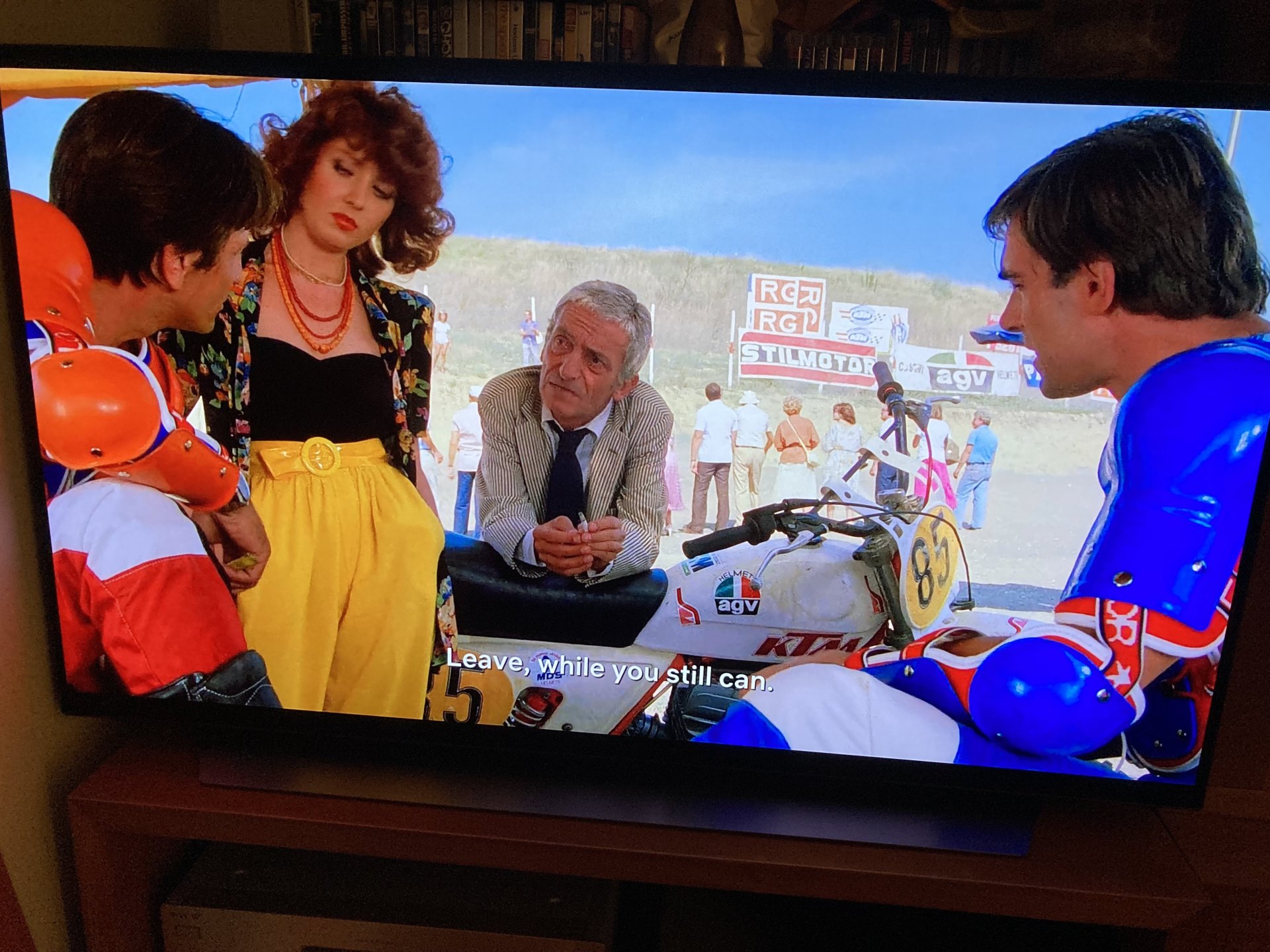 Speed Cross, italian film from 1980: https://www.imdb.com/title/tt0124302/ Two motocross racers (riding KTMs) come across an organized crime rigging of sports bets and insurge against it. Very Italian, full voice over sound with mismatched sound and lips moving, but a few very cool motorcycle scenes, old Mercedes on pursuit, Italians in suits, getting laid with ladies, etc, proper stuff worth a watch if not taken seriously. Cool stuff!