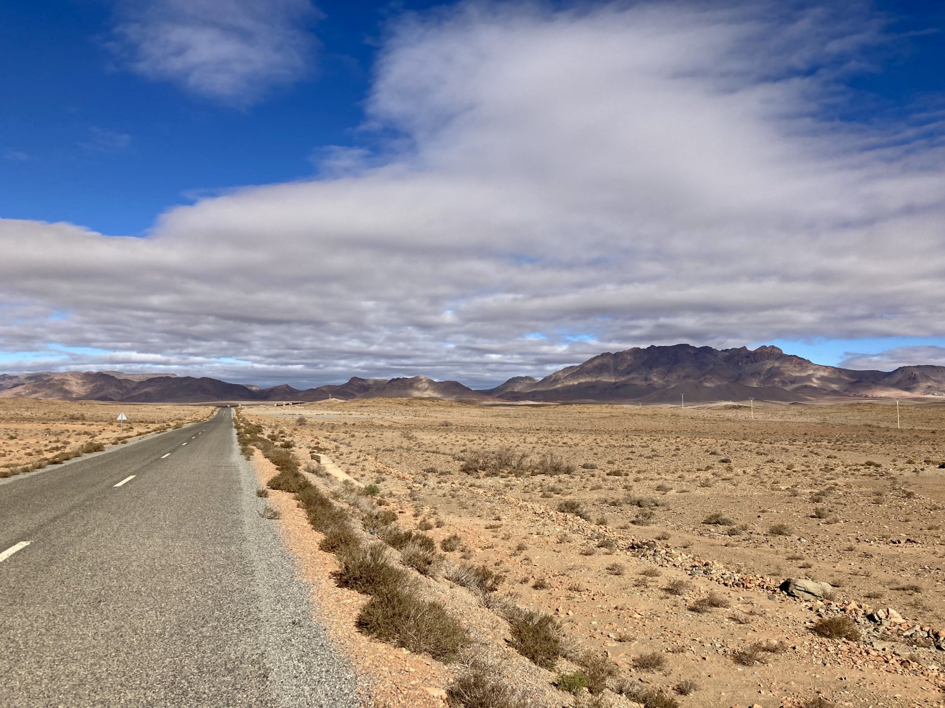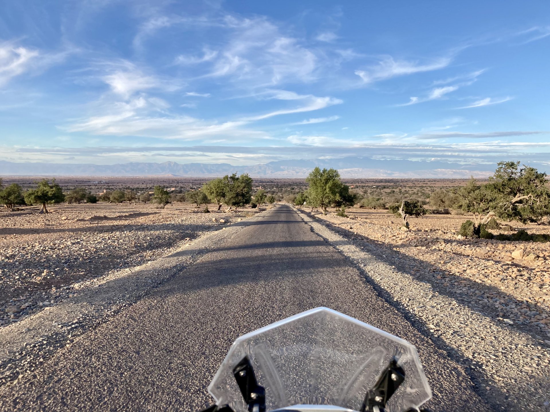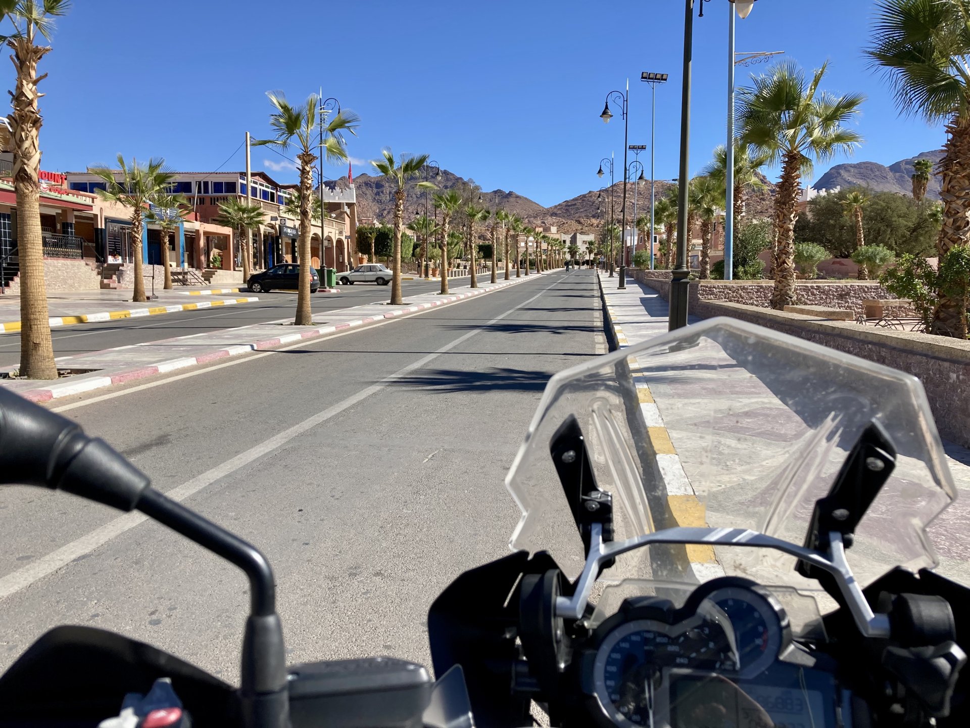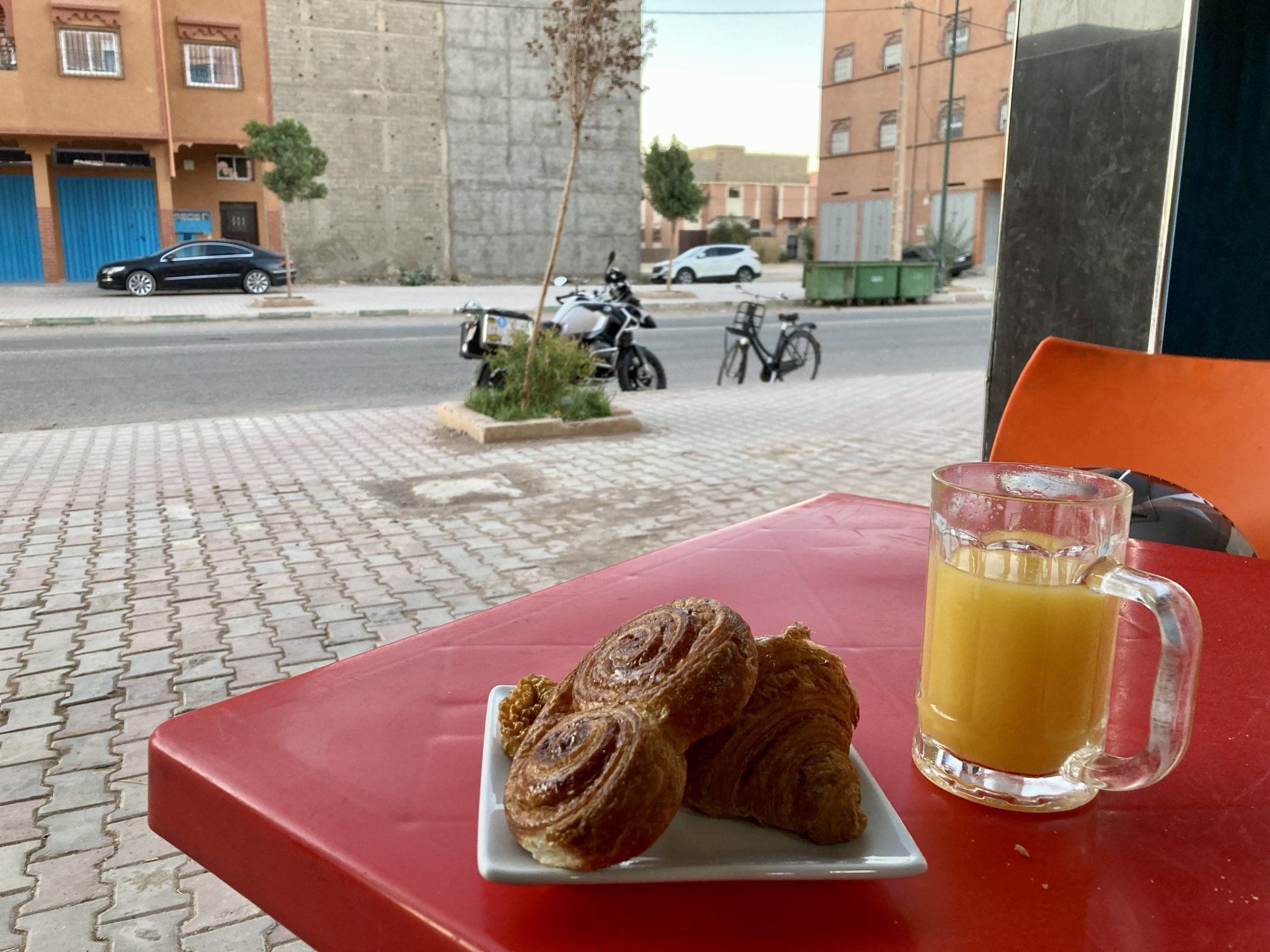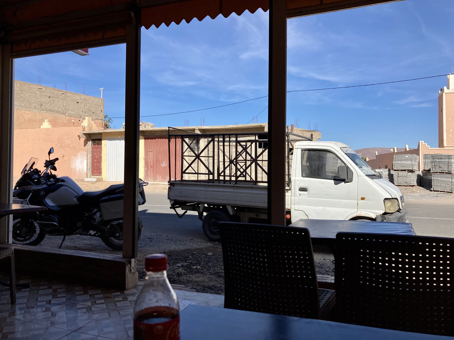 02nd December, Friday, woke up at dawn as soon as the sun cast sufficient light to hit me while still in bed, it's a lovely way to wake up also because here there is no TV, and very little internet to get distracted so you are forced to sleep early taking full advantage of the desert night silence. The previous night I talked a little with the hotel owner, and he told me about an oasis about 6 or 8km into the desert reachable only through proper sand dunes. Some hotels and tour guides have a few tents there and do overnight stays, there is no showers and limited use of water to prevent contamination of the excellent water quality they have there. It takes 1 to 1,5 hours to walk there with camels but only 15 minutes with quads. The silence of the desert night there must be deafening, I am eager to try that, and from what Hassan told me watching the stars there is amazing, extra amazing only though, because right on the edge of the dunes where I was staying you already get more of a clear picture of the universe than anywhere else I've been to. I was tempted to stay another couple of nights, on the night of the 02nd they had no other occupants other than maybe some surprise visitors but then on the 03rd they would be getting a 50 people group, if I were to stay that meant two more nights, and honestly I was worried that might push me too much into December and bad weather. Since I had been getting very lucky with the weather, I made a plan to visit again and next time go on the proper desert on foot or quads, now it's time to go back on the road. Waking up with the Saharan dawn, you can also appreciate desert style insulation on those doors : Bike packed up before breakfast, And again my favourite msmen and coffee for breakfast, while leisurely allowing the sun to rise a little and kill off some of that sand chill that seems to hit you right in the bones. The desert cold feels different than normal cold, during the previous days it got up about 15 and 18º in the afternoon and all the other tourists were freezing as soon as it got near sunset. Considering a group consisting of two Canadians, one Germans, two Swiss, some having flown directly from snow covered locations all exclaimed through an almost hearable teeth rattle that they didn't expect to feel so cold, there must be some truth to that. It does feel colder here. By 08:45 or 9, I rode off with a satisfying wheelspin, now feeling very confident with my surrounding terrain. My newly found confidence made me feel ecstatic and almost unwilling to leave the area, but it was the right thing to do as too much of that confidence would surely end up with an unpleasant event reminding me I am no Stephane Peterhansel. I decided to take only tarmac roads from here on, the bike having had a pretty good workout already, and also I realized that my luggage is the source of most of the unpleasant rattles I hear when riding on corrugations and proper offroad, I did not feel like carrying a broken luggage case in duct taped plastic bags. Next visit to the desert I will be carrying a different luggage arrangement if indeed the plan is to take more offroad pistes. My eyes were definitely teared up when leaving, it's a special location and I WILL return, I get a very similar feeling here than I used to get at the Nurburgring, both being motorsport locations and both with their own very special ways of biting back if you think you got things covered. After Rissani I stop as soon as the landscape becomes spectacular, and one last time try to find a fossil to take home. After 10 minutes looking I give up, say my farewells to Erg Chebbi and move on. I had a big day ahead, and from then on almost didn't stop through the day. I was headed southwest and planned on going past Zagora, to Tata an then Guelmim. Look it up on google maps, it's interesting terrain of wide open landscapes and mountains. No plan where to sleep, that would be tended to by mid afternoon depending on where I got to, riding at night with this cold wasn't on the plans. Acacia trees start to dot the landscape, and it definitely feels like Africa now. Stopped to have a sip of water, and ended up taking my knife to the plastic water bottle to cut it in half and provide three skinny dogs with some refreshment. They were cautious of me but as soon as I walked to a safe distance they slurped it down, no more water with me now, but I knew there would be plenty of towns ahead. Tissint is a pretty location, I remember that on a previous trip I was also surprised at how much water there was there. Stopped just enough to get a couple of pictures, and made way, this was a day for covering distance. Went past Zagora with just one stop to fuel up the bike, and rode on making it to Tata at around 16:00. I had passed by where before me and Maria had reached to stay for the night, but that was riding at much more of a leisurely pace, now I had a conundrum, either ride on and get cold in one or one and a half hours, or stay here and relax. Tata has an authentic vibe to it, no tourists, no Europeans either it seemed, and no touts. In fact nobody seemed to give a shit about me except for kids who always wave at a big motorcycle, so I stayed. Stopped on town entrance to eat something, a croissant and some yogurt, and check on booking.com and arrange for shelter. Don't know how to name that sweet by the croissant on the picture, but if you're ever in Morocco do ask for them by pointing, they're very cinnamony inside and absolutely decadent. I found a comfy and cheap place to stay, in a one single person bed bedroom, something I haven't seen in ages anywhere, but it had just been renovated and had amazing water pressure in the hot shower, something you really value after staying in the desert. By 17:30 I go to the bar to get a bottle of water and notice people are watching the world cup and drinking beer, not being my first choice on a regular day I promptly order a Heineken, and the bar tender is a little shoc