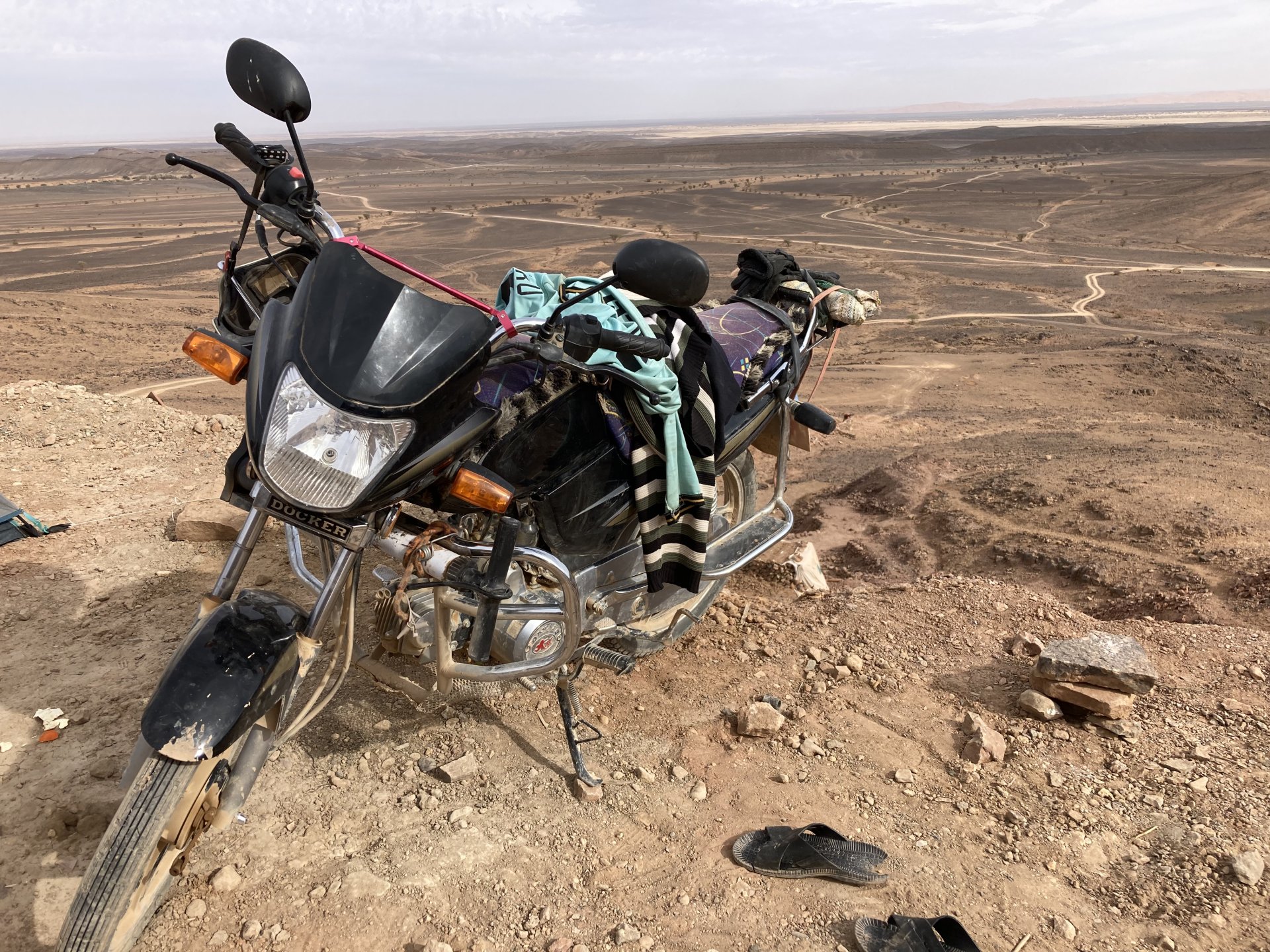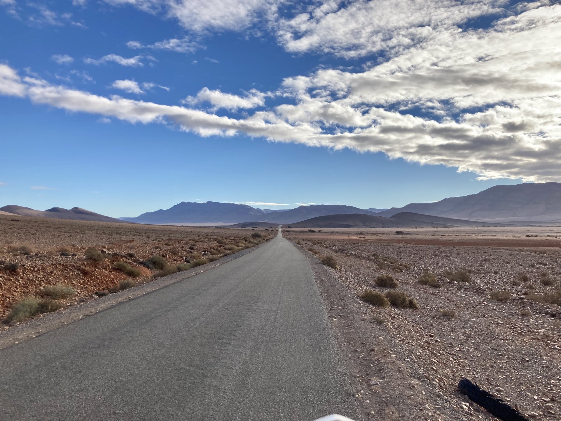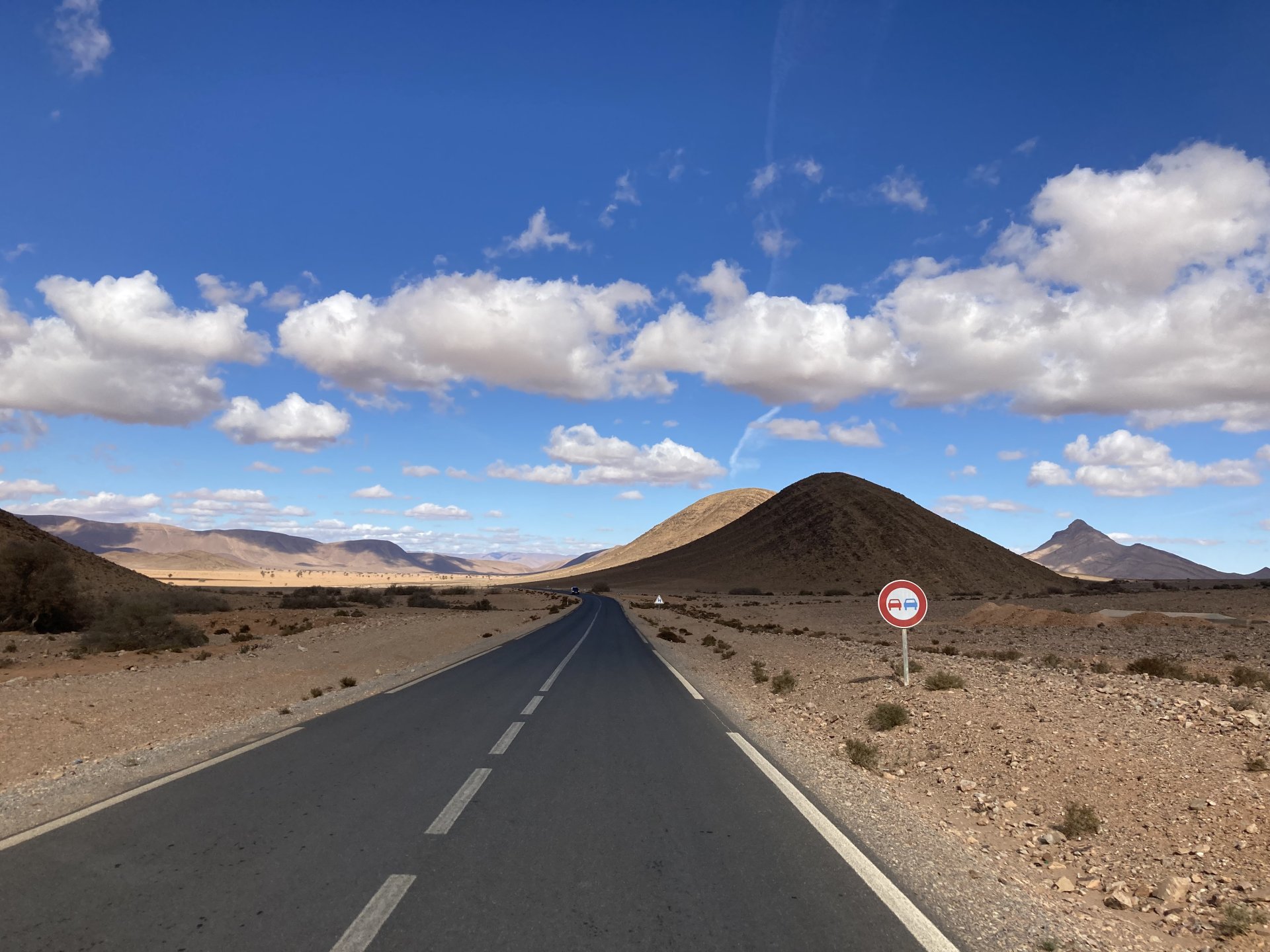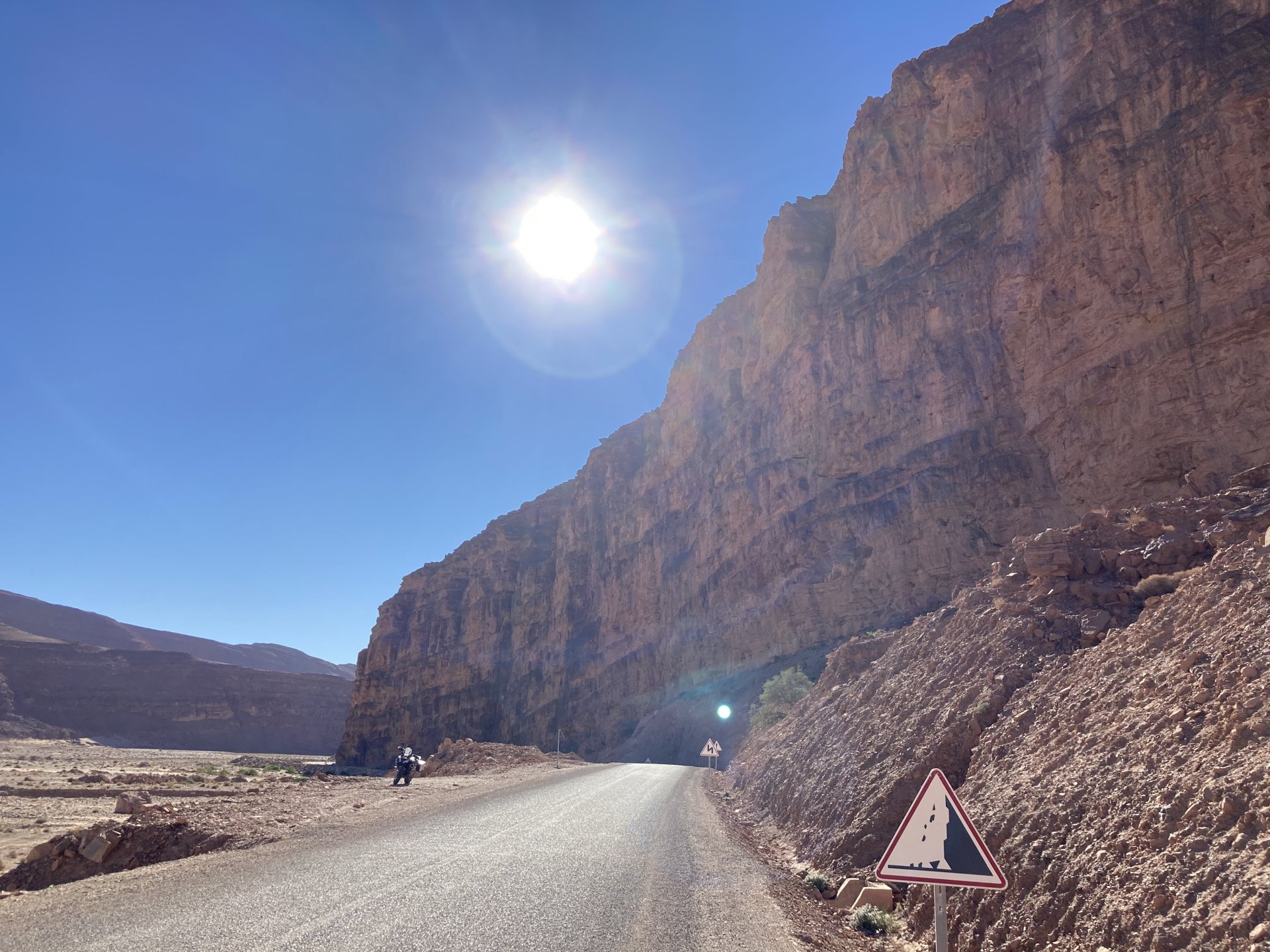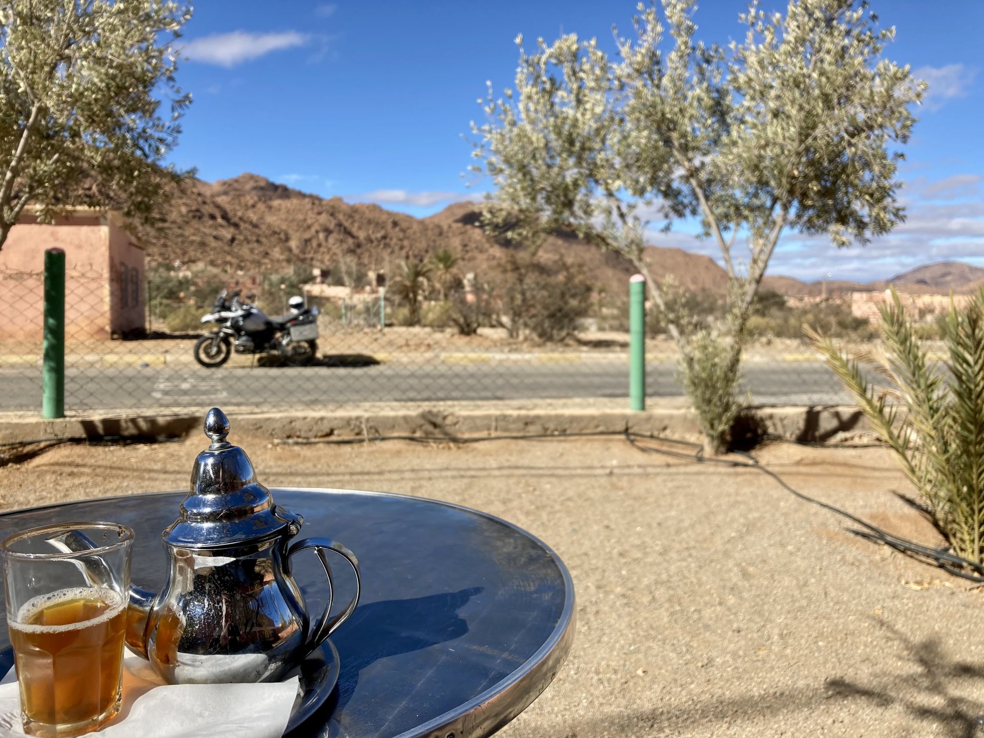 02nd December, Friday, woke up at dawn as soon as the sun cast sufficient light to hit me while still in bed, it's a lovely way to wake up also because here there is no TV, and very little internet to get distracted so you are forced to sleep early taking full advantage of the desert night silence. The previous night I talked a little with the hotel owner, and he told me about an oasis about 6 or 8km into the desert reachable only through proper sand dunes. Some hotels and tour guides have a few tents there and do overnight stays, there is no showers and limited use of water to prevent contamination of the excellent water quality they have there. It takes 1 to 1,5 hours to walk there with camels but only 15 minutes with quads. The silence of the desert night there must be deafening, I am eager to try that, and from what Hassan told me watching the stars there is amazing, extra amazing only though, because right on the edge of the dunes where I was staying you already get more of a clear picture of the universe than anywhere else I've been to. I was tempted to stay another couple of nights, on the night of the 02nd they had no other occupants other than maybe some surprise visitors but then on the 03rd they would be getting a 50 people group, if I were to stay that meant two more nights, and honestly I was worried that might push me too much into December and bad weather. Since I had been getting very lucky with the weather, I made a plan to visit again and next time go on the proper desert on foot or quads, now it's time to go back on the road. Waking up with the Saharan dawn, you can also appreciate desert style insulation on those doors : Bike packed up before breakfast, And again my favourite msmen and coffee for breakfast, while leisurely allowing the sun to rise a little and kill off some of that sand chill that seems to hit you right in the bones. The desert cold feels different than normal cold, during the previous days it got up about 15 and 18º in the afternoon and all the other tourists were freezing as soon as it got near sunset. Considering a group consisting of two Canadians, one Germans, two Swiss, some having flown directly from snow covered locations all exclaimed through an almost hearable teeth rattle that they didn't expect to feel so cold, there must be some truth to that. It does feel colder here. By 08:45 or 9, I rode off with a satisfying wheelspin, now feeling very confident with my surrounding terrain. My newly found confidence made me feel ecstatic and almost unwilling to leave the area, but it was the right thing to do as too much of that confidence would surely end up with an unpleasant event reminding me I am no Stephane Peterhansel. I decided to take only tarmac roads from here on, the bike having had a pretty good workout already, and also I realized that my luggage is the source of most of the unpleasant rattles I hear when riding on corrugations and proper offroad, I did not feel like carrying a broken luggage case in duct taped plastic bags. Next visit to the desert I will be carrying a different luggage arrangement if indeed the plan is to take more offroad pistes. My eyes were definitely teared up when leaving, it's a special location and I WILL return, I get a very similar feeling here than I used to get at the Nurburgring, both being motorsport locations and both with their own very special ways of biting back if you think you got things covered. After Rissani I stop as soon as the landscape becomes spectacular, and one last time try to find a fossil to take home. After 10 minutes looking I give up, say my farewells to Erg Chebbi and move on. I had a big day ahead, and from then on almost didn't stop through the day. I was headed southwest and planned on going past Zagora, to Tata an then Guelmim. Look it up on google maps, it's interesting terrain of wide open landscapes and mountains. No plan where to sleep, that would be tended to by mid afternoon depending on where I got to, riding at night with this cold wasn't on the plans. Acacia trees start to dot the landscape, and it definitely feels like Africa now. Stopped to have a sip of water, and ended up taking my knife to the plastic water bottle to cut it in half and provide three skinny dogs with some refreshment. They were cautious of me but as soon as I walked to a safe distance they slurped it down, no more water with me now, but I knew there would be plenty of towns ahead. Tissint is a pretty location, I remember that on a previous trip I was also surprised at how much water there was there. Stopped just enough to get a couple of pictures, and made way, this was a day for covering distance. Went past Zagora with just one stop to fuel up the bike, and rode on making it to Tata at around 16:00. I had passed by where before me and Maria had reached to stay for the night, but that was riding at much more of a leisurely pace, now I had a conundrum, either ride on and get cold in one or one and a half hours, or stay here and relax. Tata has an authentic vibe to it, no tourists, no Europeans either it seemed, and no touts. In fact nobody seemed to give a shit about me except for kids who always wave at a big motorcycle, so I stayed. Stopped on town entrance to eat something, a croissant and some yogurt, and check on booking.com and arrange for shelter. Don't know how to name that sweet by the croissant on the picture, but if you're ever in Morocco do ask for them by pointing, they're very cinnamony inside and absolutely decadent. I found a comfy and cheap place to stay, in a one single person bed bedroom, something I haven't seen in ages anywhere, but it had just been renovated and had amazing water pressure in the hot shower, something you really value after staying in the desert. By 17:30 I go to the bar to get a bottle of water and notice people are watching the world cup and drinking beer, not being my first choice on a regular day I promptly order a Heineken, and the bar tender is a little shoc