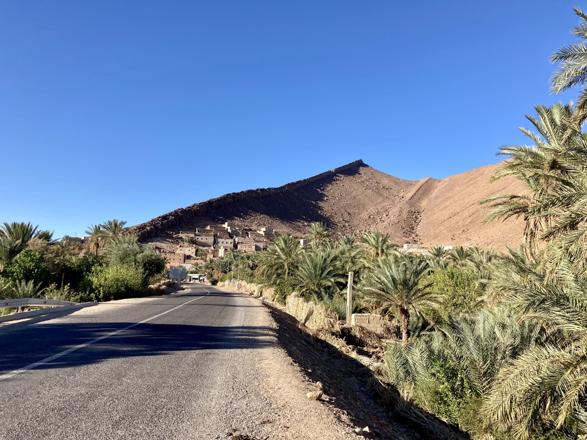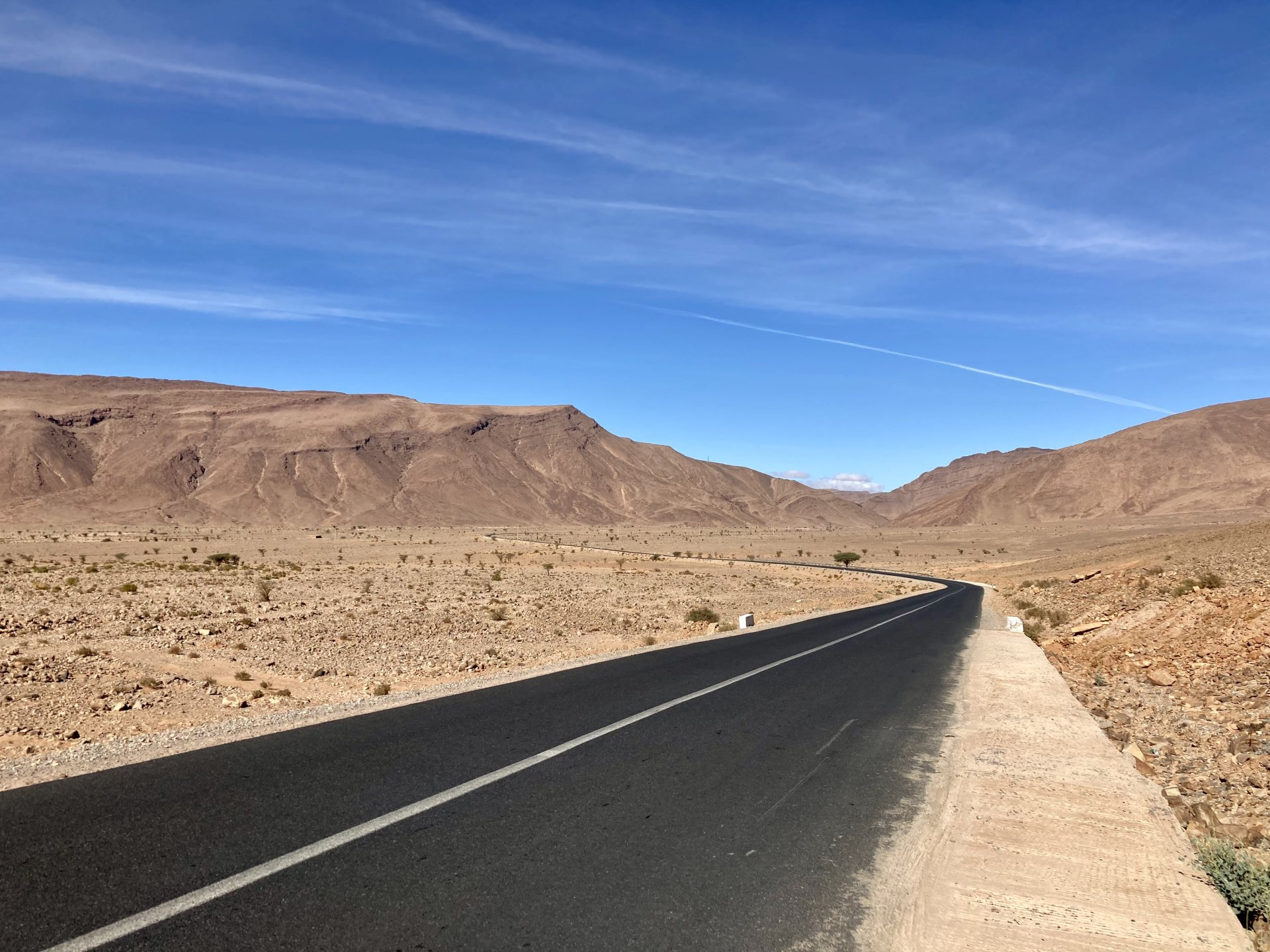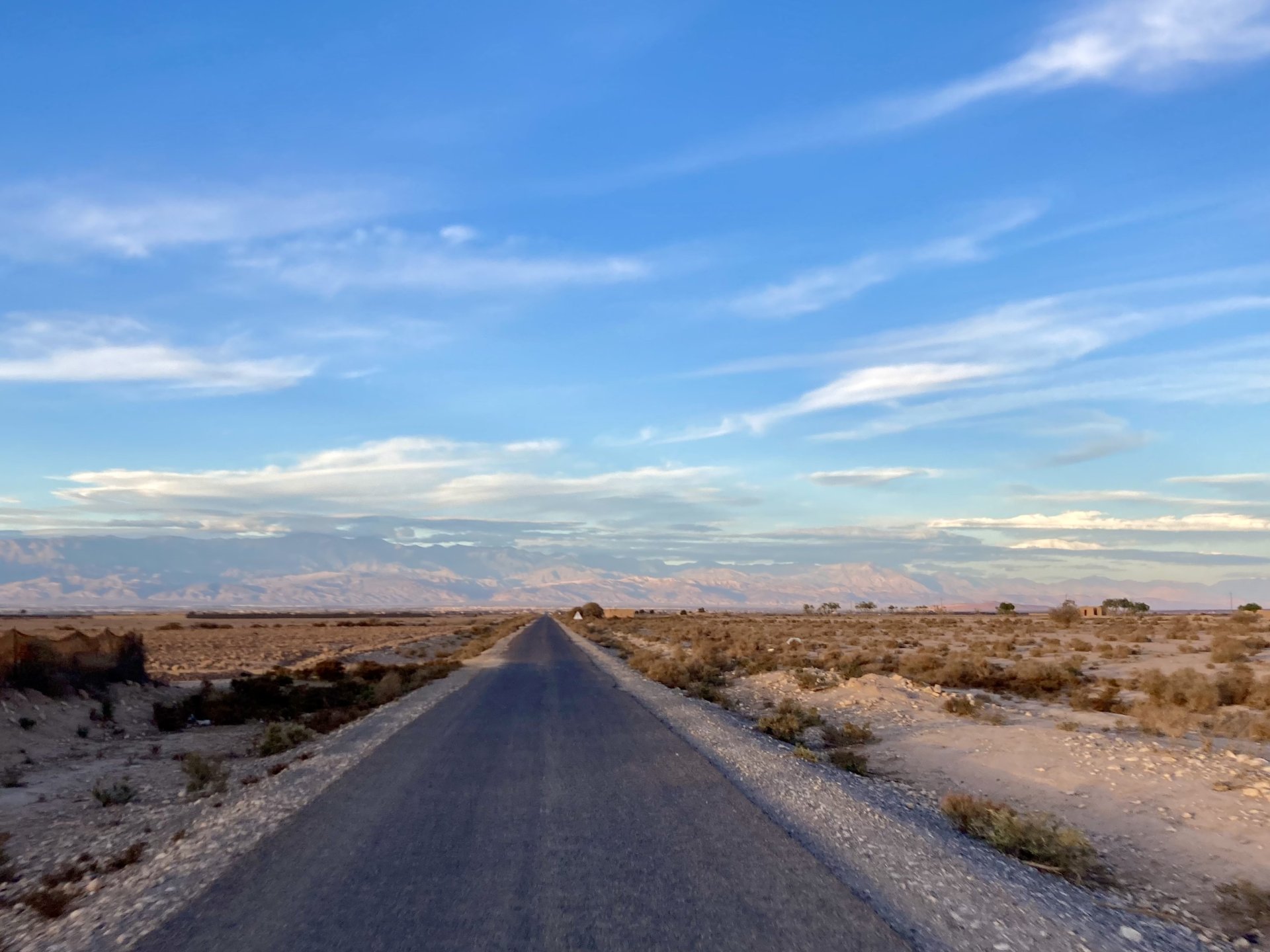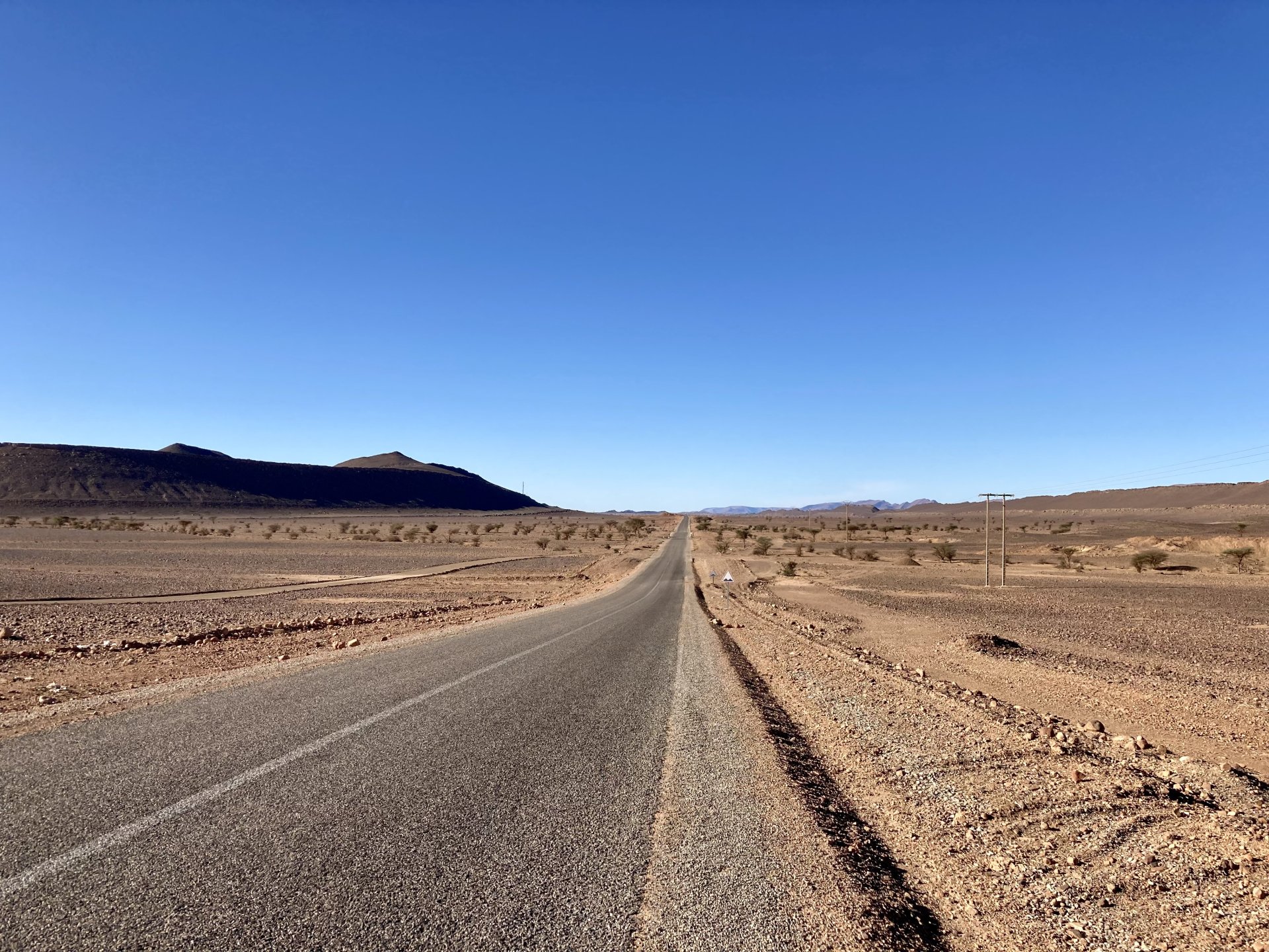 02nd December, Friday, woke up at dawn as soon as the sun cast sufficient light to hit me while still in bed, it's a lovely way to wake up also because here there is no TV, and very little internet to get distracted so you are forced to sleep early taking full advantage of the desert night silence. The previous night I talked a little with the hotel owner, and he told me about an oasis about 6 or 8km into the desert reachable only through proper sand dunes. Some hotels and tour guides have a few tents there and do overnight stays, there is no showers and limited use of water to prevent contamination of the excellent water quality they have there. It takes 1 to 1,5 hours to walk there with camels but only 15 minutes with quads. The silence of the desert night there must be deafening, I am eager to try that, and from what Hassan told me watching the stars there is amazing, extra amazing only though, because right on the edge of the dunes where I was staying you already get more of a clear picture of the universe than anywhere else I've been to. I was tempted to stay another couple of nights, on the night of the 02nd they had no other occupants other than maybe some surprise visitors but then on the 03rd they would be getting a 50 people group, if I were to stay that meant two more nights, and honestly I was worried that might push me too much into December and bad weather. Since I had been getting very lucky with the weather, I made a plan to visit again and next time go on the proper desert on foot or quads, now it's time to go back on the road. Waking up with the Saharan dawn, you can also appreciate desert style insulation on those doors : Bike packed up before breakfast, And again my favourite msmen and coffee for breakfast, while leisurely allowing the sun to rise a little and kill off some of that sand chill that seems to hit you right in the bones. The desert cold feels different than normal cold, during the previous days it got up about 15 and 18º in the afternoon and all the other tourists were freezing as soon as it got near sunset. Considering a group consisting of two Canadians, one Germans, two Swiss, some having flown directly from snow covered locations all exclaimed through an almost hearable teeth rattle that they didn't expect to feel so cold, there must be some truth to that. It does feel colder here. By 08:45 or 9, I rode off with a satisfying wheelspin, now feeling very confident with my surrounding terrain. My newly found confidence made me feel ecstatic and almost unwilling to leave the area, but it was the right thing to do as too much of that confidence would surely end up with an unpleasant event reminding me I am no Stephane Peterhansel. I decided to take only tarmac roads from here on, the bike having had a pretty good workout already, and also I realized that my luggage is the source of most of the unpleasant rattles I hear when riding on corrugations and proper offroad, I did not feel like carrying a broken luggage case in duct taped plastic bags. Next visit to the desert I will be carrying a different luggage arrangement if indeed the plan is to take more offroad pistes. My eyes were definitely teared up when leaving, it's a special location and I WILL return, I get a very similar feeling here than I used to get at the Nurburgring, both being motorsport locations and both with their own very special ways of biting back if you think you got things covered. After Rissani I stop as soon as the landscape becomes spectacular, and one last time try to find a fossil to take home. After 10 minutes looking I give up, say my farewells to Erg Chebbi and move on. I had a big day ahead, and from then on almost didn't stop through the day. I was headed southwest and planned on going past Zagora, to Tata an then Guelmim. Look it up on google maps, it's interesting terrain of wide open landscapes and mountains. No plan where to sleep, that would be tended to by mid afternoon depending on where I got to, riding at night with this cold wasn't on the plans. Acacia trees start to dot the landscape, and it definitely feels like Africa now. Stopped to have a sip of water, and ended up taking my knife to the plastic water bottle to cut it in half and provide three skinny dogs with some refreshment. They were cautious of me but as soon as I walked to a safe distance they slurped it down, no more water with me now, but I knew there would be plenty of towns ahead. Tissint is a pretty location, I remember that on a previous trip I was also surprised at how much water there was there. Stopped just enough to get a couple of pictures, and made way, this was a day for covering distance. Went past Zagora with just one stop to fuel up the bike, and rode on making it to Tata at around 16:00. I had passed by where before me and Maria had reached to stay for the night, but that was riding at much more of a leisurely pace, now I had a conundrum, either ride on and get cold in one or one and a half hours, or stay here and relax. Tata has an authentic vibe to it, no tourists, no Europeans either it seemed, and no touts. In fact nobody seemed to give a shit about me except for kids who always wave at a big motorcycle, so I stayed. Stopped on town entrance to eat something, a croissant and some yogurt, and check on booking.com and arrange for shelter. Don't know how to name that sweet by the croissant on the picture, but if you're ever in Morocco do ask for them by pointing, they're very cinnamony inside and absolutely decadent. I found a comfy and cheap place to stay, in a one single person bed bedroom, something I haven't seen in ages anywhere, but it had just been renovated and had amazing water pressure in the hot shower, something you really value after staying in the desert. By 17:30 I go to the bar to get a bottle of water and notice people are watching the world cup and drinking beer, not being my first choice on a regular day I promptly order a Heineken, and the bar tender is a little shoc