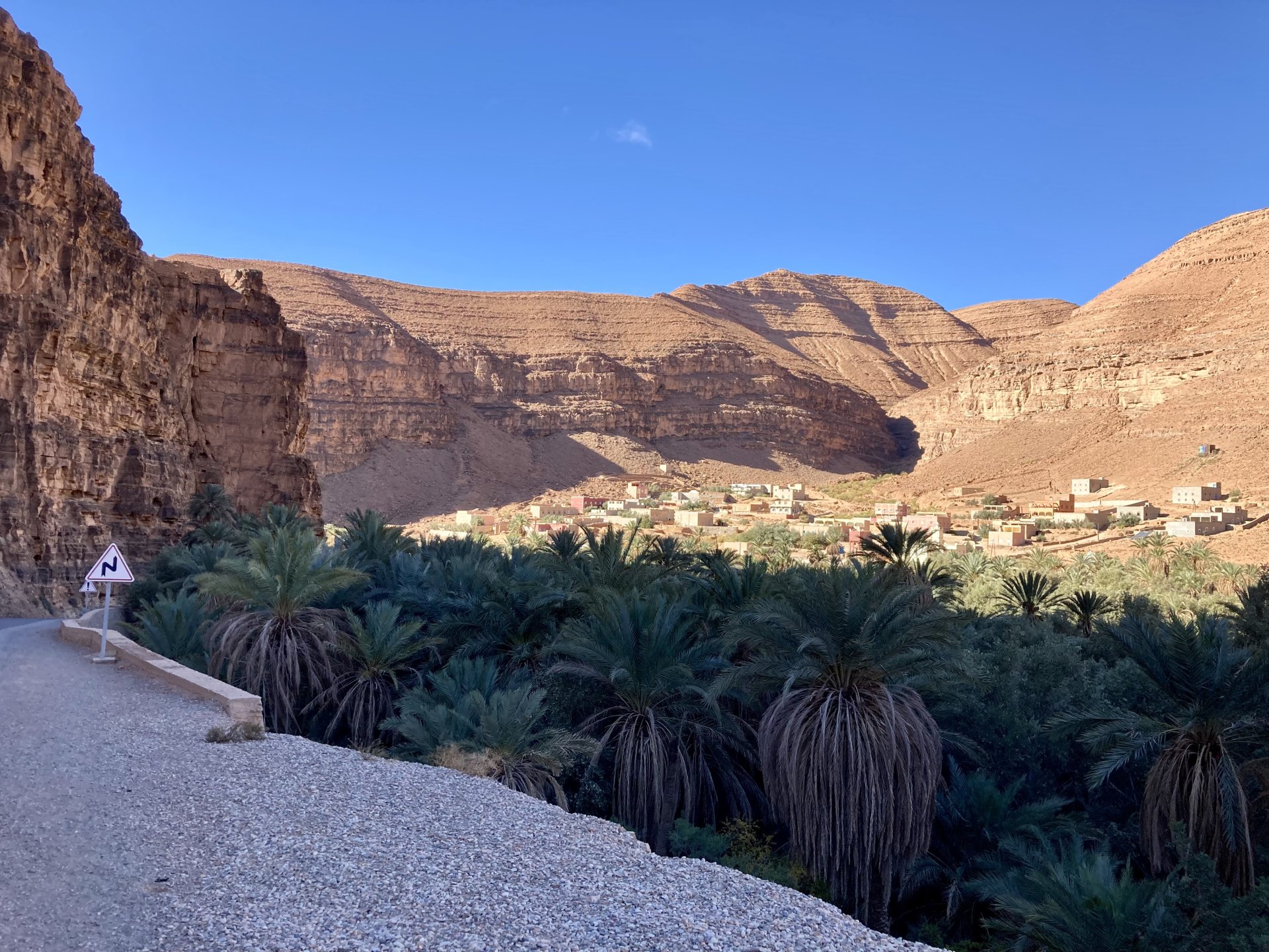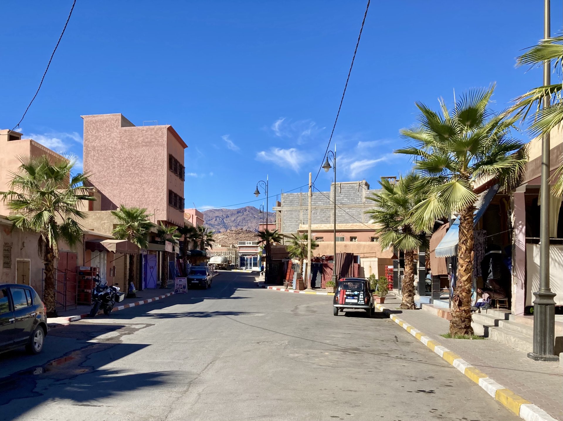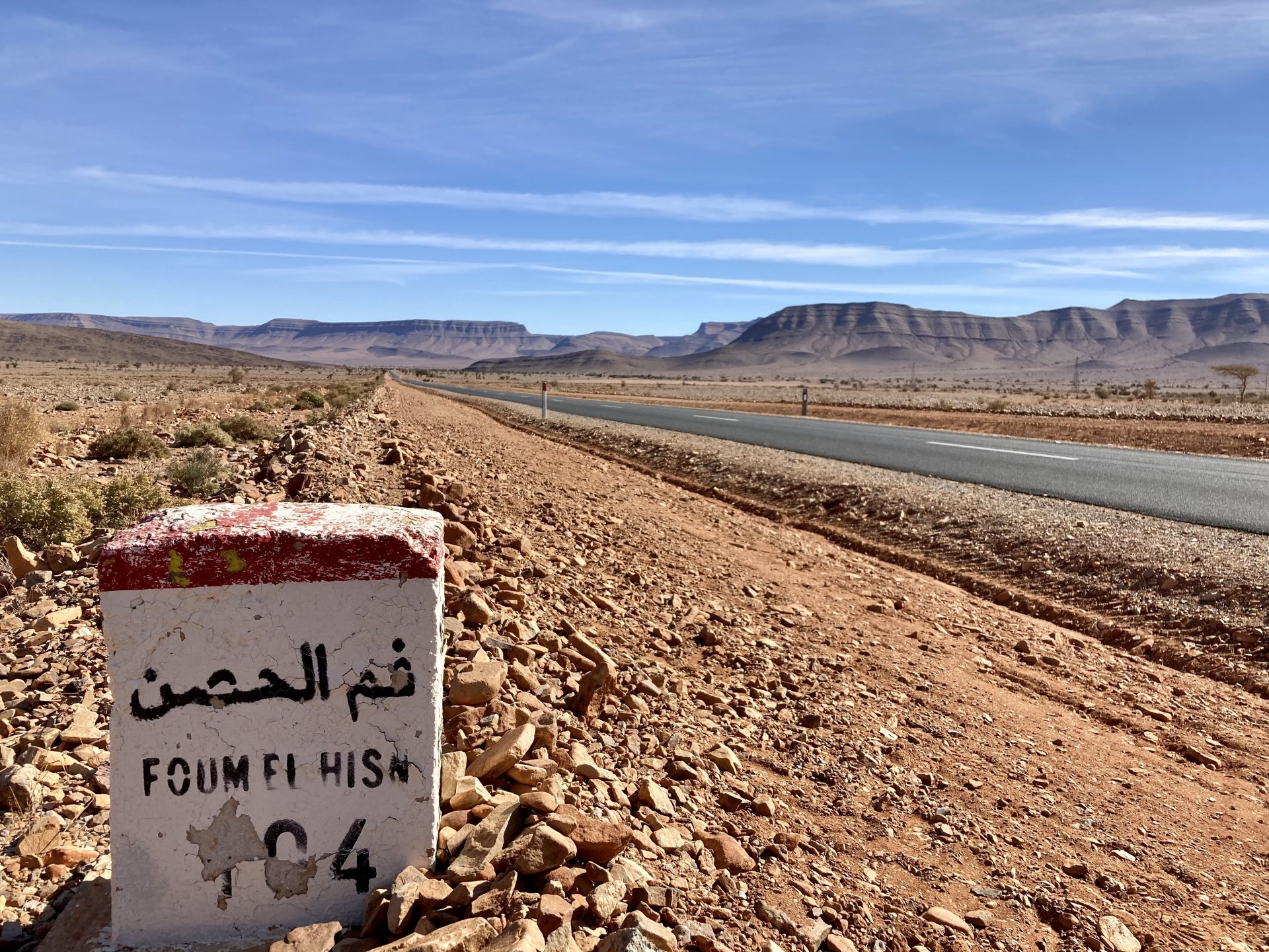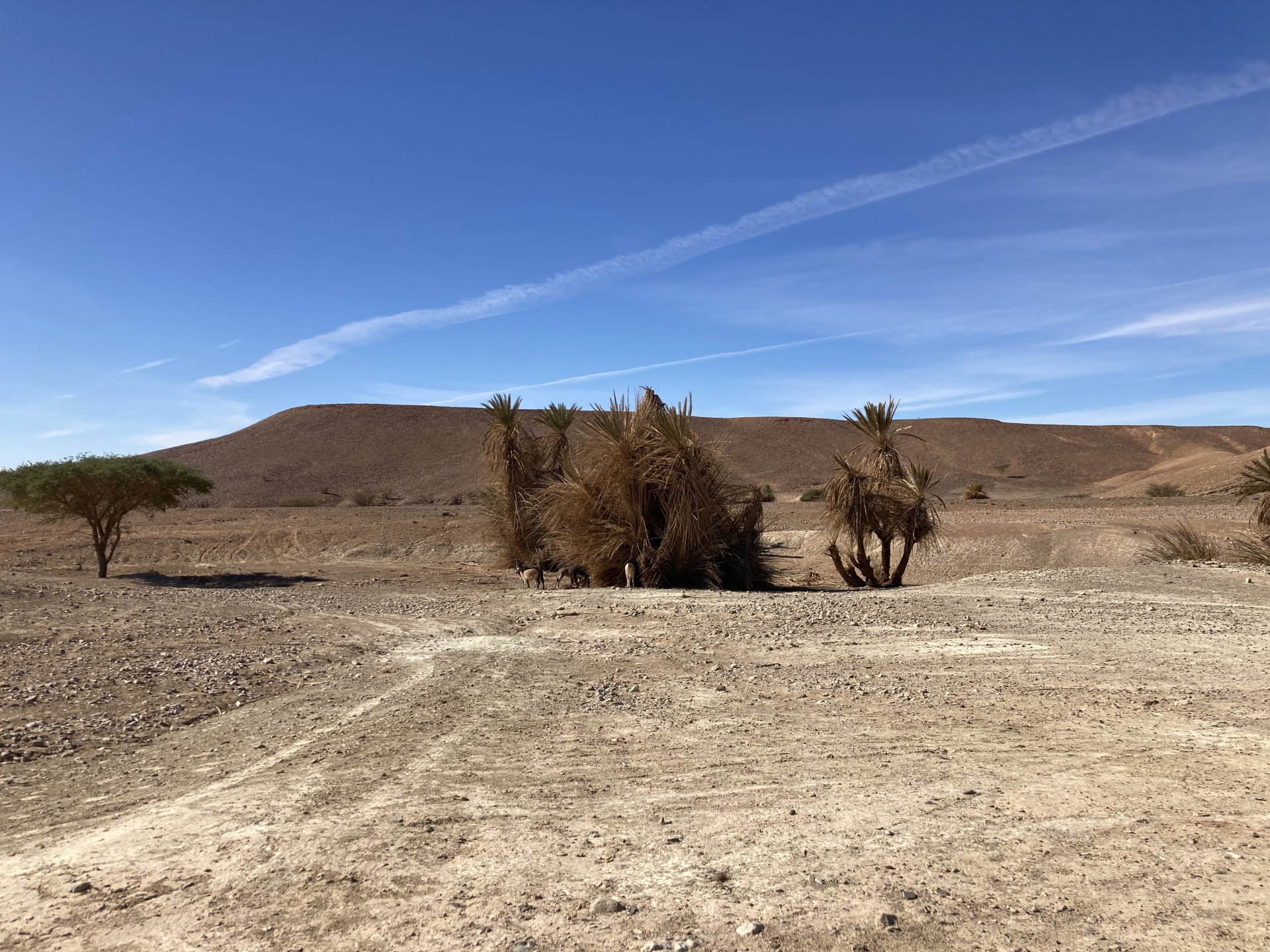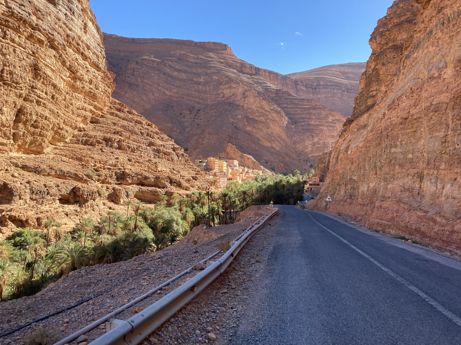 02nd December, Friday, woke up at dawn as soon as the sun cast sufficient light to hit me while still in bed, it's a lovely way to wake up also because here there is no TV, and very little internet to get distracted so you are forced to sleep early taking full advantage of the desert night silence. The previous night I talked a little with the hotel owner, and he told me about an oasis about 6 or 8km into the desert reachable only through proper sand dunes. Some hotels and tour guides have a few tents there and do overnight stays, there is no showers and limited use of water to prevent contamination of the excellent water quality they have there. It takes 1 to 1,5 hours to walk there with camels but only 15 minutes with quads. The silence of the desert night there must be deafening, I am eager to try that, and from what Hassan told me watching the stars there is amazing, extra amazing only though, because right on the edge of the dunes where I was staying you already get more of a clear picture of the universe than anywhere else I've been to. I was tempted to stay another couple of nights, on the night of the 02nd they had no other occupants other than maybe some surprise visitors but then on the 03rd they would be getting a 50 people group, if I were to stay that meant two more nights, and honestly I was worried that might push me too much into December and bad weather. Since I had been getting very lucky with the weather, I made a plan to visit again and next time go on the proper desert on foot or quads, now it's time to go back on the road. Waking up with the Saharan dawn, you can also appreciate desert style insulation on those doors : Bike packed up before breakfast, And again my favourite msmen and coffee for breakfast, while leisurely allowing the sun to rise a little and kill off some of that sand chill that seems to hit you right in the bones. The desert cold feels different than normal cold, during the previous days it got up about 15 and 18º in the afternoon and all the other tourists were freezing as soon as it got near sunset. Considering a group consisting of two Canadians, one Germans, two Swiss, some having flown directly from snow covered locations all exclaimed through an almost hearable teeth rattle that they didn't expect to feel so cold, there must be some truth to that. It does feel colder here. By 08:45 or 9, I rode off with a satisfying wheelspin, now feeling very confident with my surrounding terrain. My newly found confidence made me feel ecstatic and almost unwilling to leave the area, but it was the right thing to do as too much of that confidence would surely end up with an unpleasant event reminding me I am no Stephane Peterhansel. I decided to take only tarmac roads from here on, the bike having had a pretty good workout already, and also I realized that my luggage is the source of most of the unpleasant rattles I hear when riding on corrugations and proper offroad, I did not feel like carrying a broken luggage case in duct taped plastic bags. Next visit to the desert I will be carrying a different luggage arrangement if indeed the plan is to take more offroad pistes. My eyes were definitely teared up when leaving, it's a special location and I WILL return, I get a very similar feeling here than I used to get at the Nurburgring, both being motorsport locations and both with their own very special ways of biting back if you think you got things covered. After Rissani I stop as soon as the landscape becomes spectacular, and one last time try to find a fossil to take home. After 10 minutes looking I give up, say my farewells to Erg Chebbi and move on. I had a big day ahead, and from then on almost didn't stop through the day. I was headed southwest and planned on going past Zagora, to Tata an then Guelmim. Look it up on google maps, it's interesting terrain of wide open landscapes and mountains. No plan where to sleep, that would be tended to by mid afternoon depending on where I got to, riding at night with this cold wasn't on the plans. Acacia trees start to dot the landscape, and it definitely feels like Africa now. Stopped to have a sip of water, and ended up taking my knife to the plastic water bottle to cut it in half and provide three skinny dogs with some refreshment. They were cautious of me but as soon as I walked to a safe distance they slurped it down, no more water with me now, but I knew there would be plenty of towns ahead. Tissint is a pretty location, I remember that on a previous trip I was also surprised at how much water there was there. Stopped just enough to get a couple of pictures, and made way, this was a day for covering distance. Went past Zagora with just one stop to fuel up the bike, and rode on making it to Tata at around 16:00. I had passed by where before me and Maria had reached to stay for the night, but that was riding at much more of a leisurely pace, now I had a conundrum, either ride on and get cold in one or one and a half hours, or stay here and relax. Tata has an authentic vibe to it, no tourists, no Europeans either it seemed, and no touts. In fact nobody seemed to give a shit about me except for kids who always wave at a big motorcycle, so I stayed. Stopped on town entrance to eat something, a croissant and some yogurt, and check on booking.com and arrange for shelter. Don't know how to name that sweet by the croissant on the picture, but if you're ever in Morocco do ask for them by pointing, they're very cinnamony inside and absolutely decadent. I found a comfy and cheap place to stay, in a one single person bed bedroom, something I haven't seen in ages anywhere, but it had just been renovated and had amazing water pressure in the hot shower, something you really value after staying in the desert. By 17:30 I go to the bar to get a bottle of water and notice people are watching the world cup and drinking beer, not being my first choice on a regular day I promptly order a Heineken, and the bar tender is a little shoc