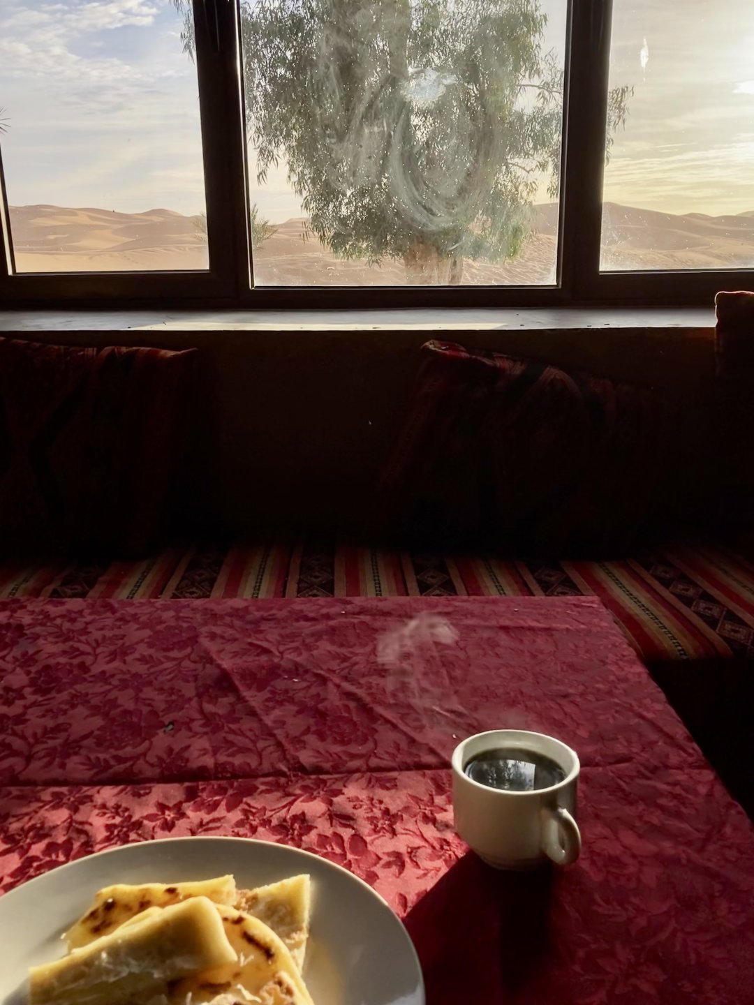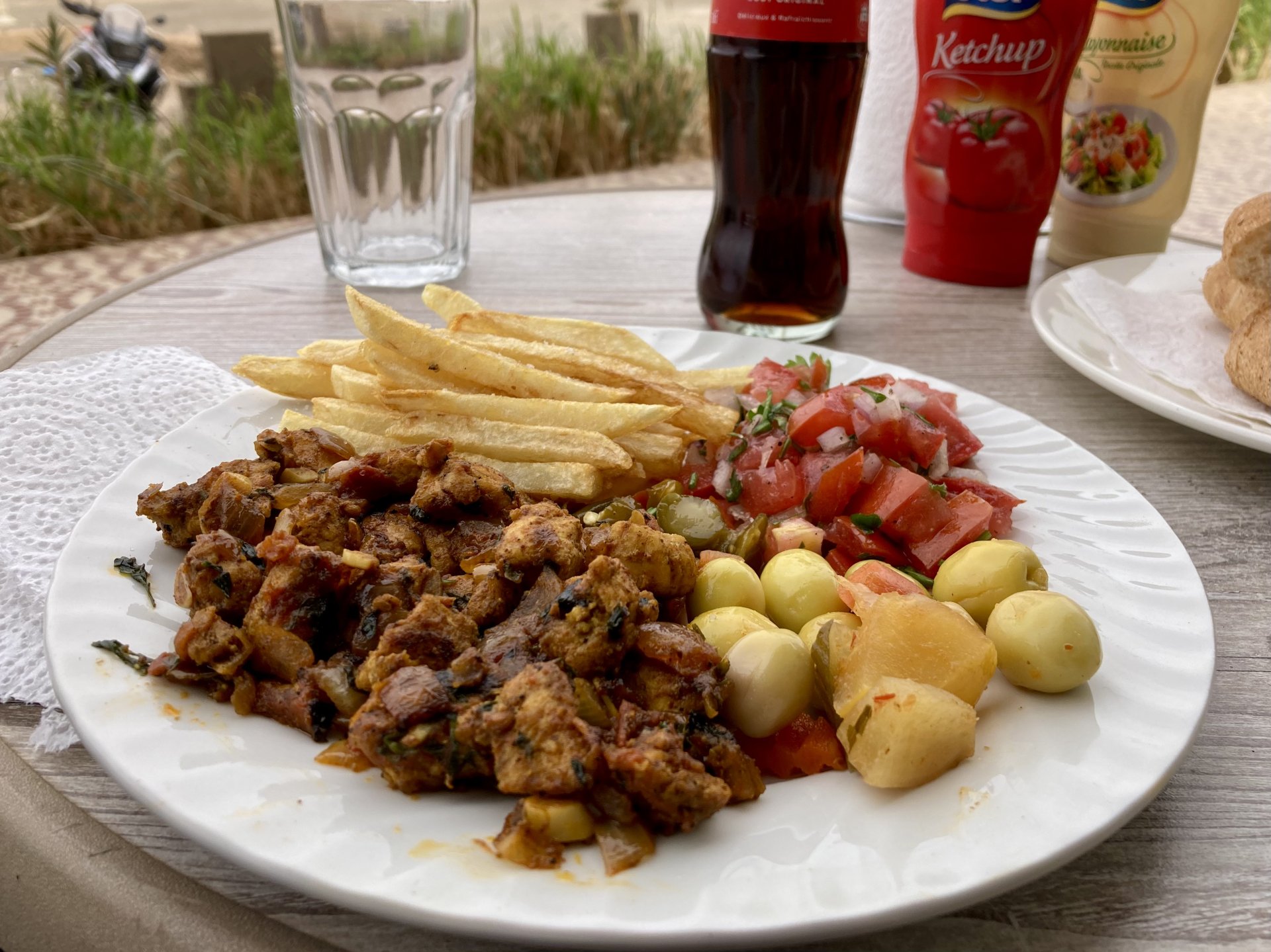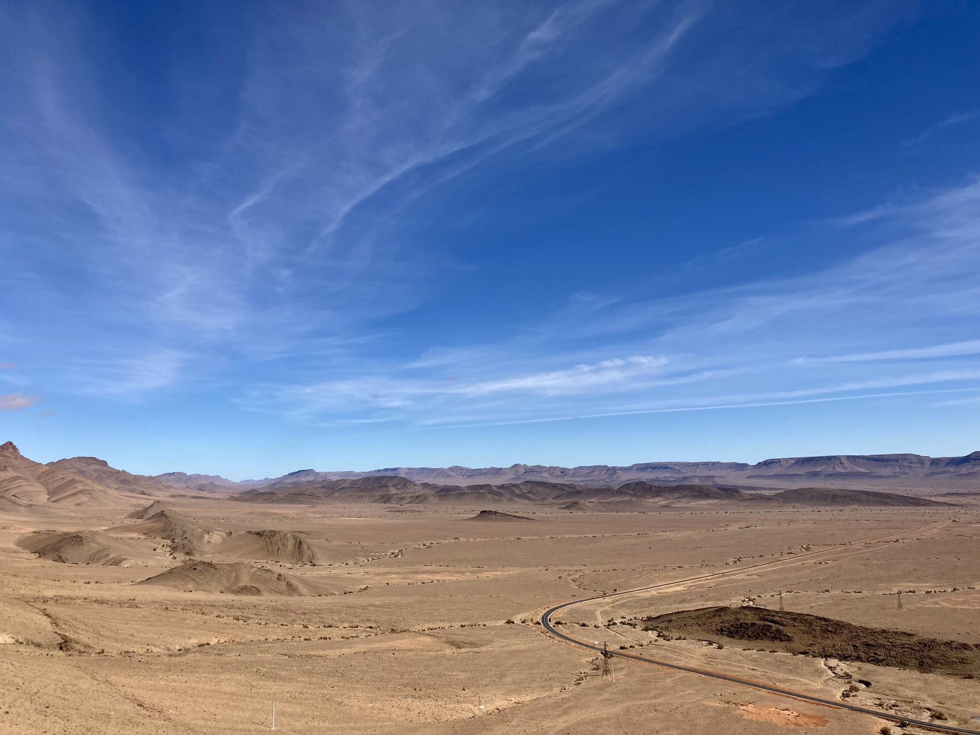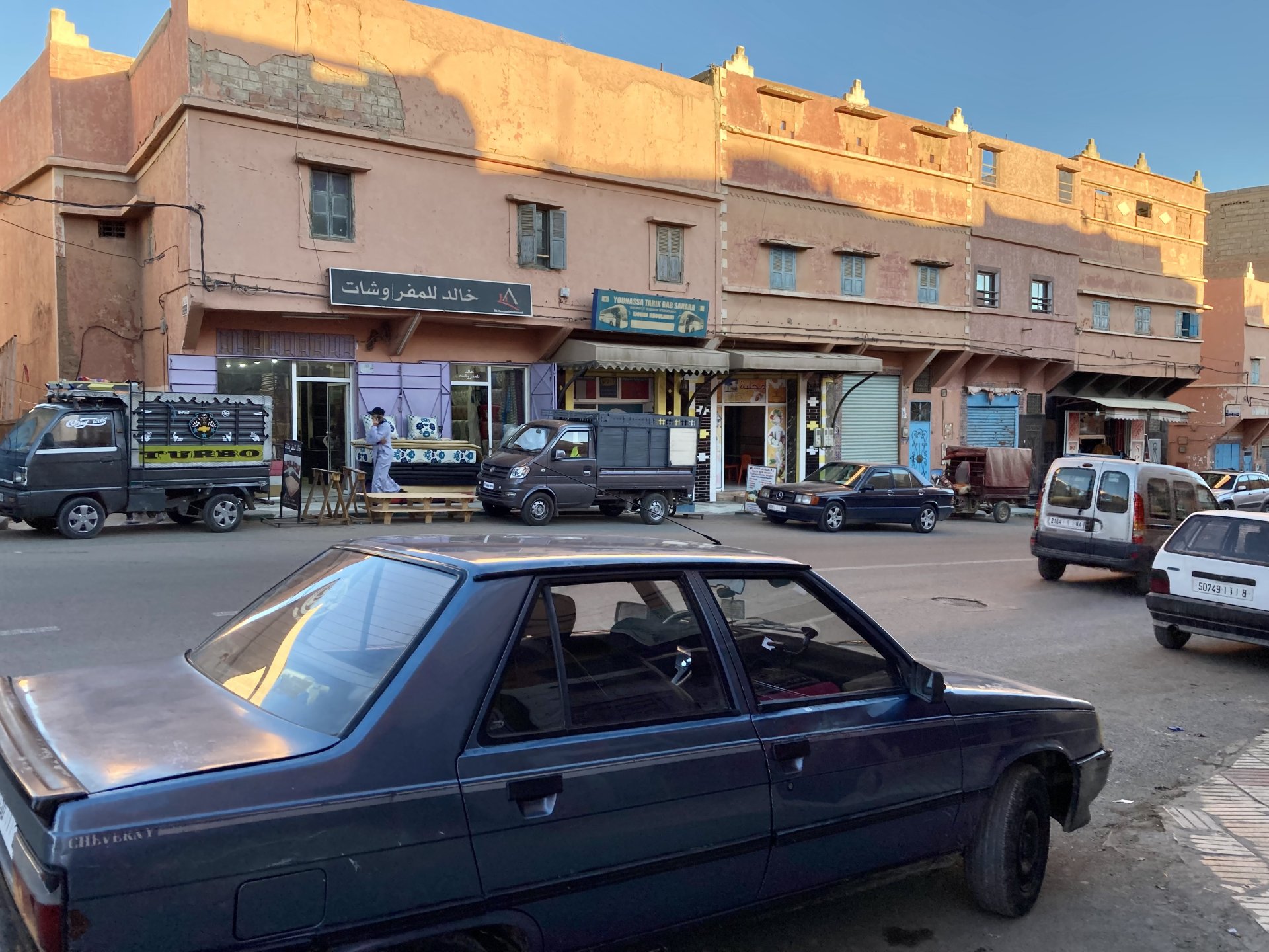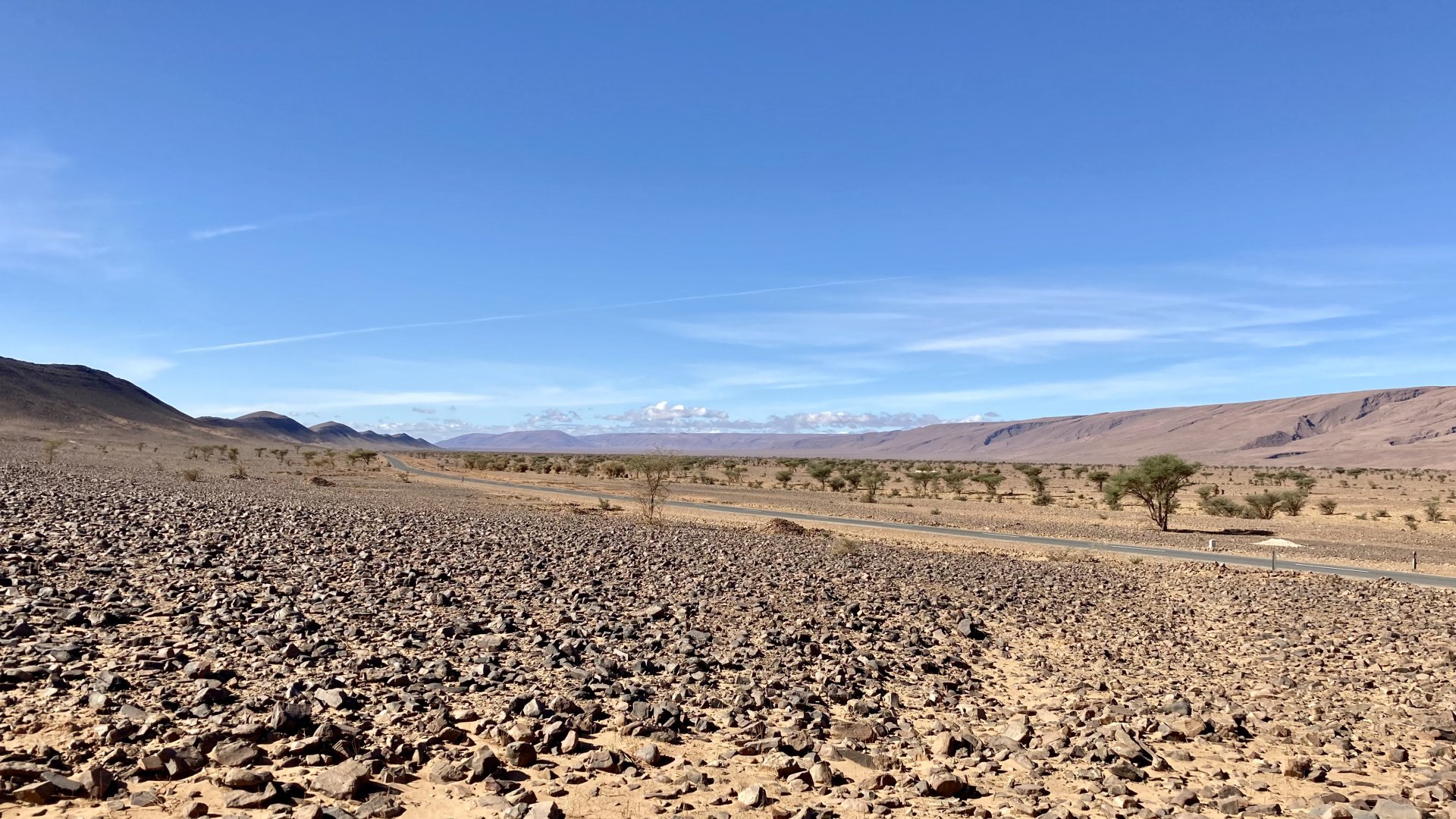 02nd December, Friday, woke up at dawn as soon as the sun cast sufficient light to hit me while still in bed, it's a lovely way to wake up also because here there is no TV, and very little internet to get distracted so you are forced to sleep early taking full advantage of the desert night silence. The previous night I talked a little with the hotel owner, and he told me about an oasis about 6 or 8km into the desert reachable only through proper sand dunes. Some hotels and tour guides have a few tents there and do overnight stays, there is no showers and limited use of water to prevent contamination of the excellent water quality they have there. It takes 1 to 1,5 hours to walk there with camels but only 15 minutes with quads. The silence of the desert night there must be deafening, I am eager to try that, and from what Hassan told me watching the stars there is amazing, extra amazing only though, because right on the edge of the dunes where I was staying you already get more of a clear picture of the universe than anywhere else I've been to. I was tempted to stay another couple of nights, on the night of the 02nd they had no other occupants other than maybe some surprise visitors but then on the 03rd they would be getting a 50 people group, if I were to stay that meant two more nights, and honestly I was worried that might push me too much into December and bad weather. Since I had been getting very lucky with the weather, I made a plan to visit again and next time go on the proper desert on foot or quads, now it's time to go back on the road. Waking up with the Saharan dawn, you can also appreciate desert style insulation on those doors : Bike packed up before breakfast, And again my favourite msmen and coffee for breakfast, while leisurely allowing the sun to rise a little and kill off some of that sand chill that seems to hit you right in the bones. The desert cold feels different than normal cold, during the previous days it got up about 15 and 18º in the afternoon and all the other tourists were freezing as soon as it got near sunset. Considering a group consisting of two Canadians, one Germans, two Swiss, some having flown directly from snow covered locations all exclaimed through an almost hearable teeth rattle that they didn't expect to feel so cold, there must be some truth to that. It does feel colder here. By 08:45 or 9, I rode off with a satisfying wheelspin, now feeling very confident with my surrounding terrain. My newly found confidence made me feel ecstatic and almost unwilling to leave the area, but it was the right thing to do as too much of that confidence would surely end up with an unpleasant event reminding me I am no Stephane Peterhansel. I decided to take only tarmac roads from here on, the bike having had a pretty good workout already, and also I realized that my luggage is the source of most of the unpleasant rattles I hear when riding on corrugations and proper offroad, I did not feel like carrying a broken luggage case in duct taped plastic bags. Next visit to the desert I will be carrying a different luggage arrangement if indeed the plan is to take more offroad pistes. My eyes were definitely teared up when leaving, it's a special location and I WILL return, I get a very similar feeling here than I used to get at the Nurburgring, both being motorsport locations and both with their own very special ways of biting back if you think you got things covered. After Rissani I stop as soon as the landscape becomes spectacular, and one last time try to find a fossil to take home. After 10 minutes looking I give up, say my farewells to Erg Chebbi and move on. I had a big day ahead, and from then on almost didn't stop through the day. I was headed southwest and planned on going past Zagora, to Tata an then Guelmim. Look it up on google maps, it's interesting terrain of wide open landscapes and mountains. No plan where to sleep, that would be tended to by mid afternoon depending on where I got to, riding at night with this cold wasn't on the plans. Acacia trees start to dot the landscape, and it definitely feels like Africa now. Stopped to have a sip of water, and ended up taking my knife to the plastic water bottle to cut it in half and provide three skinny dogs with some refreshment. They were cautious of me but as soon as I walked to a safe distance they slurped it down, no more water with me now, but I knew there would be plenty of towns ahead. Tissint is a pretty location, I remember that on a previous trip I was also surprised at how much water there was there. Stopped just enough to get a couple of pictures, and made way, this was a day for covering distance. Went past Zagora with just one stop to fuel up the bike, and rode on making it to Tata at around 16:00. I had passed by where before me and Maria had reached to stay for the night, but that was riding at much more of a leisurely pace, now I had a conundrum, either ride on and get cold in one or one and a half hours, or stay here and relax. Tata has an authentic vibe to it, no tourists, no Europeans either it seemed, and no touts. In fact nobody seemed to give a shit about me except for kids who always wave at a big motorcycle, so I stayed. Stopped on town entrance to eat something, a croissant and some yogurt, and check on booking.com and arrange for shelter. Don't know how to name that sweet by the croissant on the picture, but if you're ever in Morocco do ask for them by pointing, they're very cinnamony inside and absolutely decadent. I found a comfy and cheap place to stay, in a one single person bed bedroom, something I haven't seen in ages anywhere, but it had just been renovated and had amazing water pressure in the hot shower, something you really value after staying in the desert. By 17:30 I go to the bar to get a bottle of water and notice people are watching the world cup and drinking beer, not being my first choice on a regular day I promptly order a Heineken, and the bar tender is a little shoc