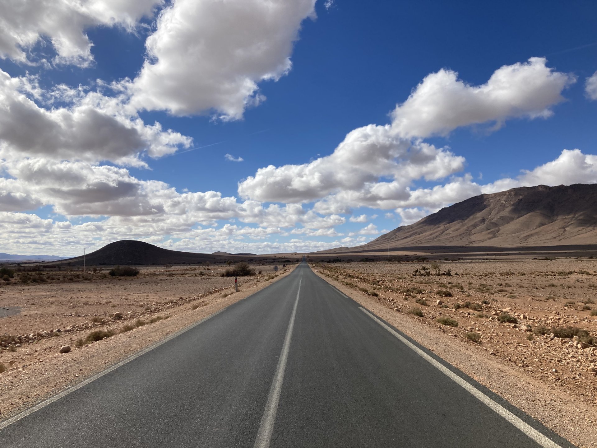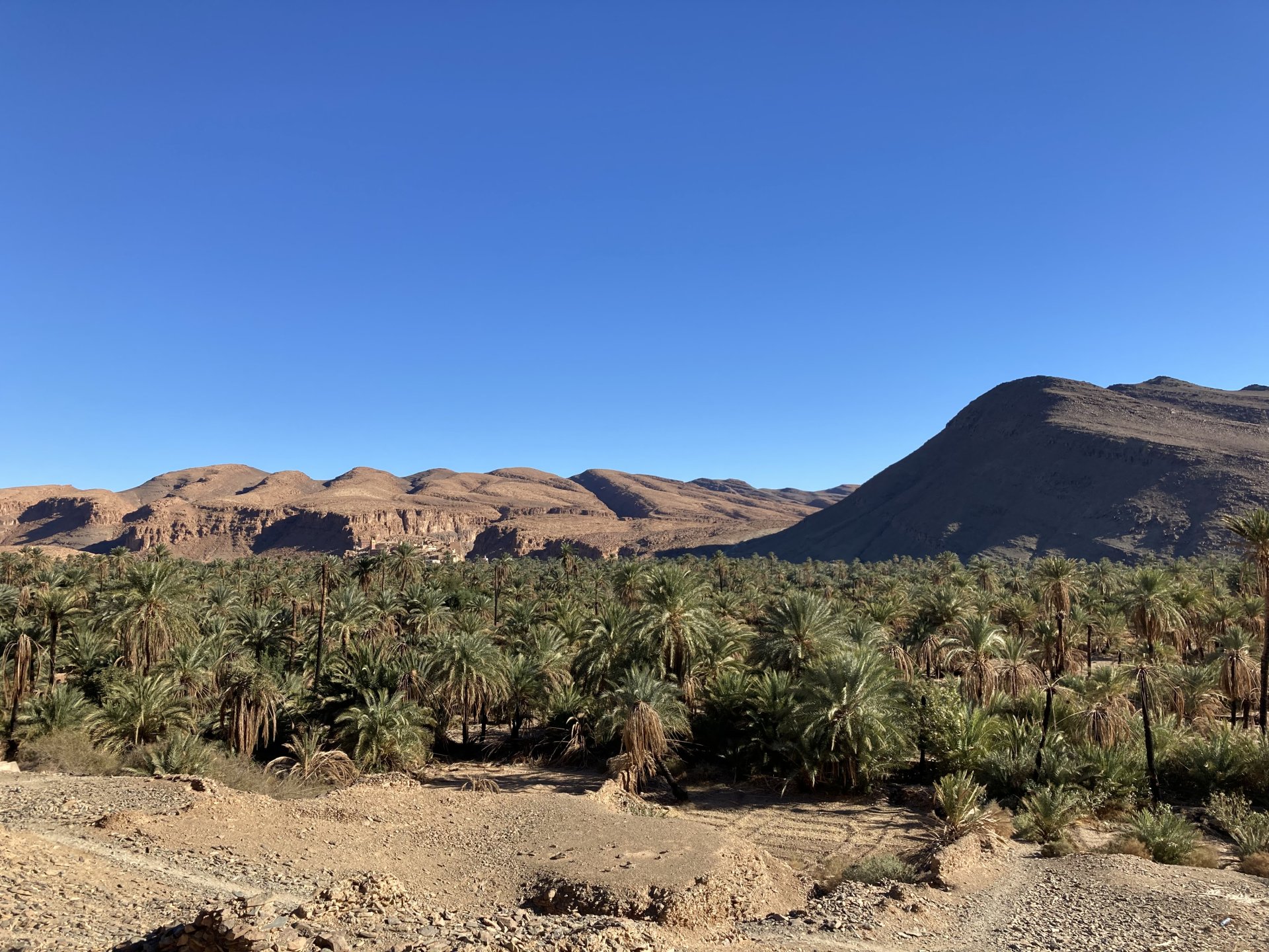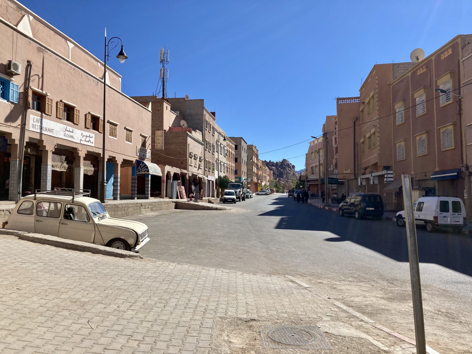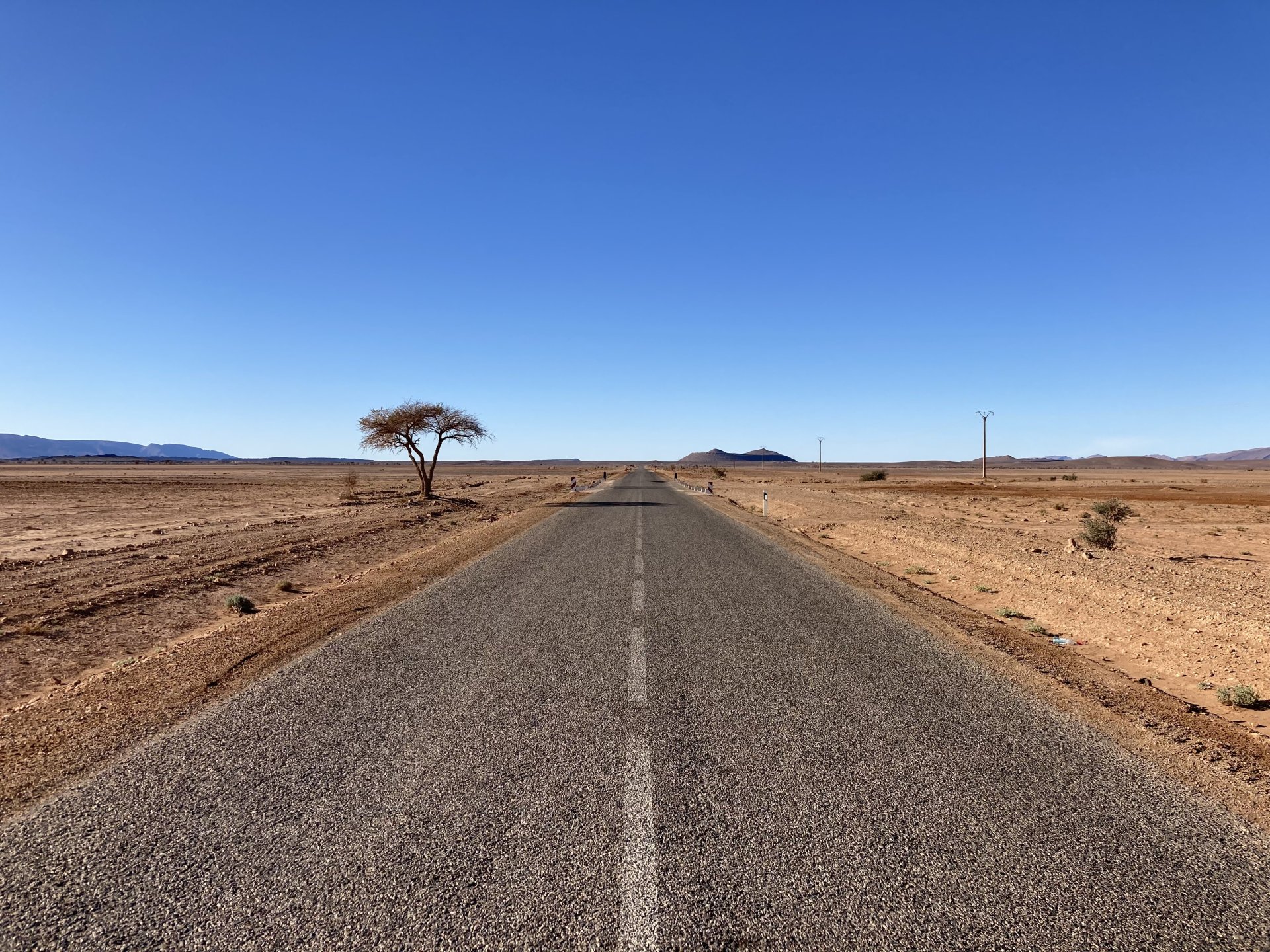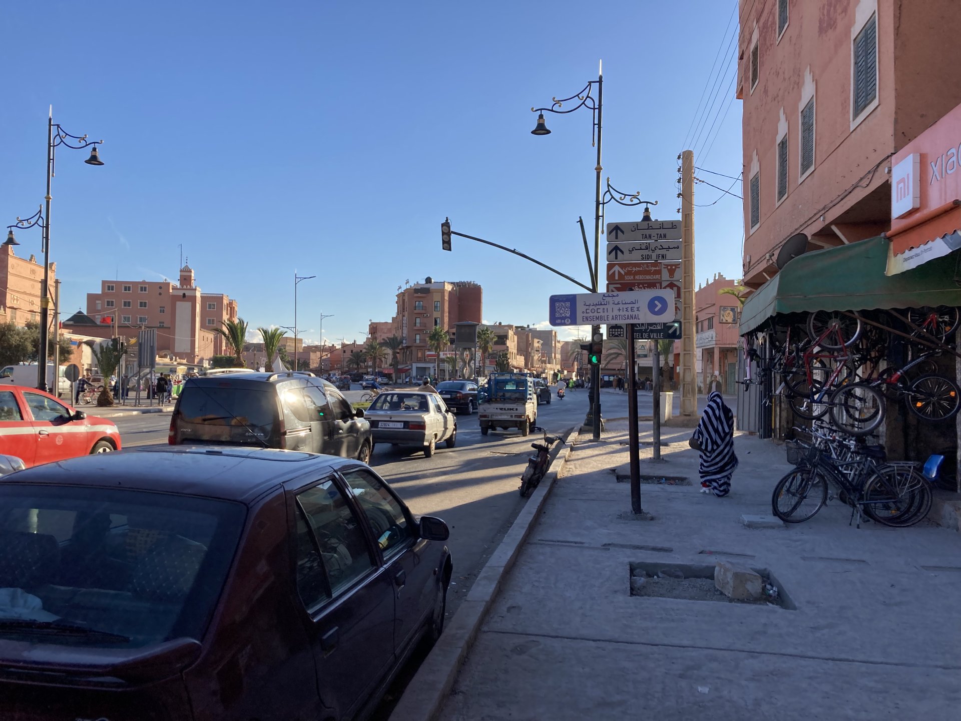 02nd December, Friday, woke up at dawn as soon as the sun cast sufficient light to hit me while still in bed, it's a lovely way to wake up also because here there is no TV, and very little internet to get distracted so you are forced to sleep early taking full advantage of the desert night silence. The previous night I talked a little with the hotel owner, and he told me about an oasis about 6 or 8km into the desert reachable only through proper sand dunes. Some hotels and tour guides have a few tents there and do overnight stays, there is no showers and limited use of water to prevent contamination of the excellent water quality they have there. It takes 1 to 1,5 hours to walk there with camels but only 15 minutes with quads. The silence of the desert night there must be deafening, I am eager to try that, and from what Hassan told me watching the stars there is amazing, extra amazing only though, because right on the edge of the dunes where I was staying you already get more of a clear picture of the universe than anywhere else I've been to. I was tempted to stay another couple of nights, on the night of the 02nd they had no other occupants other than maybe some surprise visitors but then on the 03rd they would be getting a 50 people group, if I were to stay that meant two more nights, and honestly I was worried that might push me too much into December and bad weather. Since I had been getting very lucky with the weather, I made a plan to visit again and next time go on the proper desert on foot or quads, now it's time to go back on the road. Waking up with the Saharan dawn, you can also appreciate desert style insulation on those doors : Bike packed up before breakfast, And again my favourite msmen and coffee for breakfast, while leisurely allowing the sun to rise a little and kill off some of that sand chill that seems to hit you right in the bones. The desert cold feels different than normal cold, during the previous days it got up about 15 and 18º in the afternoon and all the other tourists were freezing as soon as it got near sunset. Considering a group consisting of two Canadians, one Germans, two Swiss, some having flown directly from snow covered locations all exclaimed through an almost hearable teeth rattle that they didn't expect to feel so cold, there must be some truth to that. It does feel colder here. By 08:45 or 9, I rode off with a satisfying wheelspin, now feeling very confident with my surrounding terrain. My newly found confidence made me feel ecstatic and almost unwilling to leave the area, but it was the right thing to do as too much of that confidence would surely end up with an unpleasant event reminding me I am no Stephane Peterhansel. I decided to take only tarmac roads from here on, the bike having had a pretty good workout already, and also I realized that my luggage is the source of most of the unpleasant rattles I hear when riding on corrugations and proper offroad, I did not feel like carrying a broken luggage case in duct taped plastic bags. Next visit to the desert I will be carrying a different luggage arrangement if indeed the plan is to take more offroad pistes. My eyes were definitely teared up when leaving, it's a special location and I WILL return, I get a very similar feeling here than I used to get at the Nurburgring, both being motorsport locations and both with their own very special ways of biting back if you think you got things covered. After Rissani I stop as soon as the landscape becomes spectacular, and one last time try to find a fossil to take home. After 10 minutes looking I give up, say my farewells to Erg Chebbi and move on. I had a big day ahead, and from then on almost didn't stop through the day. I was headed southwest and planned on going past Zagora, to Tata an then Guelmim. Look it up on google maps, it's interesting terrain of wide open landscapes and mountains. No plan where to sleep, that would be tended to by mid afternoon depending on where I got to, riding at night with this cold wasn't on the plans. Acacia trees start to dot the landscape, and it definitely feels like Africa now. Stopped to have a sip of water, and ended up taking my knife to the plastic water bottle to cut it in half and provide three skinny dogs with some refreshment. They were cautious of me but as soon as I walked to a safe distance they slurped it down, no more water with me now, but I knew there would be plenty of towns ahead. Tissint is a pretty location, I remember that on a previous trip I was also surprised at how much water there was there. Stopped just enough to get a couple of pictures, and made way, this was a day for covering distance. Went past Zagora with just one stop to fuel up the bike, and rode on making it to Tata at around 16:00. I had passed by where before me and Maria had reached to stay for the night, but that was riding at much more of a leisurely pace, now I had a conundrum, either ride on and get cold in one or one and a half hours, or stay here and relax. Tata has an authentic vibe to it, no tourists, no Europeans either it seemed, and no touts. In fact nobody seemed to give a shit about me except for kids who always wave at a big motorcycle, so I stayed. Stopped on town entrance to eat something, a croissant and some yogurt, and check on booking.com and arrange for shelter. Don't know how to name that sweet by the croissant on the picture, but if you're ever in Morocco do ask for them by pointing, they're very cinnamony inside and absolutely decadent. I found a comfy and cheap place to stay, in a one single person bed bedroom, something I haven't seen in ages anywhere, but it had just been renovated and had amazing water pressure in the hot shower, something you really value after staying in the desert. By 17:30 I go to the bar to get a bottle of water and notice people are watching the world cup and drinking beer, not being my first choice on a regular day I promptly order a Heineken, and the bar tender is a little shoc