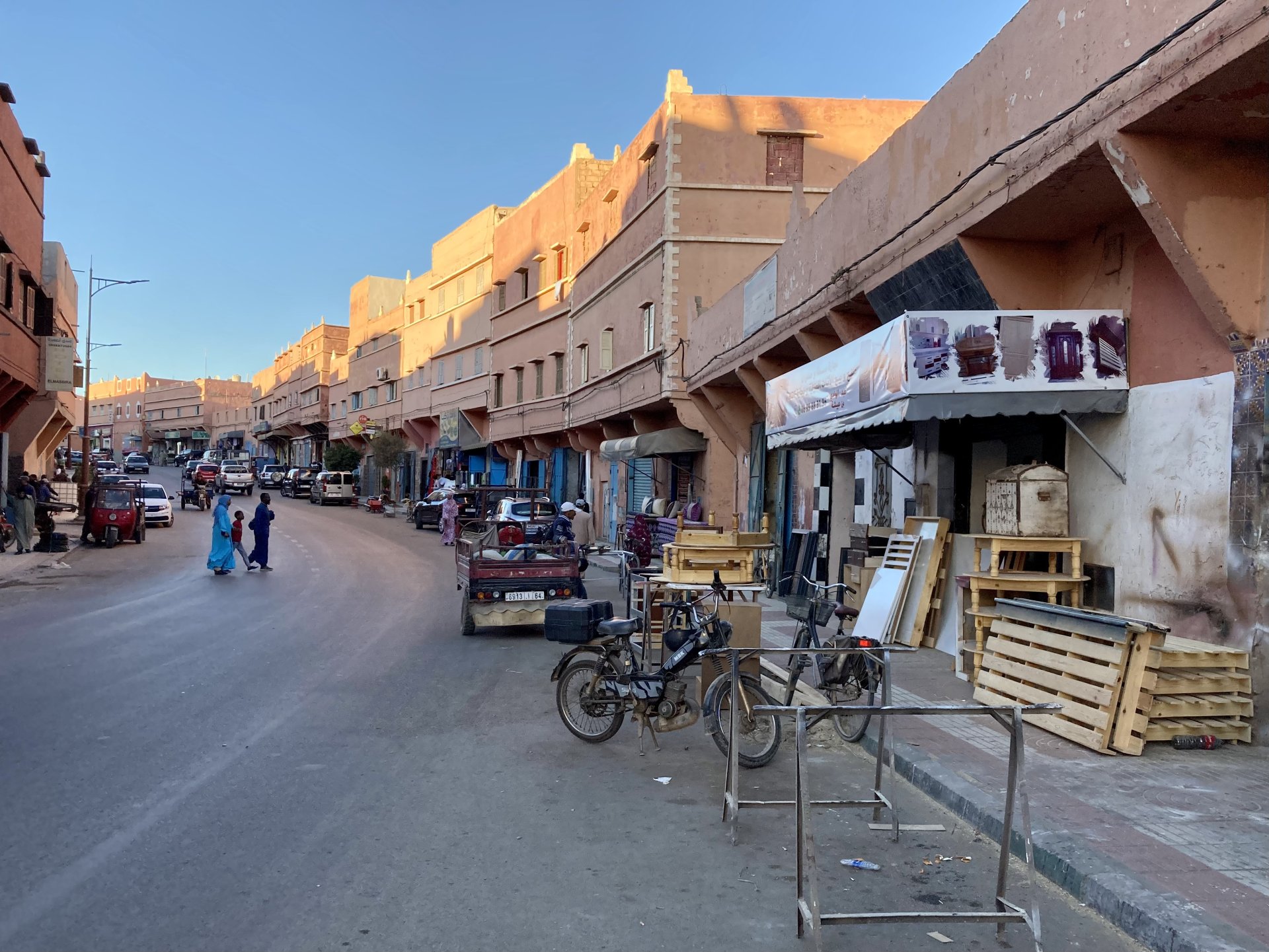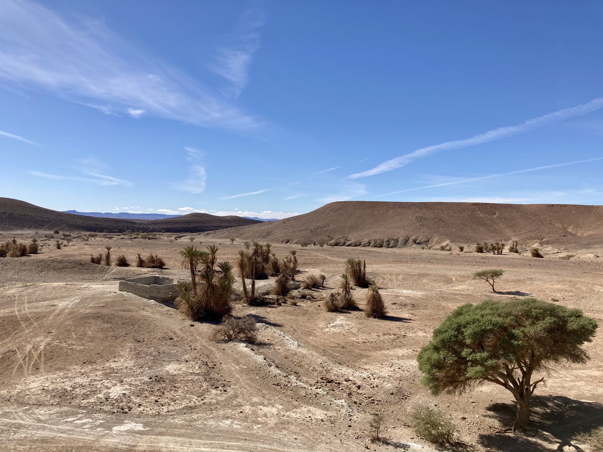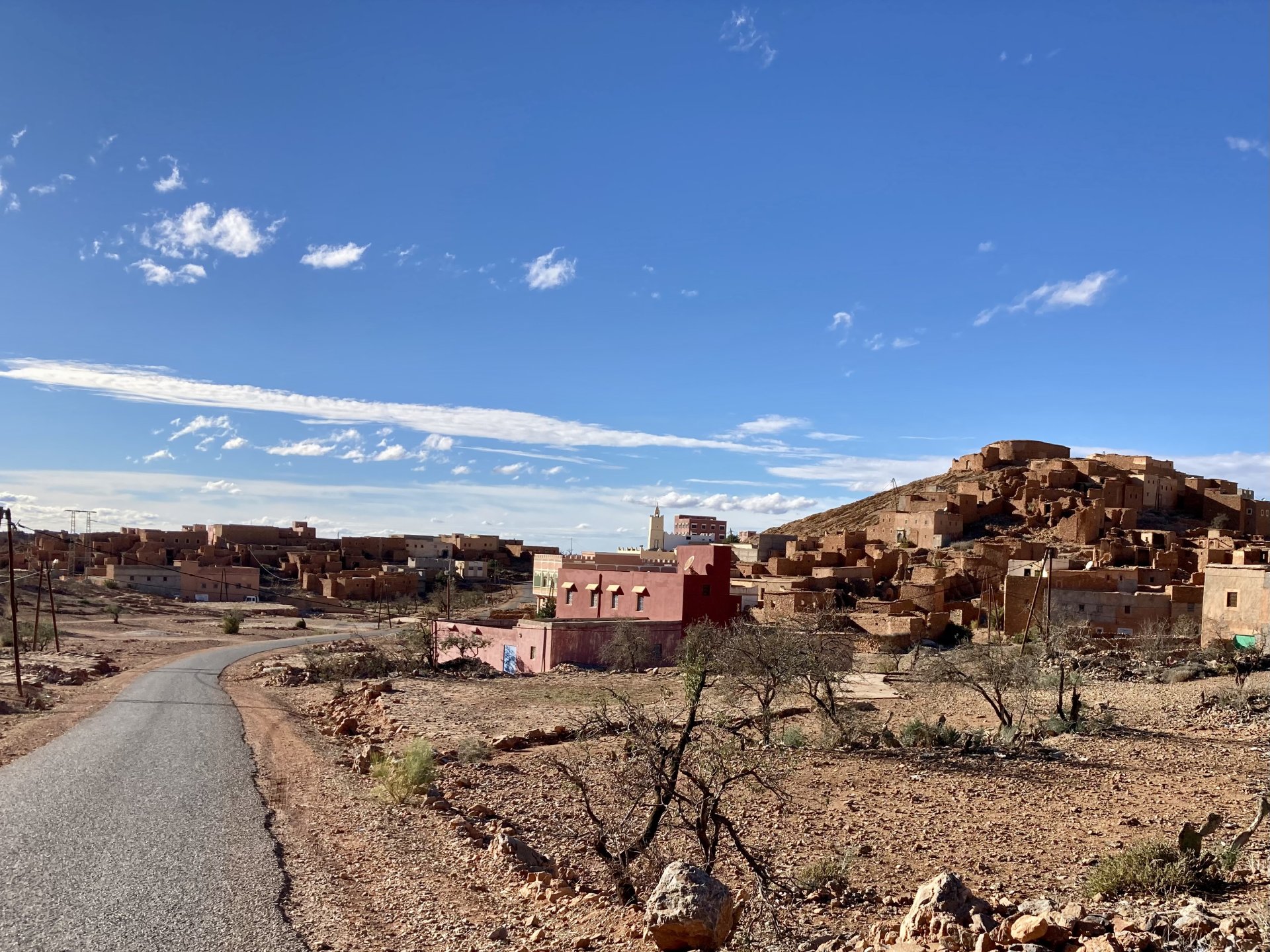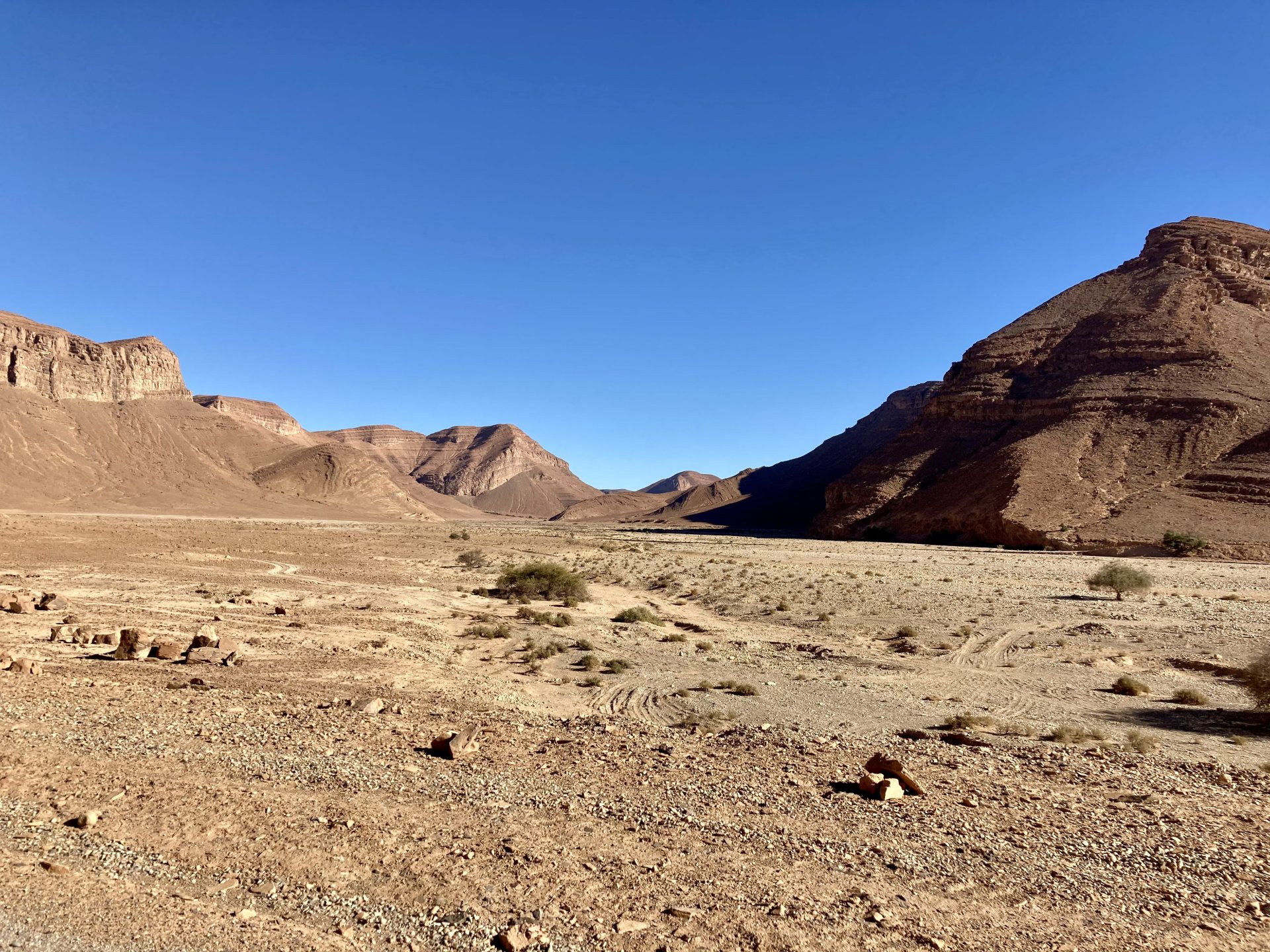 02nd December, Friday, woke up at dawn as soon as the sun cast sufficient light to hit me while still in bed, it's a lovely way to wake up also because here there is no TV, and very little internet to get distracted so you are forced to sleep early taking full advantage of the desert night silence. The previous night I talked a little with the hotel owner, and he told me about an oasis about 6 or 8km into the desert reachable only through proper sand dunes. Some hotels and tour guides have a few tents there and do overnight stays, there is no showers and limited use of water to prevent contamination of the excellent water quality they have there. It takes 1 to 1,5 hours to walk there with camels but only 15 minutes with quads. The silence of the desert night there must be deafening, I am eager to try that, and from what Hassan told me watching the stars there is amazing, extra amazing only though, because right on the edge of the dunes where I was staying you already get more of a clear picture of the universe than anywhere else I've been to. I was tempted to stay another couple of nights, on the night of the 02nd they had no other occupants other than maybe some surprise visitors but then on the 03rd they would be getting a 50 people group, if I were to stay that meant two more nights, and honestly I was worried that might push me too much into December and bad weather. Since I had been getting very lucky with the weather, I made a plan to visit again and next time go on the proper desert on foot or quads, now it's time to go back on the road. Waking up with the Saharan dawn, you can also appreciate desert style insulation on those doors : Bike packed up before breakfast, And again my favourite msmen and coffee for breakfast, while leisurely allowing the sun to rise a little and kill off some of that sand chill that seems to hit you right in the bones. The desert cold feels different than normal cold, during the previous days it got up about 15 and 18º in the afternoon and all the other tourists were freezing as soon as it got near sunset. Considering a group consisting of two Canadians, one Germans, two Swiss, some having flown directly from snow covered locations all exclaimed through an almost hearable teeth rattle that they didn't expect to feel so cold, there must be some truth to that. It does feel colder here. By 08:45 or 9, I rode off with a satisfying wheelspin, now feeling very confident with my surrounding terrain. My newly found confidence made me feel ecstatic and almost unwilling to leave the area, but it was the right thing to do as too much of that confidence would surely end up with an unpleasant event reminding me I am no Stephane Peterhansel. I decided to take only tarmac roads from here on, the bike having had a pretty good workout already, and also I realized that my luggage is the source of most of the unpleasant rattles I hear when riding on corrugations and proper offroad, I did not feel like carrying a broken luggage case in duct taped plastic bags. Next visit to the desert I will be carrying a different luggage arrangement if indeed the plan is to take more offroad pistes. My eyes were definitely teared up when leaving, it's a special location and I WILL return, I get a very similar feeling here than I used to get at the Nurburgring, both being motorsport locations and both with their own very special ways of biting back if you think you got things covered. After Rissani I stop as soon as the landscape becomes spectacular, and one last time try to find a fossil to take home. After 10 minutes looking I give up, say my farewells to Erg Chebbi and move on. I had a big day ahead, and from then on almost didn't stop through the day. I was headed southwest and planned on going past Zagora, to Tata an then Guelmim. Look it up on google maps, it's interesting terrain of wide open landscapes and mountains. No plan where to sleep, that would be tended to by mid afternoon depending on where I got to, riding at night with this cold wasn't on the plans. Acacia trees start to dot the landscape, and it definitely feels like Africa now. Stopped to have a sip of water, and ended up taking my knife to the plastic water bottle to cut it in half and provide three skinny dogs with some refreshment. They were cautious of me but as soon as I walked to a safe distance they slurped it down, no more water with me now, but I knew there would be plenty of towns ahead. Tissint is a pretty location, I remember that on a previous trip I was also surprised at how much water there was there. Stopped just enough to get a couple of pictures, and made way, this was a day for covering distance. Went past Zagora with just one stop to fuel up the bike, and rode on making it to Tata at around 16:00. I had passed by where before me and Maria had reached to stay for the night, but that was riding at much more of a leisurely pace, now I had a conundrum, either ride on and get cold in one or one and a half hours, or stay here and relax. Tata has an authentic vibe to it, no tourists, no Europeans either it seemed, and no touts. In fact nobody seemed to give a shit about me except for kids who always wave at a big motorcycle, so I stayed. Stopped on town entrance to eat something, a croissant and some yogurt, and check on booking.com and arrange for shelter. Don't know how to name that sweet by the croissant on the picture, but if you're ever in Morocco do ask for them by pointing, they're very cinnamony inside and absolutely decadent. I found a comfy and cheap place to stay, in a one single person bed bedroom, something I haven't seen in ages anywhere, but it had just been renovated and had amazing water pressure in the hot shower, something you really value after staying in the desert. By 17:30 I go to the bar to get a bottle of water and notice people are watching the world cup and drinking beer, not being my first choice on a regular day I promptly order a Heineken, and the bar tender is a little shoc