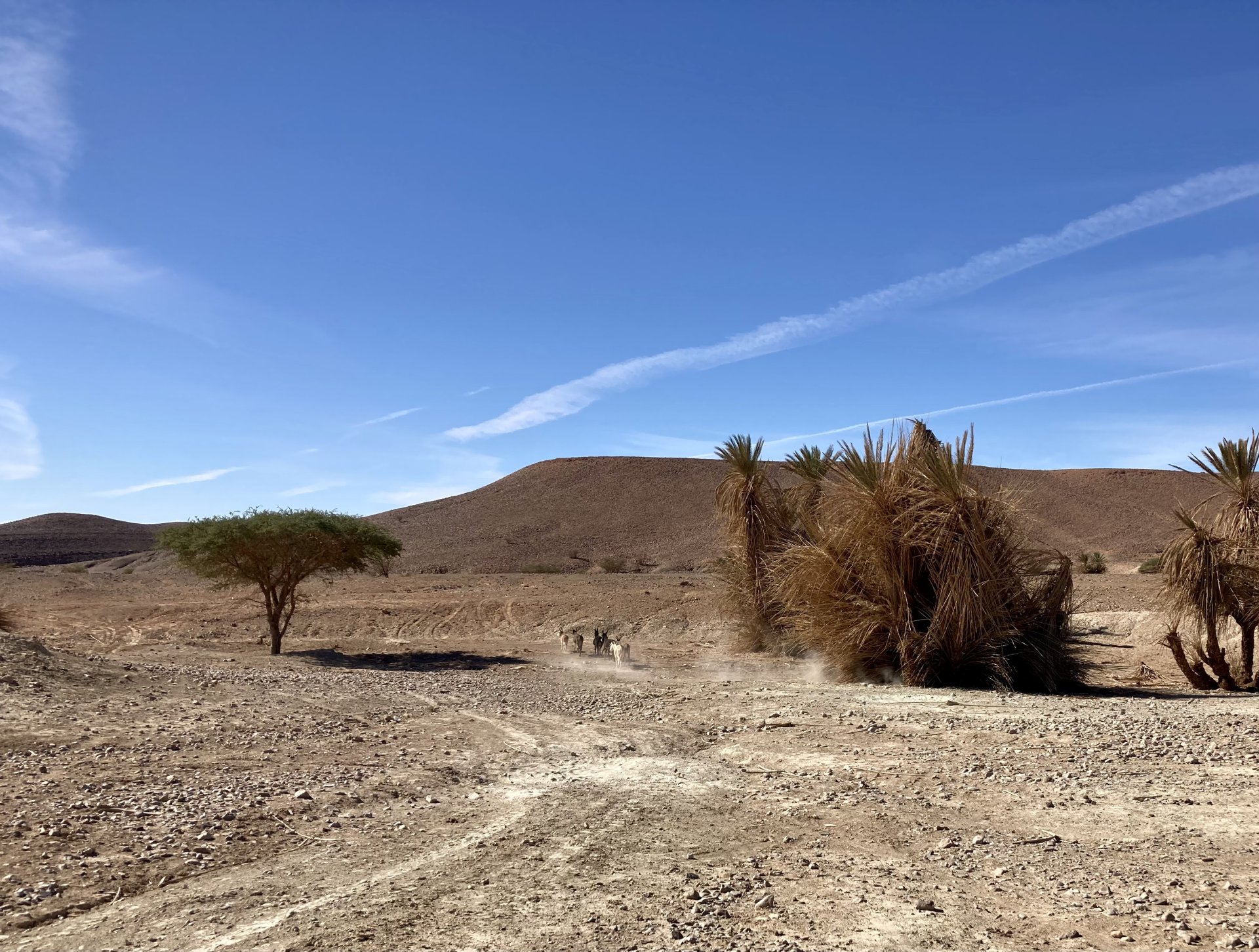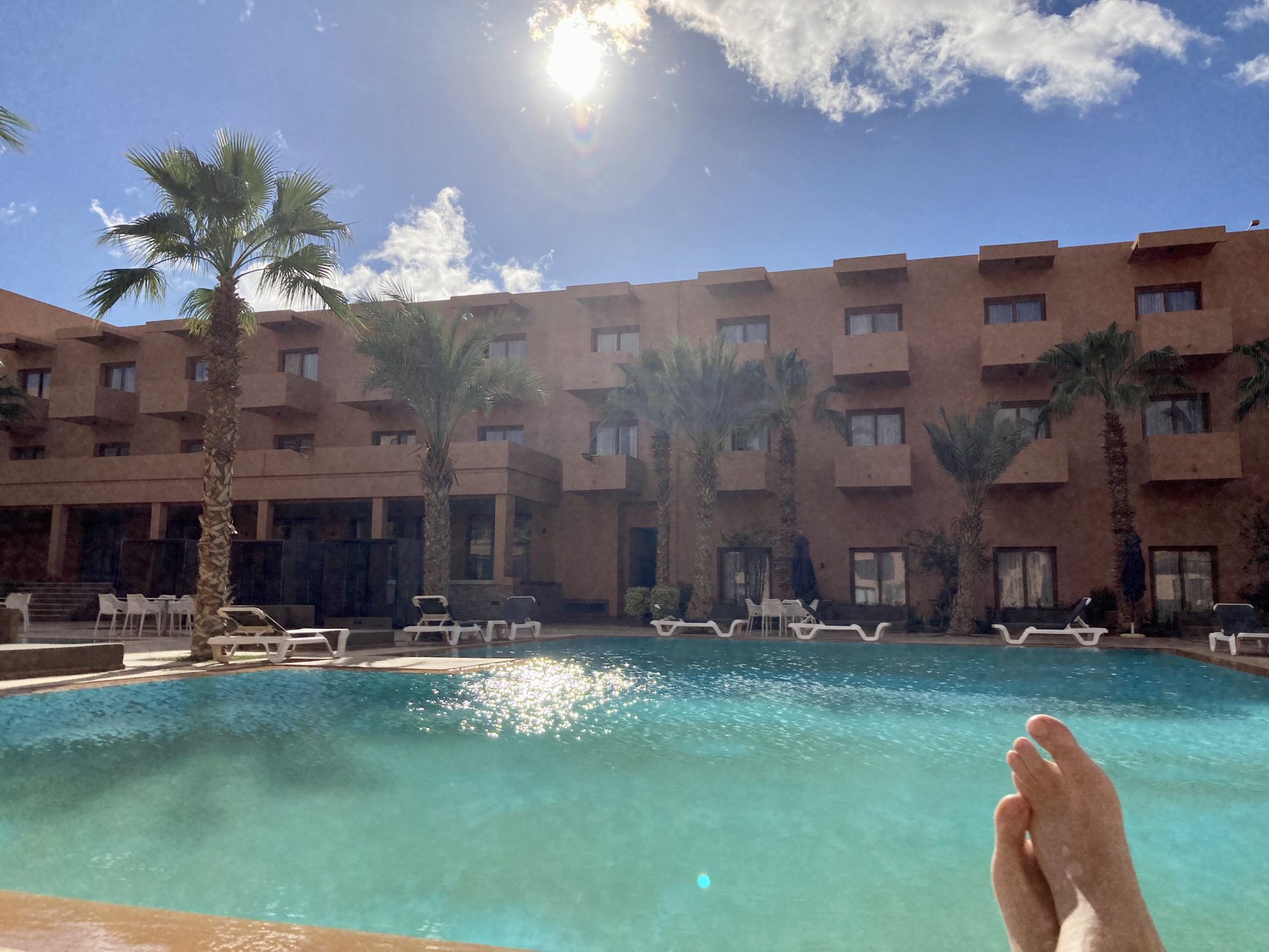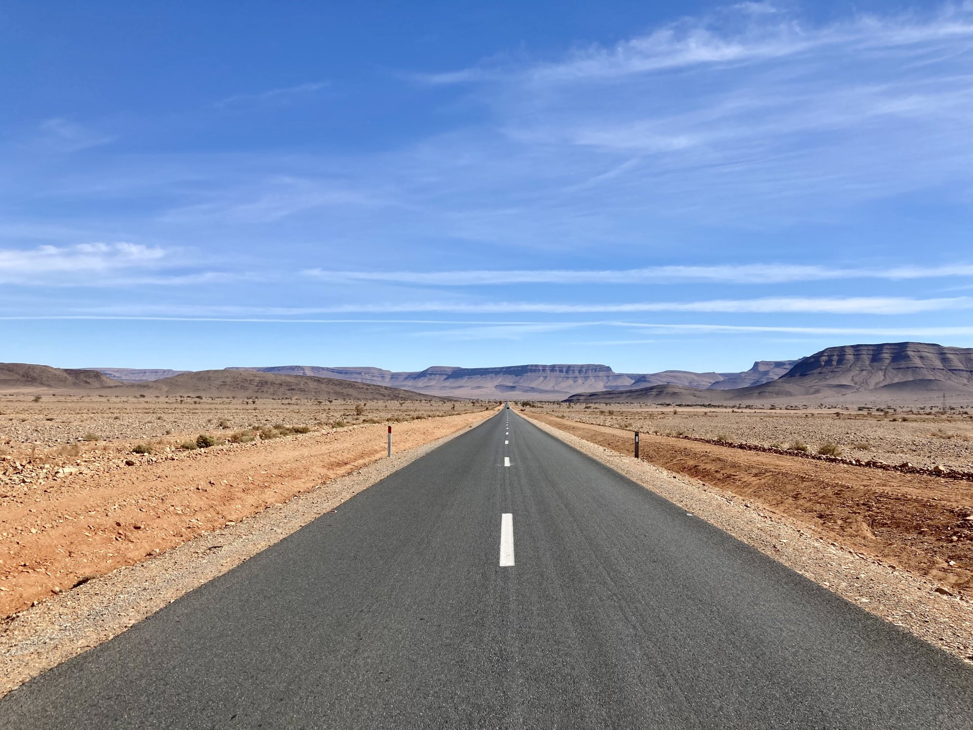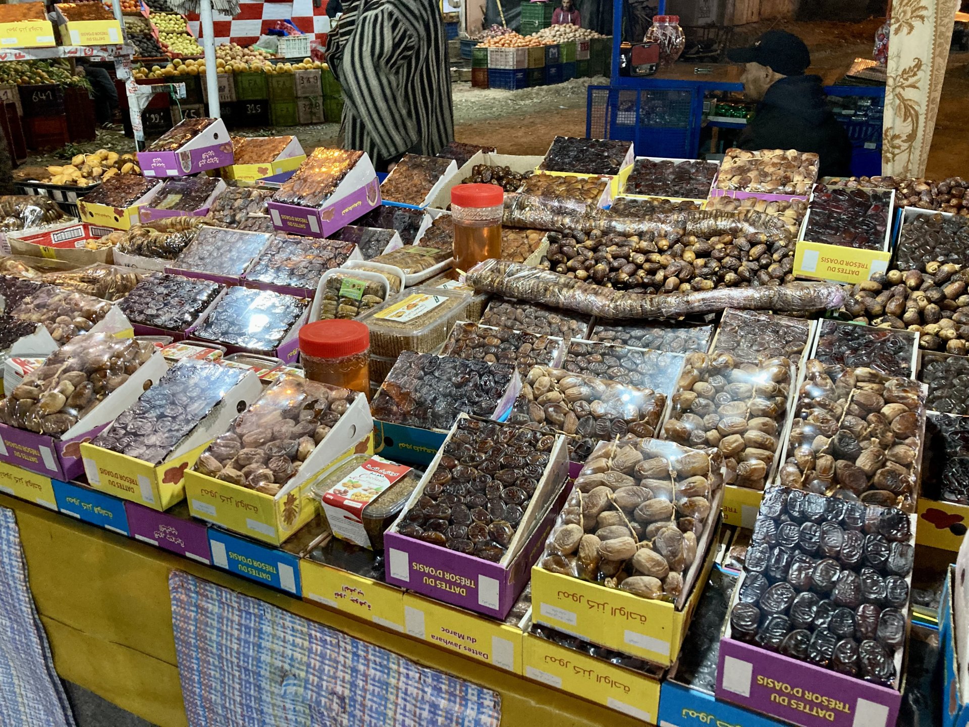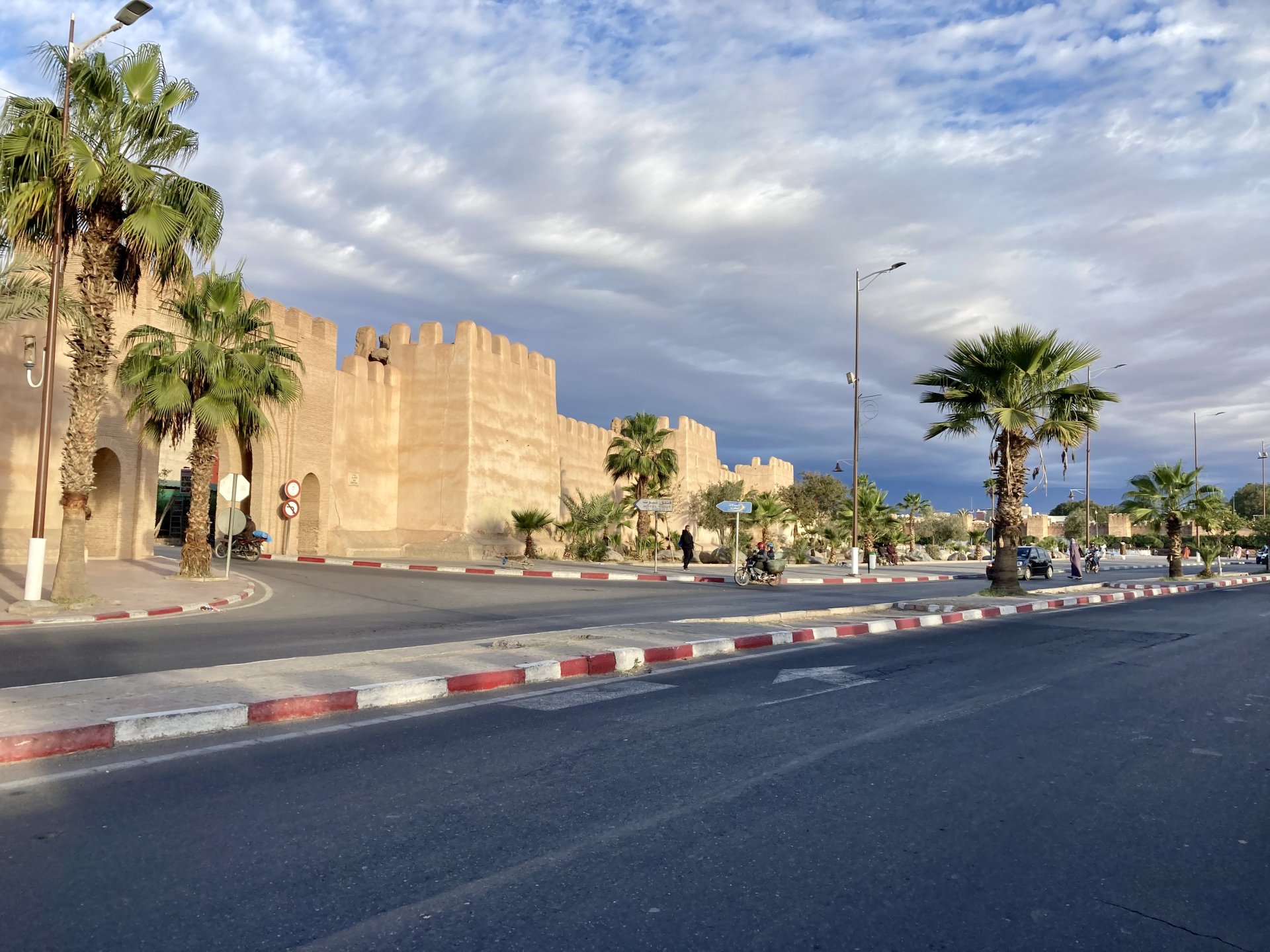 02nd December, Friday, woke up at dawn as soon as the sun cast sufficient light to hit me while still in bed, it's a lovely way to wake up also because here there is no TV, and very little internet to get distracted so you are forced to sleep early taking full advantage of the desert night silence. The previous night I talked a little with the hotel owner, and he told me about an oasis about 6 or 8km into the desert reachable only through proper sand dunes. Some hotels and tour guides have a few tents there and do overnight stays, there is no showers and limited use of water to prevent contamination of the excellent water quality they have there. It takes 1 to 1,5 hours to walk there with camels but only 15 minutes with quads. The silence of the desert night there must be deafening, I am eager to try that, and from what Hassan told me watching the stars there is amazing, extra amazing only though, because right on the edge of the dunes where I was staying you already get more of a clear picture of the universe than anywhere else I've been to. I was tempted to stay another couple of nights, on the night of the 02nd they had no other occupants other than maybe some surprise visitors but then on the 03rd they would be getting a 50 people group, if I were to stay that meant two more nights, and honestly I was worried that might push me too much into December and bad weather. Since I had been getting very lucky with the weather, I made a plan to visit again and next time go on the proper desert on foot or quads, now it's time to go back on the road. Waking up with the Saharan dawn, you can also appreciate desert style insulation on those doors : Bike packed up before breakfast, And again my favourite msmen and coffee for breakfast, while leisurely allowing the sun to rise a little and kill off some of that sand chill that seems to hit you right in the bones. The desert cold feels different than normal cold, during the previous days it got up about 15 and 18º in the afternoon and all the other tourists were freezing as soon as it got near sunset. Considering a group consisting of two Canadians, one Germans, two Swiss, some having flown directly from snow covered locations all exclaimed through an almost hearable teeth rattle that they didn't expect to feel so cold, there must be some truth to that. It does feel colder here. By 08:45 or 9, I rode off with a satisfying wheelspin, now feeling very confident with my surrounding terrain. My newly found confidence made me feel ecstatic and almost unwilling to leave the area, but it was the right thing to do as too much of that confidence would surely end up with an unpleasant event reminding me I am no Stephane Peterhansel. I decided to take only tarmac roads from here on, the bike having had a pretty good workout already, and also I realized that my luggage is the source of most of the unpleasant rattles I hear when riding on corrugations and proper offroad, I did not feel like carrying a broken luggage case in duct taped plastic bags. Next visit to the desert I will be carrying a different luggage arrangement if indeed the plan is to take more offroad pistes. My eyes were definitely teared up when leaving, it's a special location and I WILL return, I get a very similar feeling here than I used to get at the Nurburgring, both being motorsport locations and both with their own very special ways of biting back if you think you got things covered. After Rissani I stop as soon as the landscape becomes spectacular, and one last time try to find a fossil to take home. After 10 minutes looking I give up, say my farewells to Erg Chebbi and move on. I had a big day ahead, and from then on almost didn't stop through the day. I was headed southwest and planned on going past Zagora, to Tata an then Guelmim. Look it up on google maps, it's interesting terrain of wide open landscapes and mountains. No plan where to sleep, that would be tended to by mid afternoon depending on where I got to, riding at night with this cold wasn't on the plans. Acacia trees start to dot the landscape, and it definitely feels like Africa now. Stopped to have a sip of water, and ended up taking my knife to the plastic water bottle to cut it in half and provide three skinny dogs with some refreshment. They were cautious of me but as soon as I walked to a safe distance they slurped it down, no more water with me now, but I knew there would be plenty of towns ahead. Tissint is a pretty location, I remember that on a previous trip I was also surprised at how much water there was there. Stopped just enough to get a couple of pictures, and made way, this was a day for covering distance. Went past Zagora with just one stop to fuel up the bike, and rode on making it to Tata at around 16:00. I had passed by where before me and Maria had reached to stay for the night, but that was riding at much more of a leisurely pace, now I had a conundrum, either ride on and get cold in one or one and a half hours, or stay here and relax. Tata has an authentic vibe to it, no tourists, no Europeans either it seemed, and no touts. In fact nobody seemed to give a shit about me except for kids who always wave at a big motorcycle, so I stayed. Stopped on town entrance to eat something, a croissant and some yogurt, and check on booking.com and arrange for shelter. Don't know how to name that sweet by the croissant on the picture, but if you're ever in Morocco do ask for them by pointing, they're very cinnamony inside and absolutely decadent. I found a comfy and cheap place to stay, in a one single person bed bedroom, something I haven't seen in ages anywhere, but it had just been renovated and had amazing water pressure in the hot shower, something you really value after staying in the desert. By 17:30 I go to the bar to get a bottle of water and notice people are watching the world cup and drinking beer, not being my first choice on a regular day I promptly order a Heineken, and the bar tender is a little shoc
