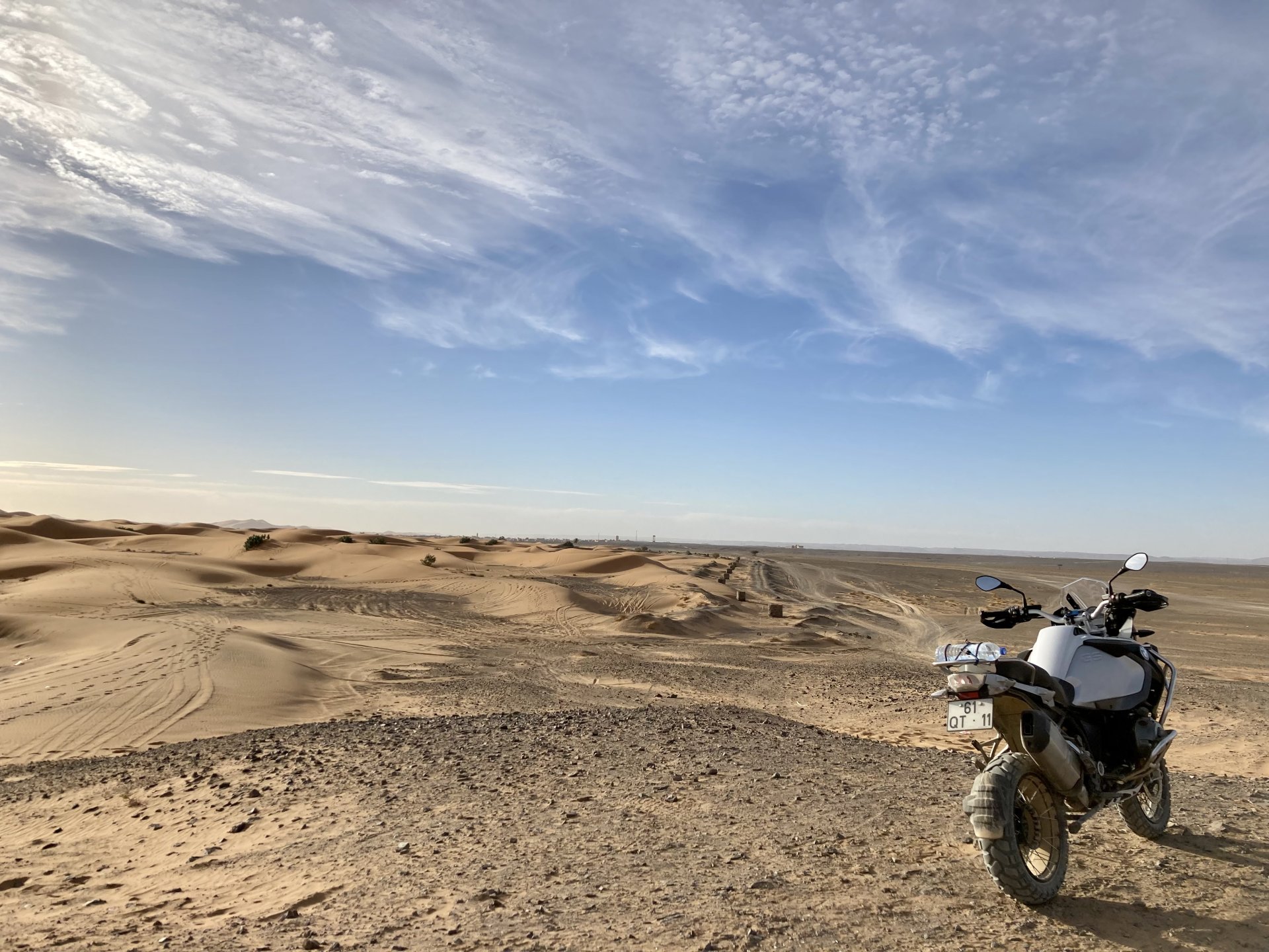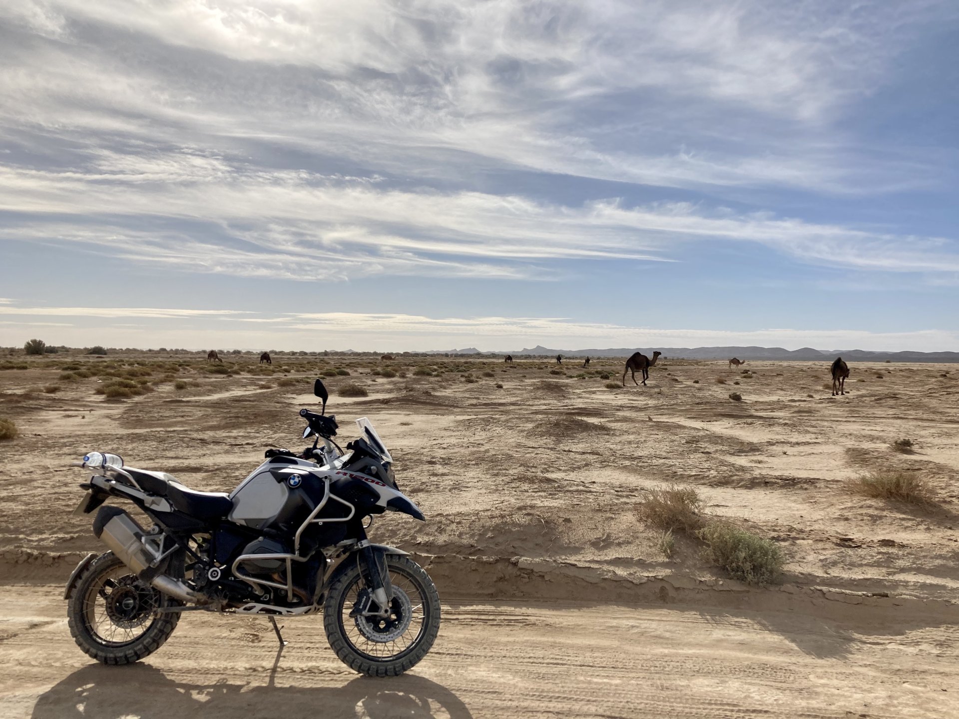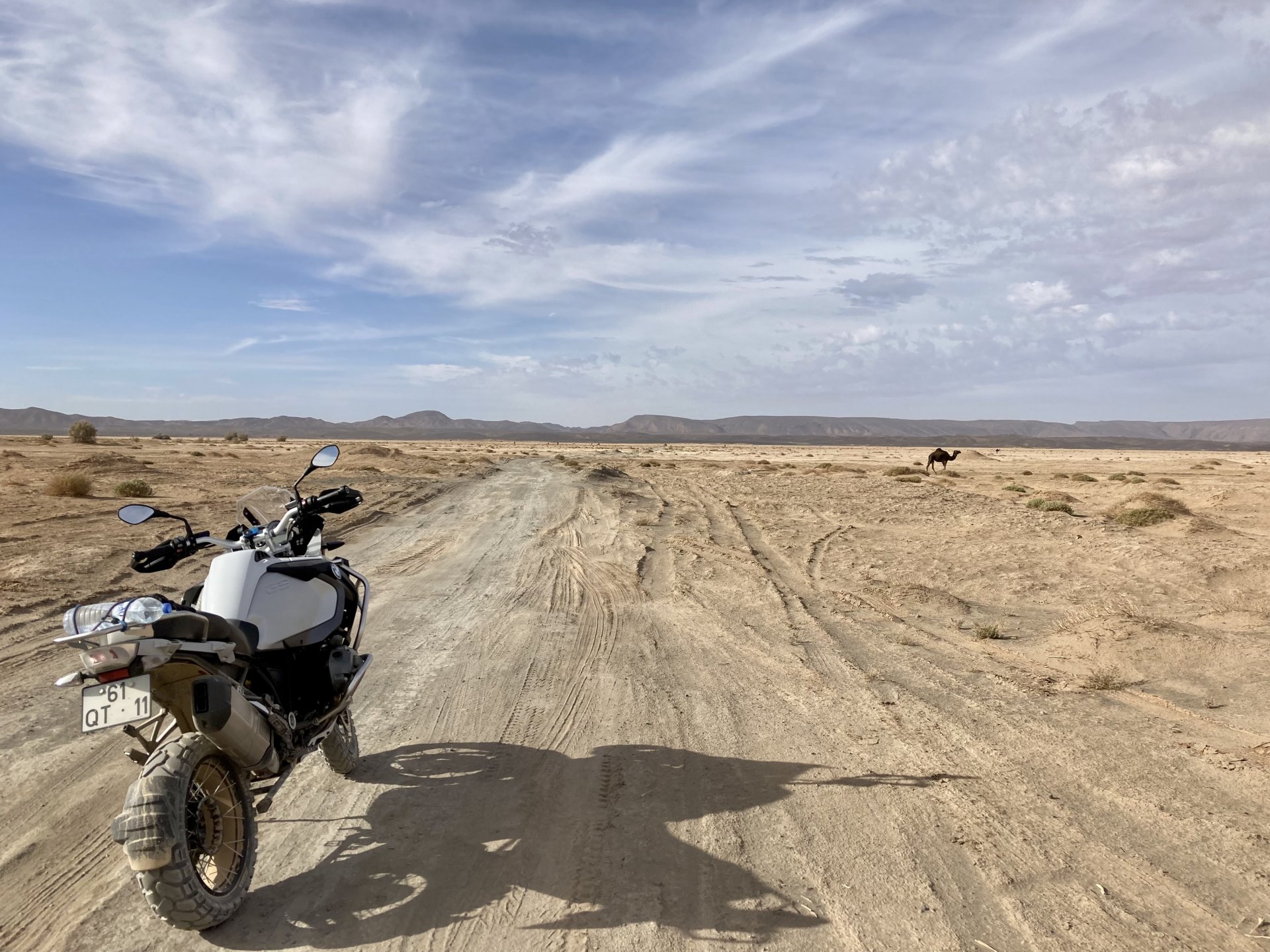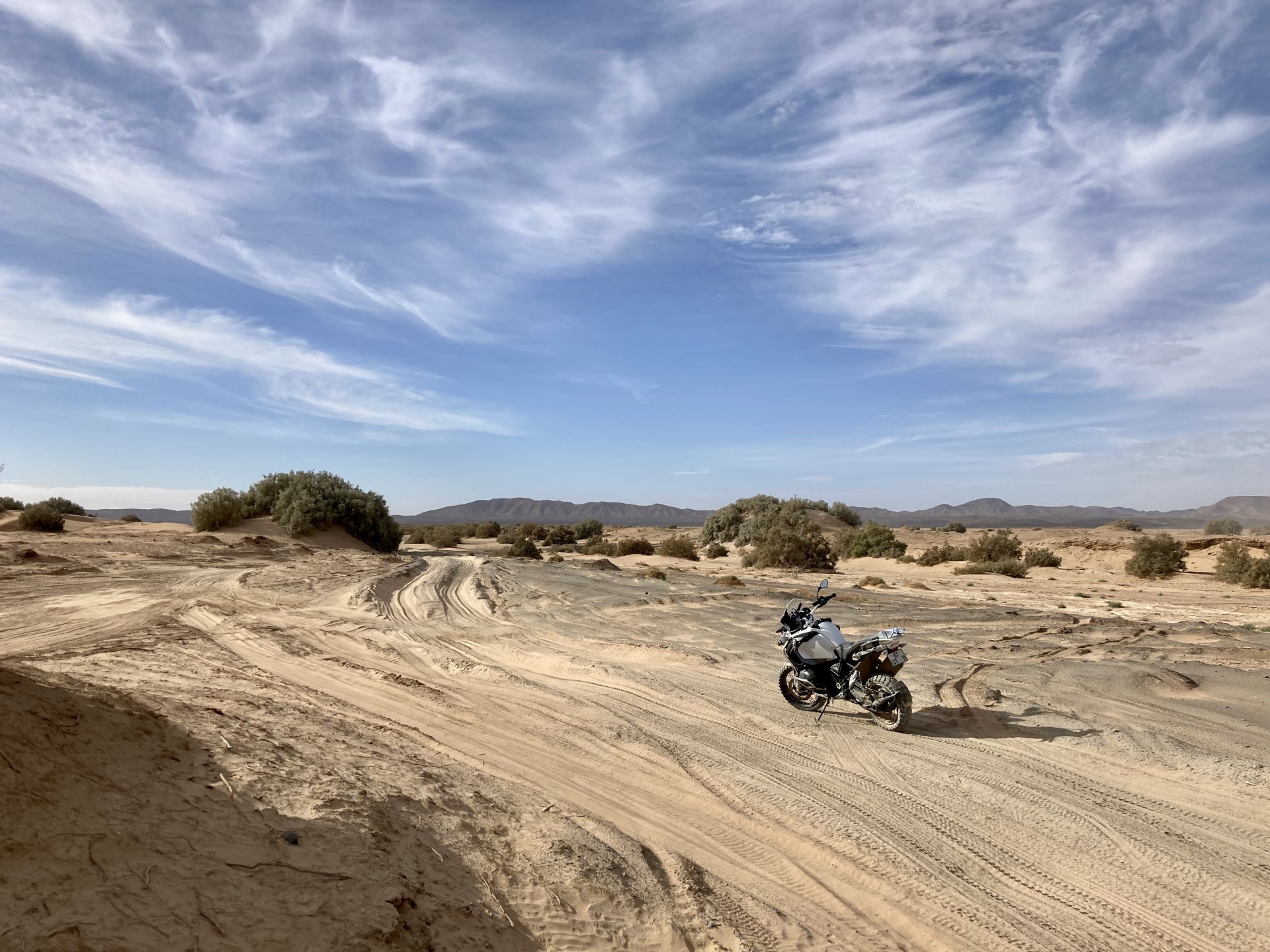 01st December is a national holiday in Portugal, it celebrates the restoration of independence following a period of union between Spain and Portugal. This happened in 1640 and is a pretty big deal for the History of Portugal as a country. This also means that all my clients are closed, and to me that meant that very little had to be done and very little surprise calls arrived. It contributes immensely to letting go of the real world. The day started with my usual berber breakfast of msmen and hot coffee, looking out into the dunes. With nowhere specific to go, I left with the task to ride around enjoying myself and then have lunch somewhere. Not a bad plan to have! The bike was started and traction control turned off, doing that to be able to easily move off from the overnight parking location is something that greatly appeals to me, also the 6 or 7km commute to Merzouga to buy Sofia a souvenir from Morocco without touching tarmac just reinforces that I could live with nice sandy roads instead of tarmac, on my way to Merzouga in the morning: Having done my shopping, I simply went out with a clear heading, away from town and in the general direction of some hills in the distance, I've never been there so as good a destination as any when all you want is to ride around a little. What happened next left me ecstatic, the bike now had a third of it's fuel load and my confidence had increased, this meant I confidently rode through soft sand sections like this oued below, here stopping to choose if taking the left or right paths right it was, and a little further on stopped to look at camels. Camels out roaming by themselves are great, they will completely disregard you as a thing of no importance to their day, and almost in a royal manner glide away with their smooth but effective stride. A later stop to drink water had me spend a few moments looking for fossils, Maria had a neck for finding them right there on the ground whenever we stopped, and I've got a small collection in my kitchen. I, however, am useless at stopping in the right location and managed to not find a single one on this trip, despite a few tries to look around for lost things whenever I stopped in a rocky area. As I am looking around, a curious desert bird decided to inspect my bike, on the pictures below you'll see it firstly floating around the right of the bike and then giving the bmw heated grips a try on the left hand grip: The little bird was scared away when a pickup drove to me and stopped, the driver quickly inviting me for tea at his mine with a big smile, and I accepted, as is only polite to do so. Followed the pickup at a distance so not to eat all of it's dust, and parked up the hill, they were most impressed but then I noticed the chinese bike one of them rode there. The mine owner was driving over with a big pot of stew for the guys' lunch or dinner, and oranges for dessert. At least a few of them sleep there during the week, it is a hard life! Always with a smile and a sense of pride, they showed me their labour, taking out rocks from the holes deep into the rocky hills and then sending them to a plant for extracting the minerals that were after used all over the world I don't know what for. Safety conditions seemed dire, and work was obviously very hard, I was treated to some great mint tea though. With an open invitation to pop by for tea whenever I pleased, I rode away. This time not stopping on any of the locations I previously took pictures of, gliding by with not a single foot on the ground through soft sand and phesh phesh felt great. That fine desert silt feels almost like water sometimes and you can feel it splashing onto the back of your legs like if riding through a deep water puddle. The bike is dragged down and you have to keep powering a little up to not be bogged down. Power too much and you'll gain too much speed and your acceleration is no longer sustainable, power too little and you'll be pulled down, you'll lose momentum and eventually the heavy mass becomes too heavy to control. The GS's boxer is an amazing help to dealing with the bike's weight, at anything over 2500/3000 rpm a quick throttle blip in second/third/fourth in soft sand and you'll power out of mosts things with a smooth amount of wheelspin. It all feels very controlable and confidence inducing, and it's a great high to be on that fine balance. I become lost and go up a hill to find my way back, even on trails it's very easy for me to lose my way around this open terrain. I ride back to Merzouga and stop at an edge of town café for lunch. The turkey grilled was amazingly seasoned, it was a lovely plate of food that I scoffed down at 13:30 after a hunger inducing morning on the bike. The bike was parked under it's cover facing out until the next morning and after a shower I spent the rest of the afternoon looking at the dunes with my sparrow friends. Couldn't bring myself to go up the dune, though, it was just too hard of a thing to do. The next day, I would ride off in the morning.