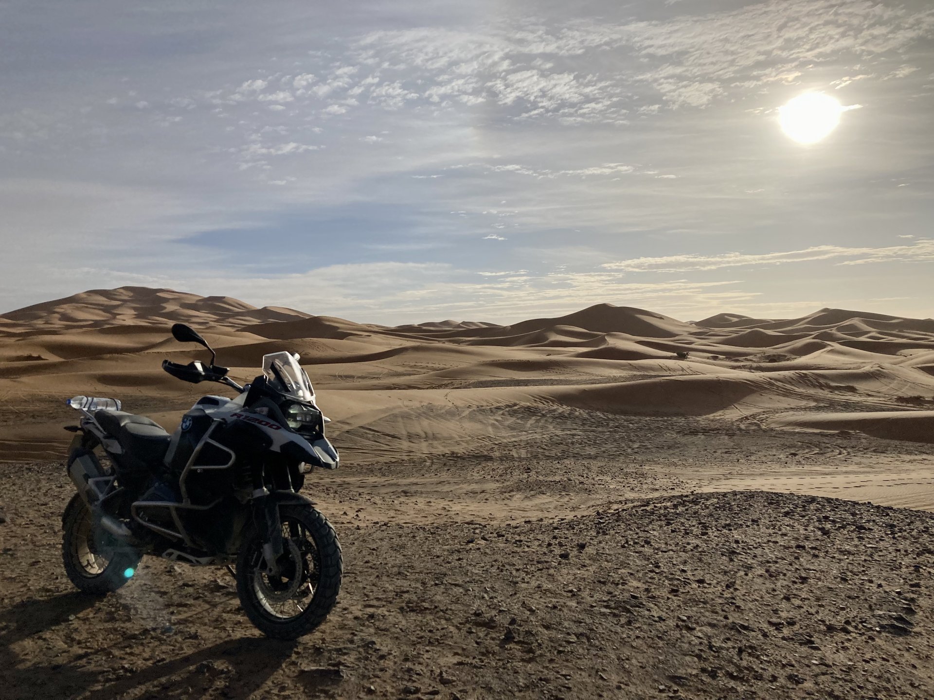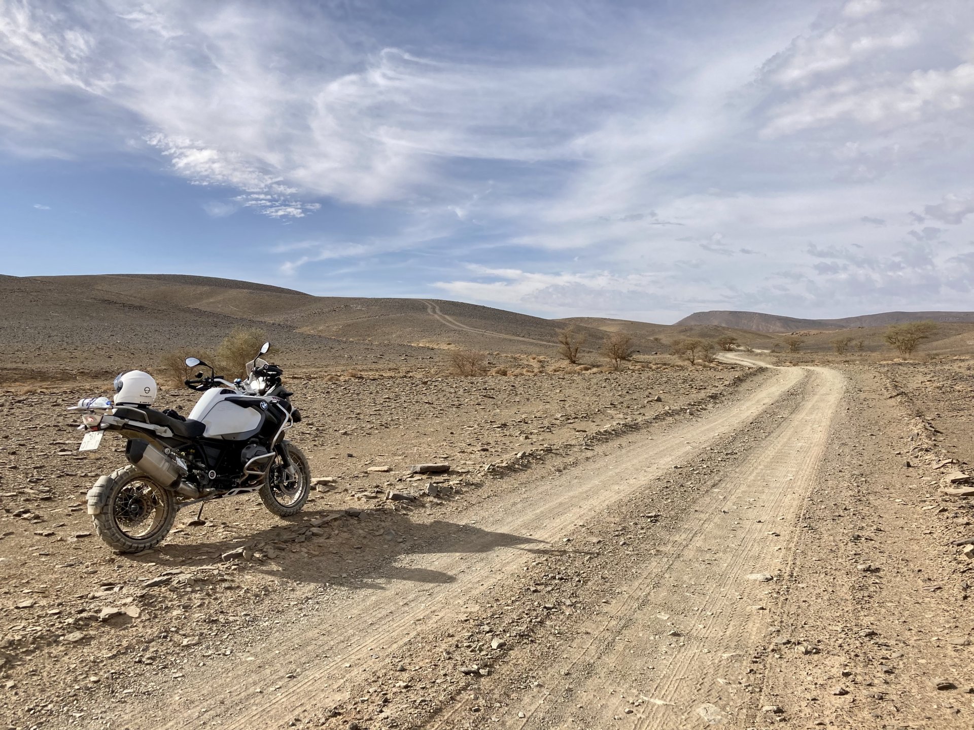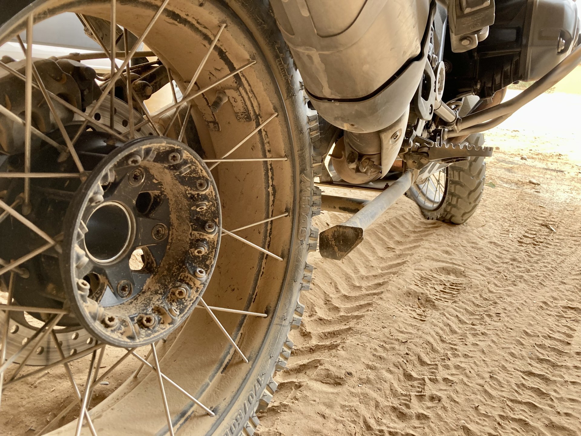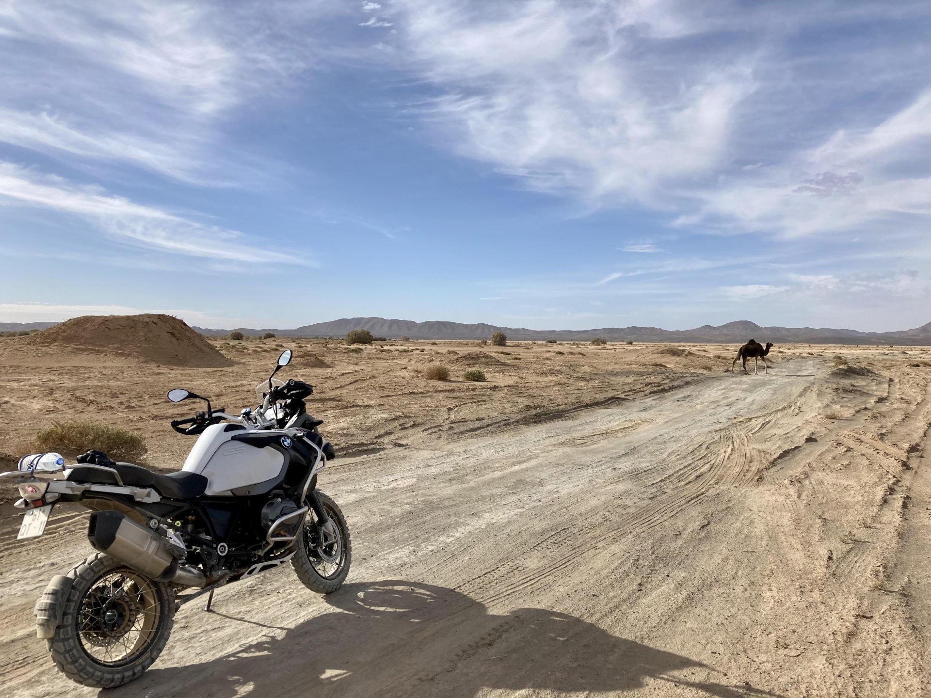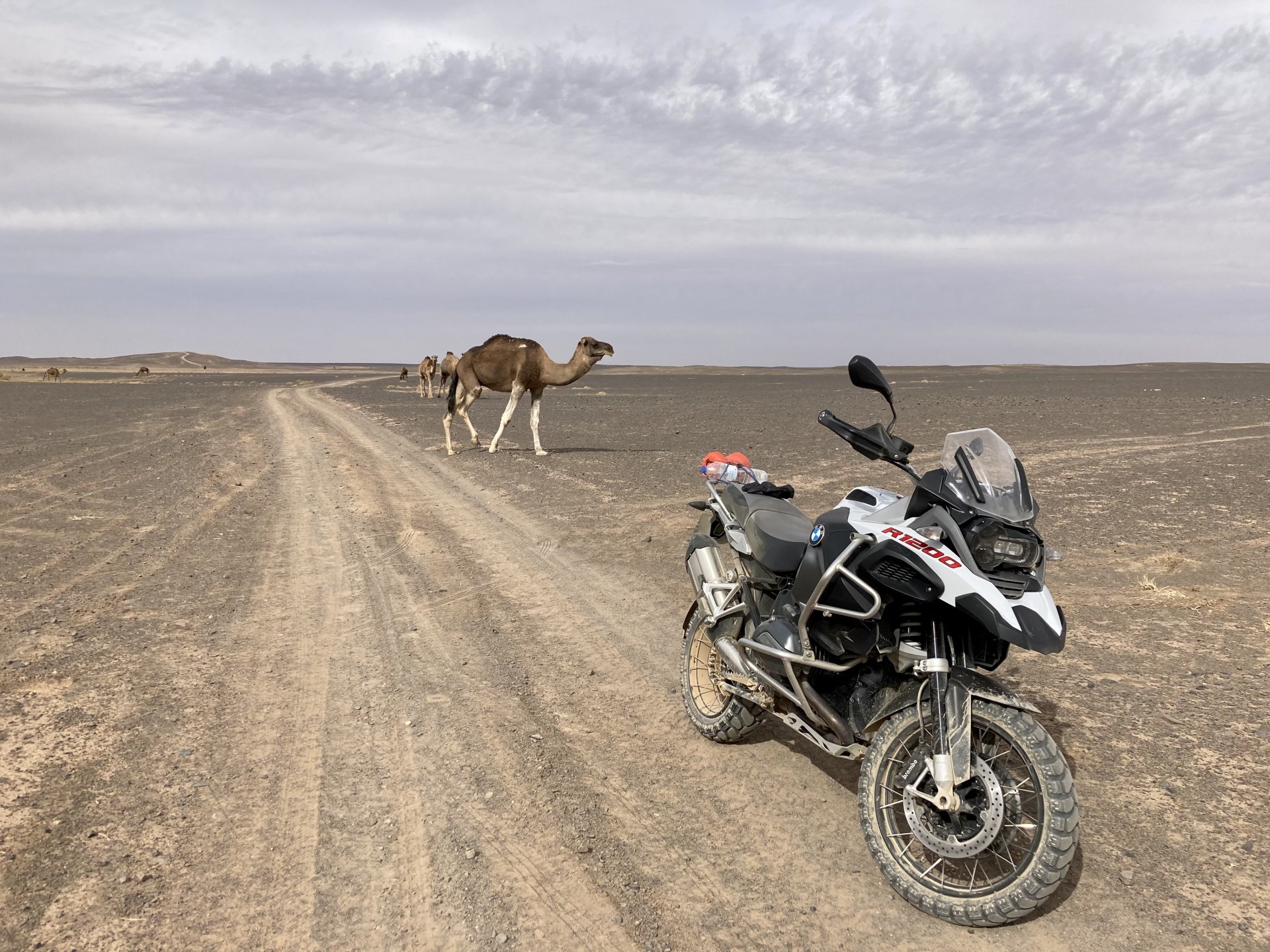 01st December is a national holiday in Portugal, it celebrates the restoration of independence following a period of union between Spain and Portugal. This happened in 1640 and is a pretty big deal for the History of Portugal as a country. This also means that all my clients are closed, and to me that meant that very little had to be done and very little surprise calls arrived. It contributes immensely to letting go of the real world. The day started with my usual berber breakfast of msmen and hot coffee, looking out into the dunes. With nowhere specific to go, I left with the task to ride around enjoying myself and then have lunch somewhere. Not a bad plan to have! The bike was started and traction control turned off, doing that to be able to easily move off from the overnight parking location is something that greatly appeals to me, also the 6 or 7km commute to Merzouga to buy Sofia a souvenir from Morocco without touching tarmac just reinforces that I could live with nice sandy roads instead of tarmac, on my way to Merzouga in the morning: Having done my shopping, I simply went out with a clear heading, away from town and in the general direction of some hills in the distance, I've never been there so as good a destination as any when all you want is to ride around a little. What happened next left me ecstatic, the bike now had a third of it's fuel load and my confidence had increased, this meant I confidently rode through soft sand sections like this oued below, here stopping to choose if taking the left or right paths right it was, and a little further on stopped to look at camels. Camels out roaming by themselves are great, they will completely disregard you as a thing of no importance to their day, and almost in a royal manner glide away with their smooth but effective stride. A later stop to drink water had me spend a few moments looking for fossils, Maria had a neck for finding them right there on the ground whenever we stopped, and I've got a small collection in my kitchen. I, however, am useless at stopping in the right location and managed to not find a single one on this trip, despite a few tries to look around for lost things whenever I stopped in a rocky area. As I am looking around, a curious desert bird decided to inspect my bike, on the pictures below you'll see it firstly floating around the right of the bike and then giving the bmw heated grips a try on the left hand grip: The little bird was scared away when a pickup drove to me and stopped, the driver quickly inviting me for tea at his mine with a big smile, and I accepted, as is only polite to do so. Followed the pickup at a distance so not to eat all of it's dust, and parked up the hill, they were most impressed but then I noticed the chinese bike one of them rode there. The mine owner was driving over with a big pot of stew for the guys' lunch or dinner, and oranges for dessert. At least a few of them sleep there during the week, it is a hard life! Always with a smile and a sense of pride, they showed me their labour, taking out rocks from the holes deep into the rocky hills and then sending them to a plant for extracting the minerals that were after used all over the world I don't know what for. Safety conditions seemed dire, and work was obviously very hard, I was treated to some great mint tea though. With an open invitation to pop by for tea whenever I pleased, I rode away. This time not stopping on any of the locations I previously took pictures of, gliding by with not a single foot on the ground through soft sand and phesh phesh felt great. That fine desert silt feels almost like water sometimes and you can feel it splashing onto the back of your legs like if riding through a deep water puddle. The bike is dragged down and you have to keep powering a little up to not be bogged down. Power too much and you'll gain too much speed and your acceleration is no longer sustainable, power too little and you'll be pulled down, you'll lose momentum and eventually the heavy mass becomes too heavy to control. The GS's boxer is an amazing help to dealing with the bike's weight, at anything over 2500/3000 rpm a quick throttle blip in second/third/fourth in soft sand and you'll power out of mosts things with a smooth amount of wheelspin. It all feels very controlable and confidence inducing, and it's a great high to be on that fine balance. I become lost and go up a hill to find my way back, even on trails it's very easy for me to lose my way around this open terrain. I ride back to Merzouga and stop at an edge of town café for lunch. The turkey grilled was amazingly seasoned, it was a lovely plate of food that I scoffed down at 13:30 after a hunger inducing morning on the bike. The bike was parked under it's cover facing out until the next morning and after a shower I spent the rest of the afternoon looking at the dunes with my sparrow friends. Couldn't bring myself to go up the dune, though, it was just too hard of a thing to do. The next day, I would ride off in the morning.