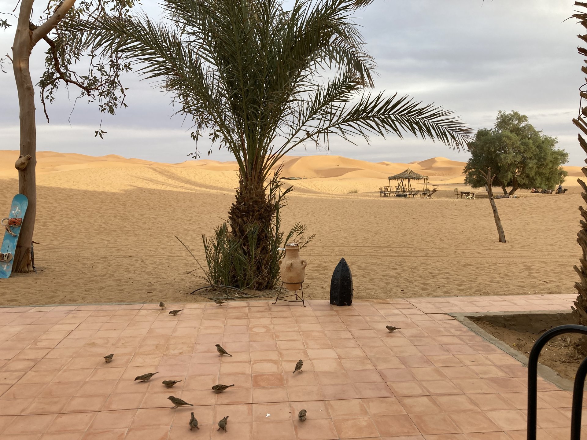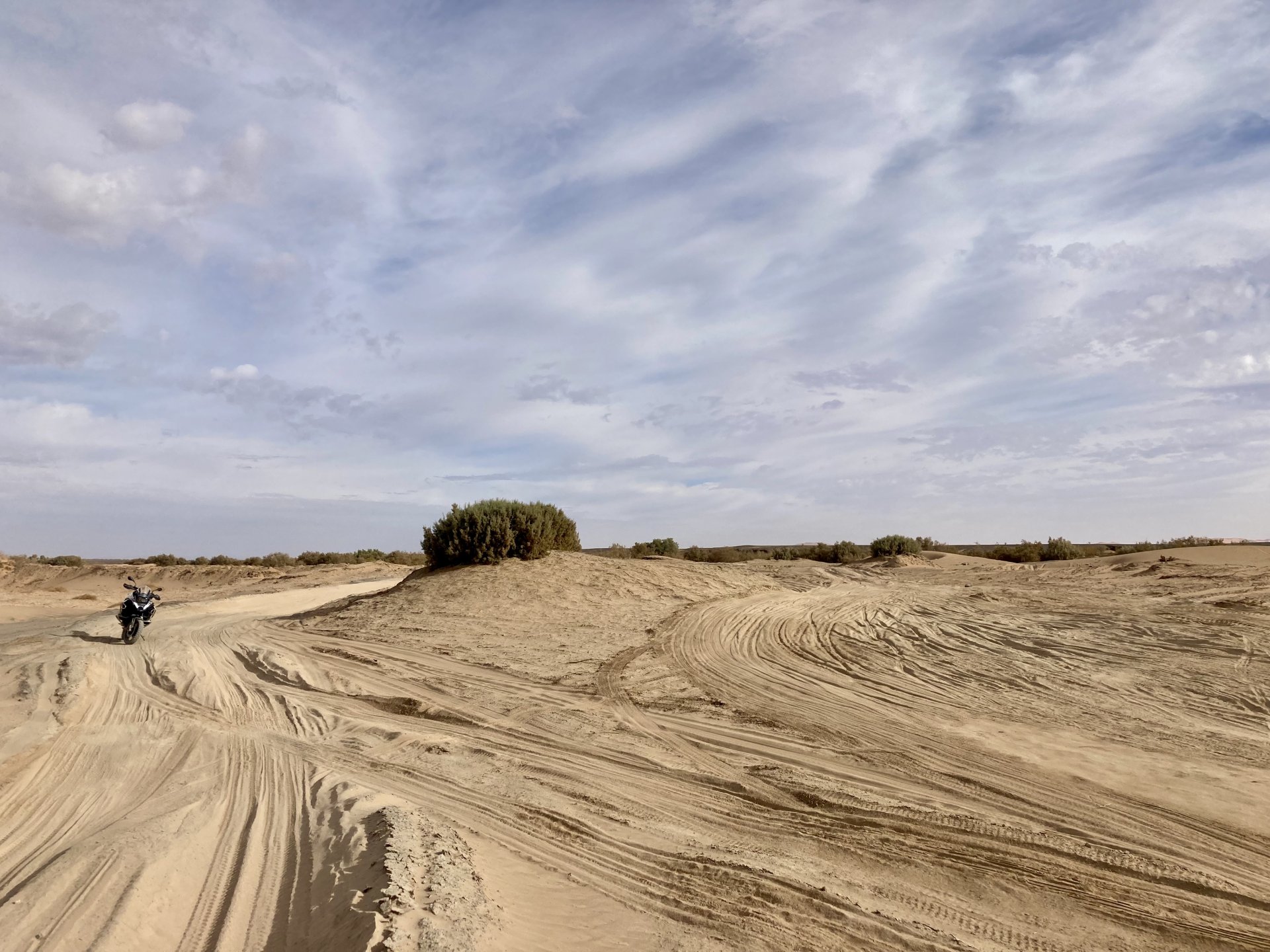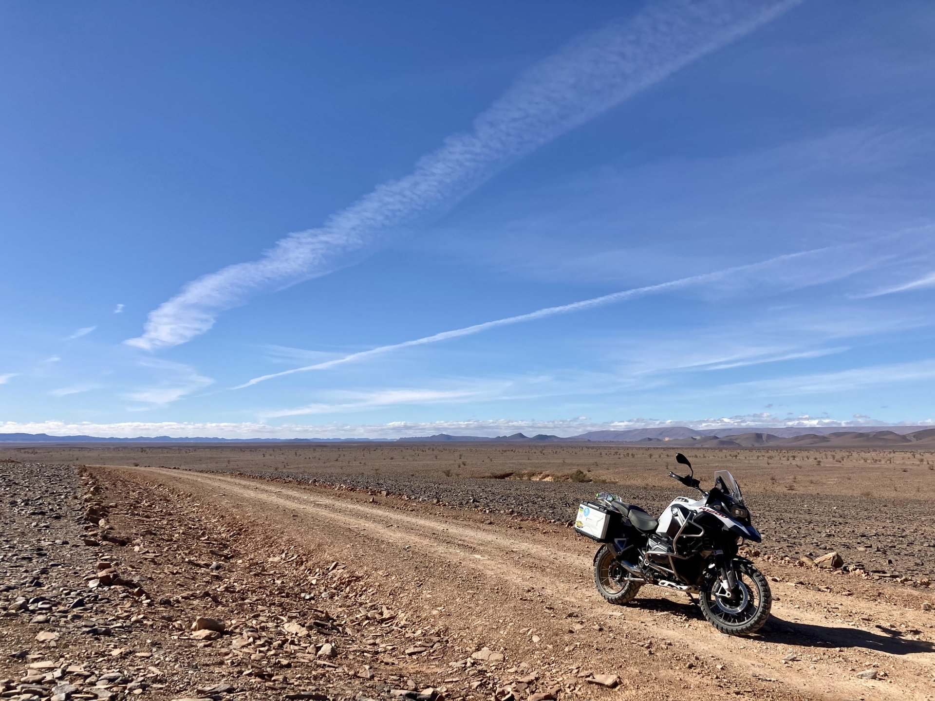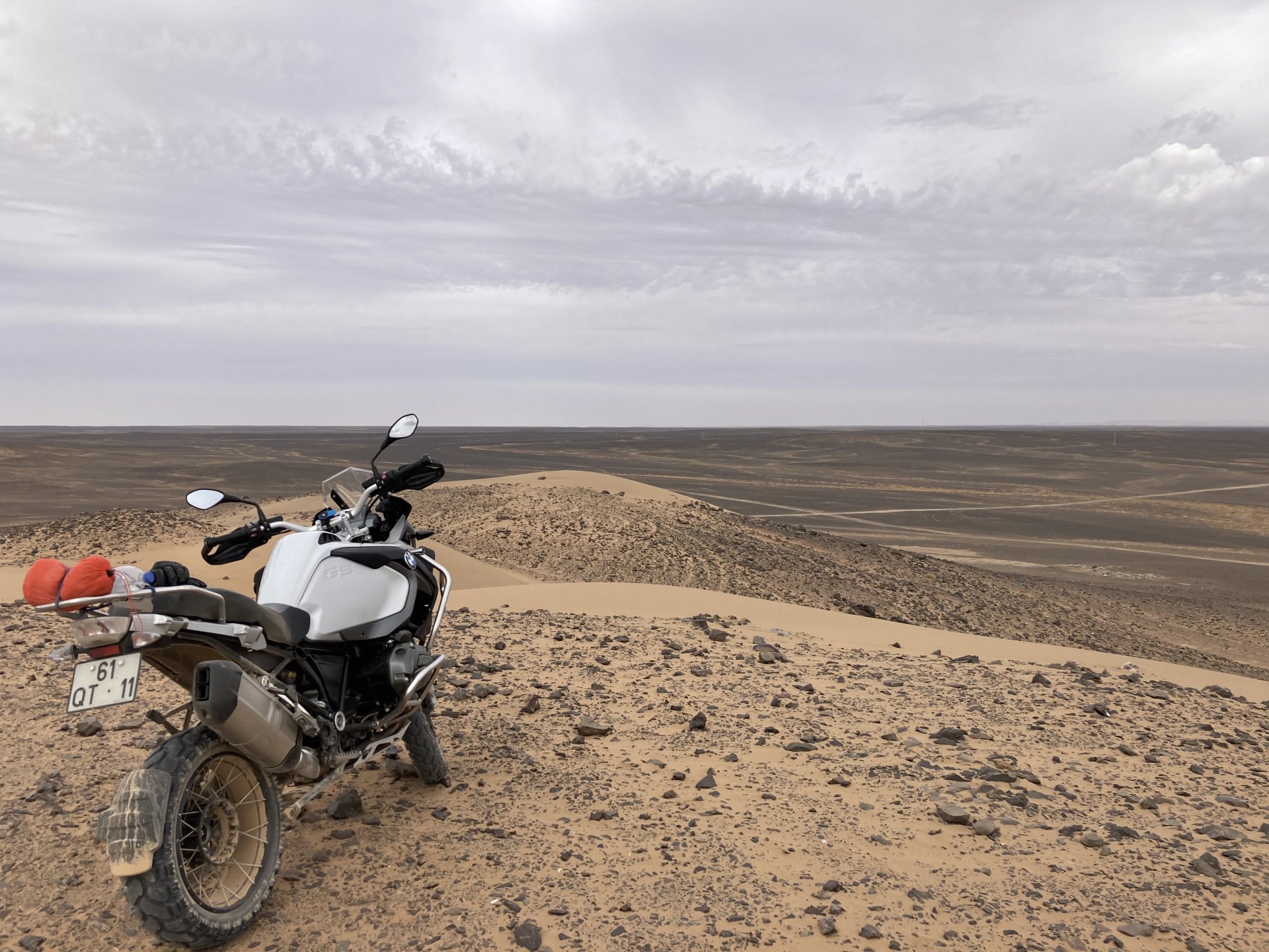 01st December is a national holiday in Portugal, it celebrates the restoration of independence following a period of union between Spain and Portugal. This happened in 1640 and is a pretty big deal for the History of Portugal as a country. This also means that all my clients are closed, and to me that meant that very little had to be done and very little surprise calls arrived. It contributes immensely to letting go of the real world. The day started with my usual berber breakfast of msmen and hot coffee, looking out into the dunes. With nowhere specific to go, I left with the task to ride around enjoying myself and then have lunch somewhere. Not a bad plan to have! The bike was started and traction control turned off, doing that to be able to easily move off from the overnight parking location is something that greatly appeals to me, also the 6 or 7km commute to Merzouga to buy Sofia a souvenir from Morocco without touching tarmac just reinforces that I could live with nice sandy roads instead of tarmac, on my way to Merzouga in the morning: Having done my shopping, I simply went out with a clear heading, away from town and in the general direction of some hills in the distance, I've never been there so as good a destination as any when all you want is to ride around a little. What happened next left me ecstatic, the bike now had a third of it's fuel load and my confidence had increased, this meant I confidently rode through soft sand sections like this oued below, here stopping to choose if taking the left or right paths right it was, and a little further on stopped to look at camels. Camels out roaming by themselves are great, they will completely disregard you as a thing of no importance to their day, and almost in a royal manner glide away with their smooth but effective stride. A later stop to drink water had me spend a few moments looking for fossils, Maria had a neck for finding them right there on the ground whenever we stopped, and I've got a small collection in my kitchen. I, however, am useless at stopping in the right location and managed to not find a single one on this trip, despite a few tries to look around for lost things whenever I stopped in a rocky area. As I am looking around, a curious desert bird decided to inspect my bike, on the pictures below you'll see it firstly floating around the right of the bike and then giving the bmw heated grips a try on the left hand grip: The little bird was scared away when a pickup drove to me and stopped, the driver quickly inviting me for tea at his mine with a big smile, and I accepted, as is only polite to do so. Followed the pickup at a distance so not to eat all of it's dust, and parked up the hill, they were most impressed but then I noticed the chinese bike one of them rode there. The mine owner was driving over with a big pot of stew for the guys' lunch or dinner, and oranges for dessert. At least a few of them sleep there during the week, it is a hard life! Always with a smile and a sense of pride, they showed me their labour, taking out rocks from the holes deep into the rocky hills and then sending them to a plant for extracting the minerals that were after used all over the world I don't know what for. Safety conditions seemed dire, and work was obviously very hard, I was treated to some great mint tea though. With an open invitation to pop by for tea whenever I pleased, I rode away. This time not stopping on any of the locations I previously took pictures of, gliding by with not a single foot on the ground through soft sand and phesh phesh felt great. That fine desert silt feels almost like water sometimes and you can feel it splashing onto the back of your legs like if riding through a deep water puddle. The bike is dragged down and you have to keep powering a little up to not be bogged down. Power too much and you'll gain too much speed and your acceleration is no longer sustainable, power too little and you'll be pulled down, you'll lose momentum and eventually the heavy mass becomes too heavy to control. The GS's boxer is an amazing help to dealing with the bike's weight, at anything over 2500/3000 rpm a quick throttle blip in second/third/fourth in soft sand and you'll power out of mosts things with a smooth amount of wheelspin. It all feels very controlable and confidence inducing, and it's a great high to be on that fine balance. I become lost and go up a hill to find my way back, even on trails it's very easy for me to lose my way around this open terrain. I ride back to Merzouga and stop at an edge of town café for lunch. The turkey grilled was amazingly seasoned, it was a lovely plate of food that I scoffed down at 13:30 after a hunger inducing morning on the bike. The bike was parked under it's cover facing out until the next morning and after a shower I spent the rest of the afternoon looking at the dunes with my sparrow friends. Couldn't bring myself to go up the dune, though, it was just too hard of a thing to do. The next day, I would ride off in the morning.