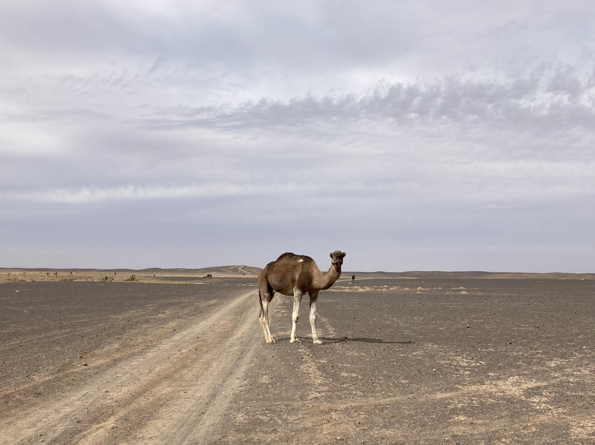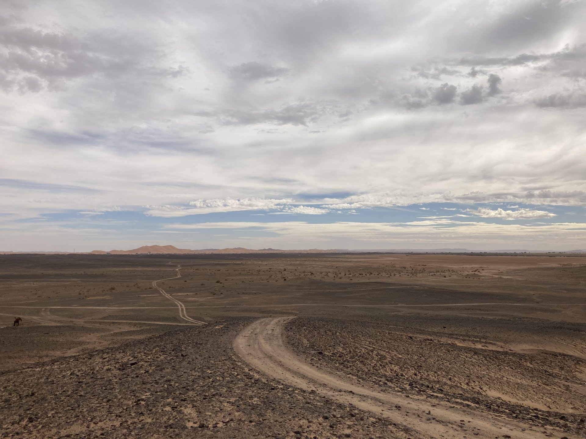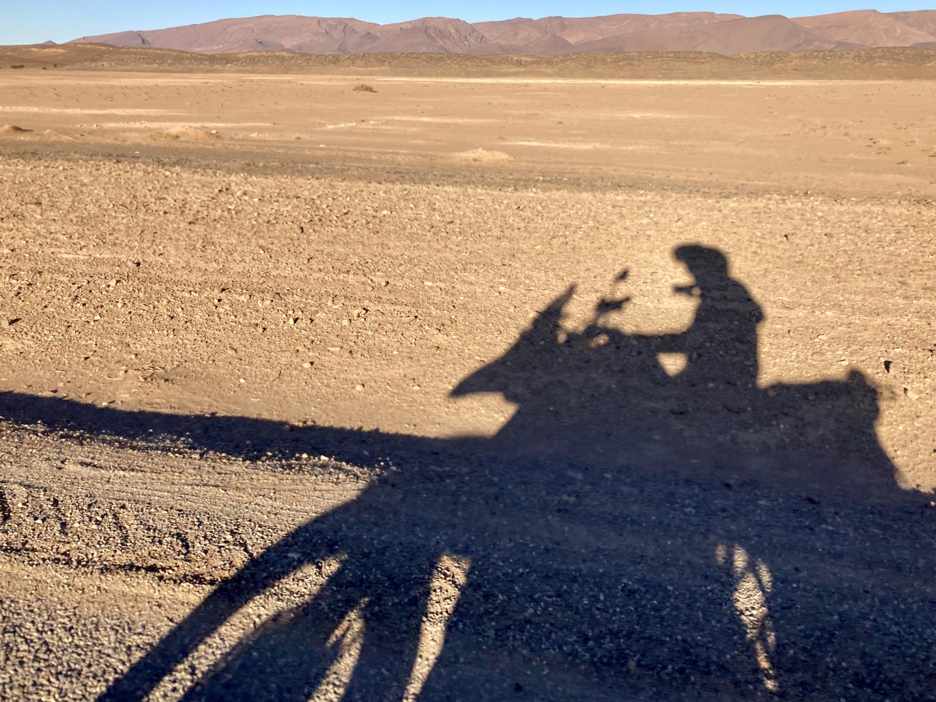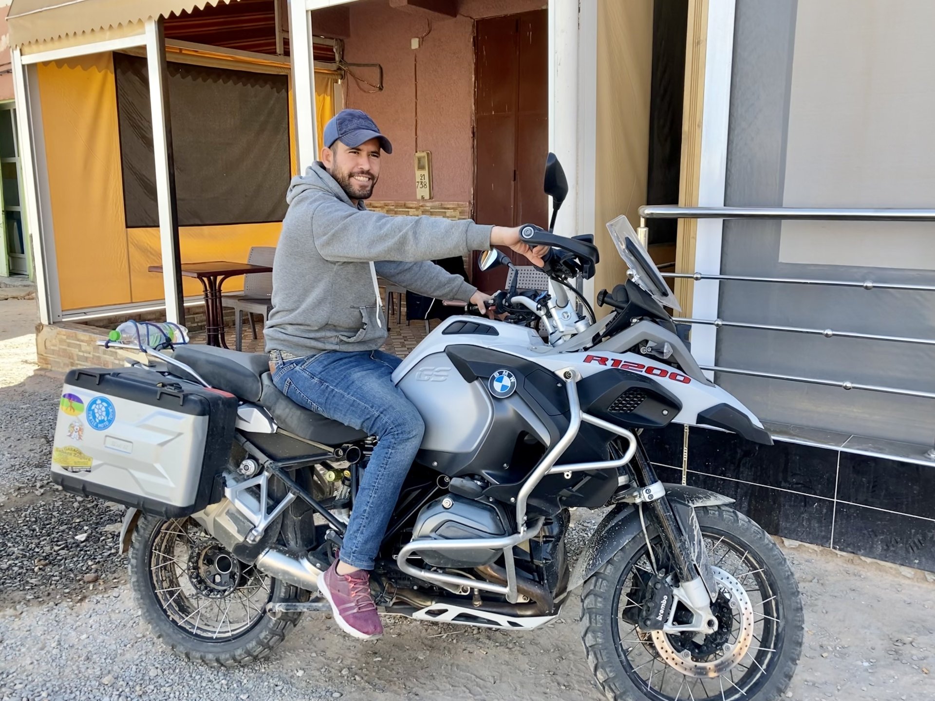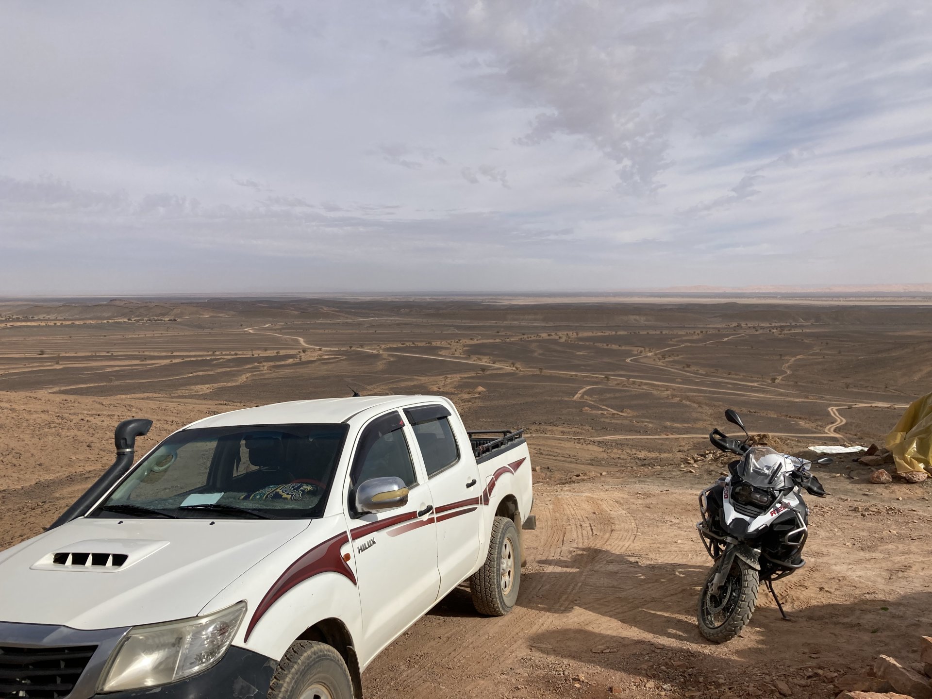 01st December is a national holiday in Portugal, it celebrates the restoration of independence following a period of union between Spain and Portugal. This happened in 1640 and is a pretty big deal for the History of Portugal as a country. This also means that all my clients are closed, and to me that meant that very little had to be done and very little surprise calls arrived. It contributes immensely to letting go of the real world. The day started with my usual berber breakfast of msmen and hot coffee, looking out into the dunes. With nowhere specific to go, I left with the task to ride around enjoying myself and then have lunch somewhere. Not a bad plan to have! The bike was started and traction control turned off, doing that to be able to easily move off from the overnight parking location is something that greatly appeals to me, also the 6 or 7km commute to Merzouga to buy Sofia a souvenir from Morocco without touching tarmac just reinforces that I could live with nice sandy roads instead of tarmac, on my way to Merzouga in the morning: Having done my shopping, I simply went out with a clear heading, away from town and in the general direction of some hills in the distance, I've never been there so as good a destination as any when all you want is to ride around a little. What happened next left me ecstatic, the bike now had a third of it's fuel load and my confidence had increased, this meant I confidently rode through soft sand sections like this oued below, here stopping to choose if taking the left or right paths right it was, and a little further on stopped to look at camels. Camels out roaming by themselves are great, they will completely disregard you as a thing of no importance to their day, and almost in a royal manner glide away with their smooth but effective stride. A later stop to drink water had me spend a few moments looking for fossils, Maria had a neck for finding them right there on the ground whenever we stopped, and I've got a small collection in my kitchen. I, however, am useless at stopping in the right location and managed to not find a single one on this trip, despite a few tries to look around for lost things whenever I stopped in a rocky area. As I am looking around, a curious desert bird decided to inspect my bike, on the pictures below you'll see it firstly floating around the right of the bike and then giving the bmw heated grips a try on the left hand grip: The little bird was scared away when a pickup drove to me and stopped, the driver quickly inviting me for tea at his mine with a big smile, and I accepted, as is only polite to do so. Followed the pickup at a distance so not to eat all of it's dust, and parked up the hill, they were most impressed but then I noticed the chinese bike one of them rode there. The mine owner was driving over with a big pot of stew for the guys' lunch or dinner, and oranges for dessert. At least a few of them sleep there during the week, it is a hard life! Always with a smile and a sense of pride, they showed me their labour, taking out rocks from the holes deep into the rocky hills and then sending them to a plant for extracting the minerals that were after used all over the world I don't know what for. Safety conditions seemed dire, and work was obviously very hard, I was treated to some great mint tea though. With an open invitation to pop by for tea whenever I pleased, I rode away. This time not stopping on any of the locations I previously took pictures of, gliding by with not a single foot on the ground through soft sand and phesh phesh felt great. That fine desert silt feels almost like water sometimes and you can feel it splashing onto the back of your legs like if riding through a deep water puddle. The bike is dragged down and you have to keep powering a little up to not be bogged down. Power too much and you'll gain too much speed and your acceleration is no longer sustainable, power too little and you'll be pulled down, you'll lose momentum and eventually the heavy mass becomes too heavy to control. The GS's boxer is an amazing help to dealing with the bike's weight, at anything over 2500/3000 rpm a quick throttle blip in second/third/fourth in soft sand and you'll power out of mosts things with a smooth amount of wheelspin. It all feels very controlable and confidence inducing, and it's a great high to be on that fine balance. I become lost and go up a hill to find my way back, even on trails it's very easy for me to lose my way around this open terrain. I ride back to Merzouga and stop at an edge of town café for lunch. The turkey grilled was amazingly seasoned, it was a lovely plate of food that I scoffed down at 13:30 after a hunger inducing morning on the bike. The bike was parked under it's cover facing out until the next morning and after a shower I spent the rest of the afternoon looking at the dunes with my sparrow friends. Couldn't bring myself to go up the dune, though, it was just too hard of a thing to do. The next day, I would ride off in the morning.